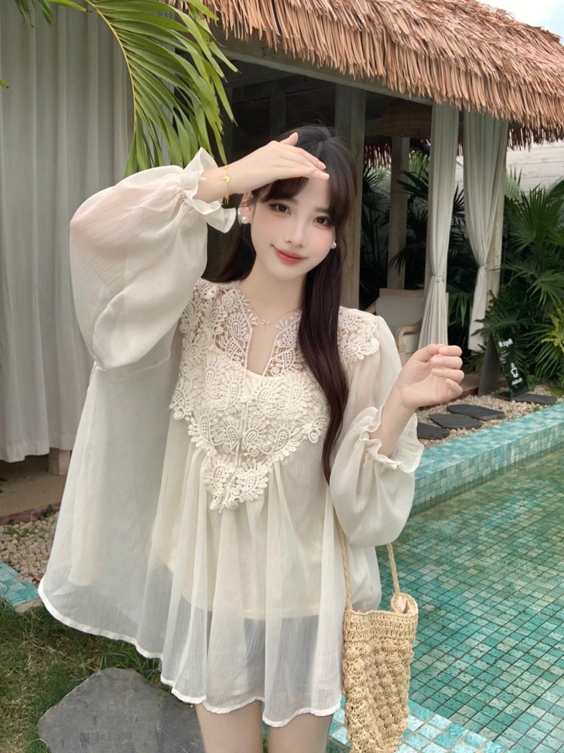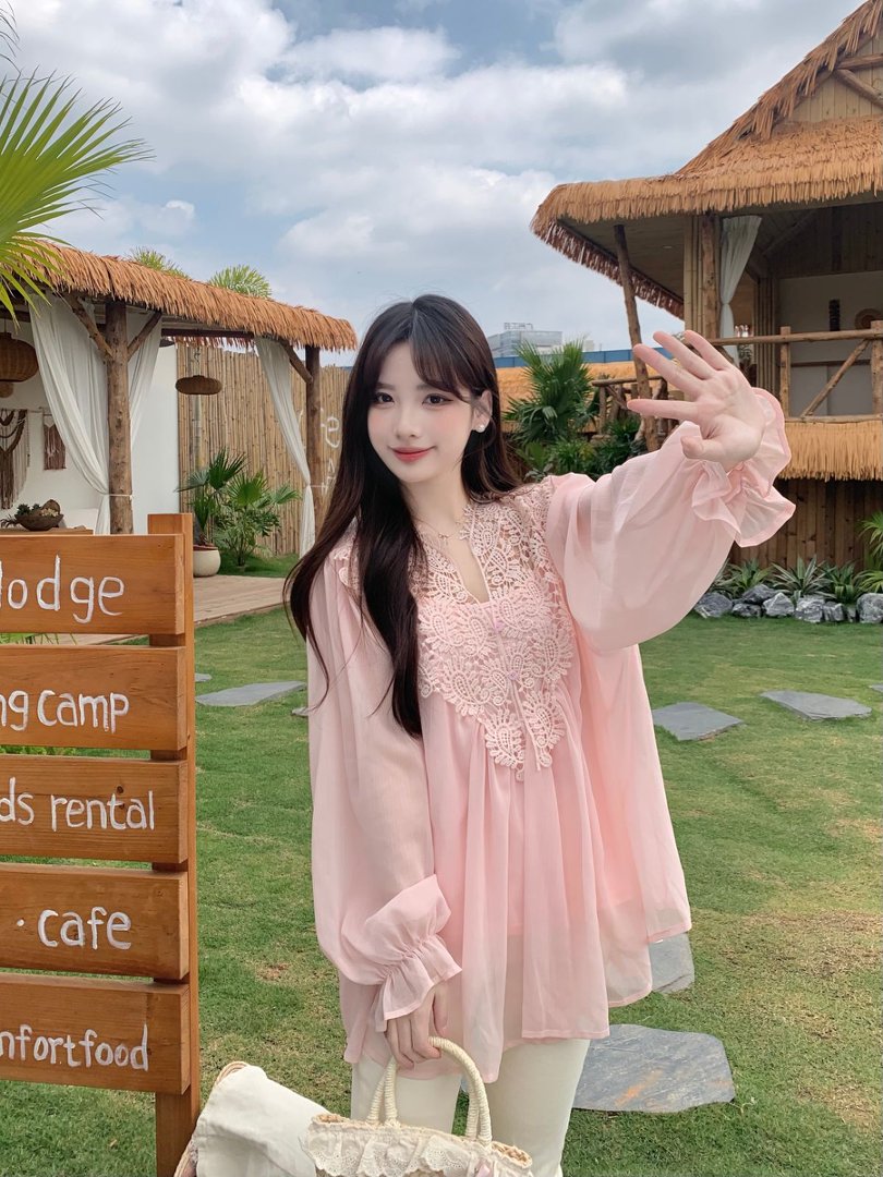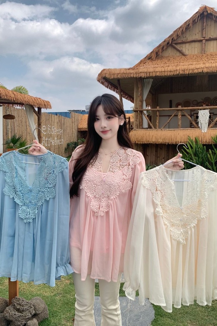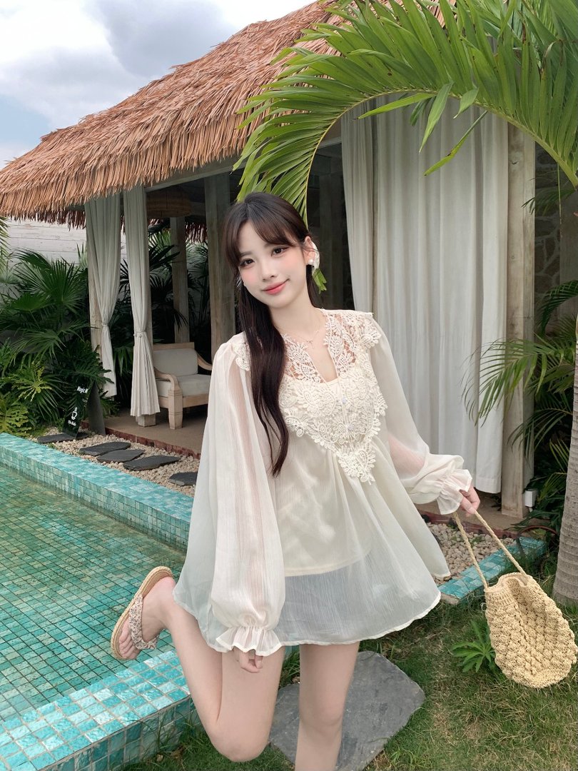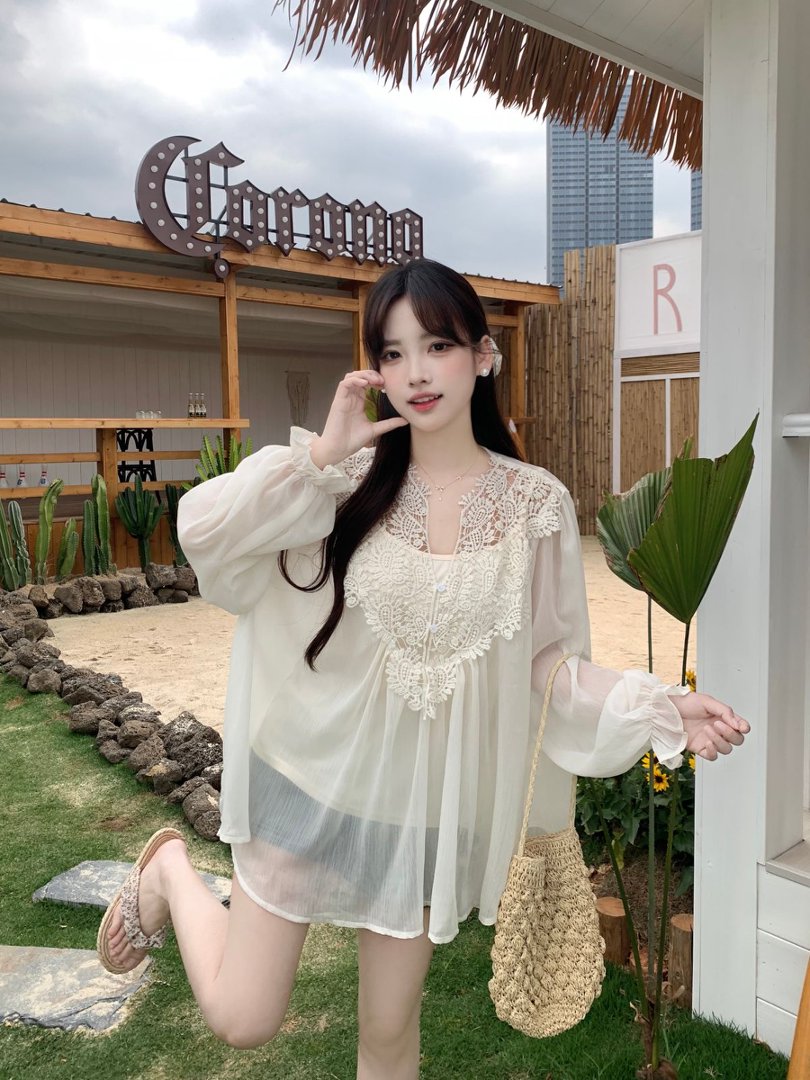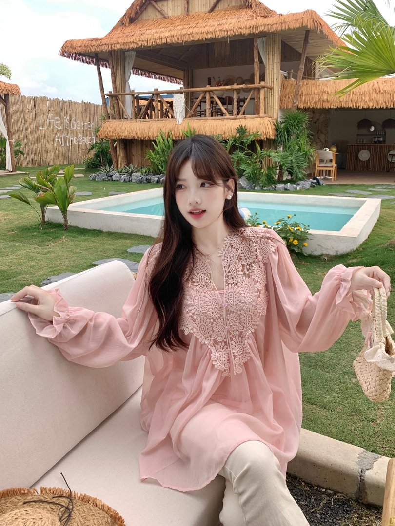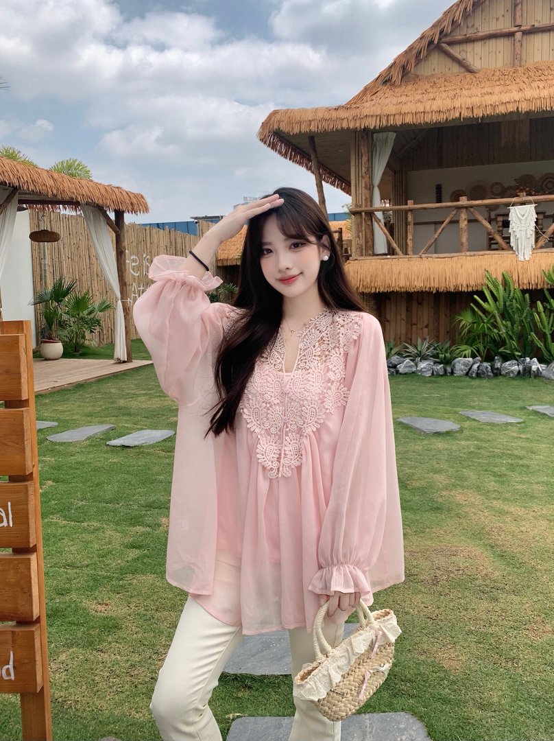 RY2047# 大码复古优雅立体钩花蕾丝拼接雪纺衫小衫吊带背心套装女宽松上衣
