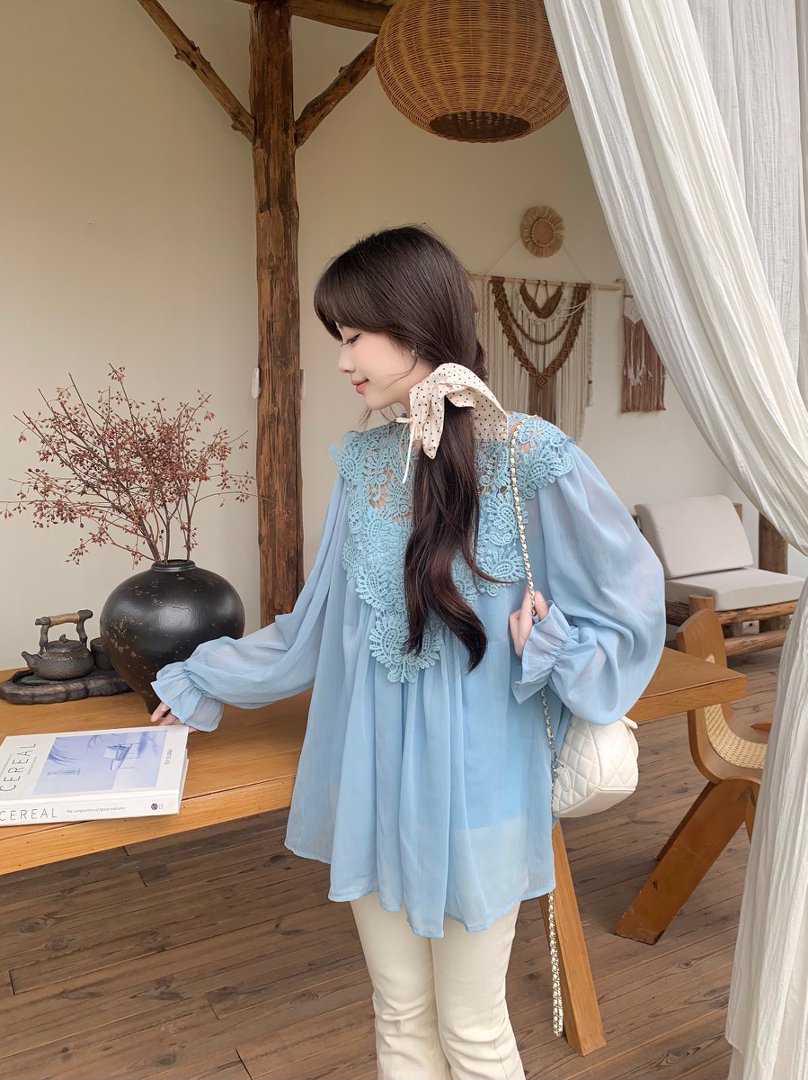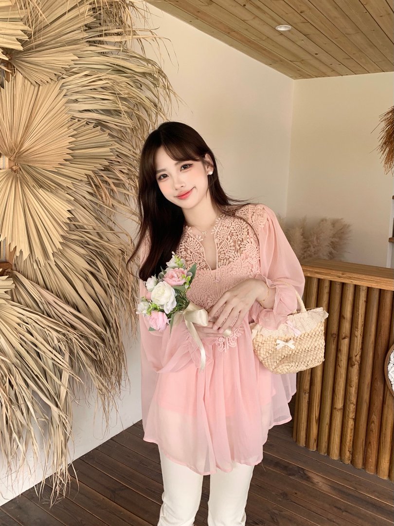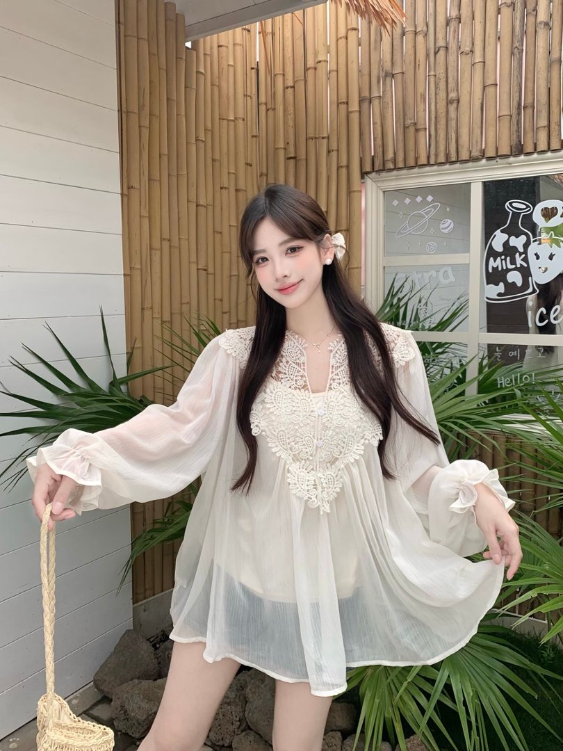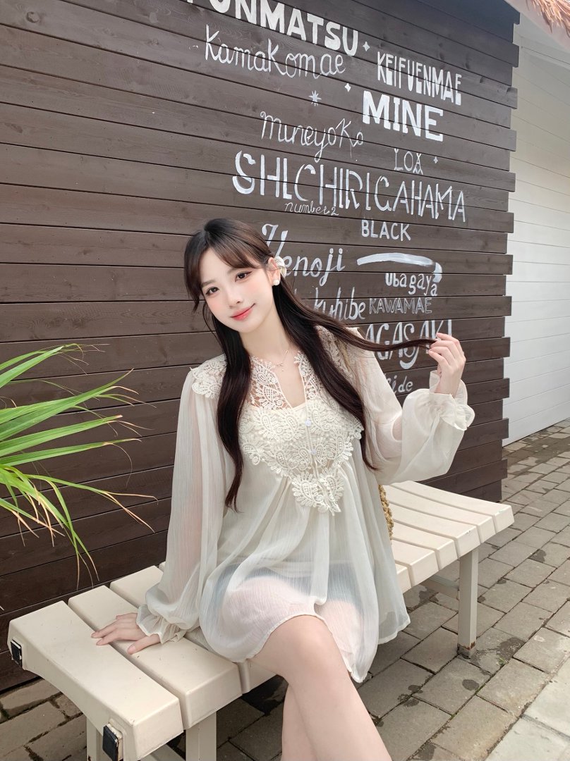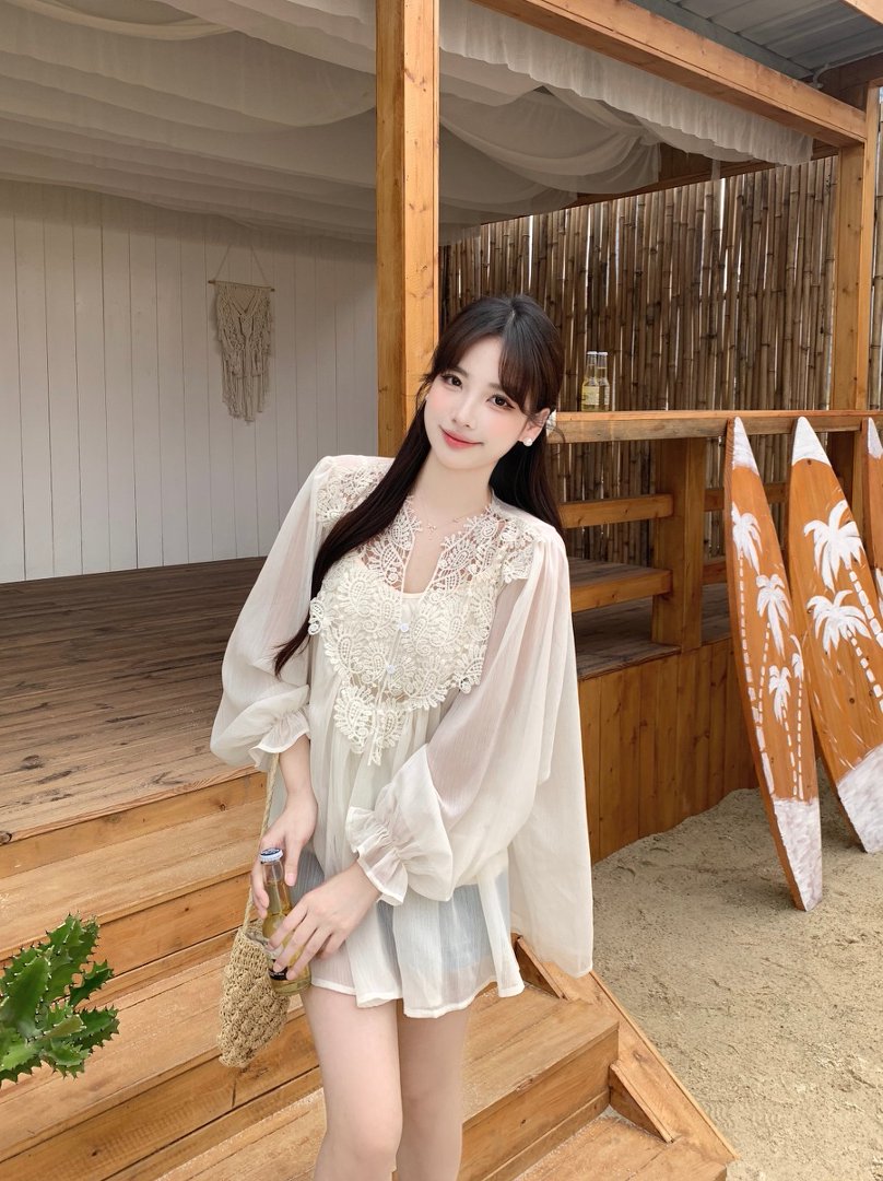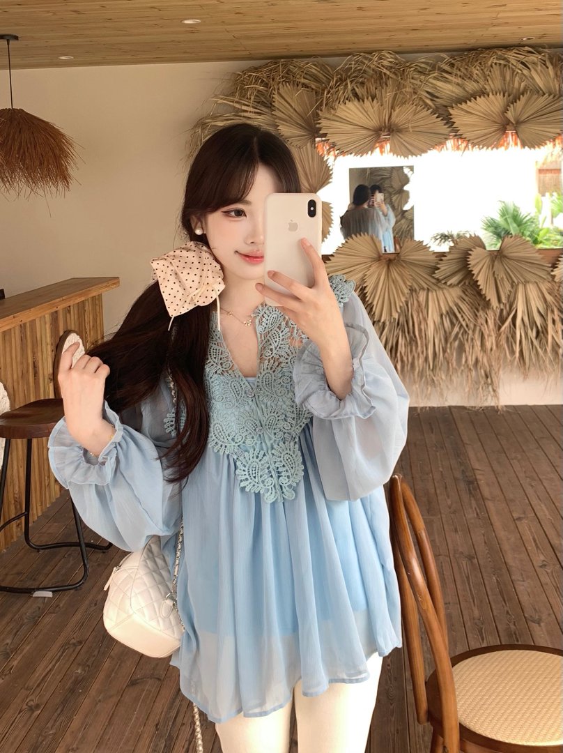 RY2047# 大码复古优雅立体钩花蕾丝拼接雪纺衫小衫吊带背心套装女宽松上衣