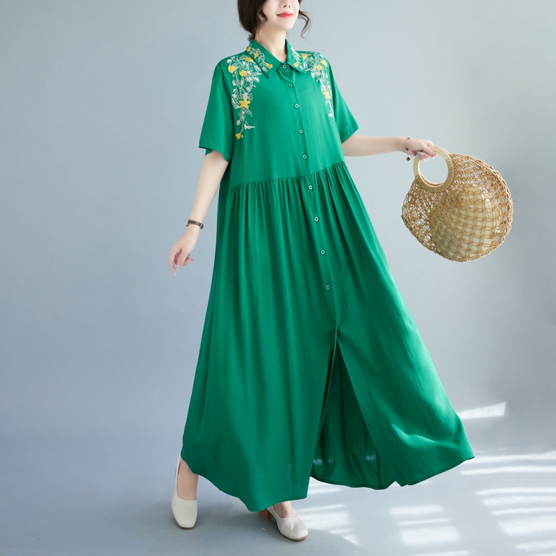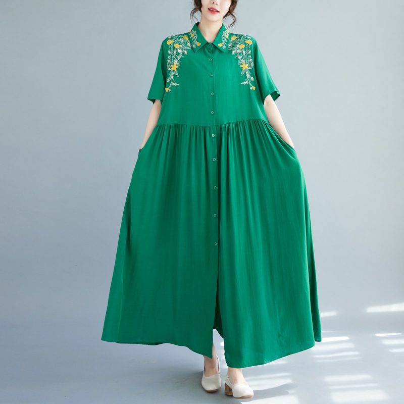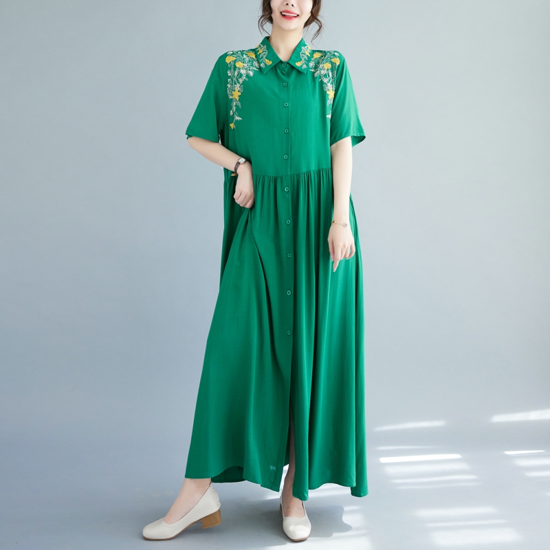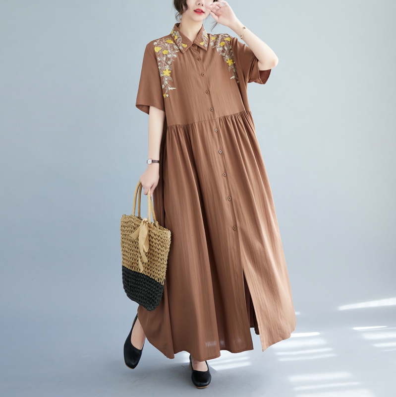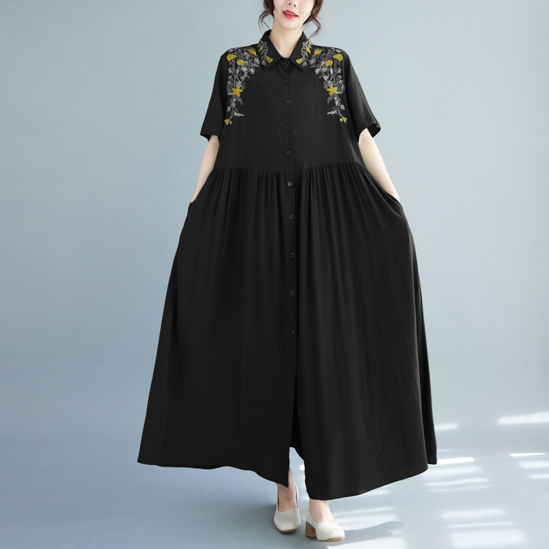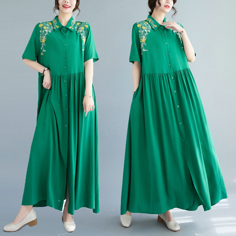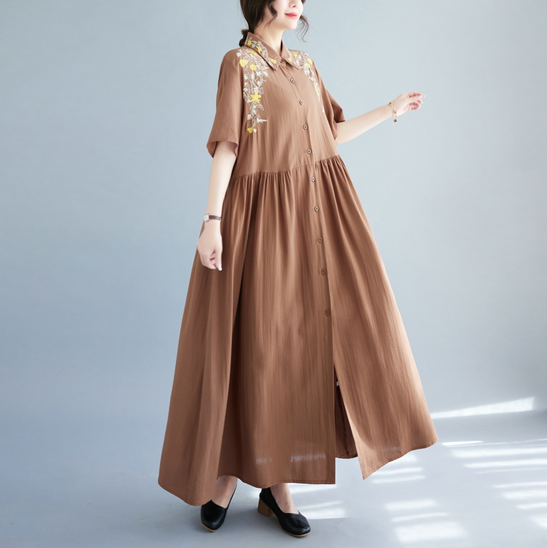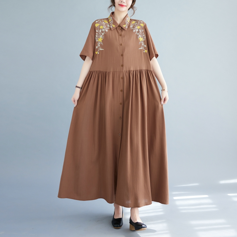 RY2160# 实拍胖mm复古单排扣宽松长款刺绣连衣裙女宽松度假长裙女