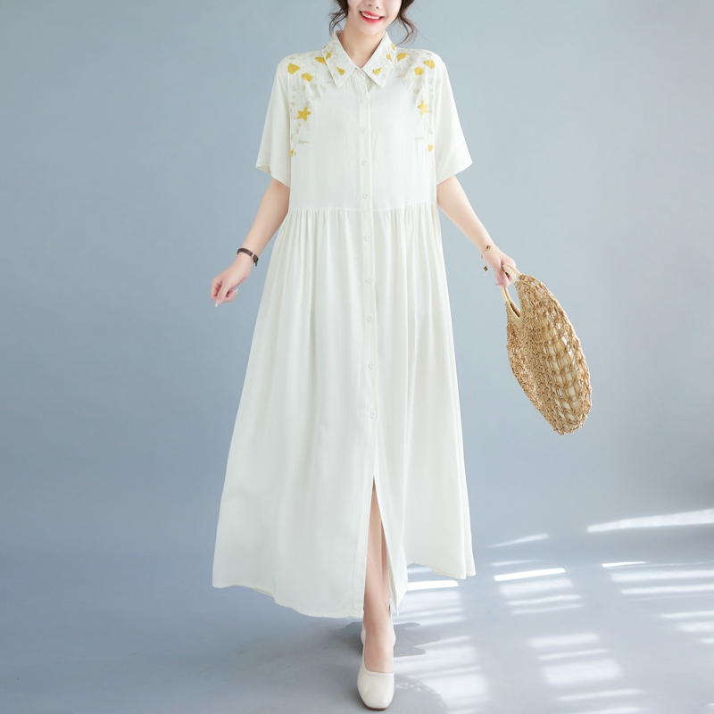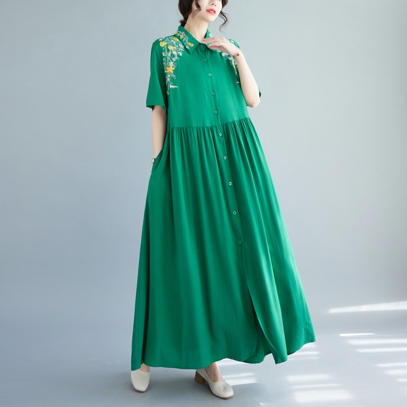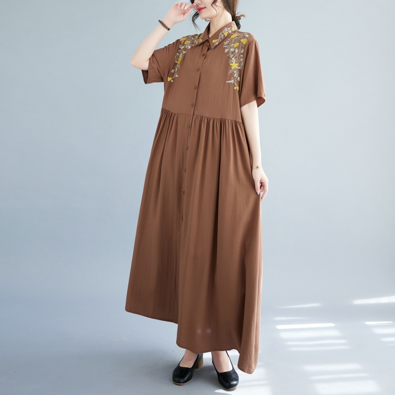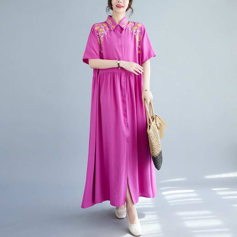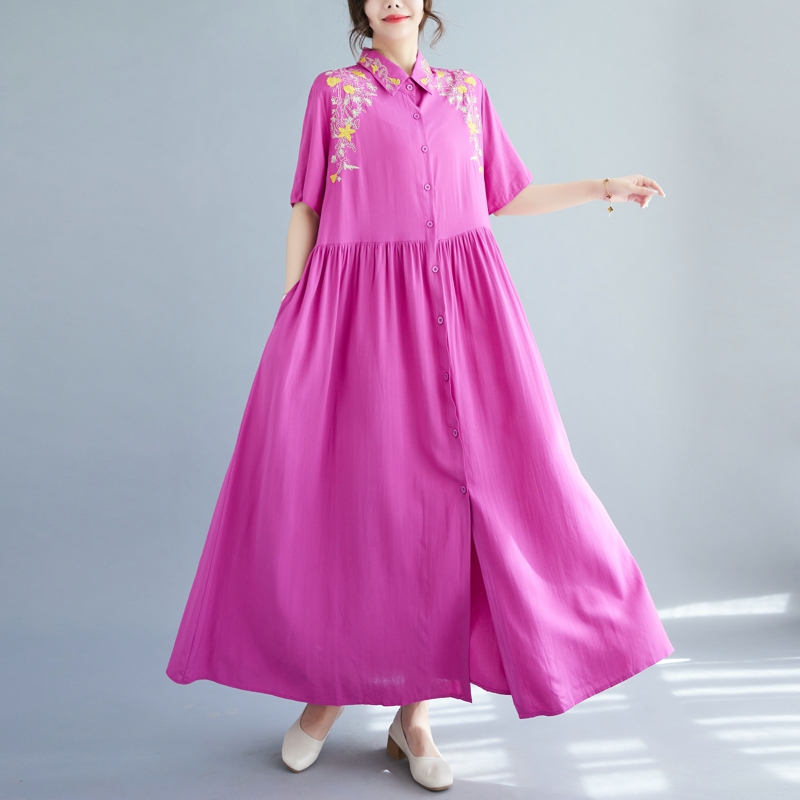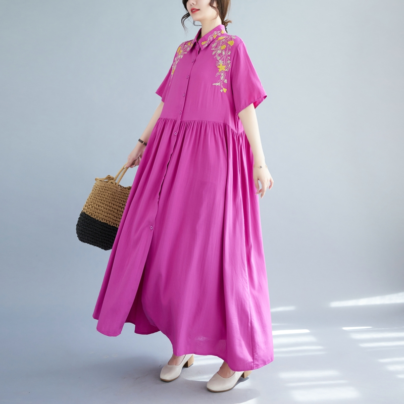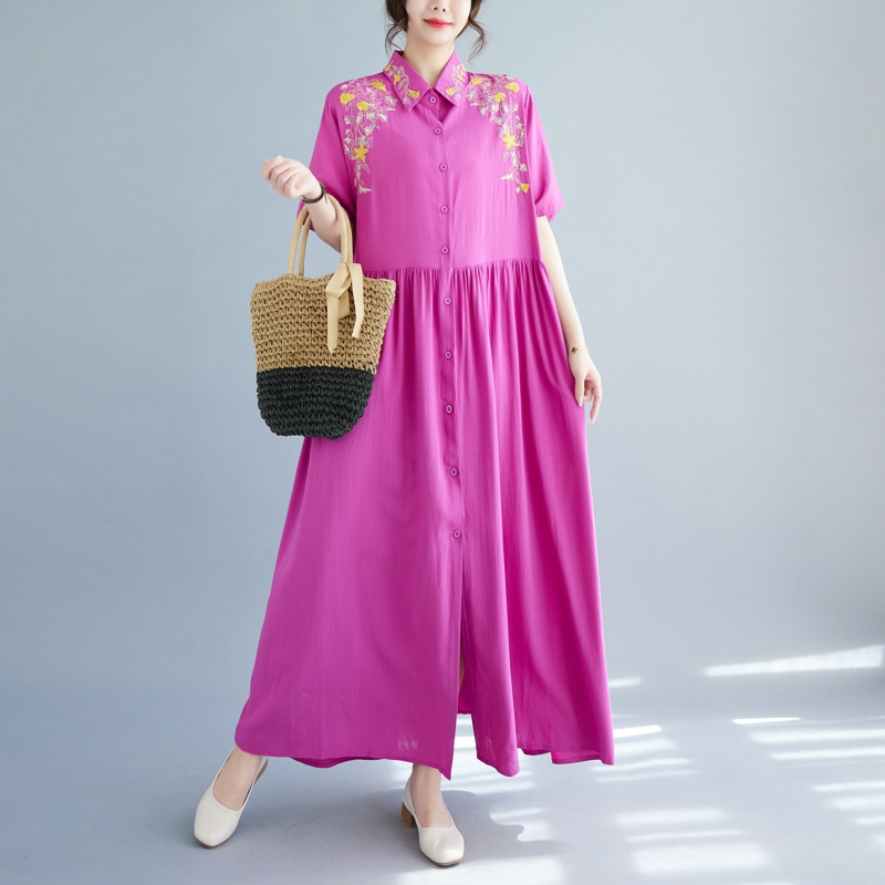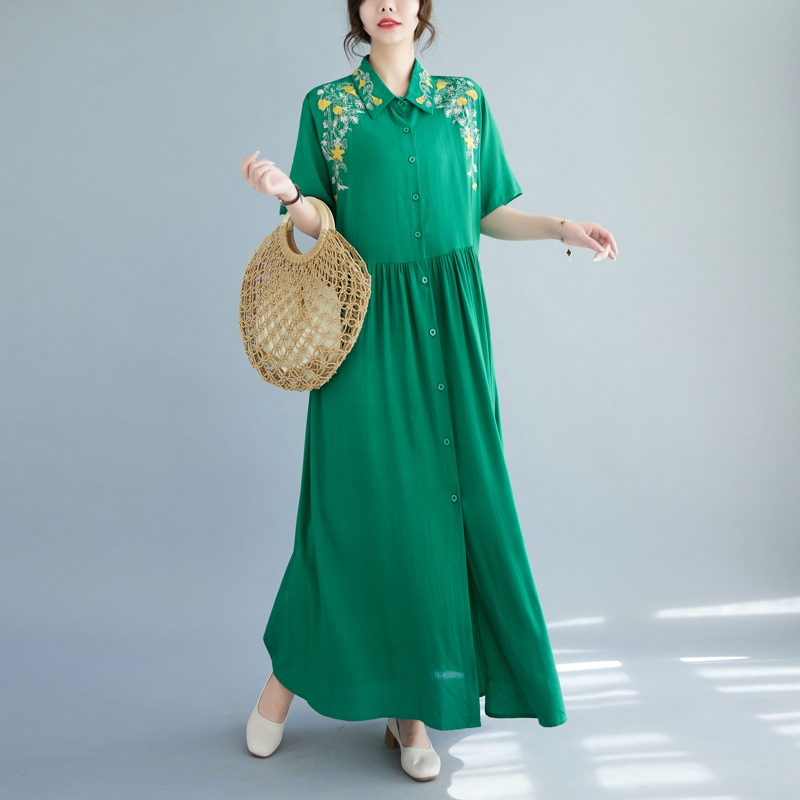 RY2160# 实拍胖mm复古单排扣宽松长款刺绣连衣裙女宽松度假长裙女