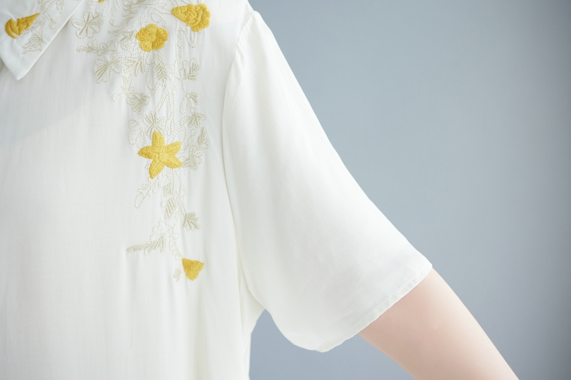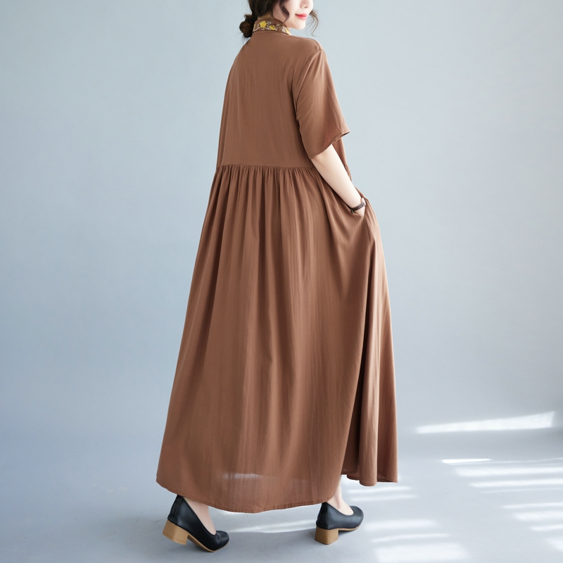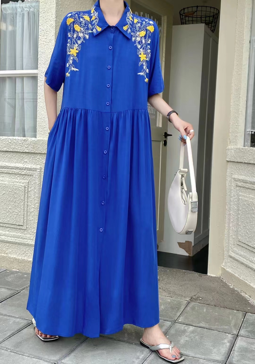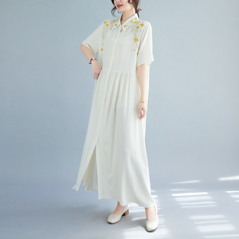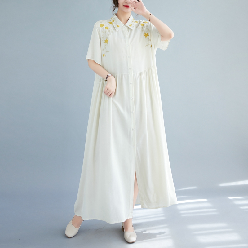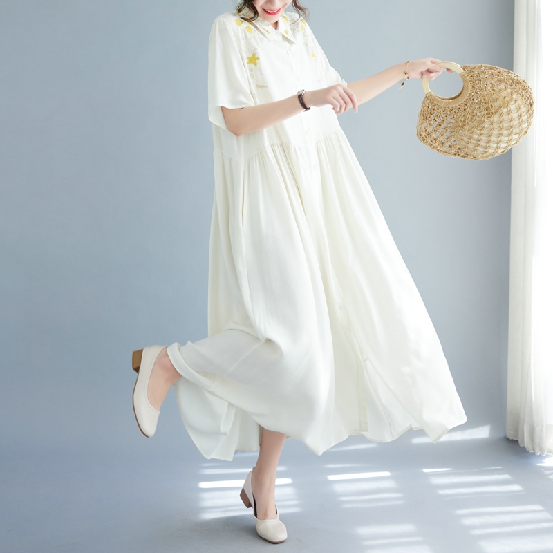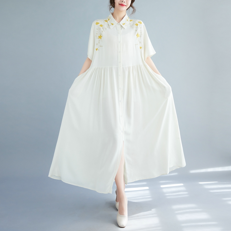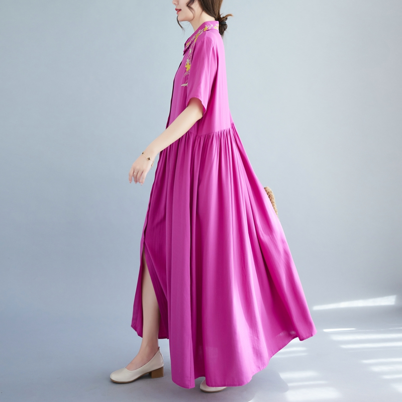 RY2160# 实拍胖mm复古单排扣宽松长款刺绣连衣裙女宽松度假长裙女