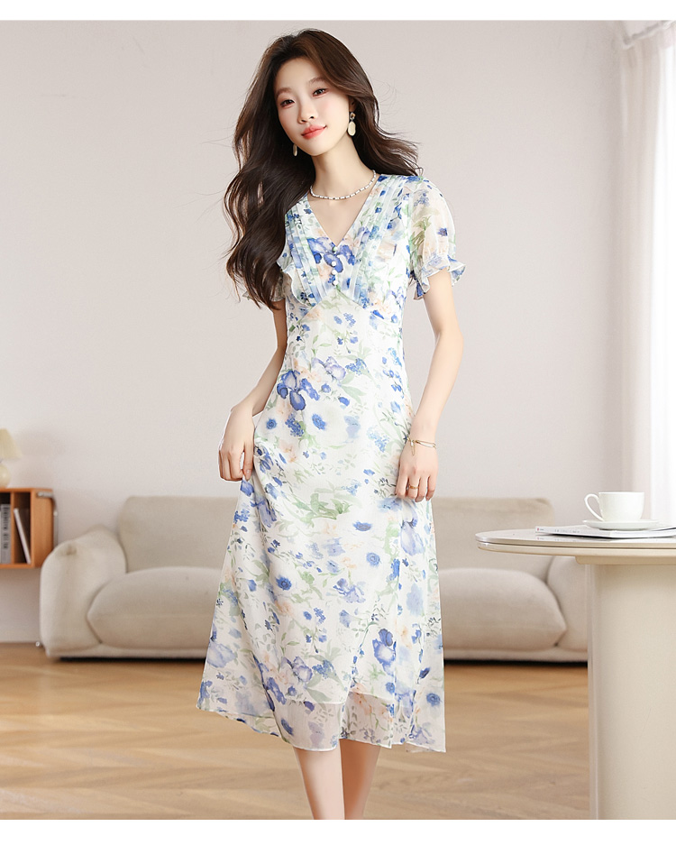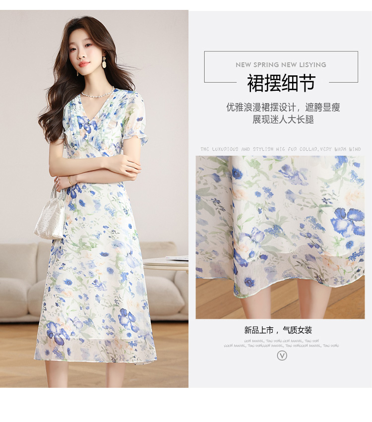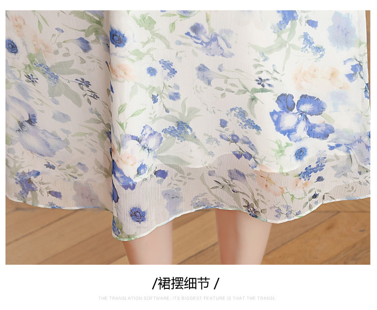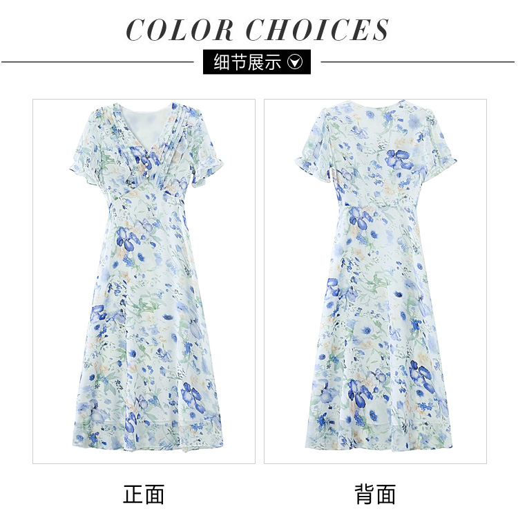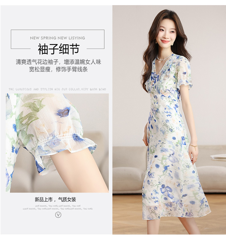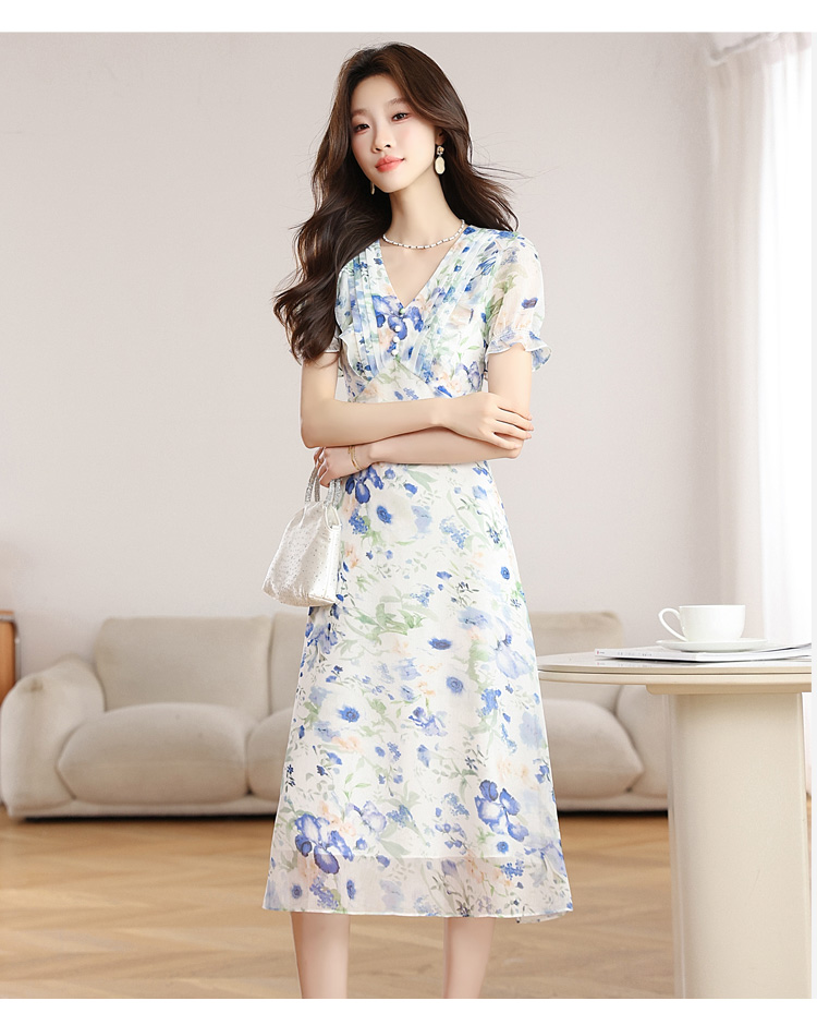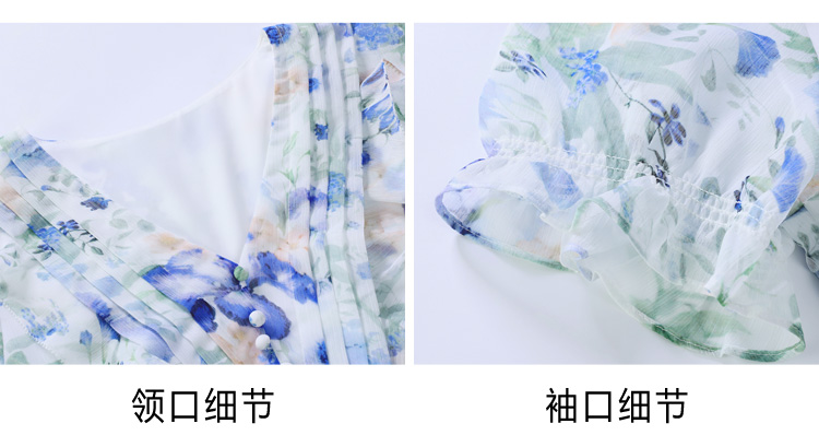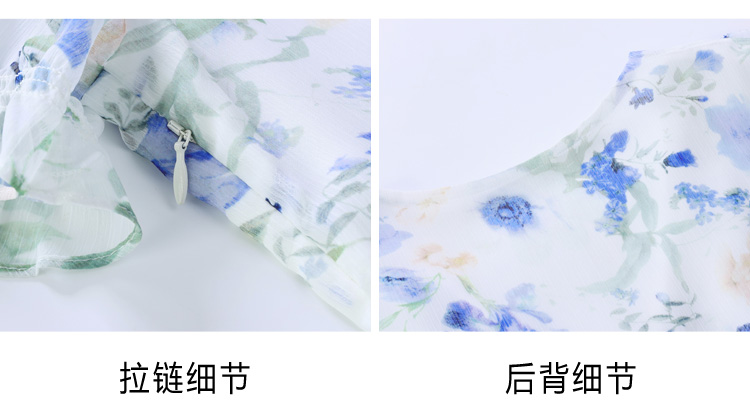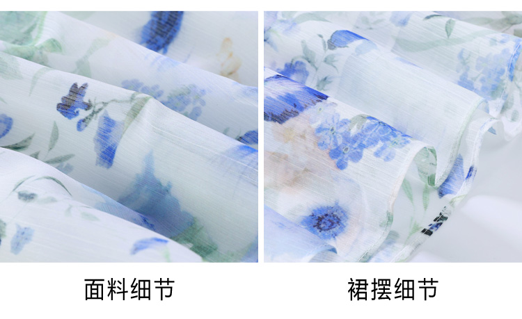 RY2252# 实拍 白底碎花连衣裙夏季新款女装海蓝花屿泡泡袖收腰雪纺裙