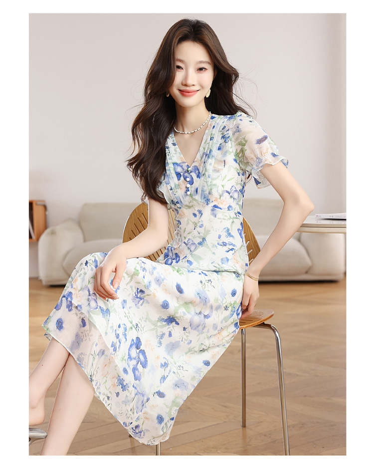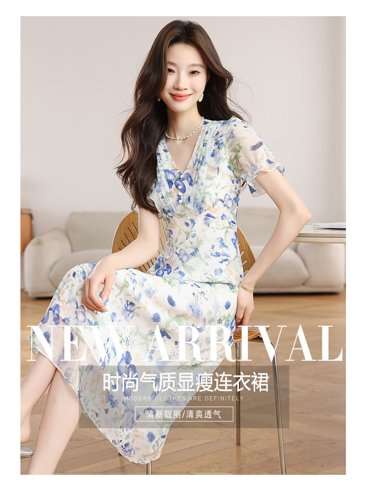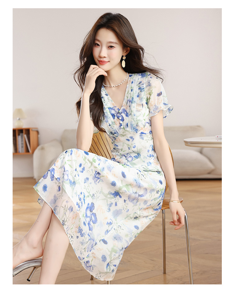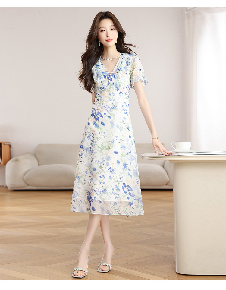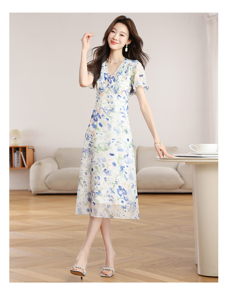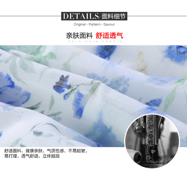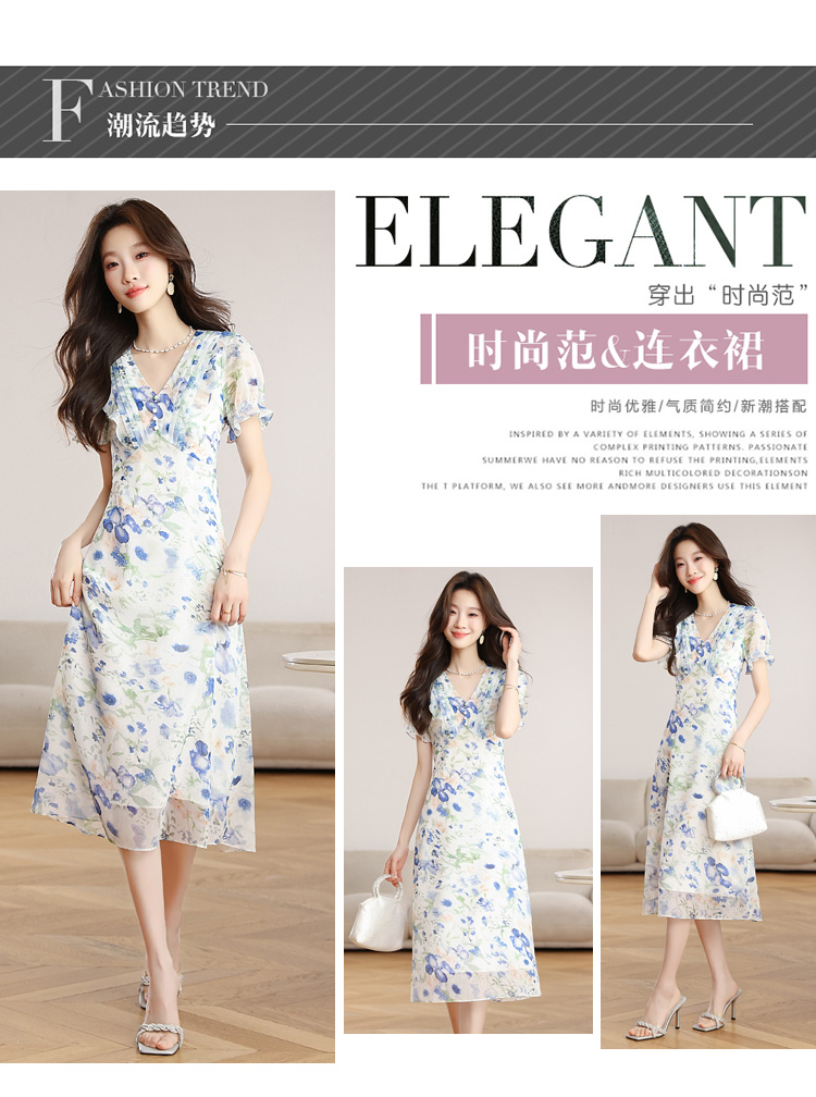 RY2252# 实拍 白底碎花连衣裙夏季新款女装海蓝花屿泡泡袖收腰雪纺裙