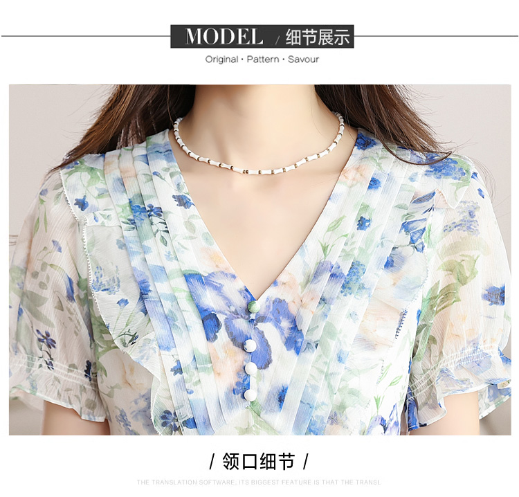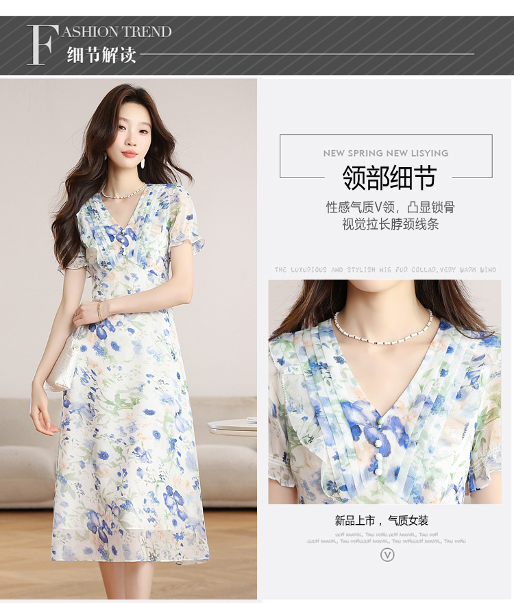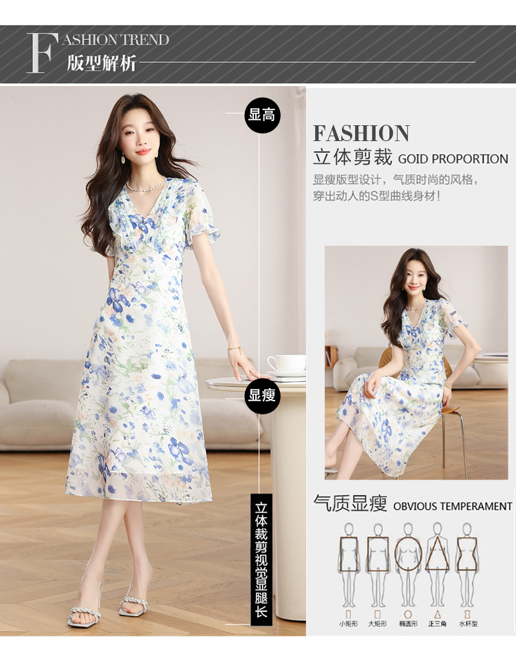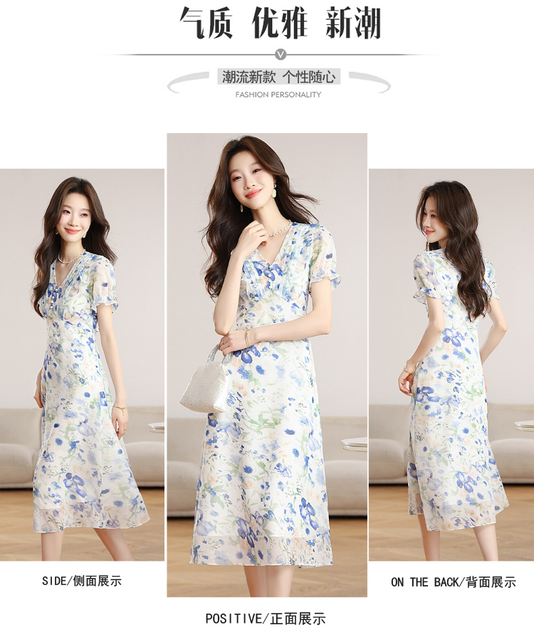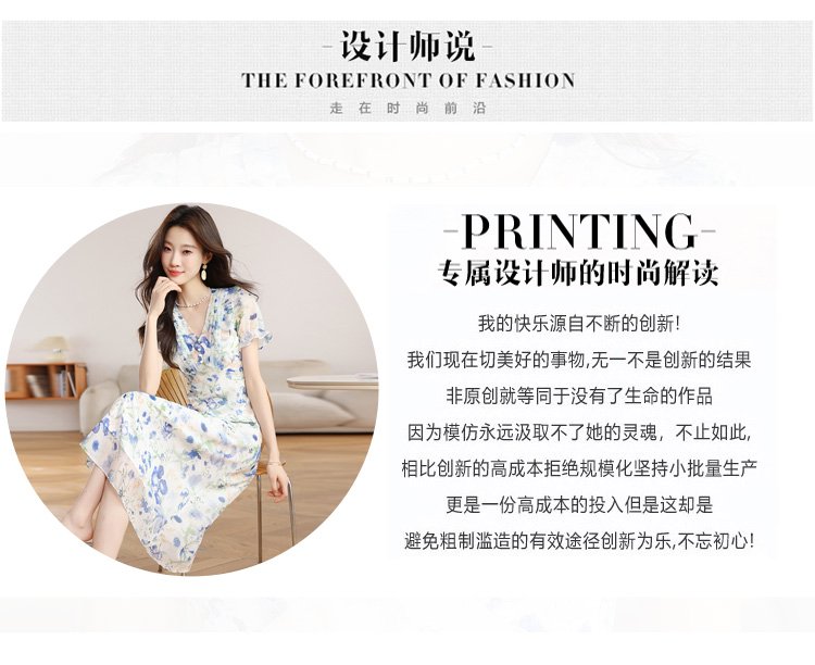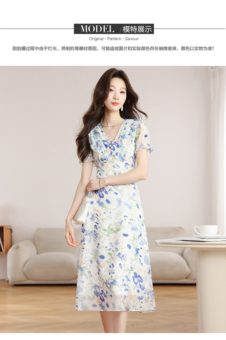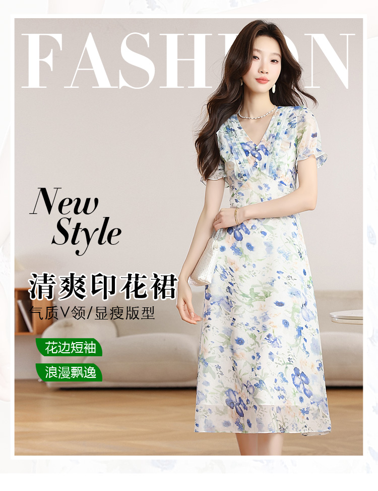 RY2252# 实拍 白底碎花连衣裙夏季新款女装海蓝花屿泡泡袖收腰雪纺裙