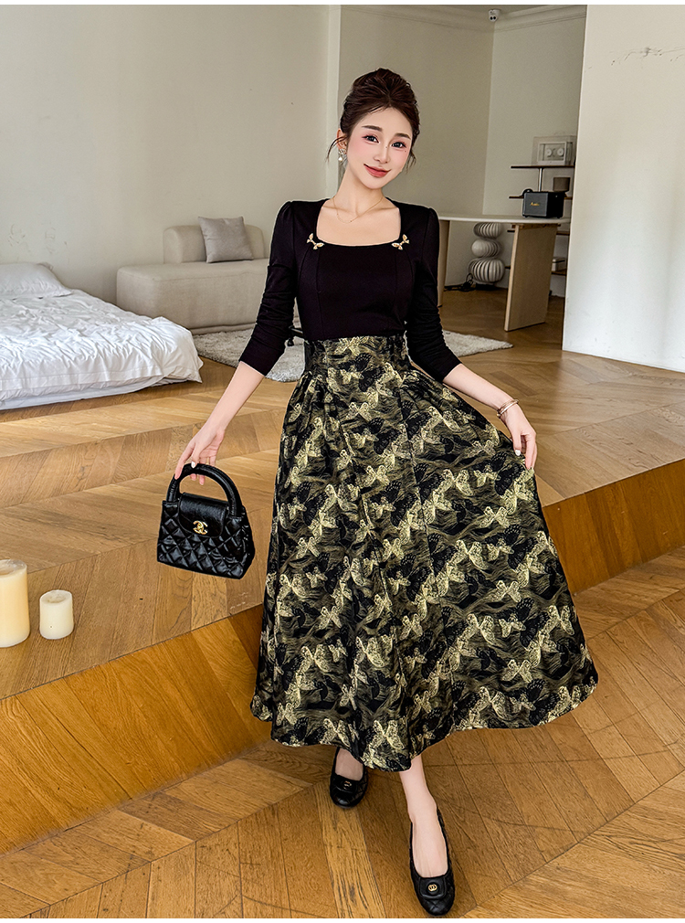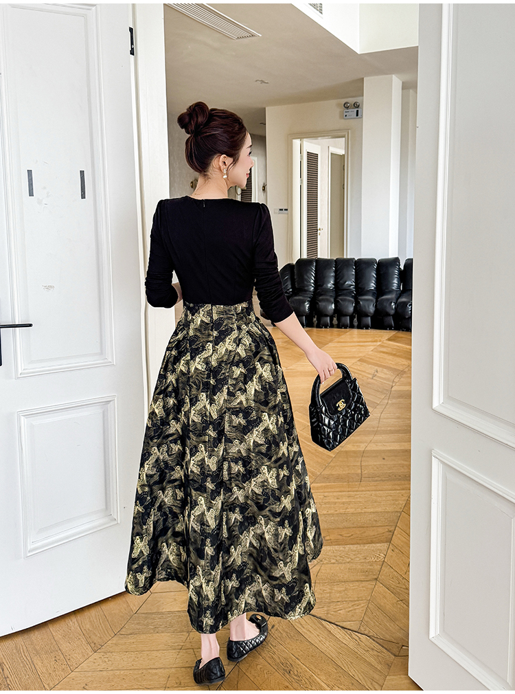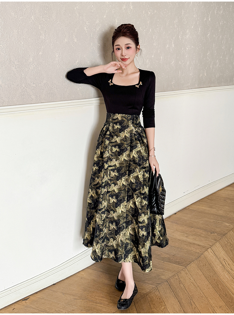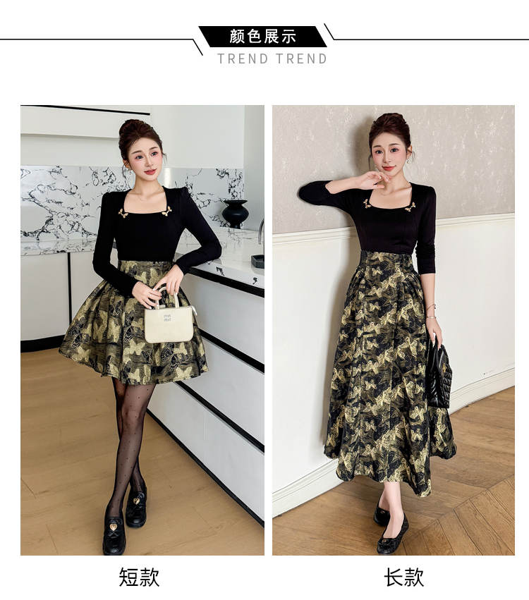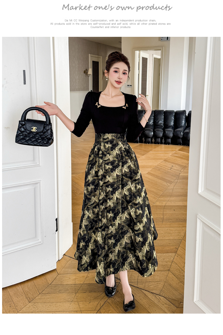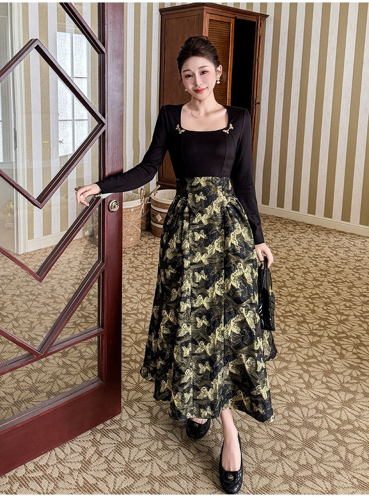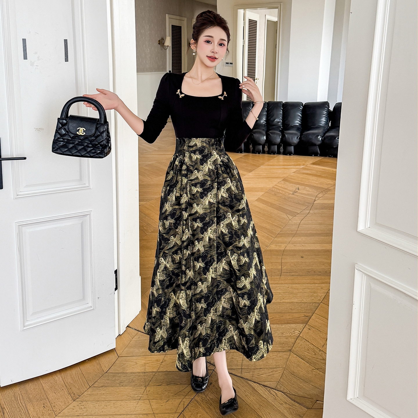 RY2275# 实拍春款大码方领拼接提花设计感复古法式高级蓬蓬连衣裙