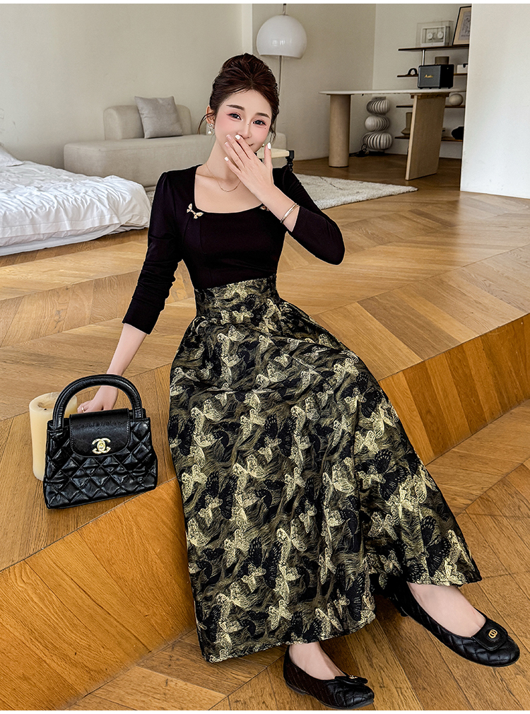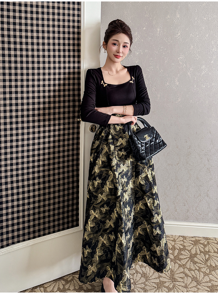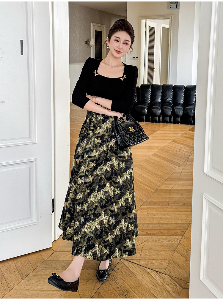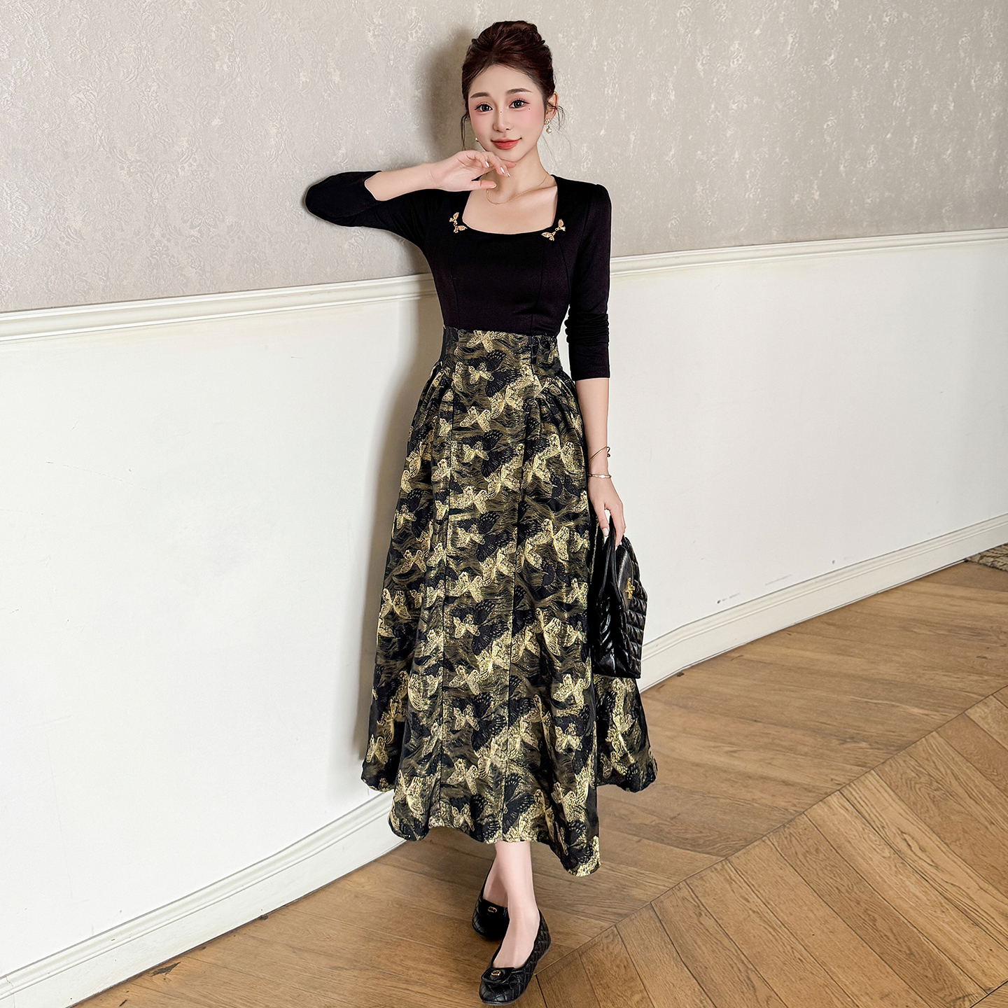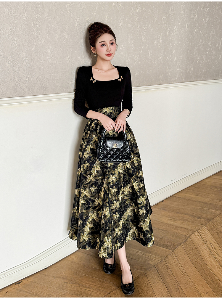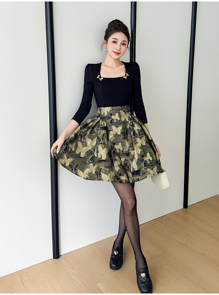 RY2275# 实拍春款大码方领拼接提花设计感复古法式高级蓬蓬连衣裙