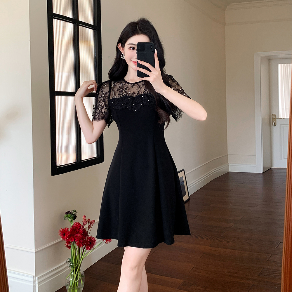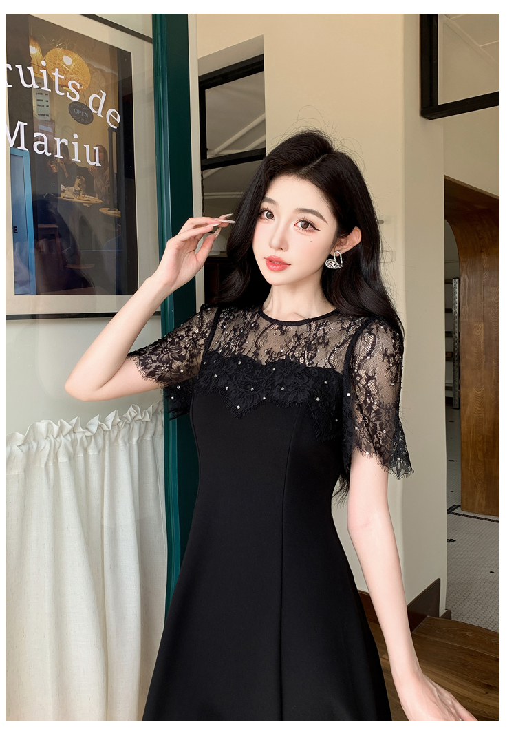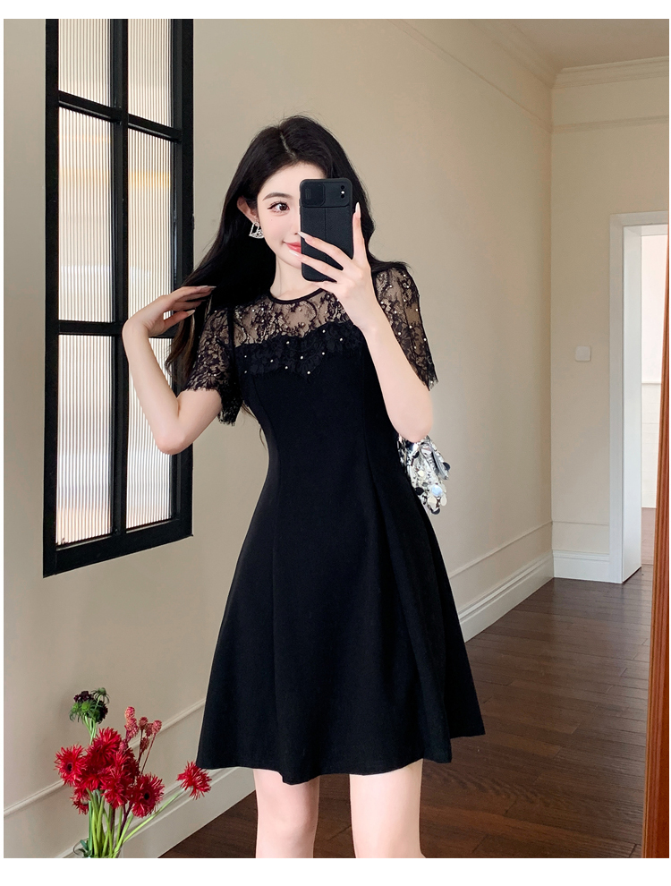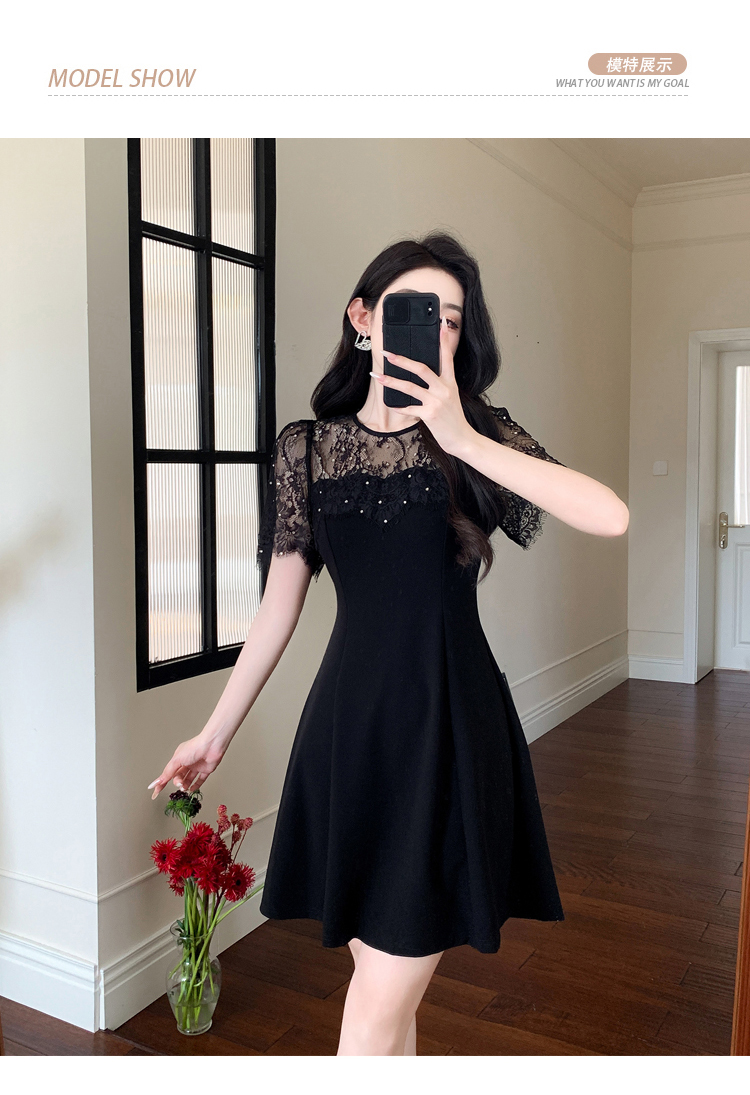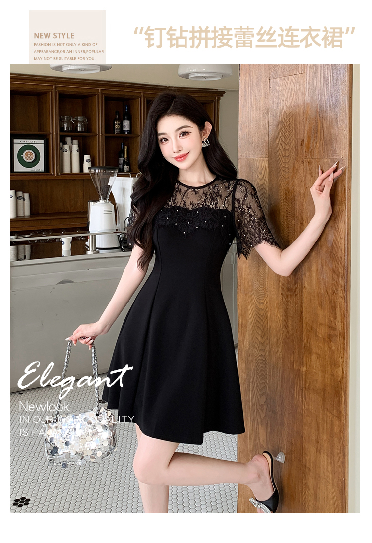 RY2281# 实拍夏季圆领蕾丝拼接烫钻拼接法式小黑裙显瘦连衣裙