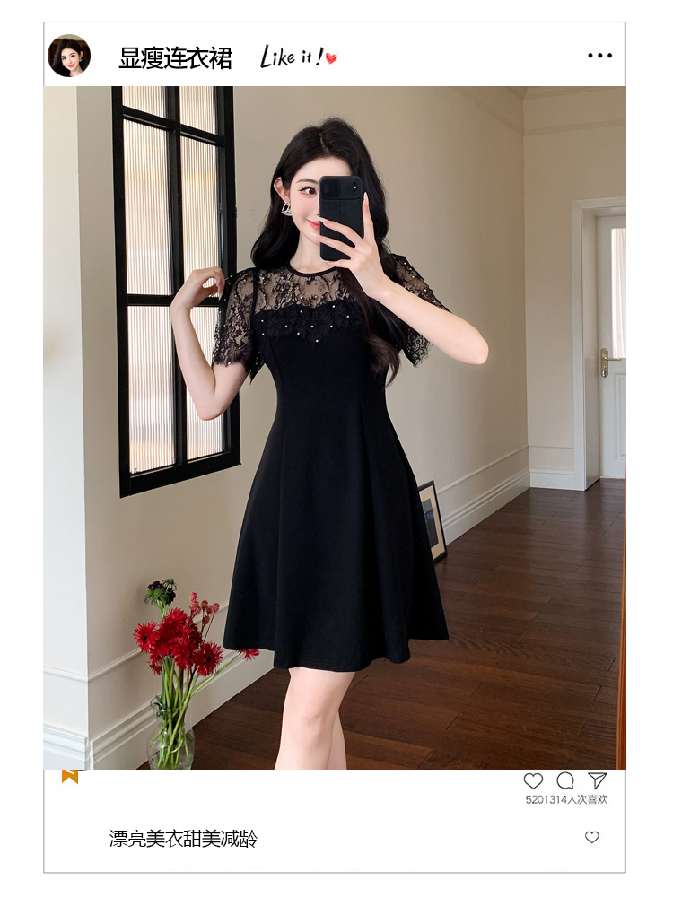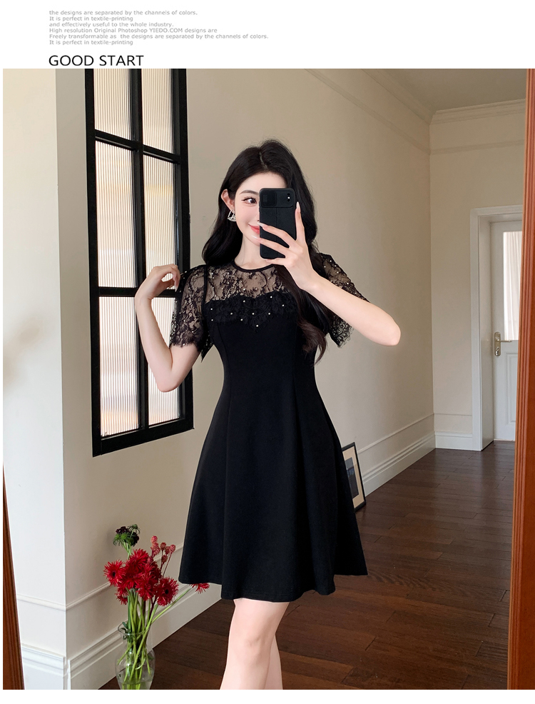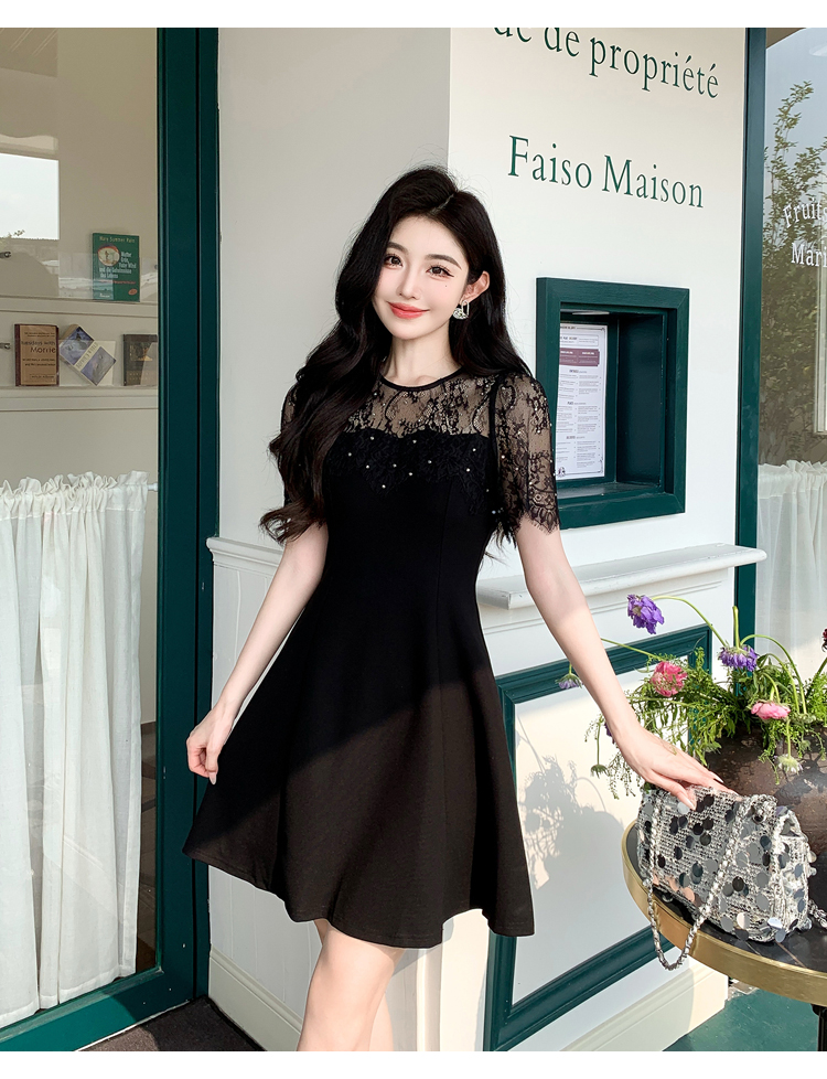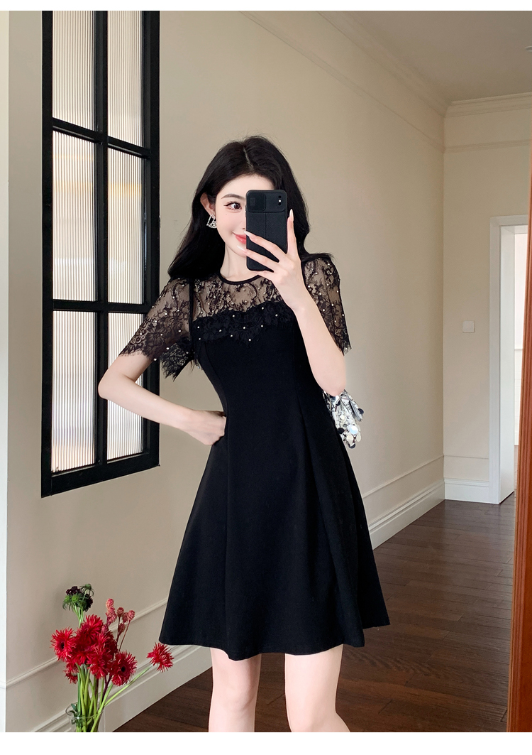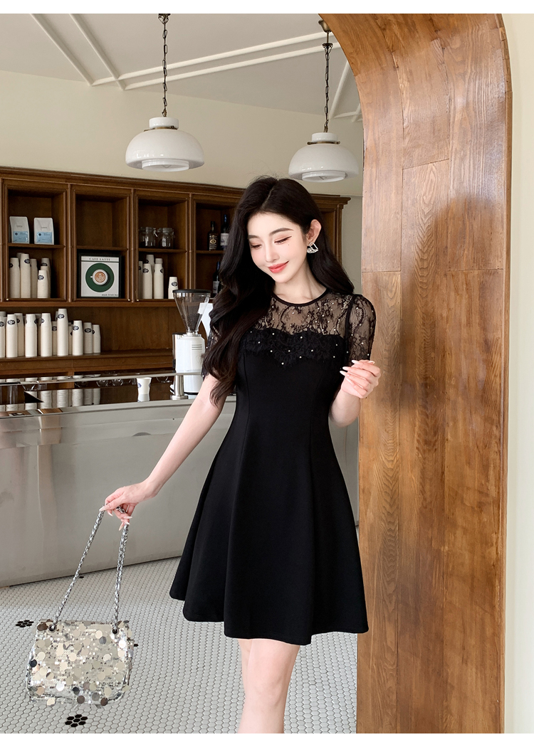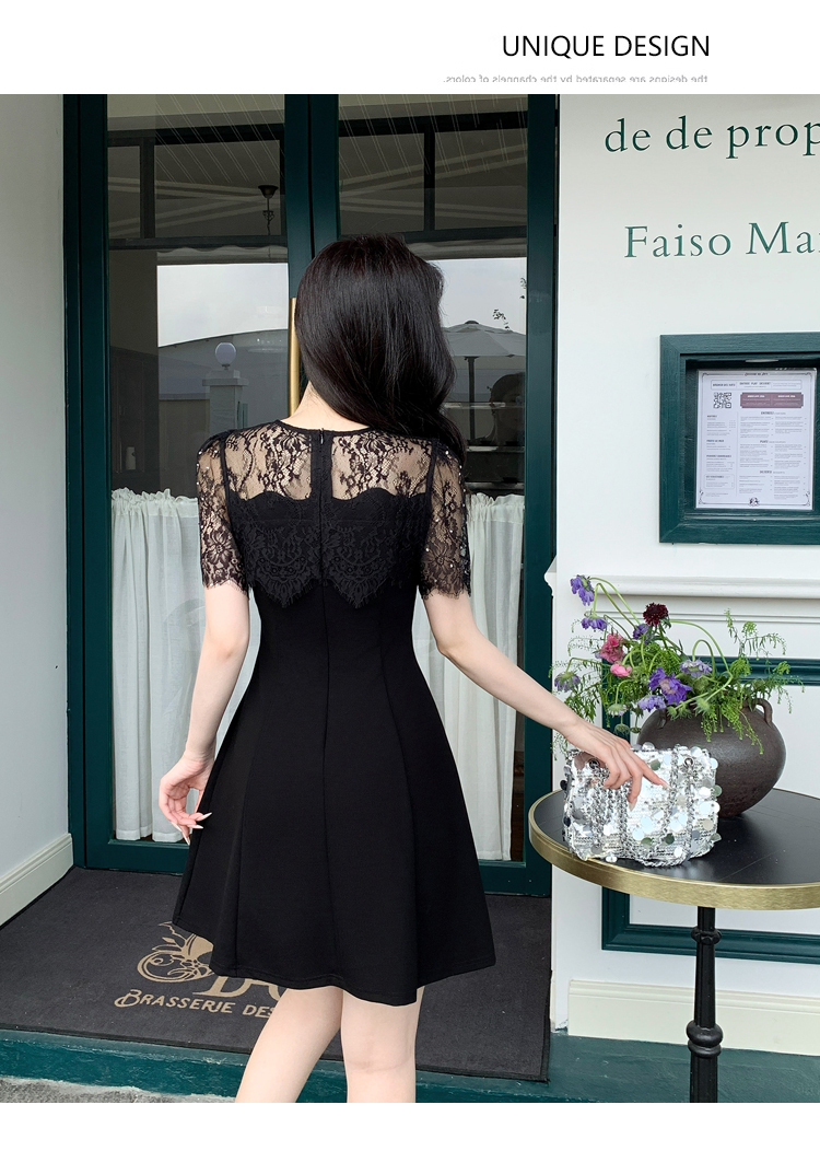RY2281# 实拍夏季圆领蕾丝拼接烫钻拼接法式小黑裙显瘦连衣裙
