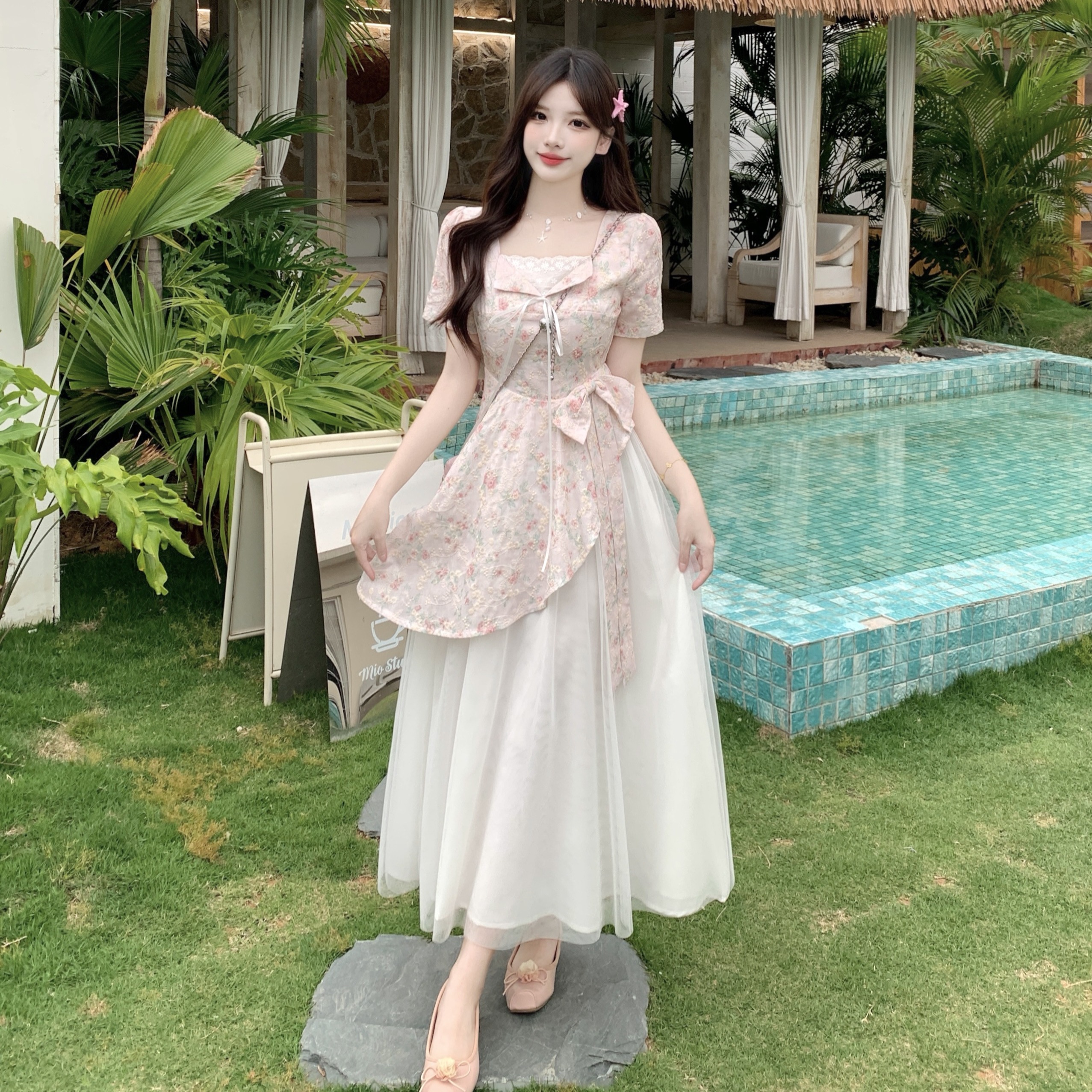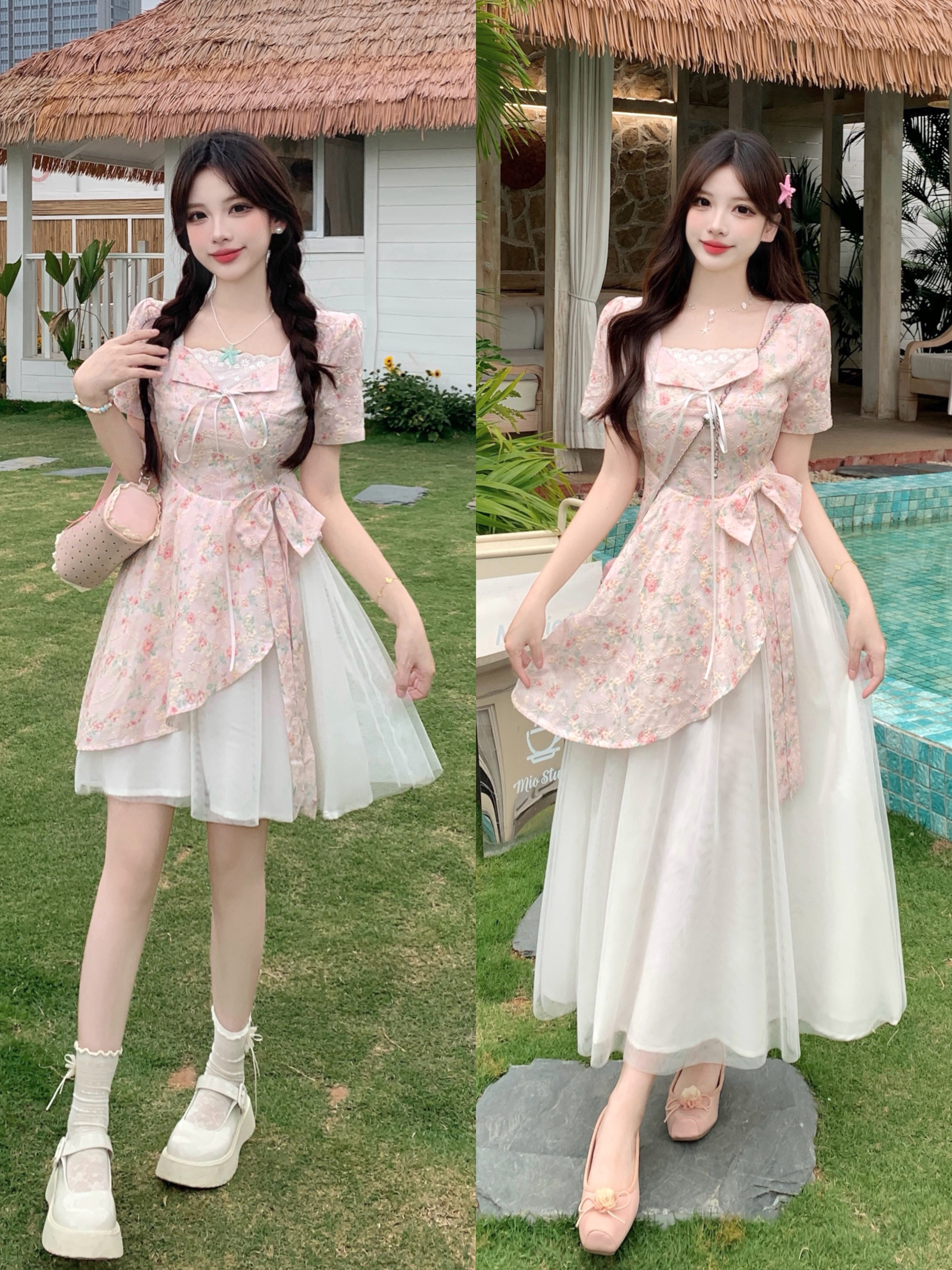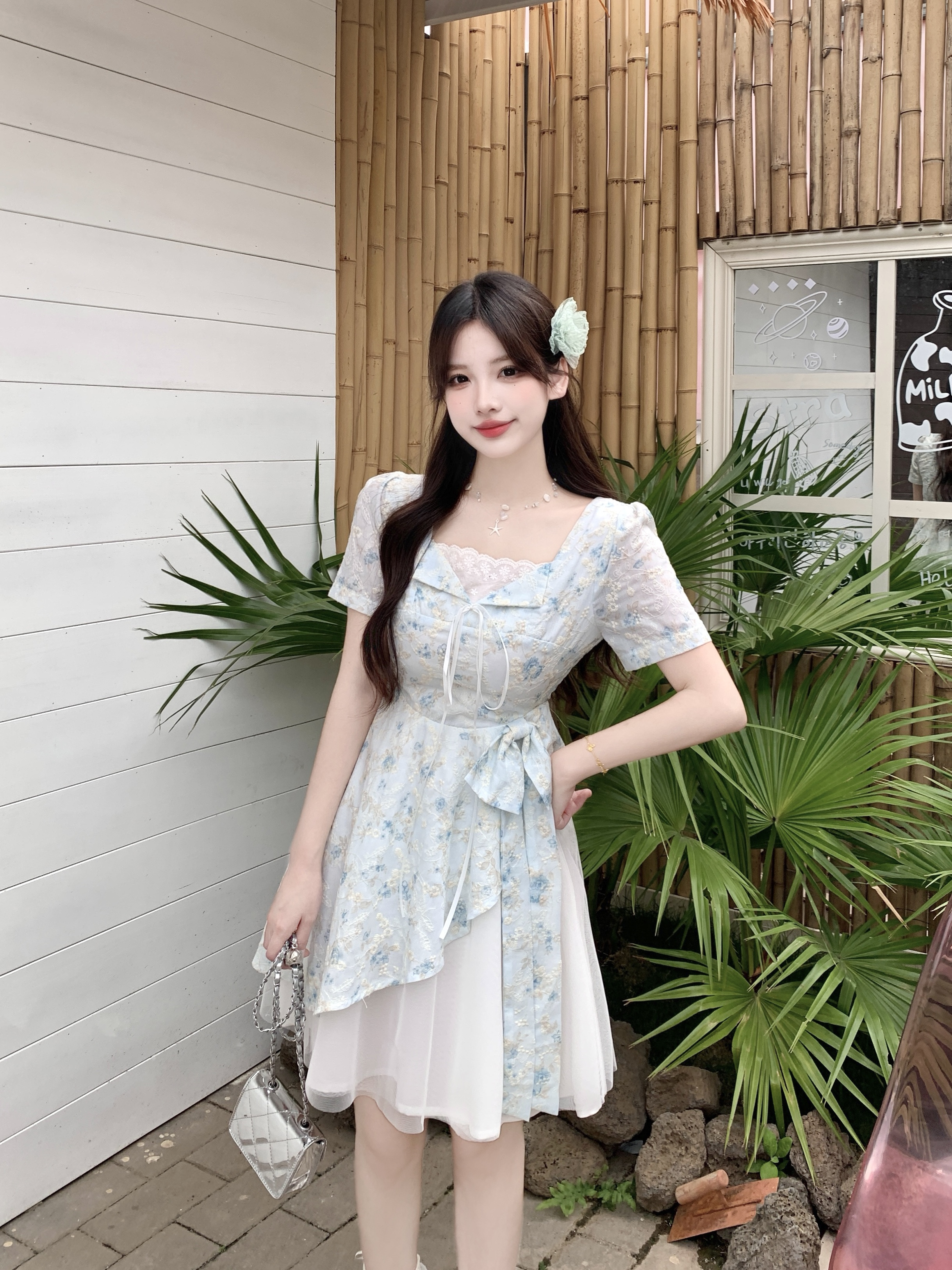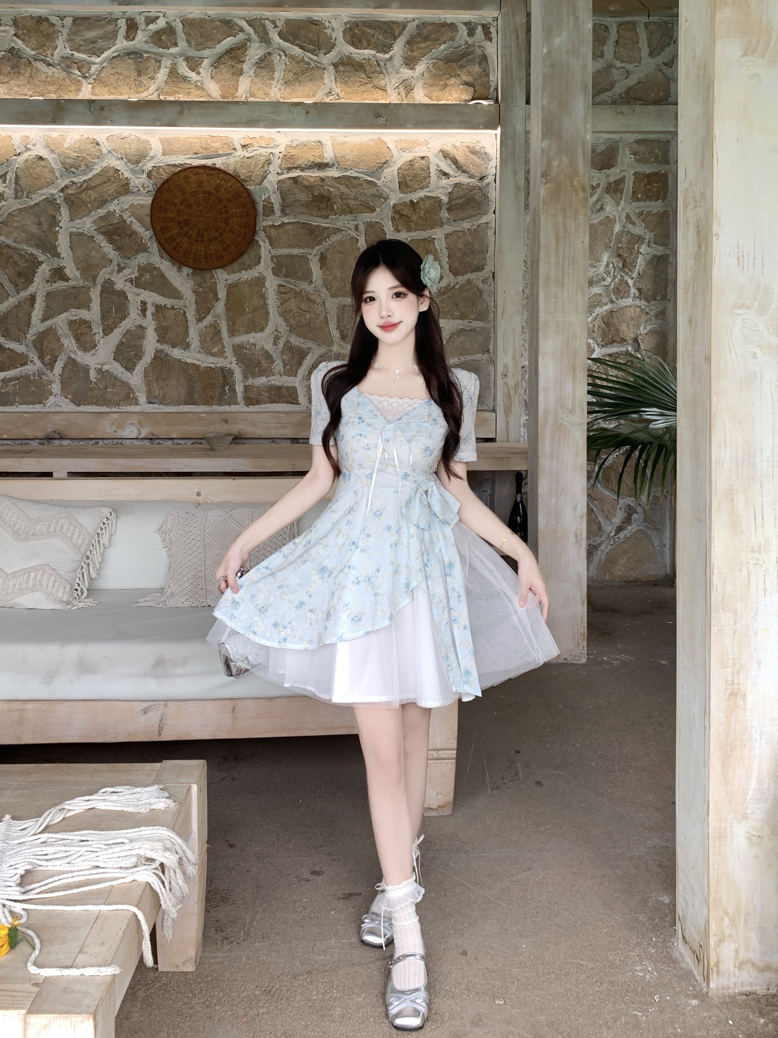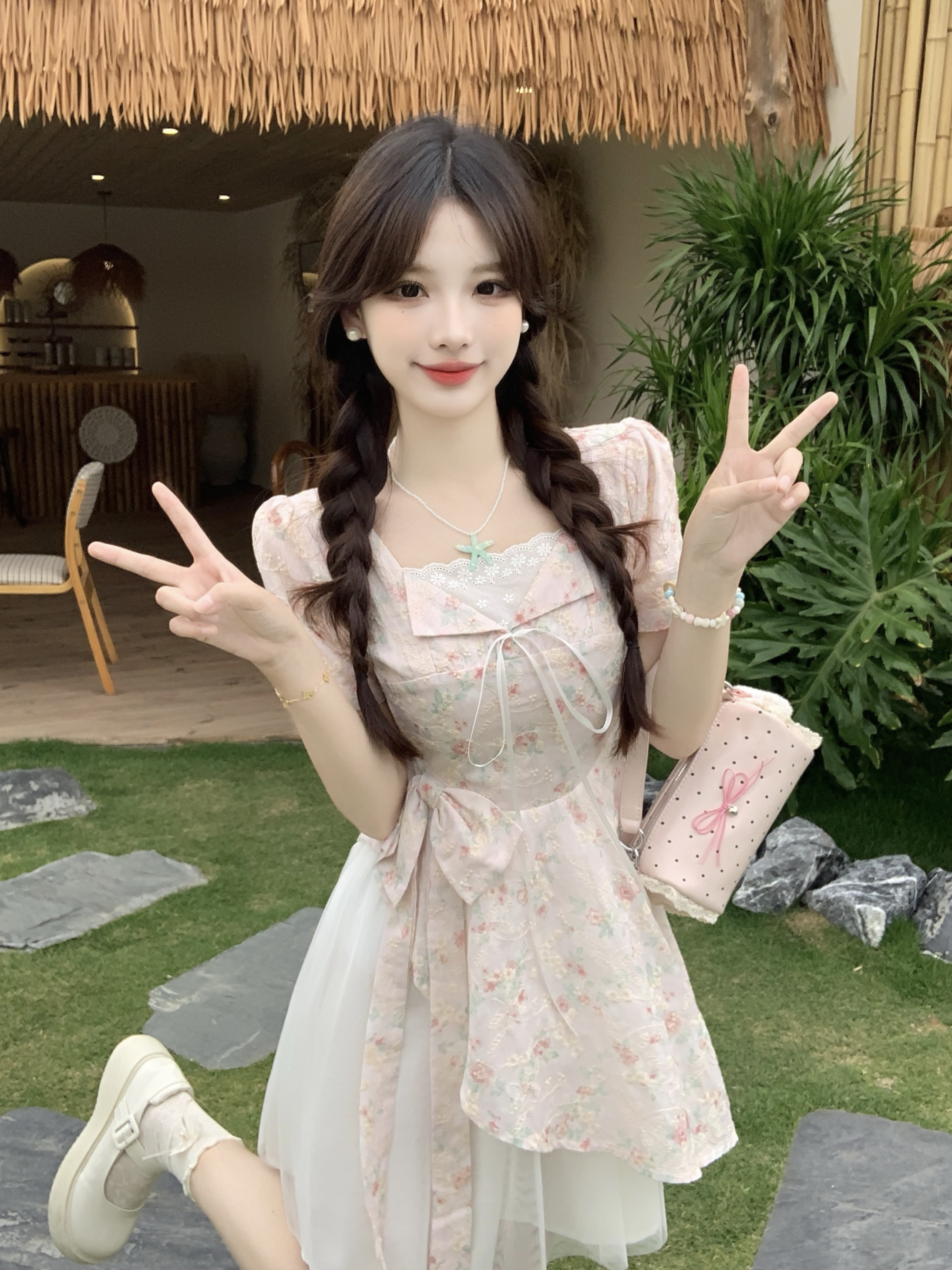 RY2285# 大码2026清甜一夏微胖mm公主风设计感拼接网纱甜美蝴蝶结连衣裙