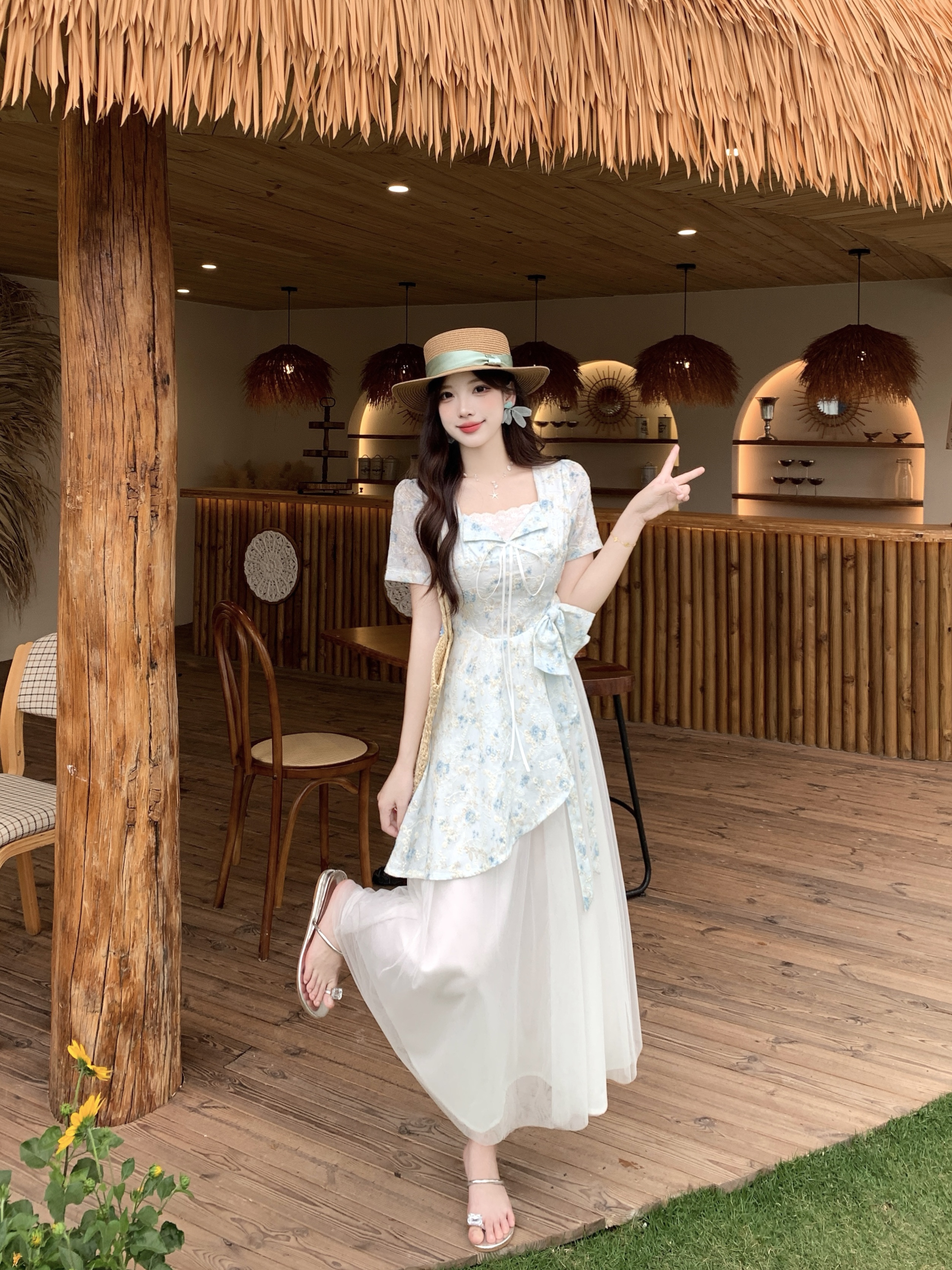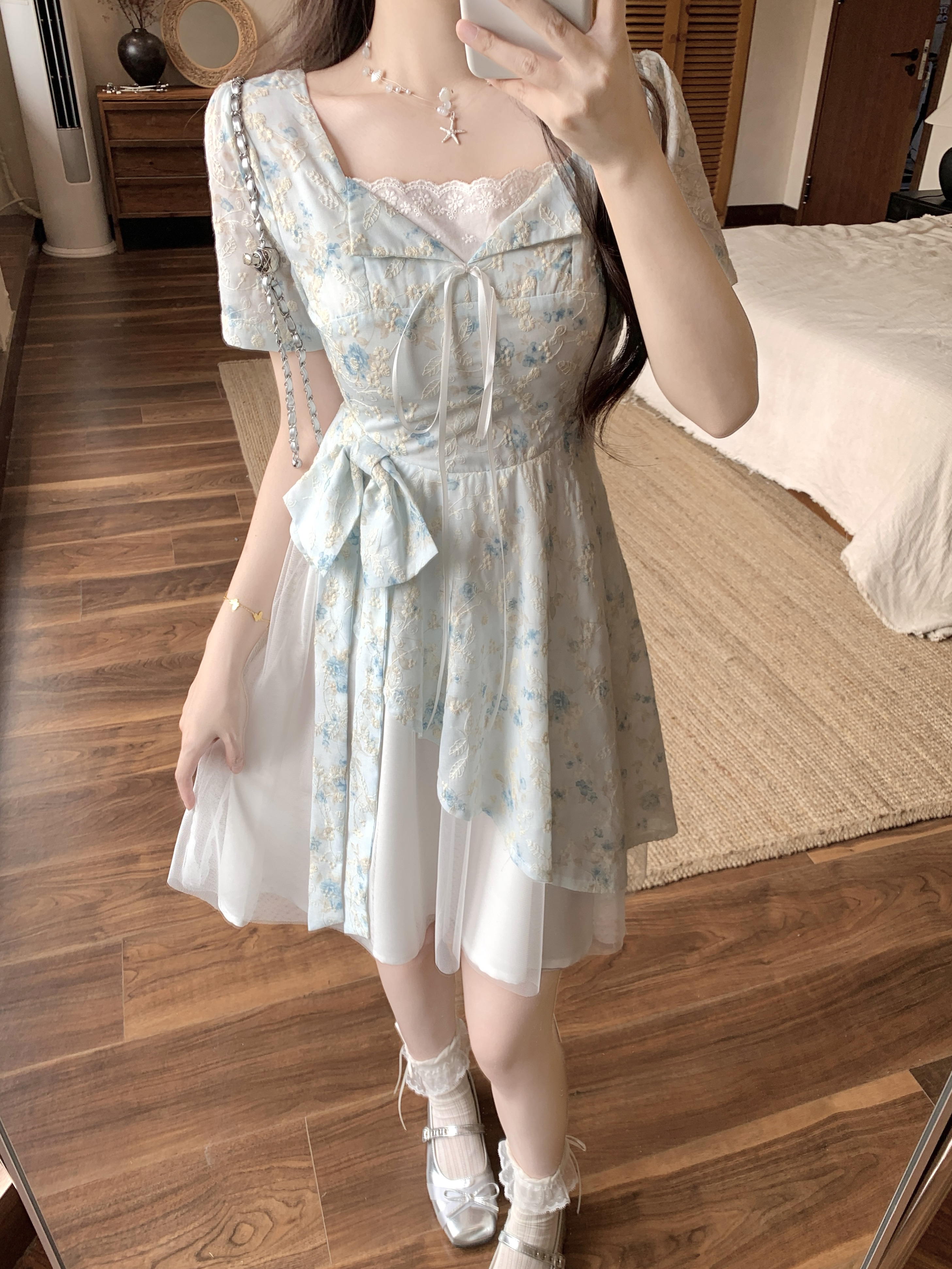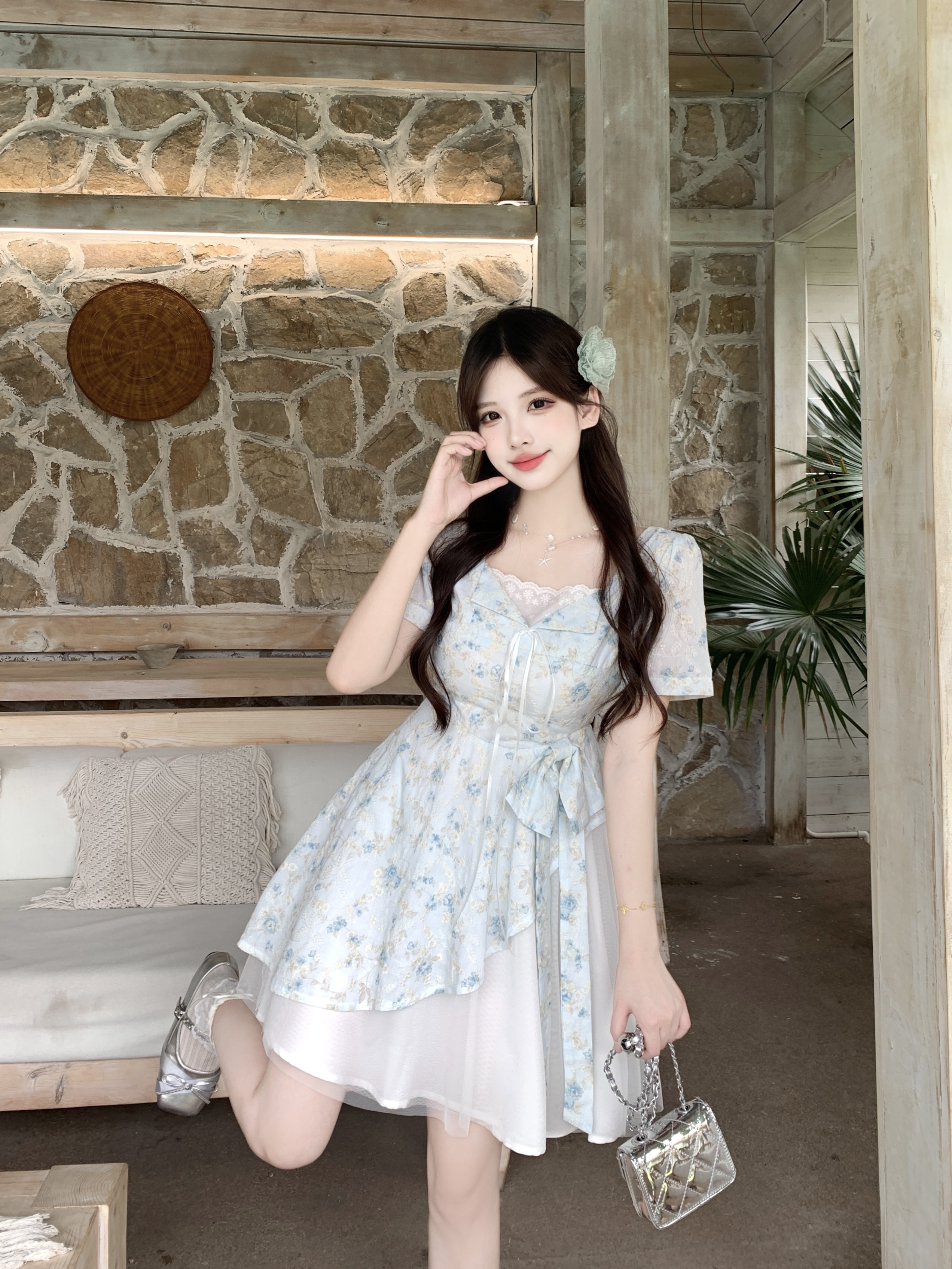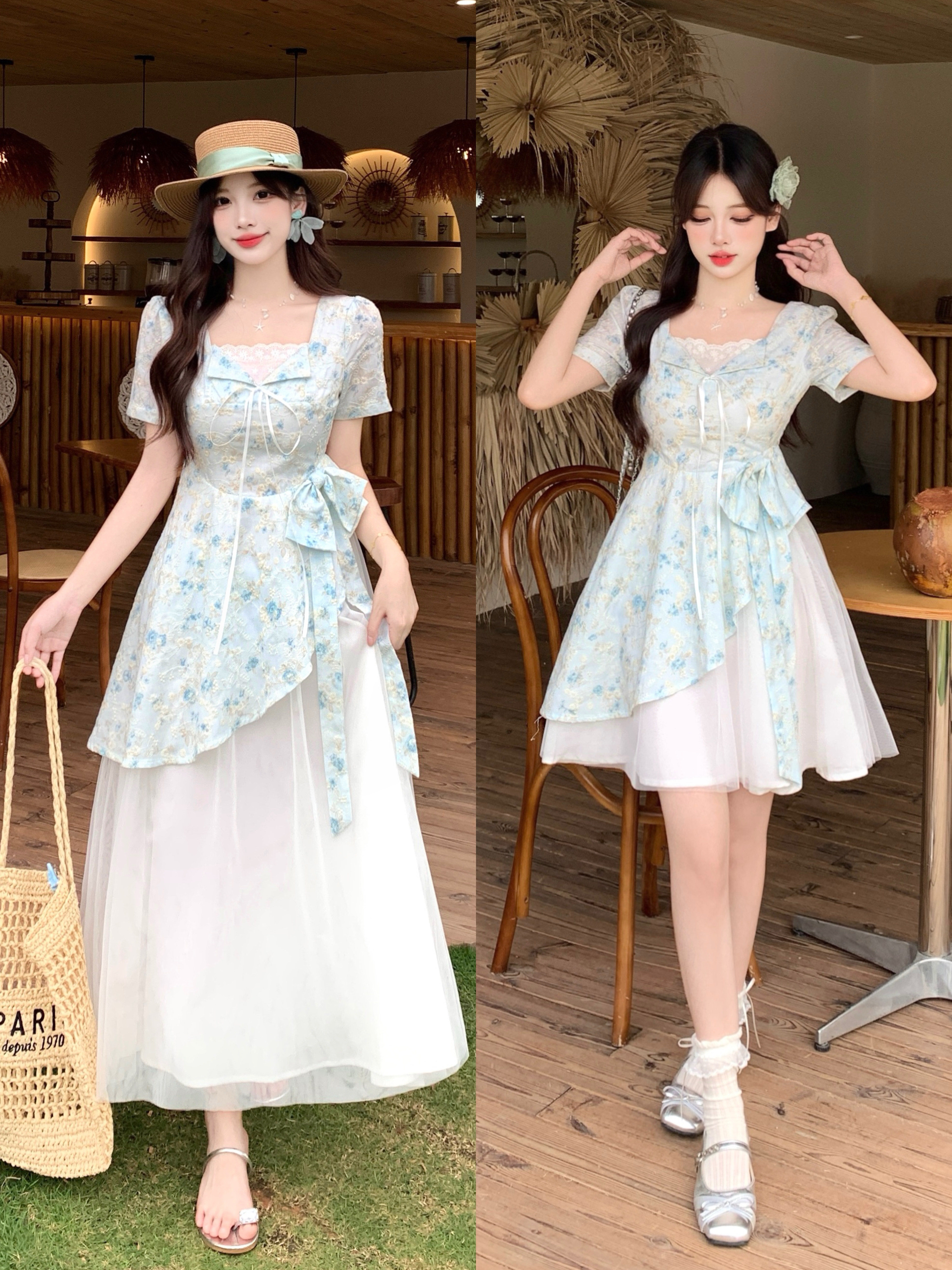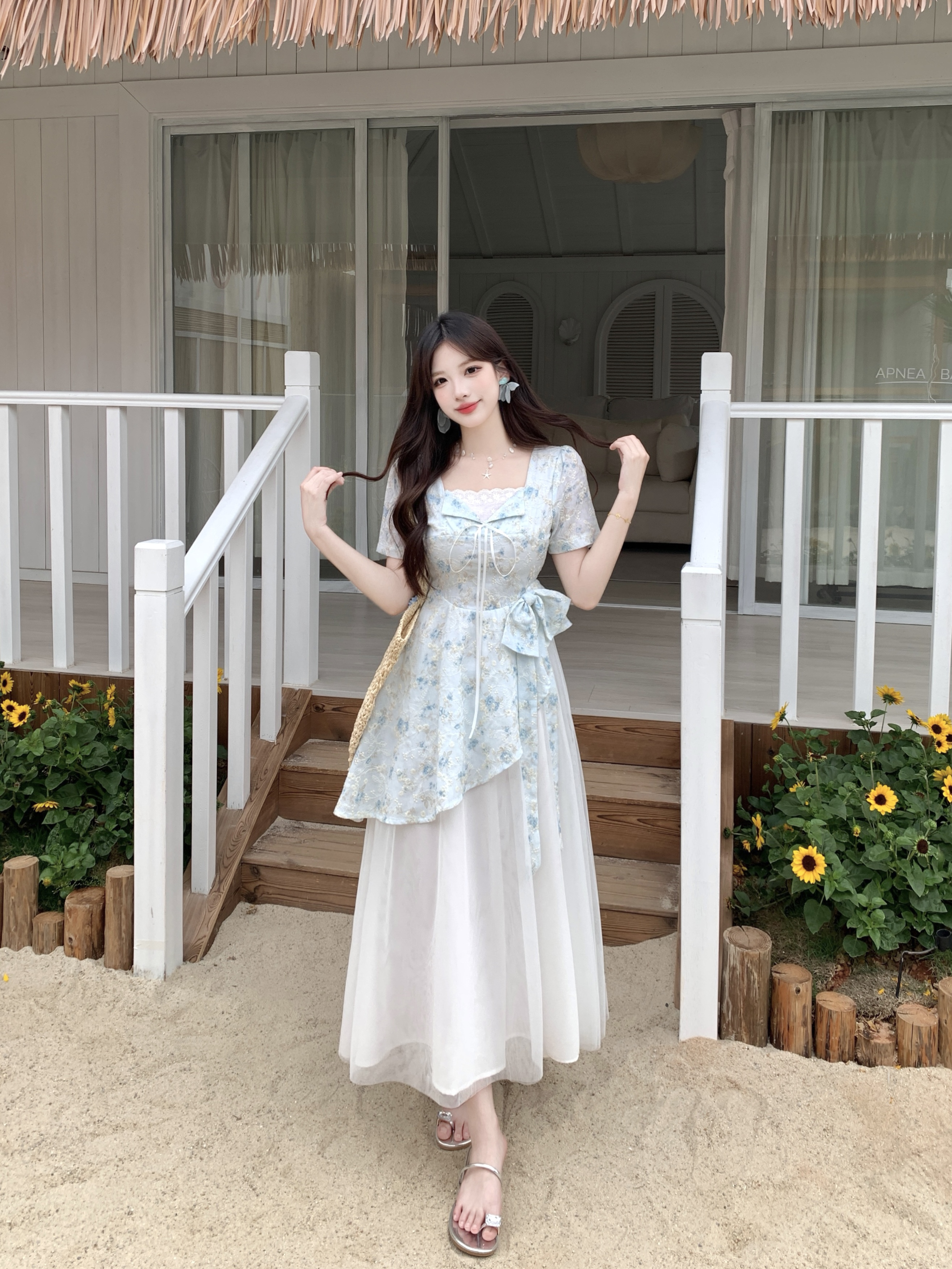 RY2285# 大码2026清甜一夏微胖mm公主风设计感拼接网纱甜美蝴蝶结连衣裙