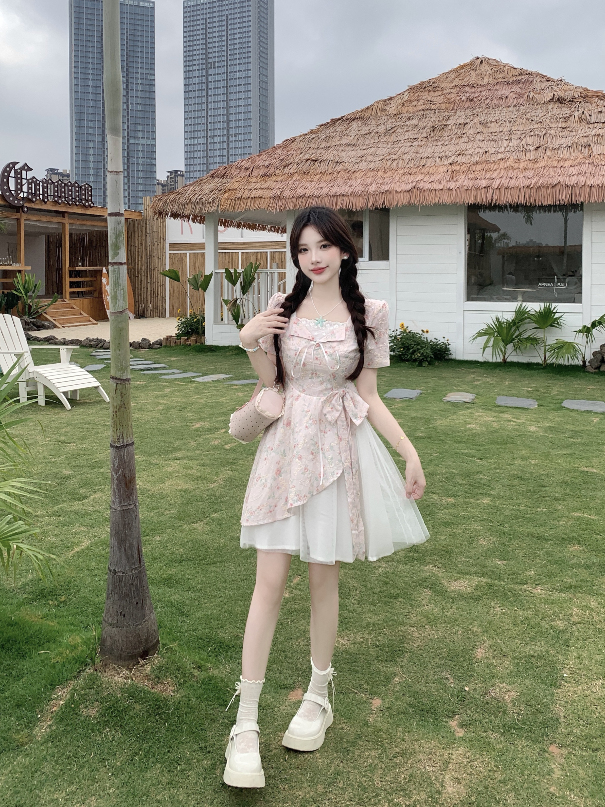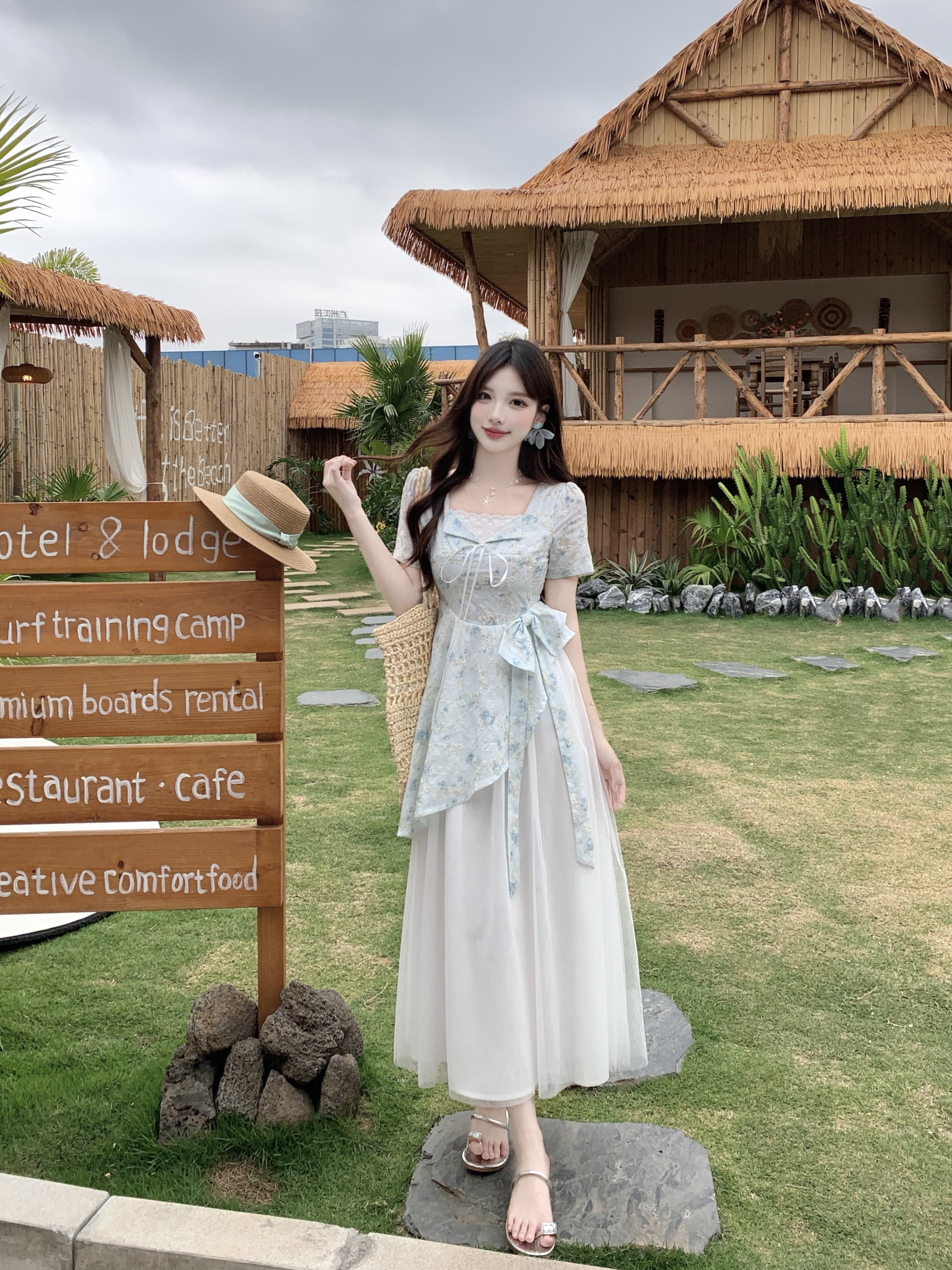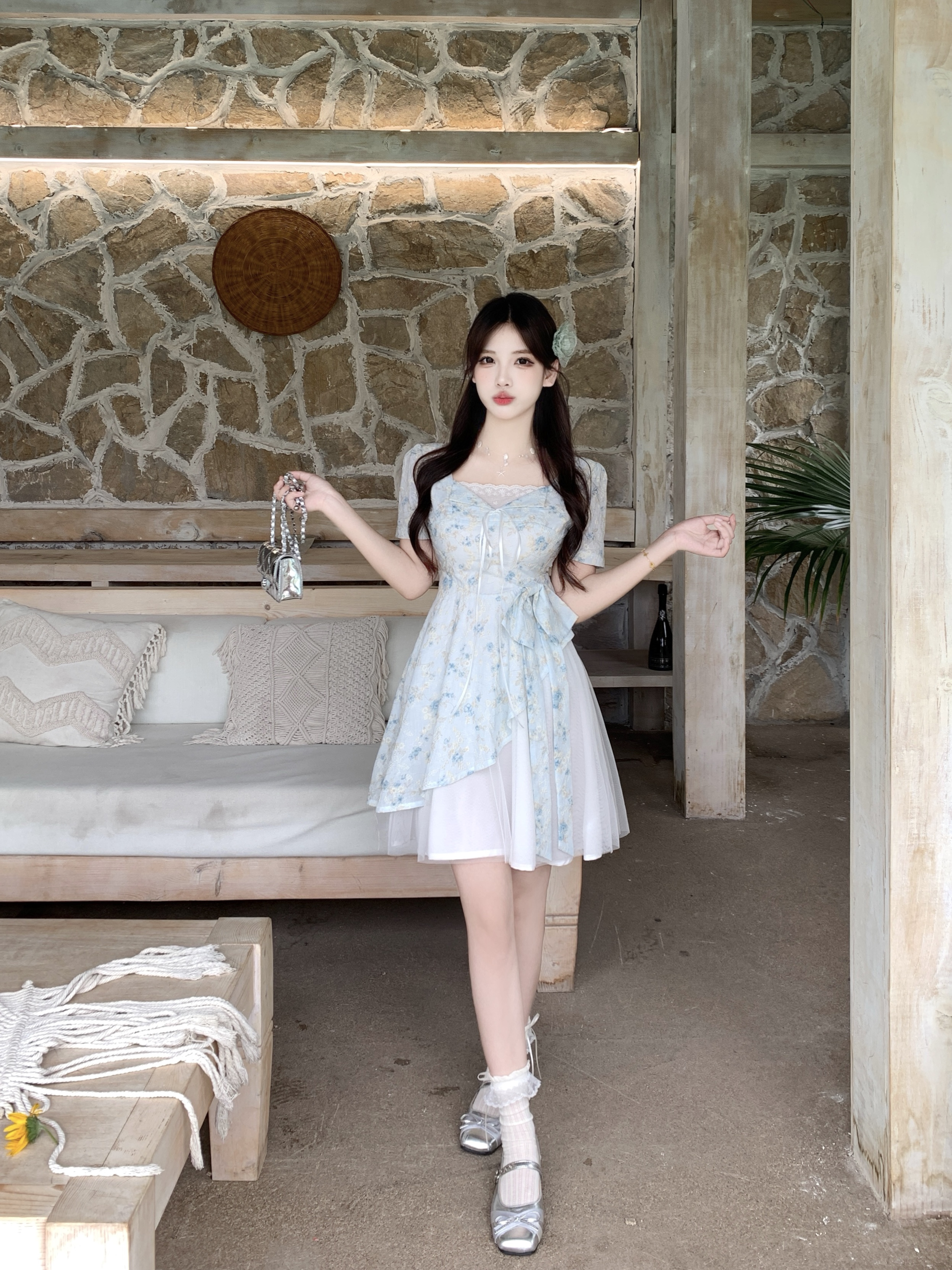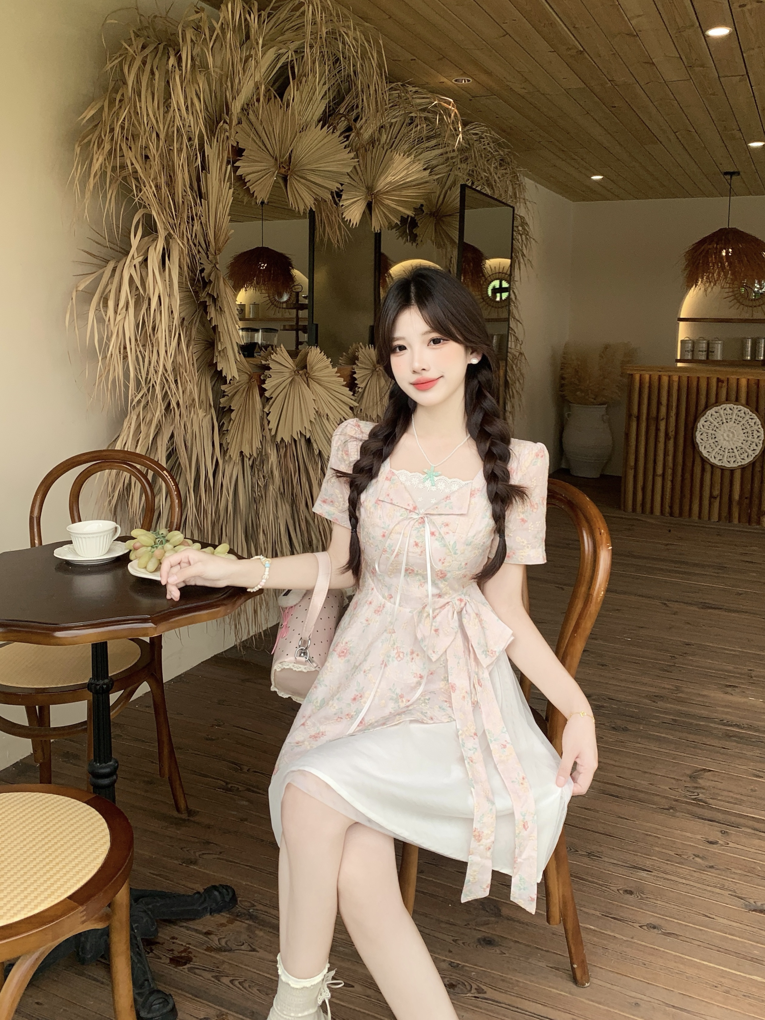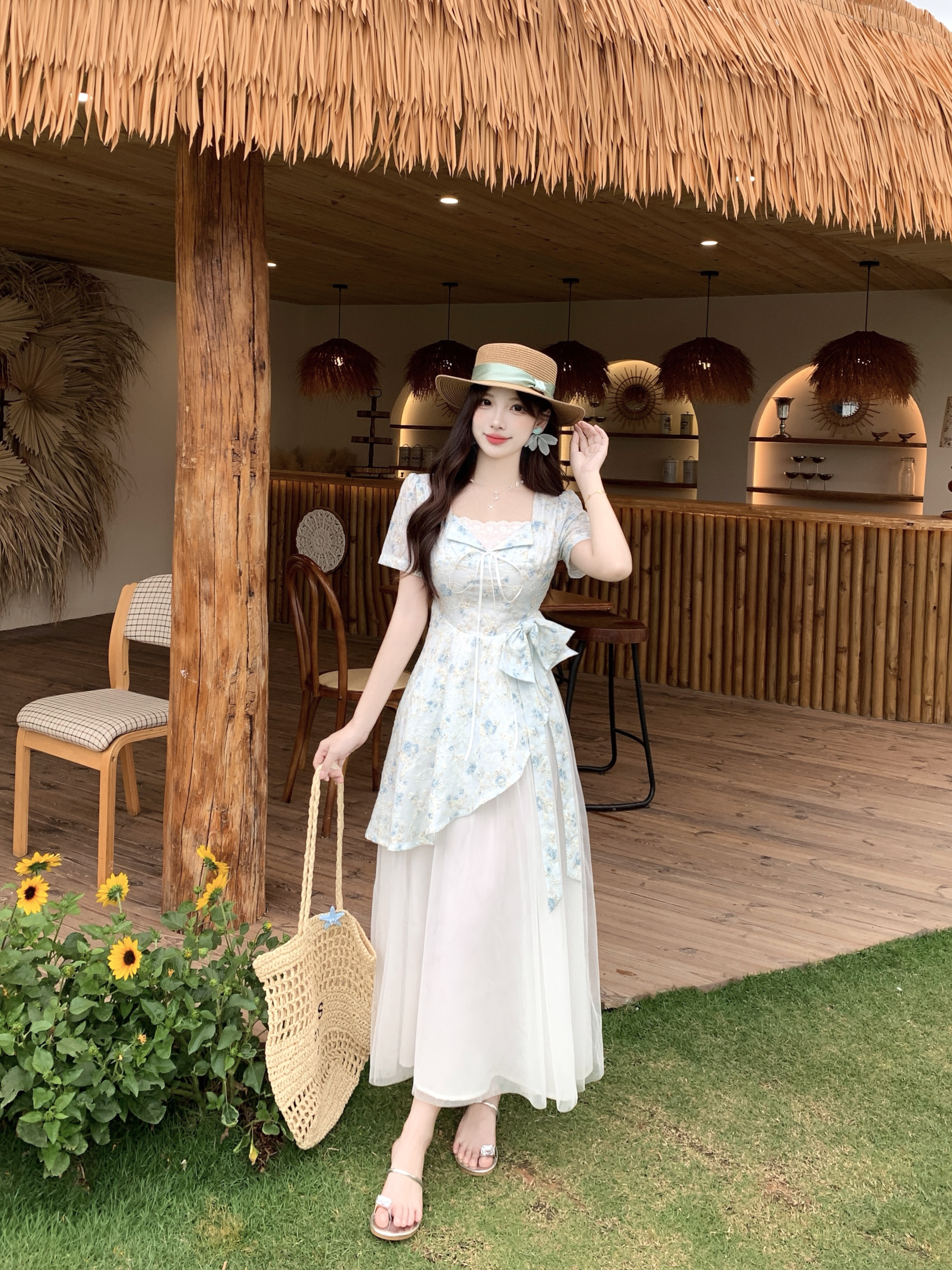 RY2285# 大码2026清甜一夏微胖mm公主风设计感拼接网纱甜美蝴蝶结连衣裙