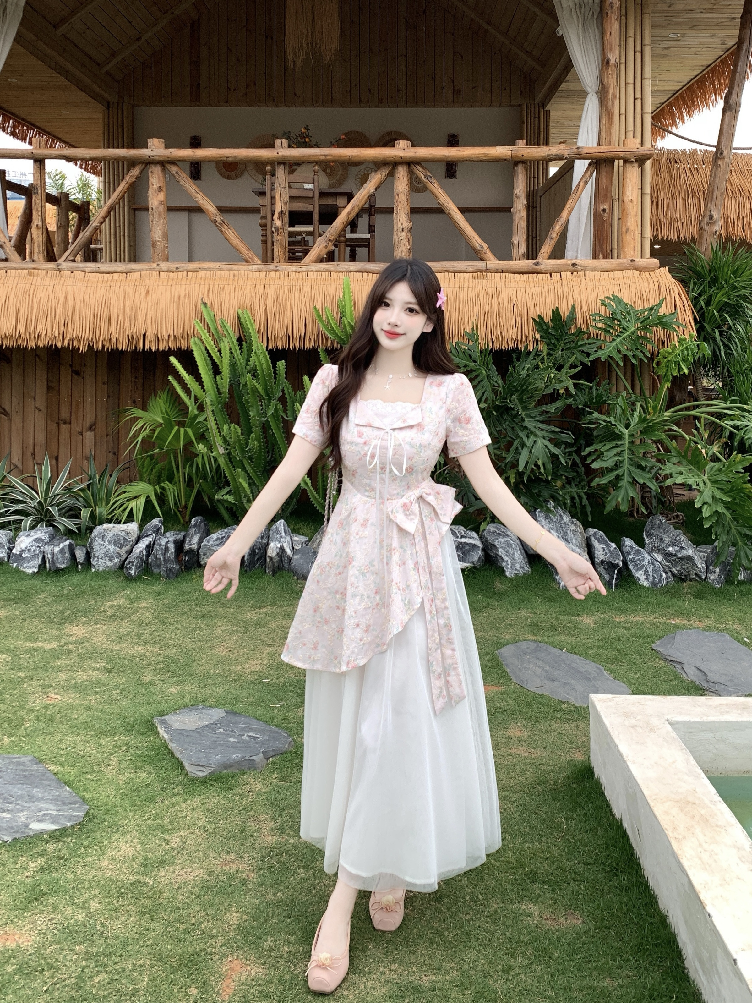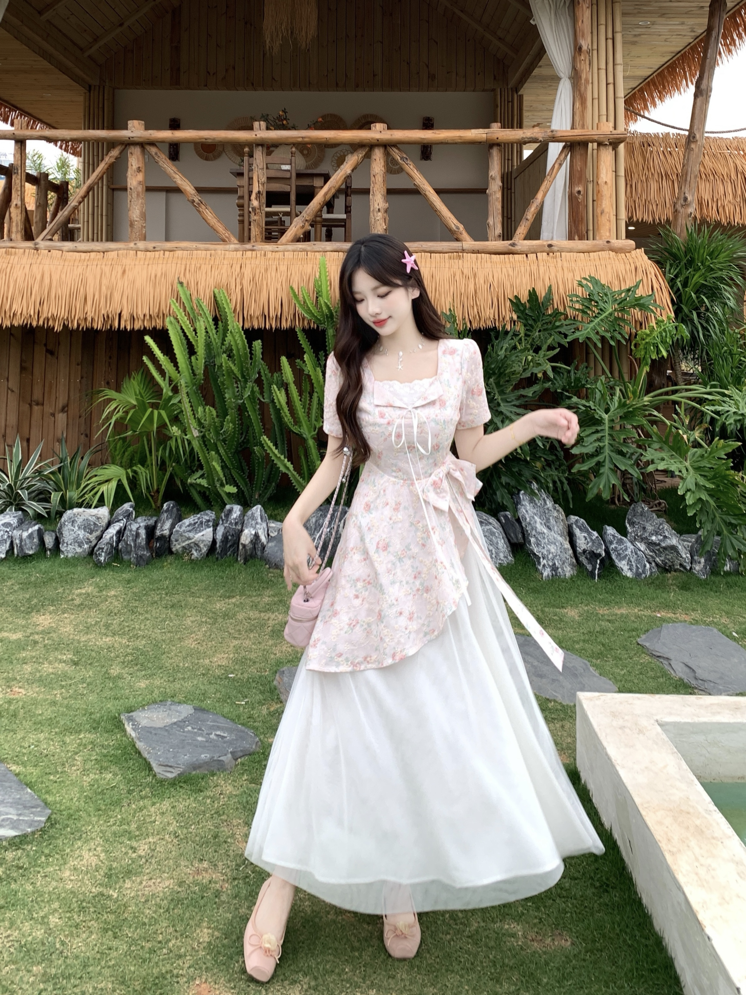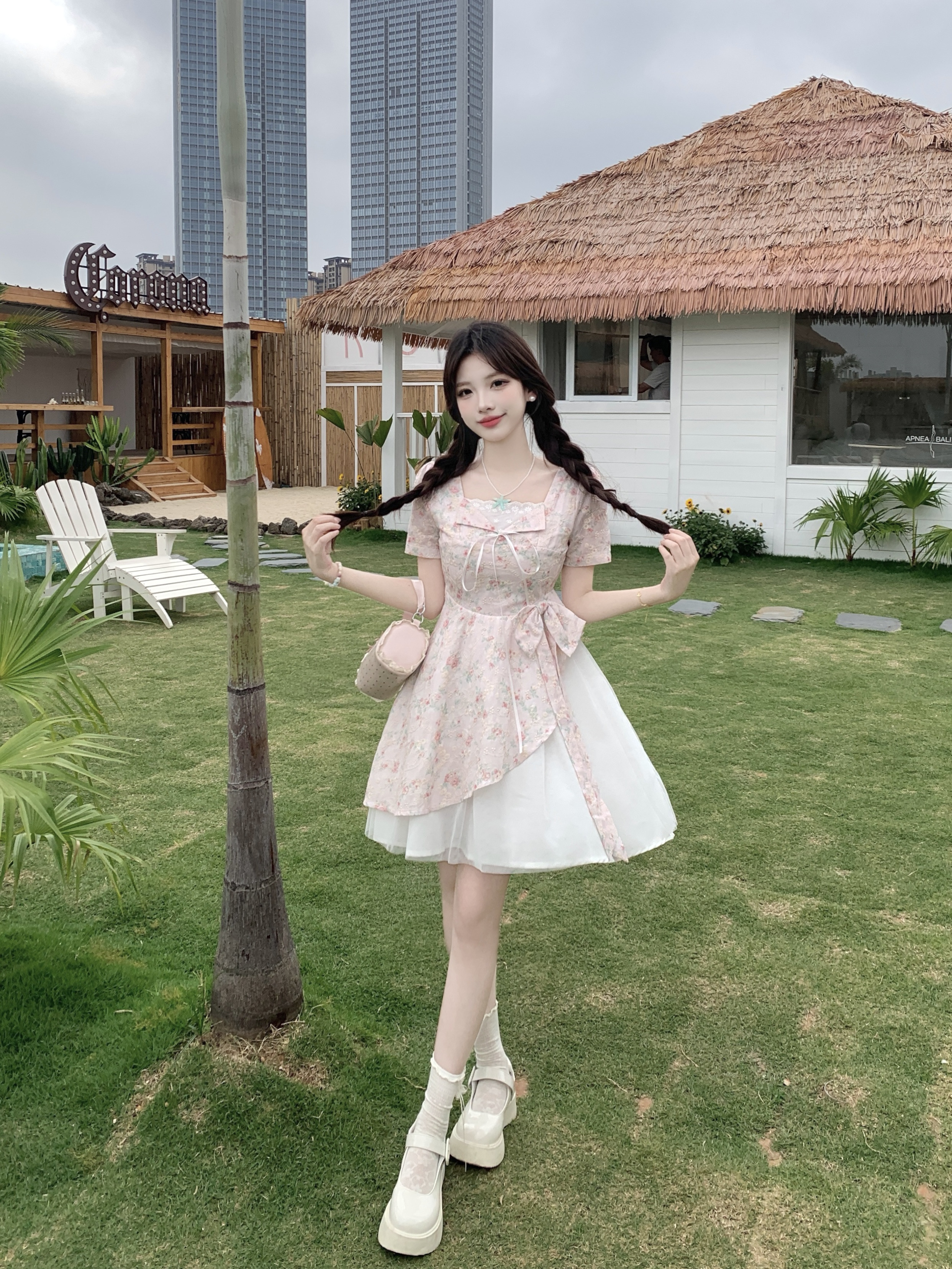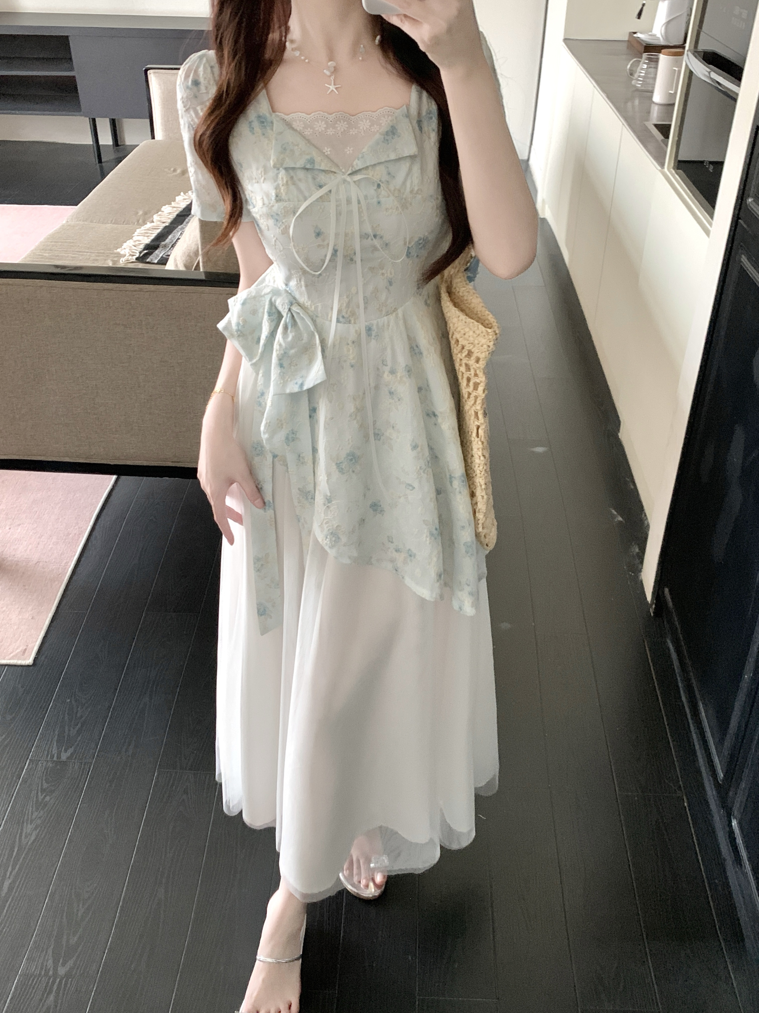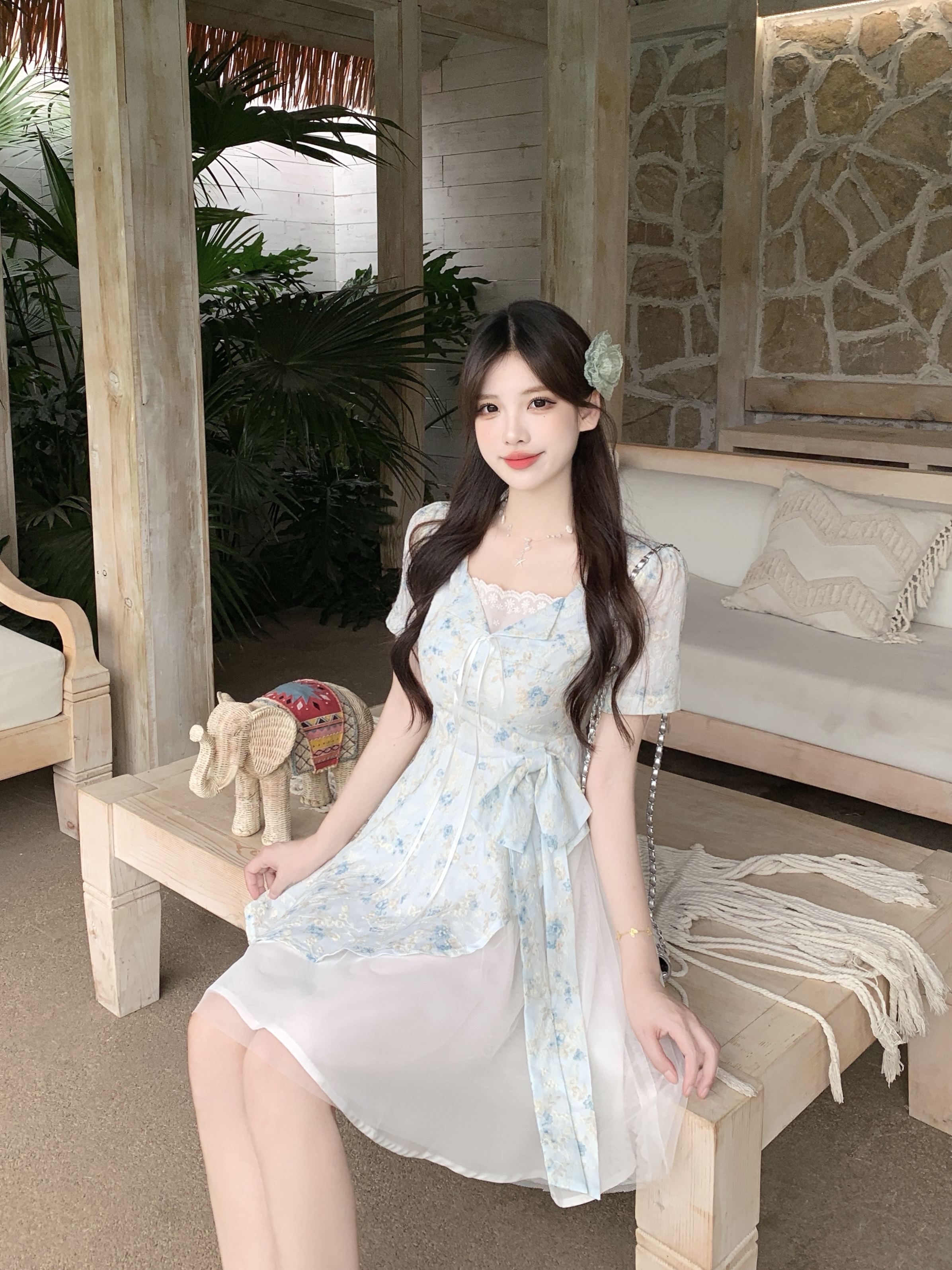 RY2285# 大码2026清甜一夏微胖mm公主风设计感拼接网纱甜美蝴蝶结连衣裙