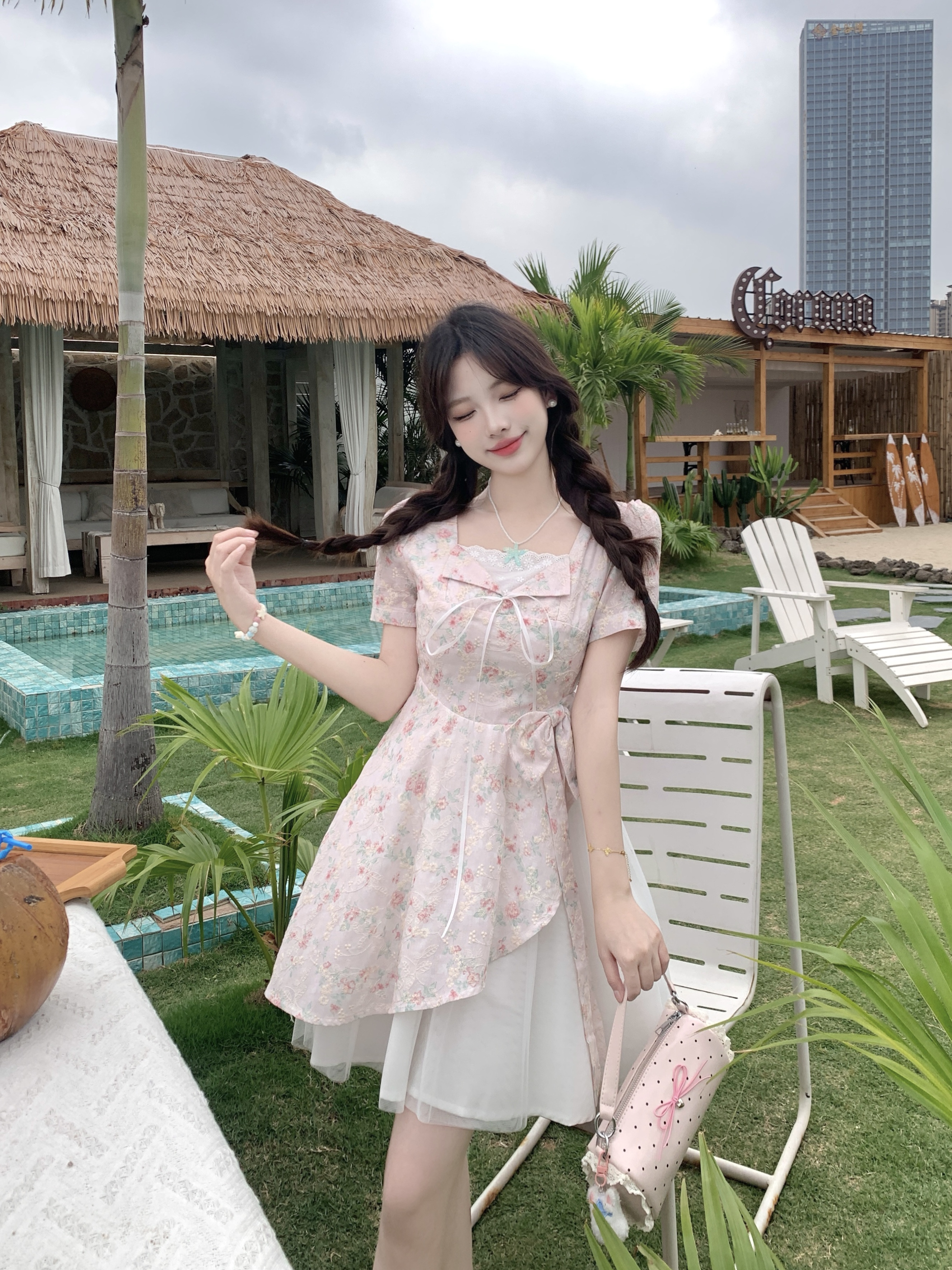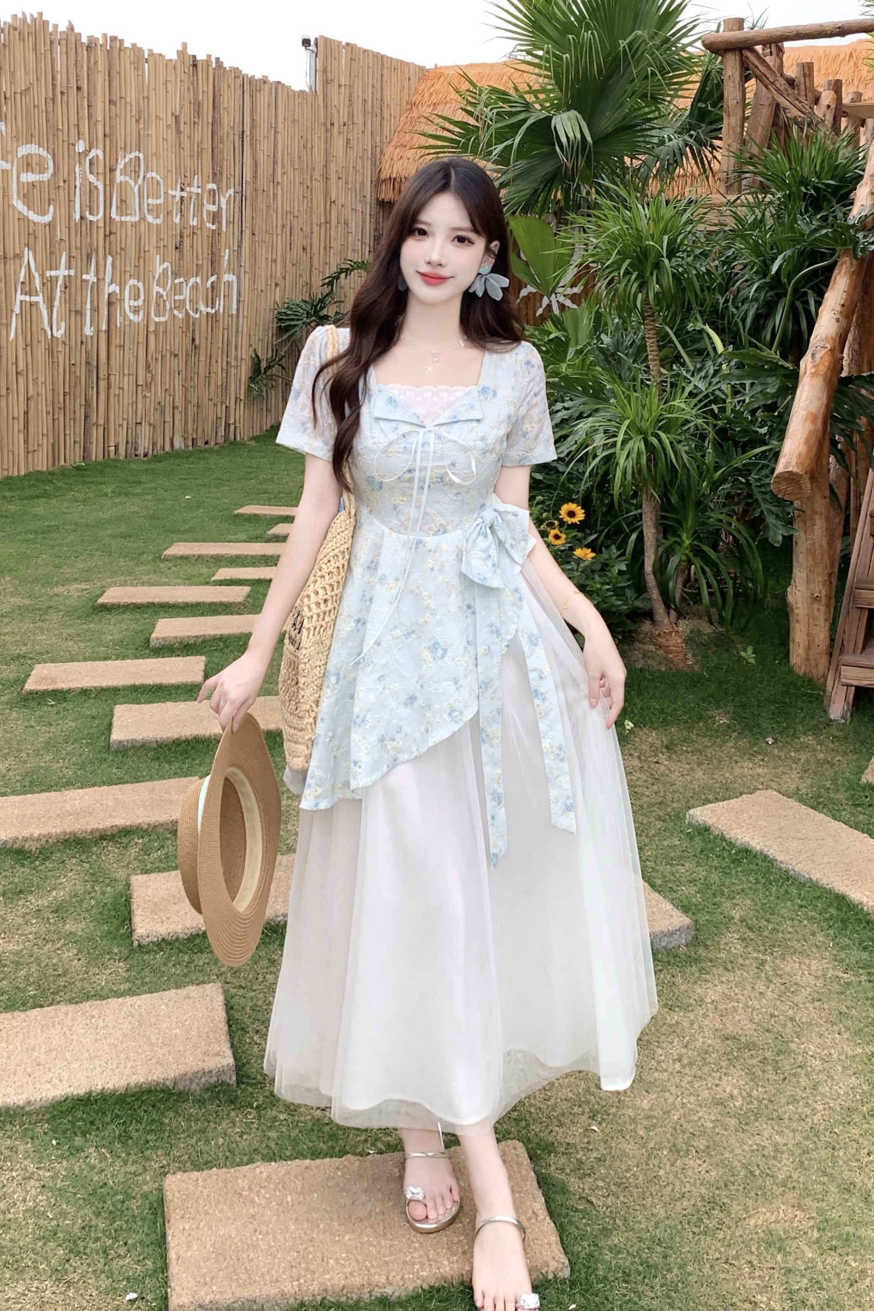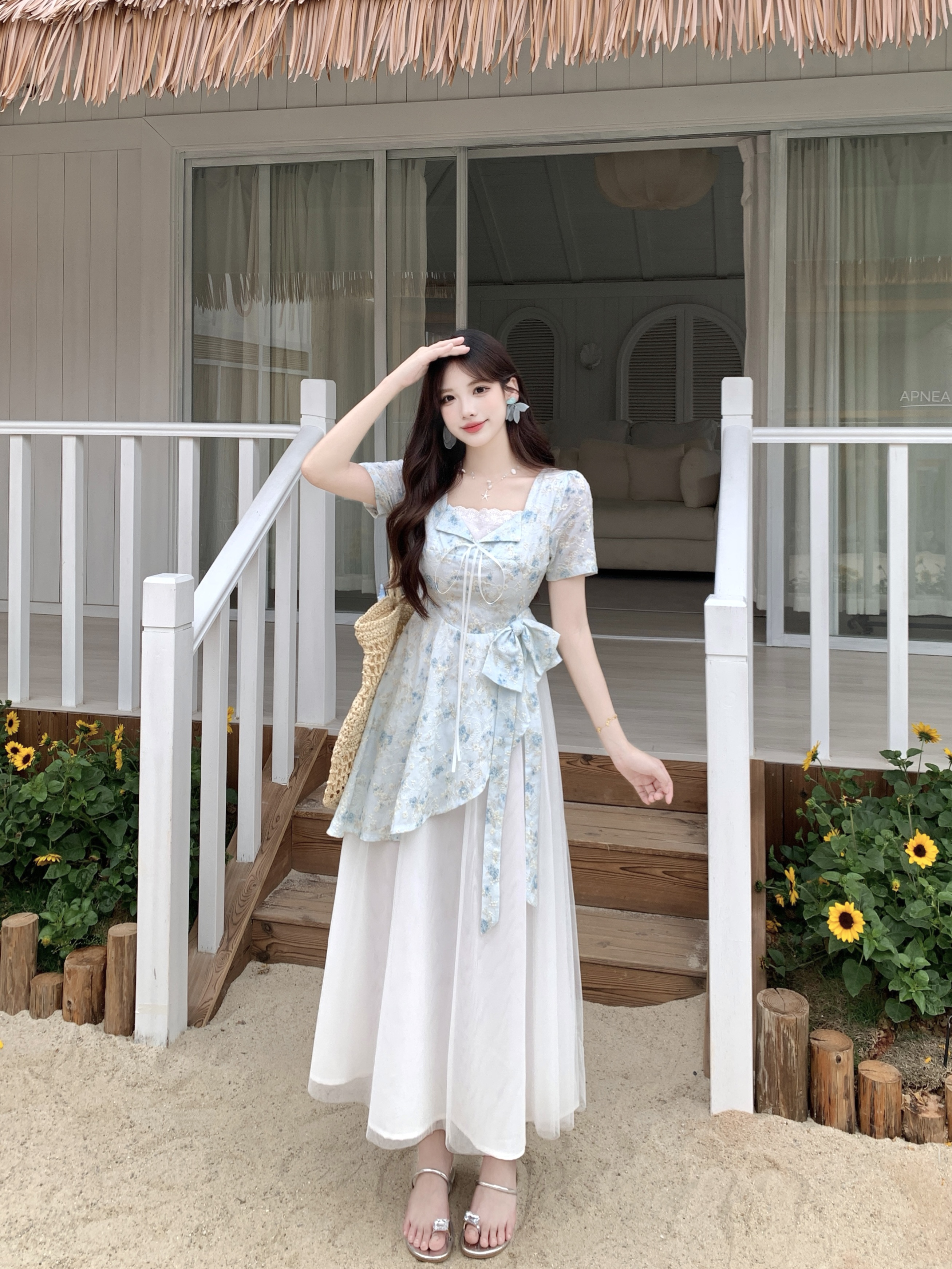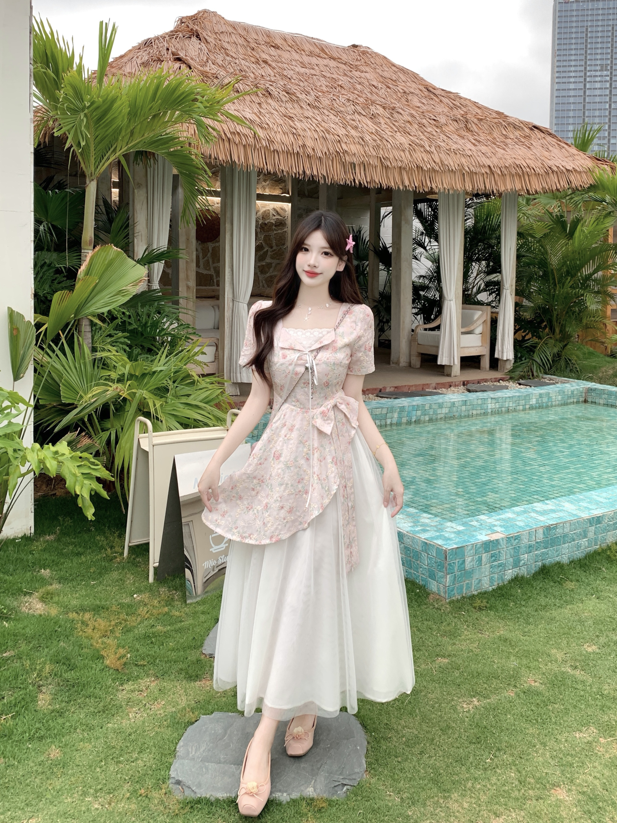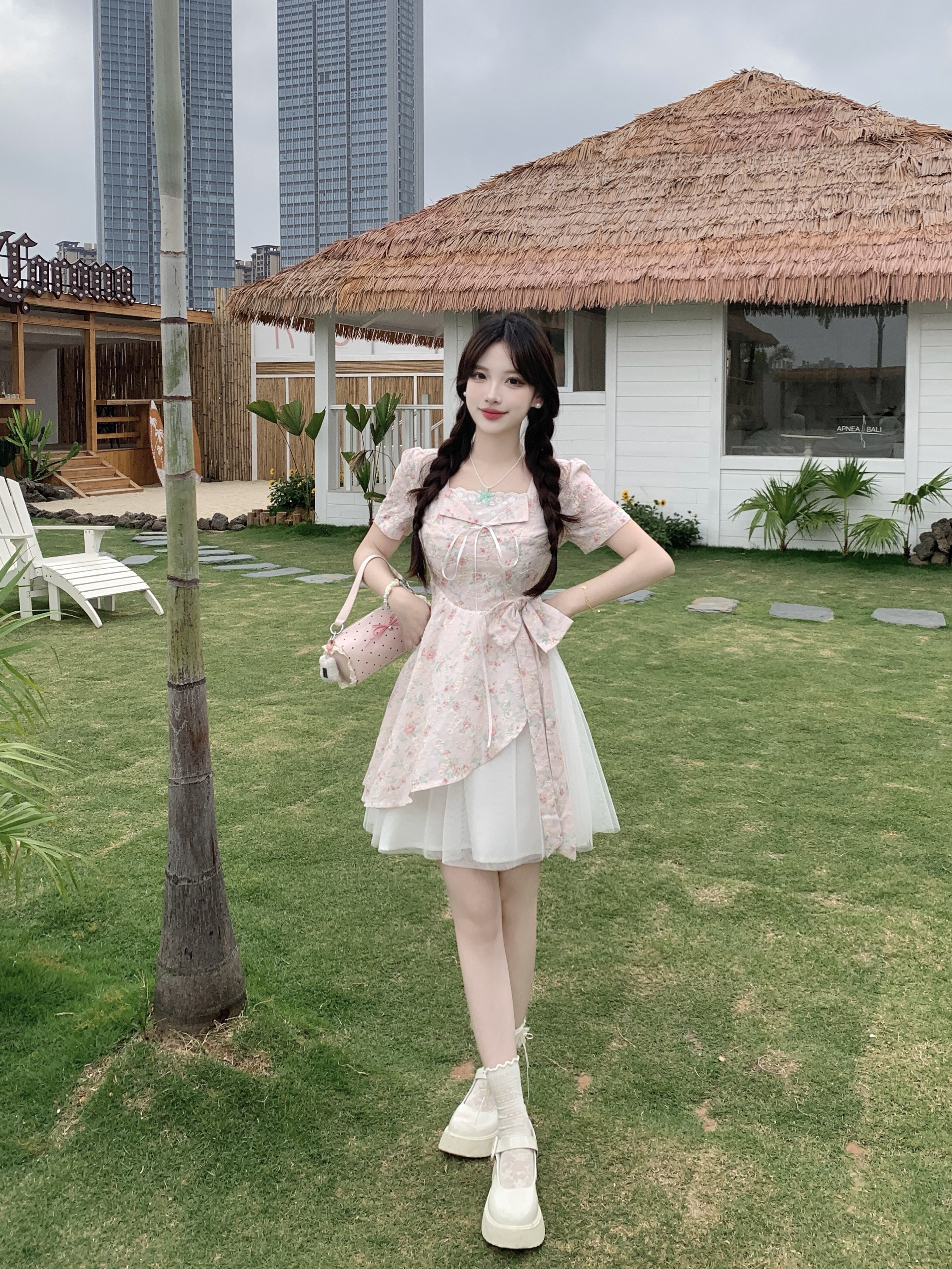 RY2285# 大码2026清甜一夏微胖mm公主风设计感拼接网纱甜美蝴蝶结连衣裙