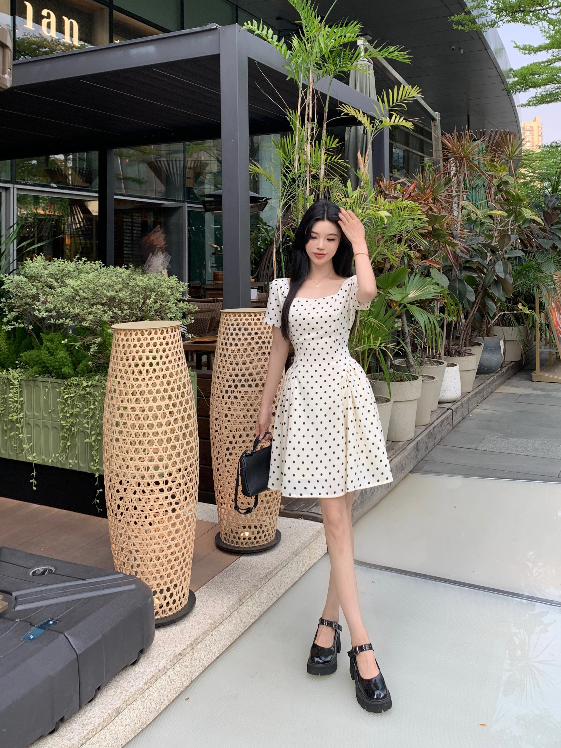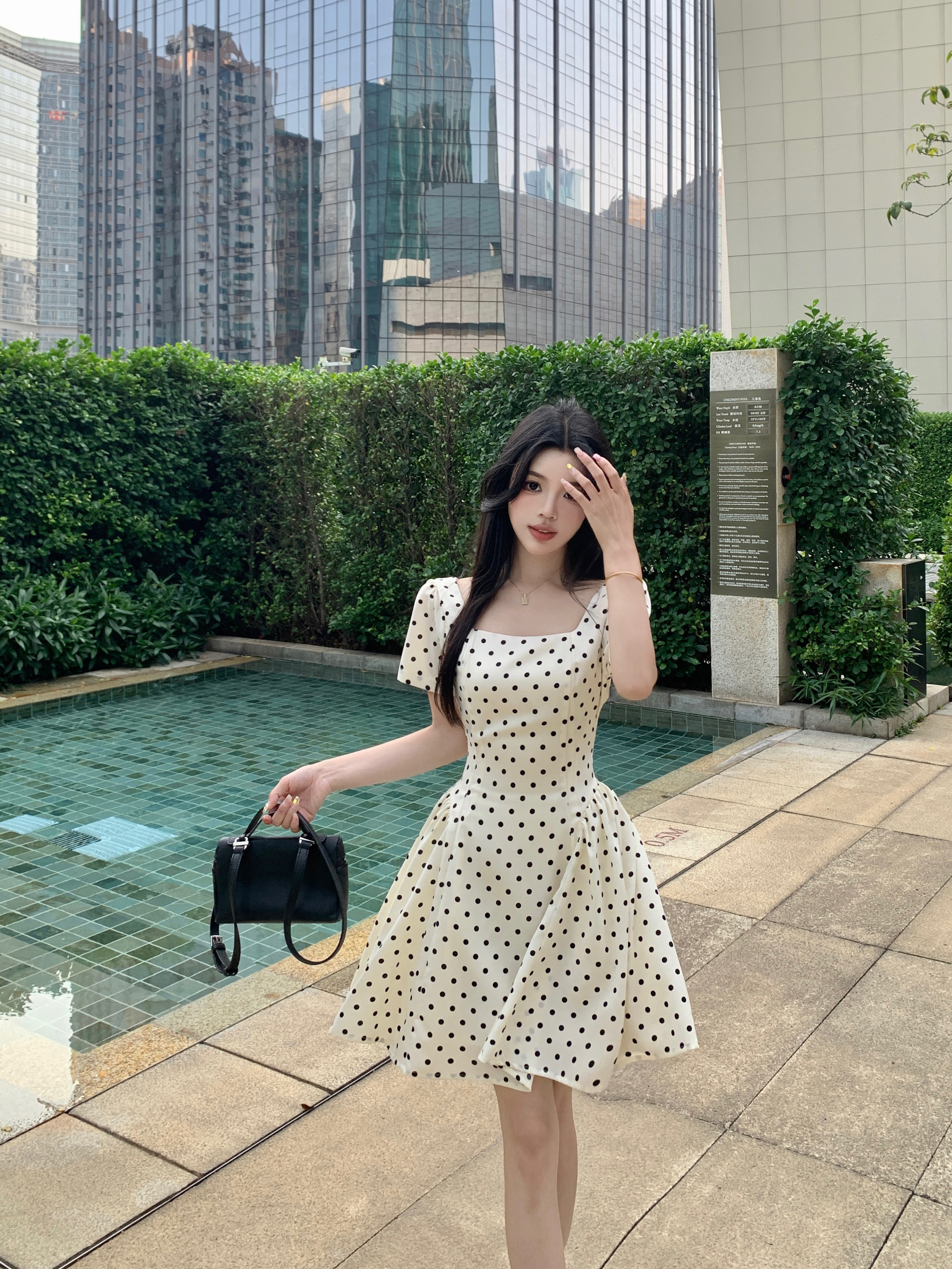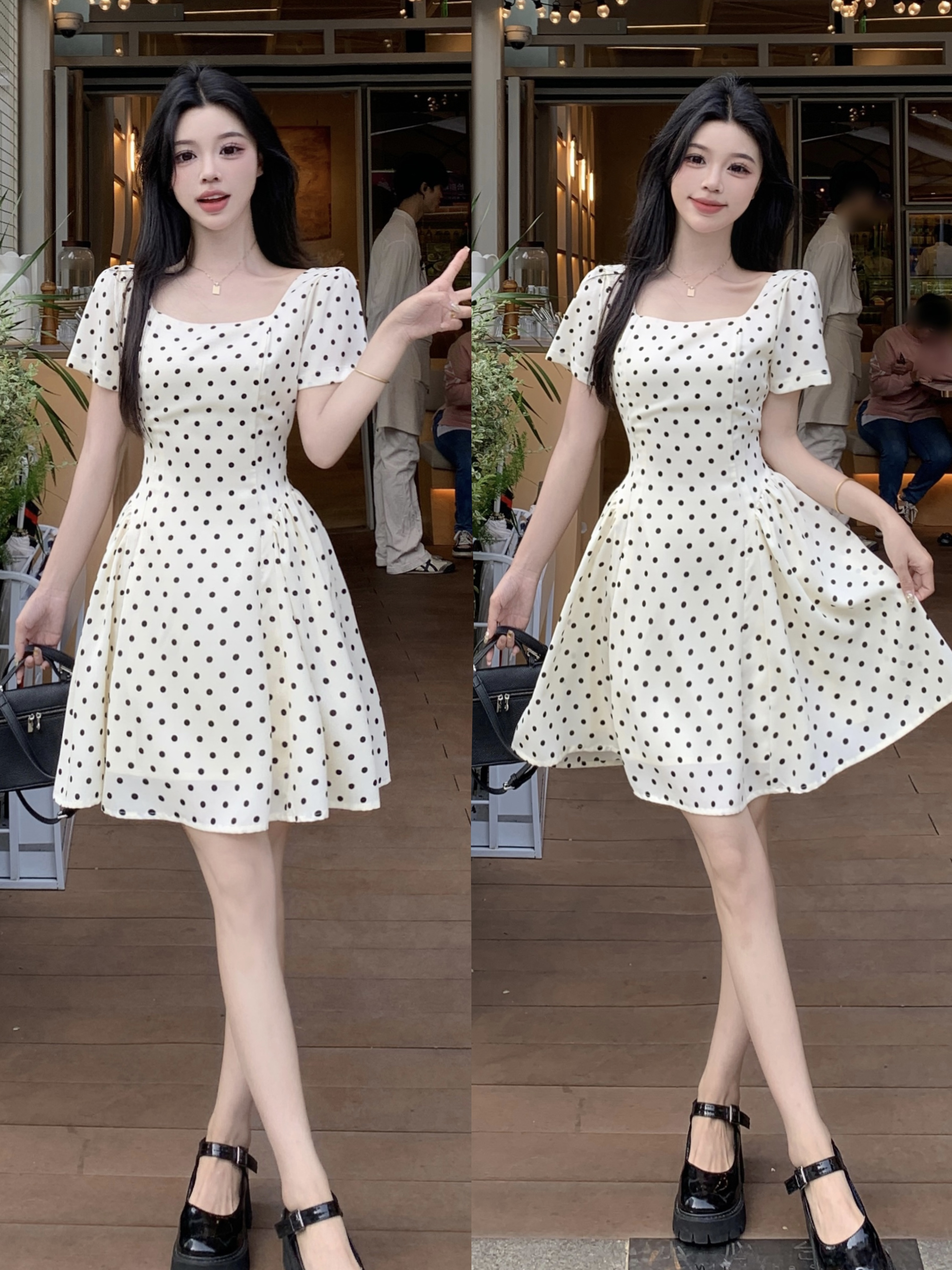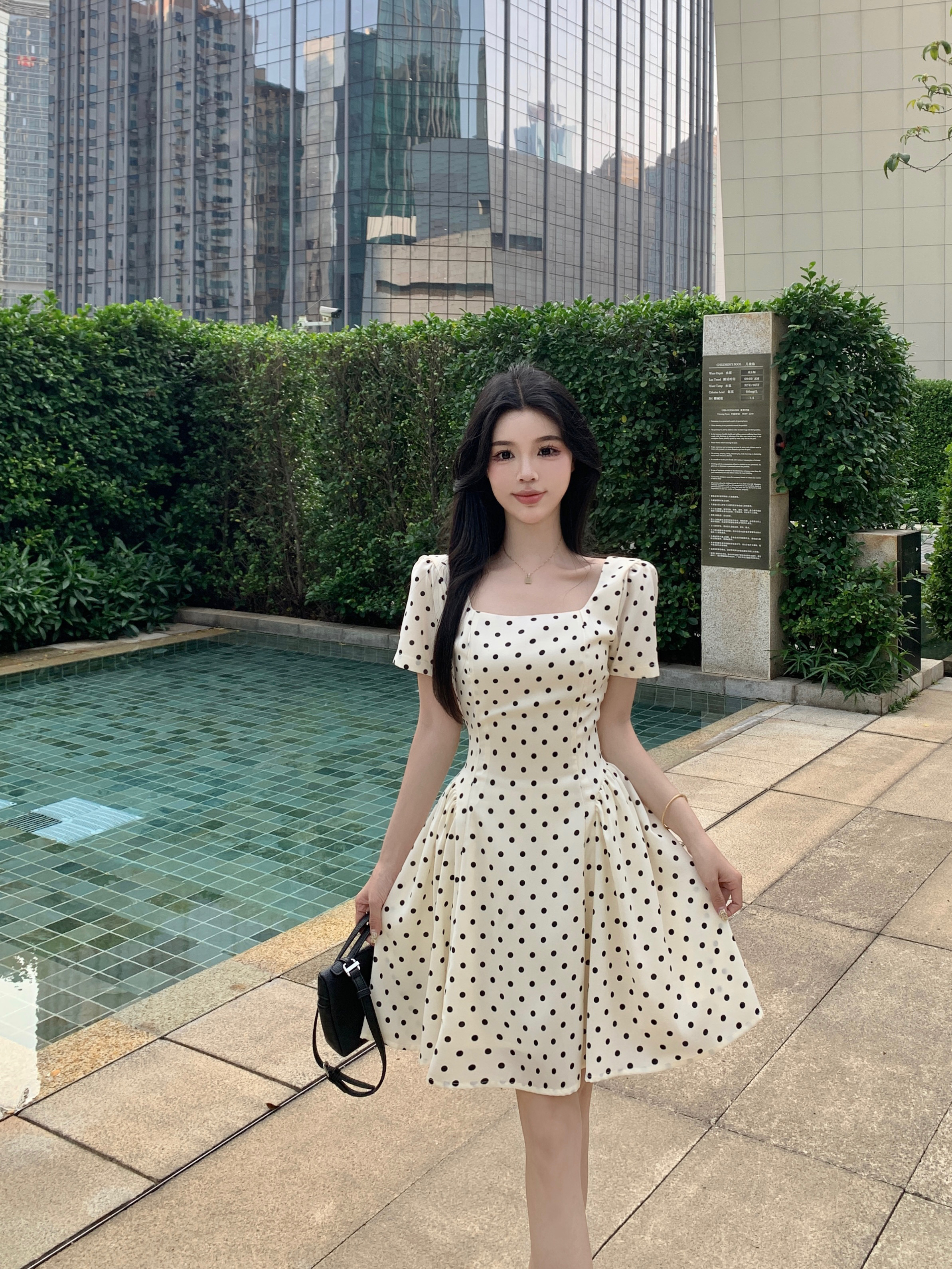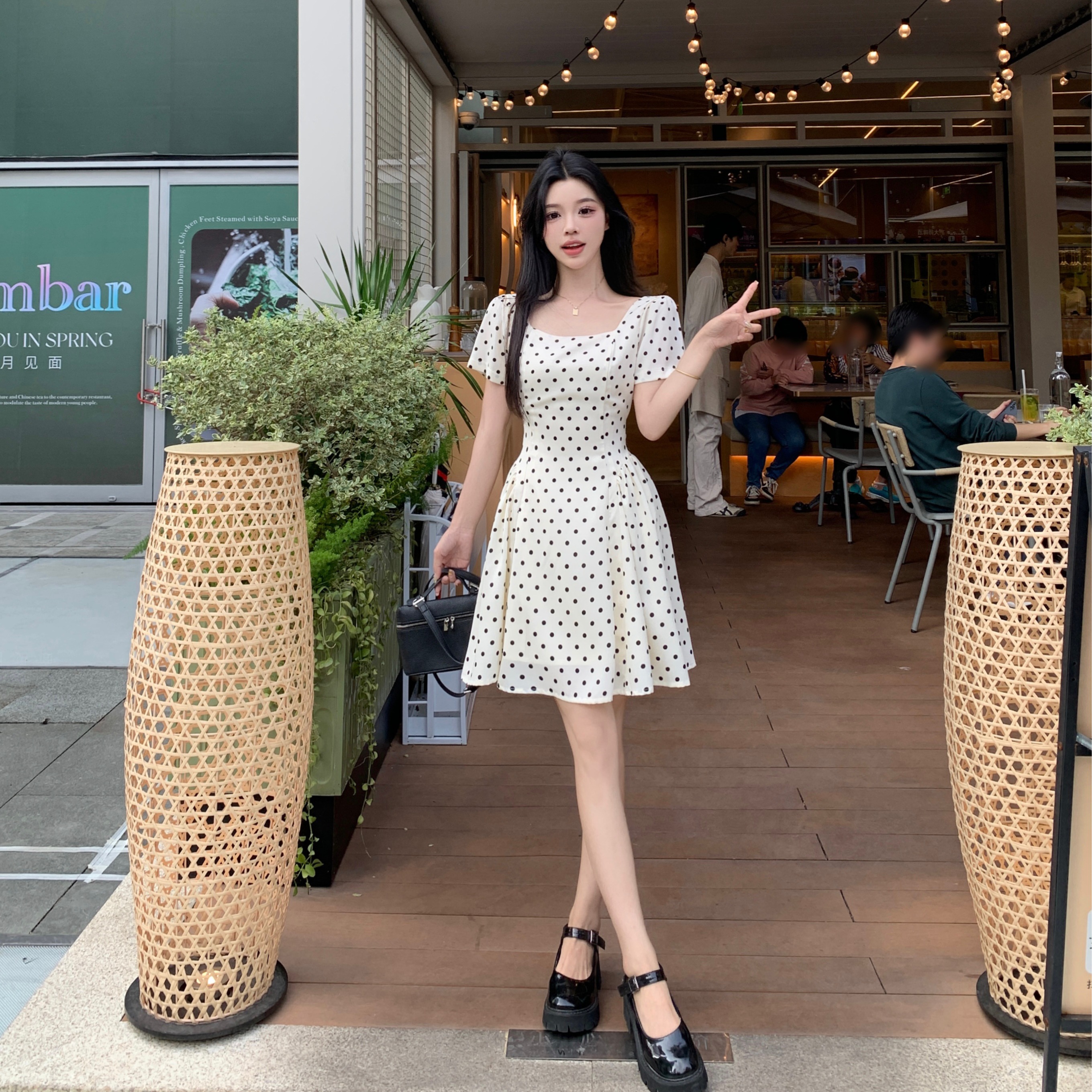 RY2289# 大码气质方领波点连衣裙美人滤镜2026年新款夏季收腰显瘦a字裙女