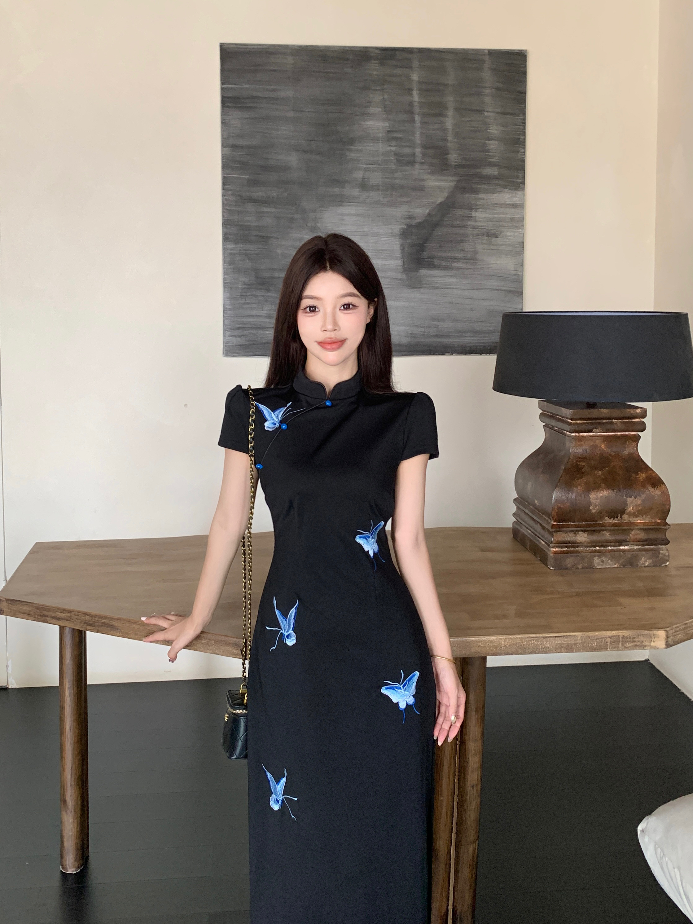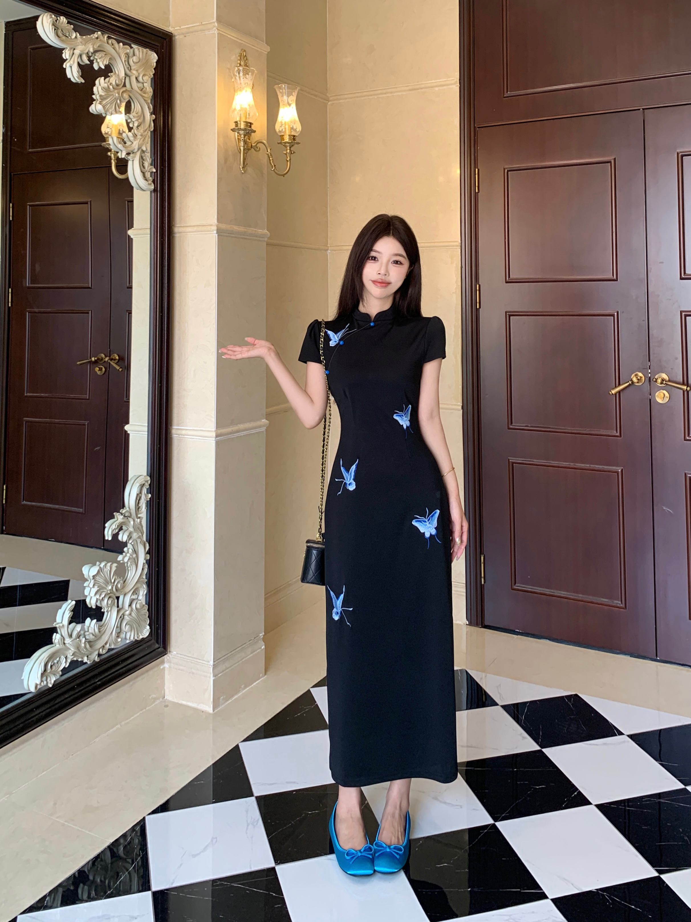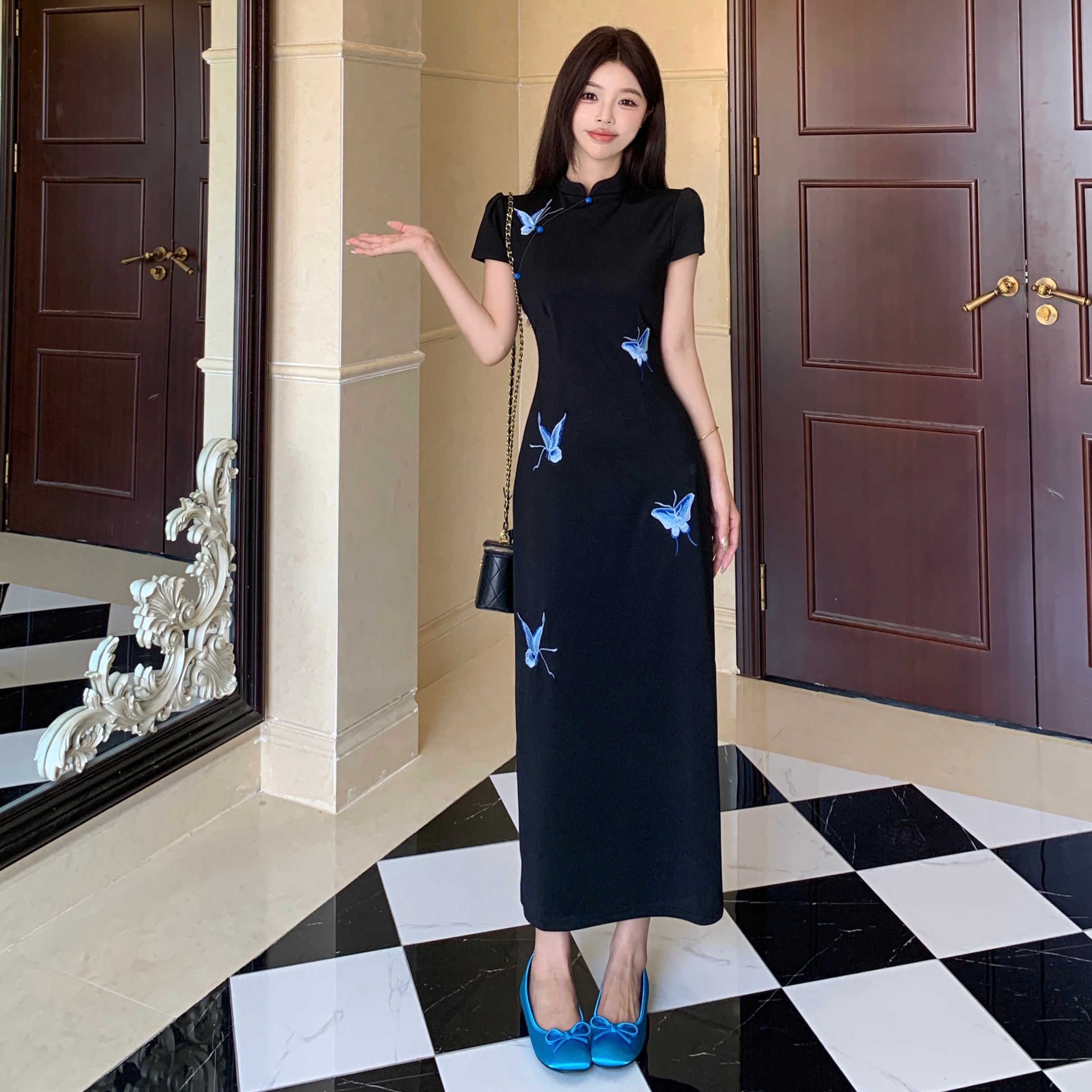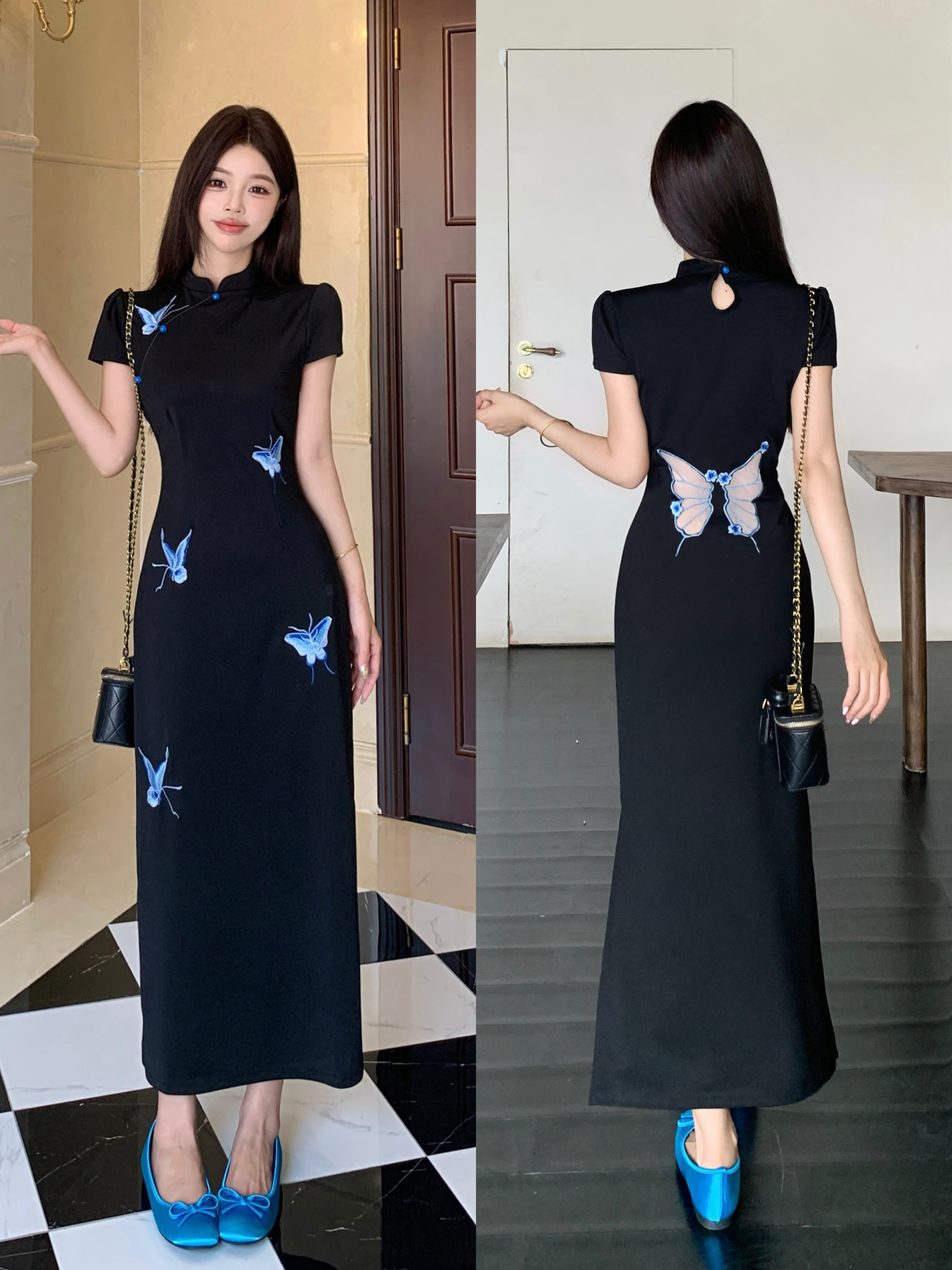 RY2291# 大码露背蝴蝶新中式连衣裙女夏季改良刺绣旗袍年轻款显瘦长裙女
