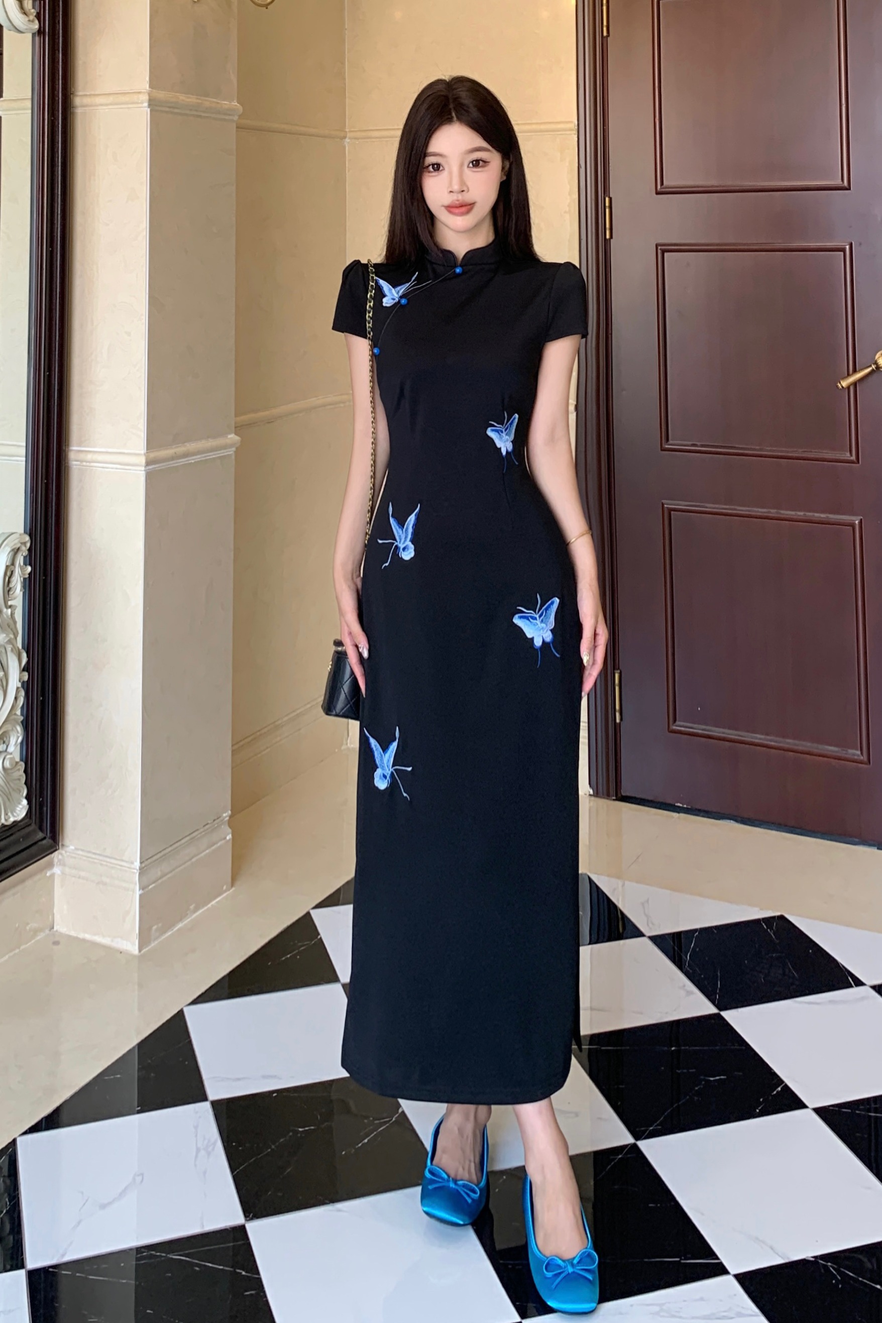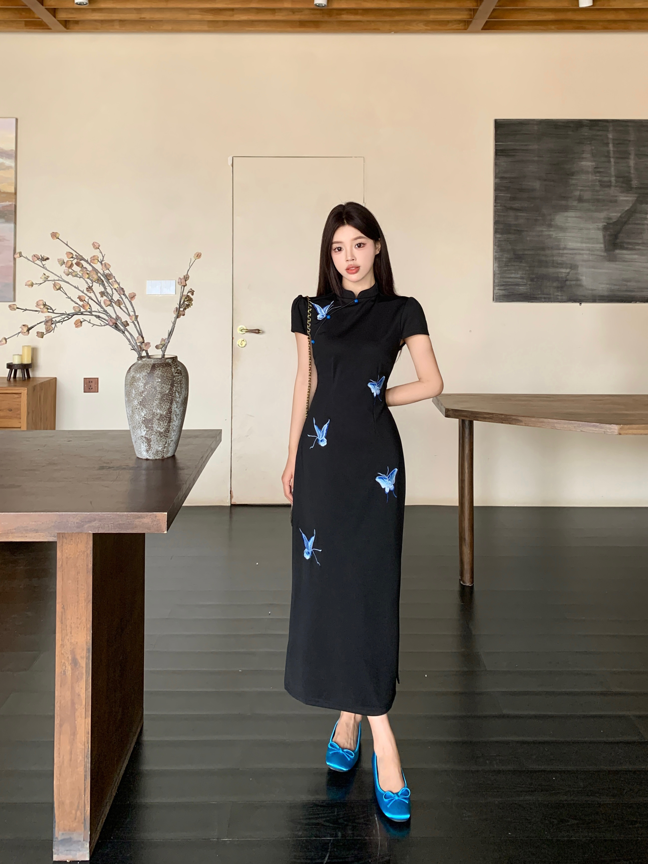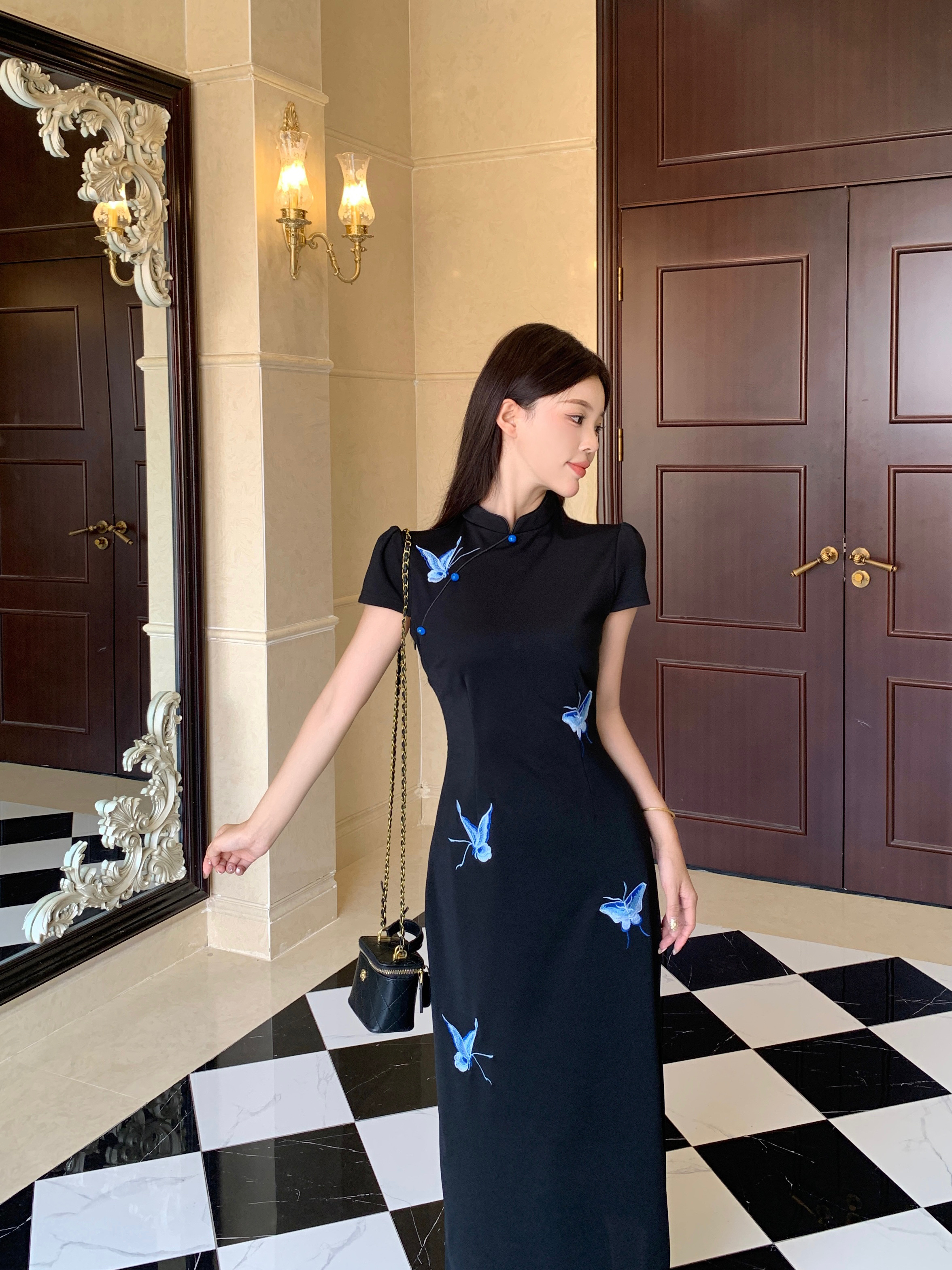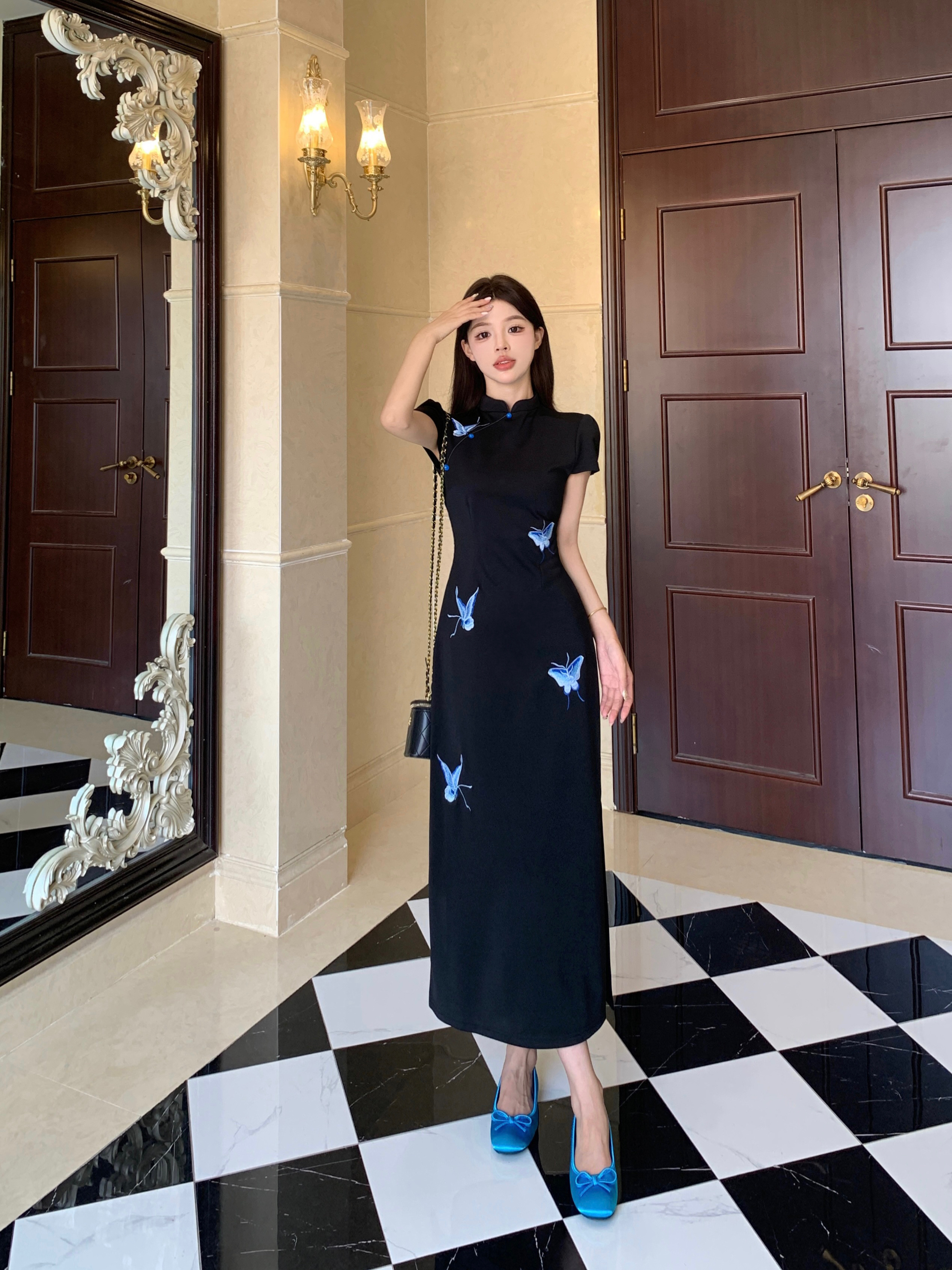 RY2291# 大码露背蝴蝶新中式连衣裙女夏季改良刺绣旗袍年轻款显瘦长裙女
