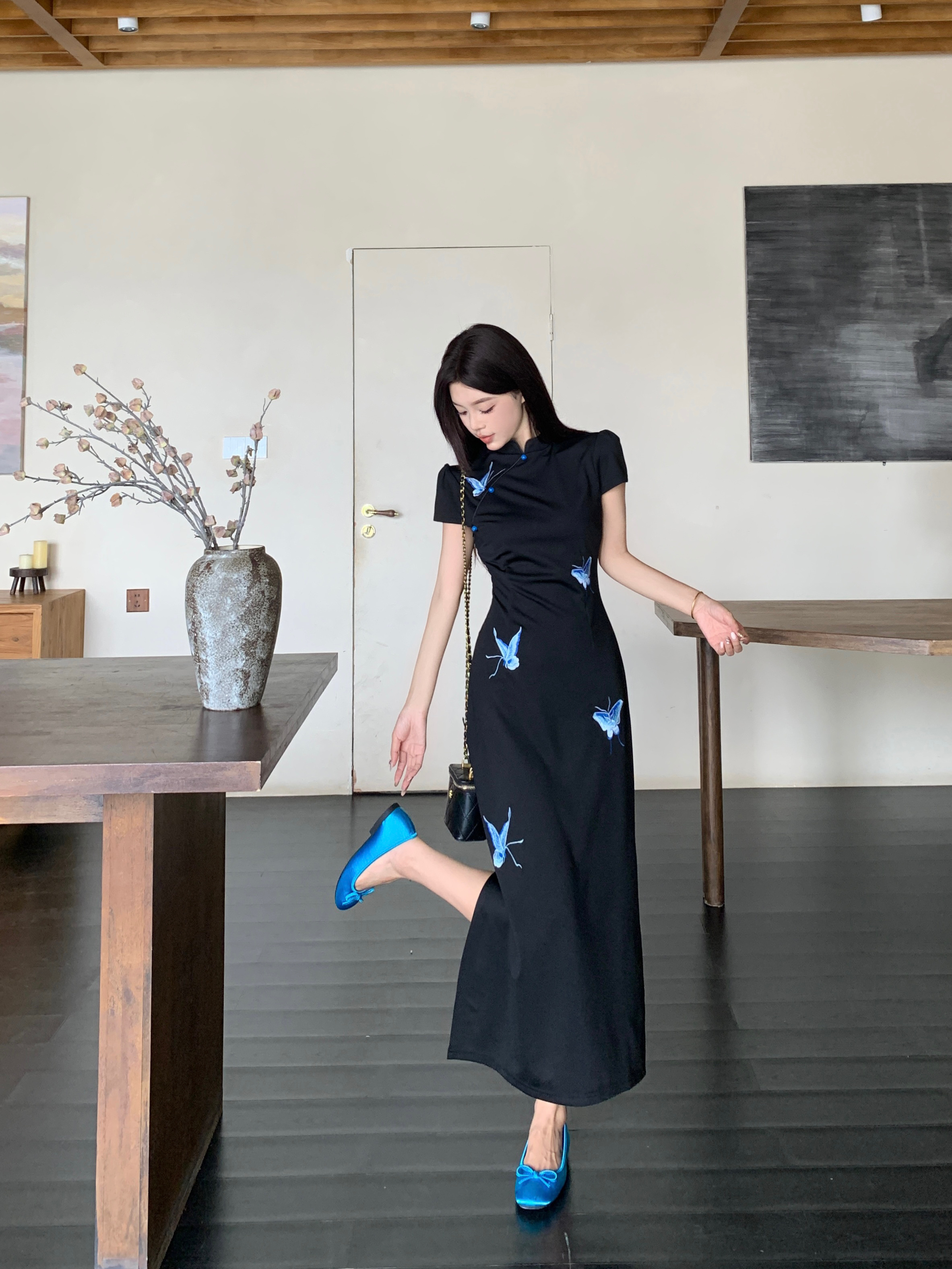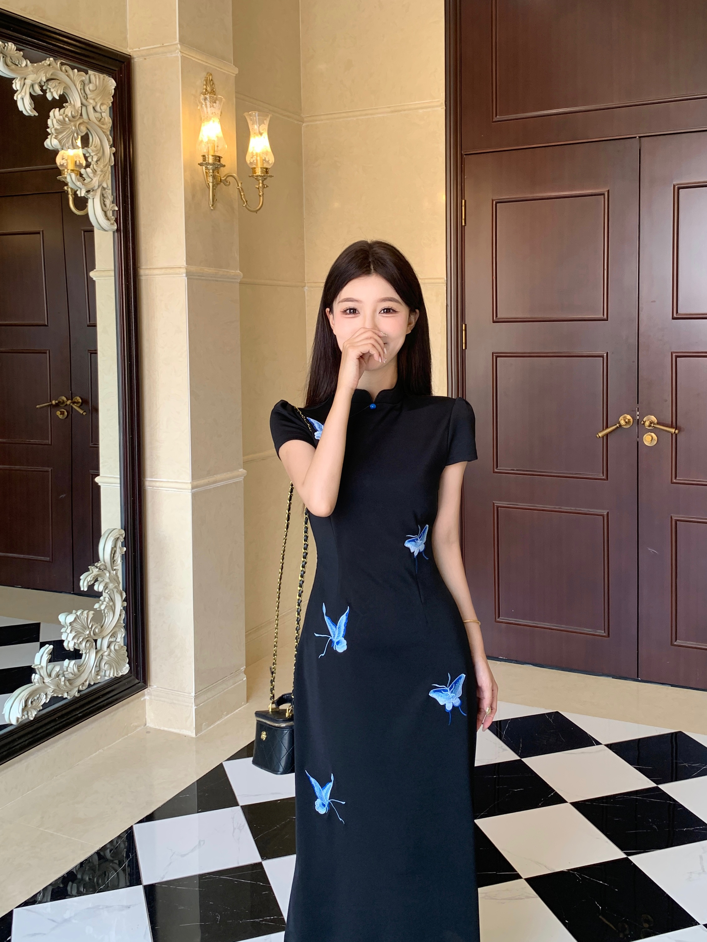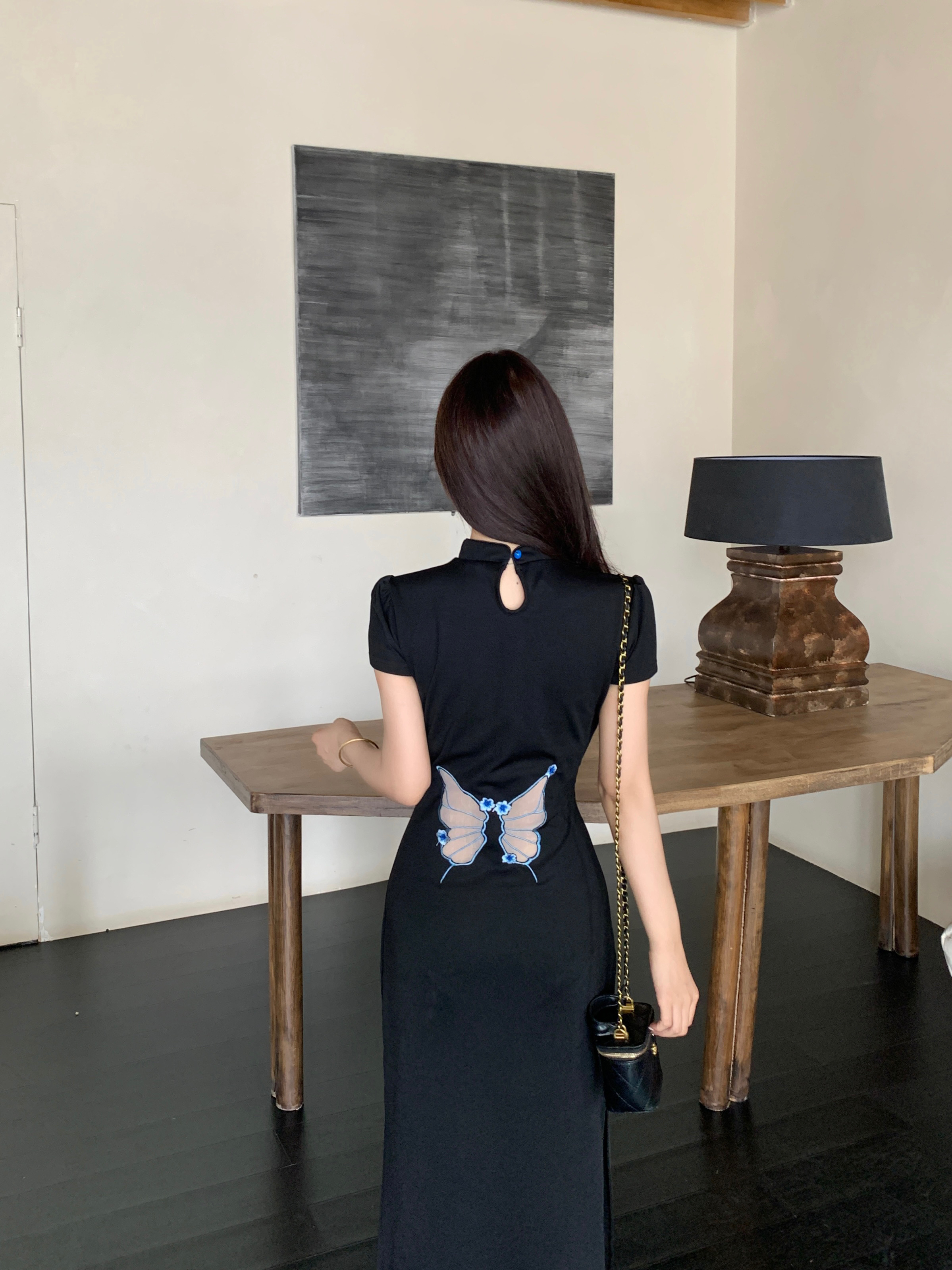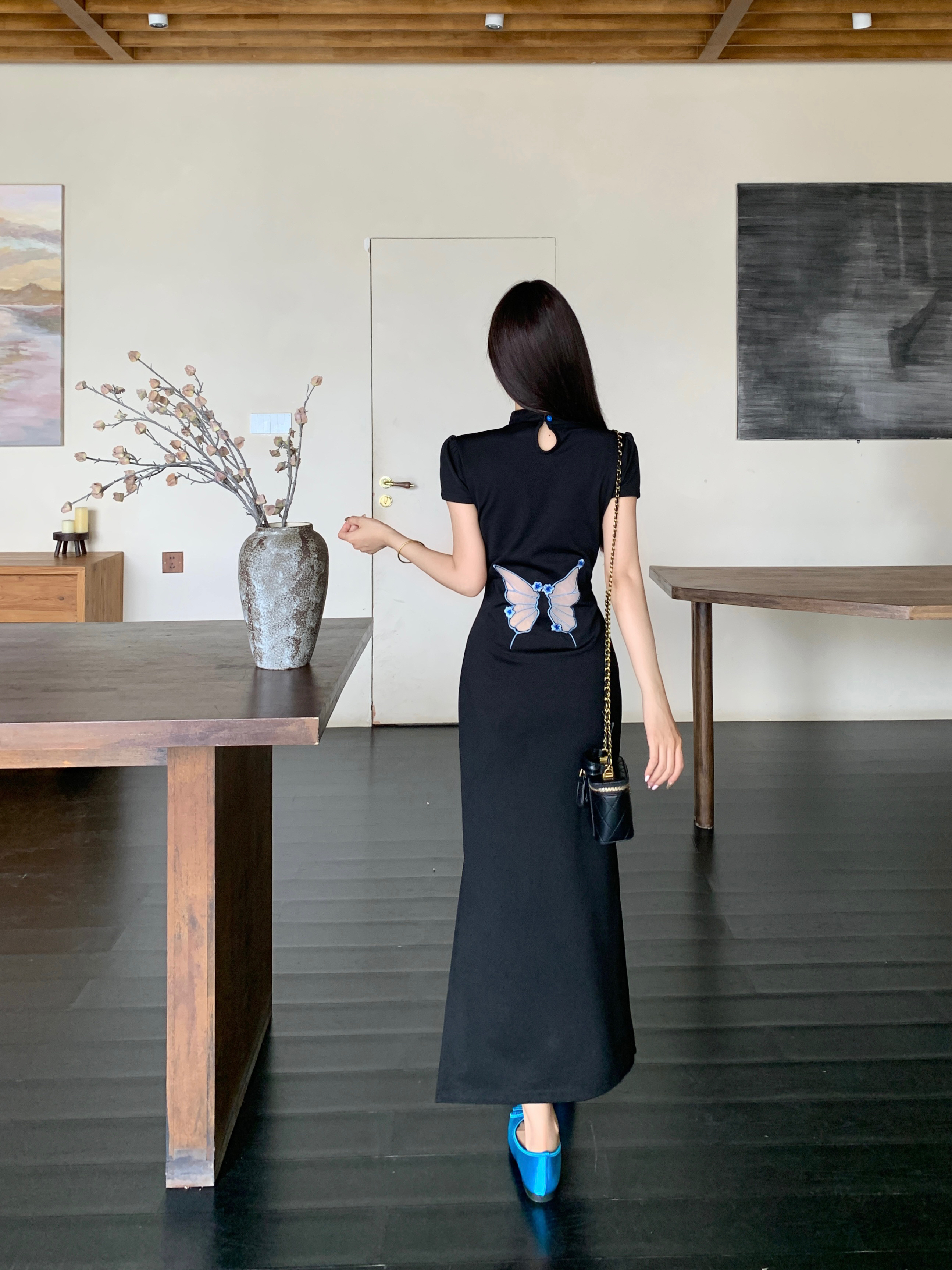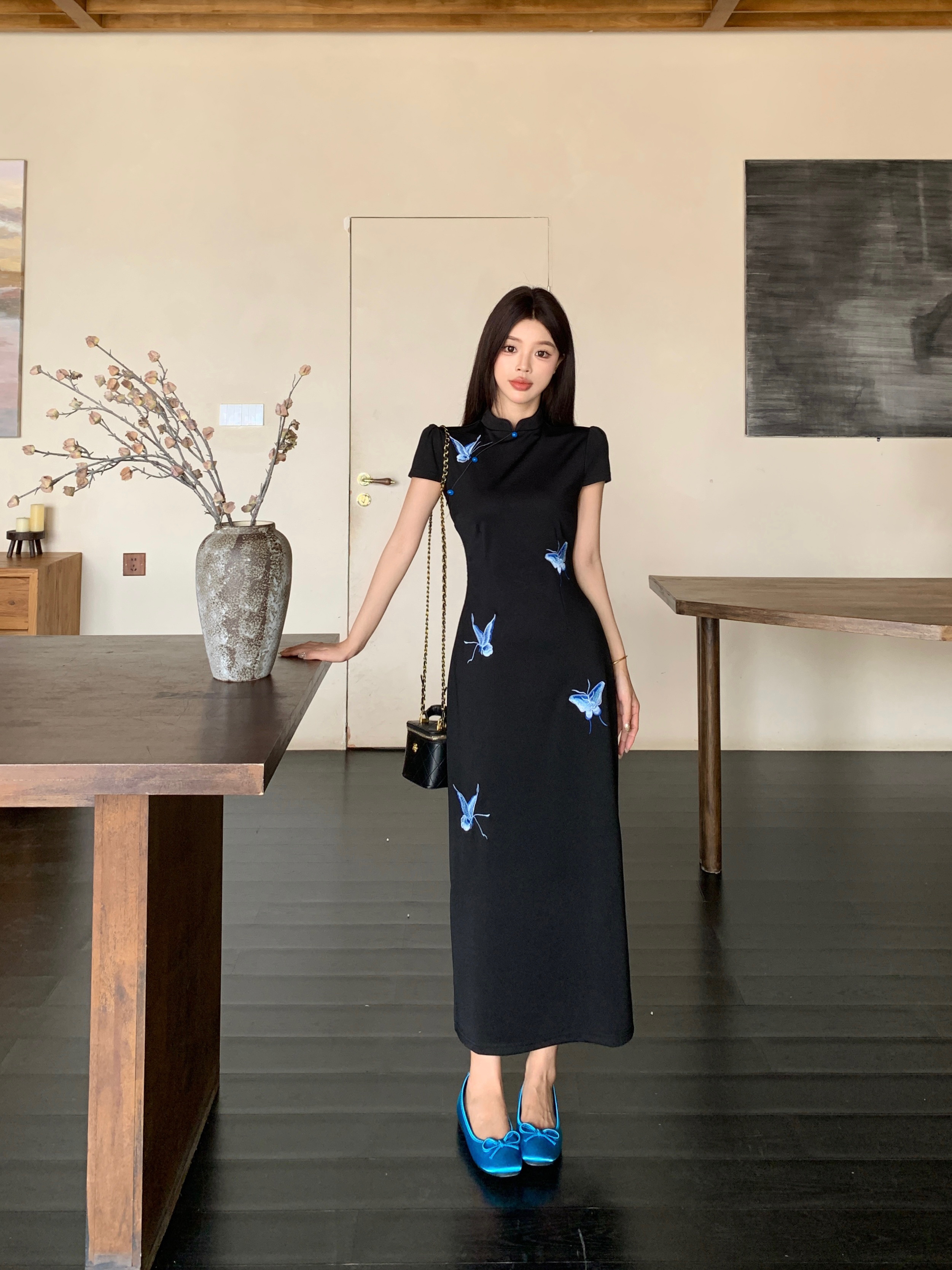 RY2291# 大码露背蝴蝶新中式连衣裙女夏季改良刺绣旗袍年轻款显瘦长裙女