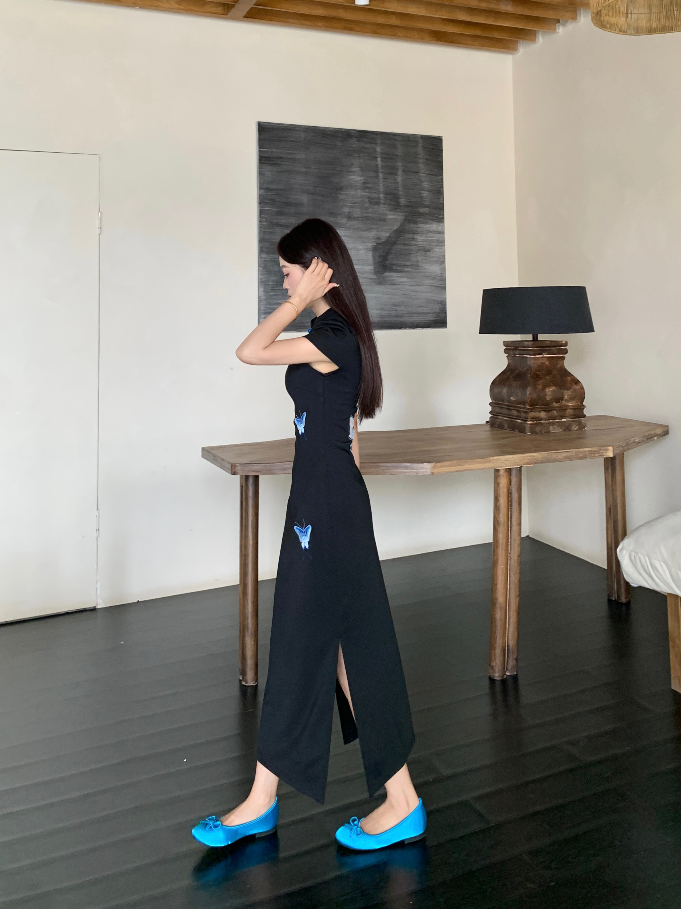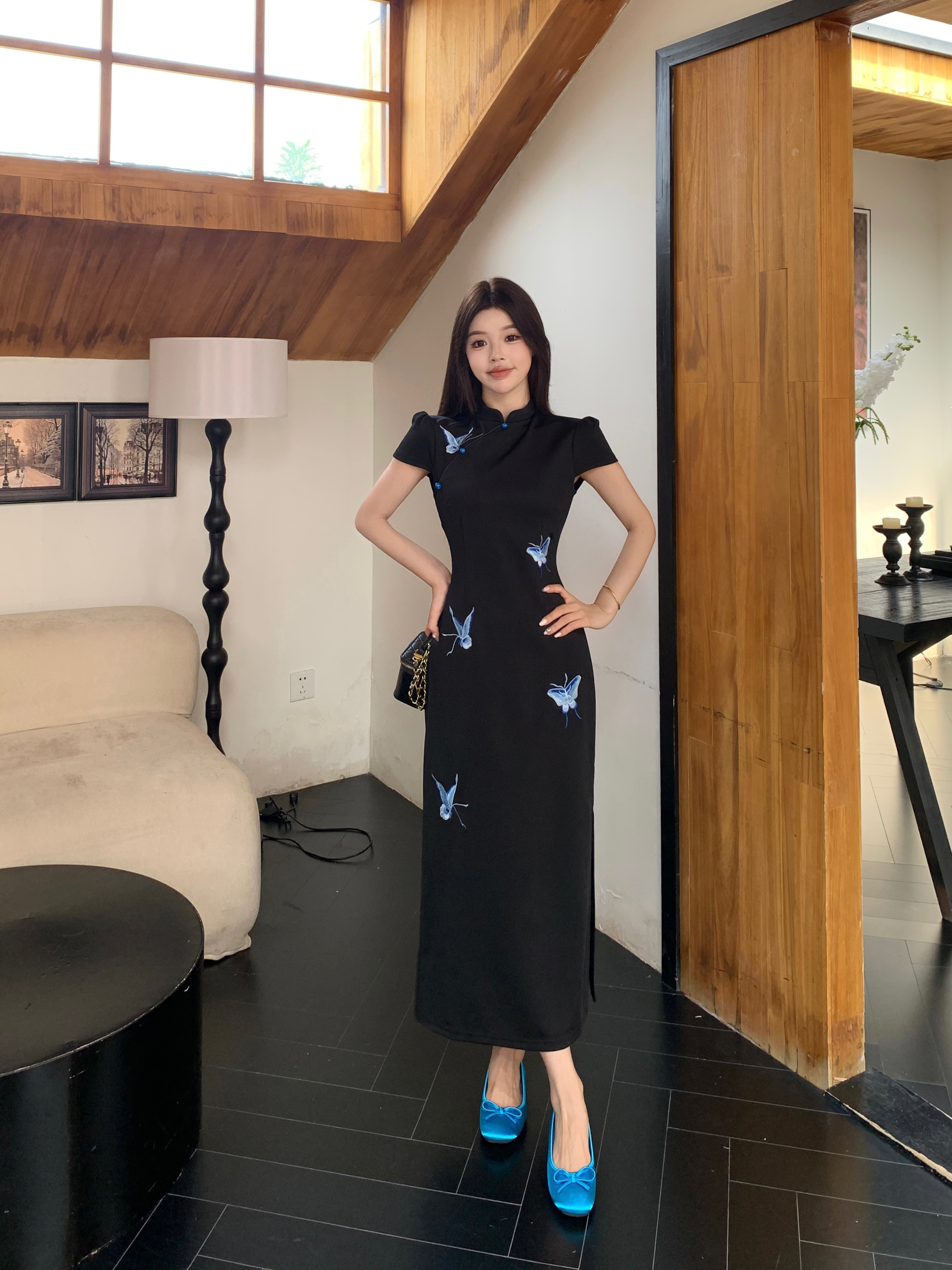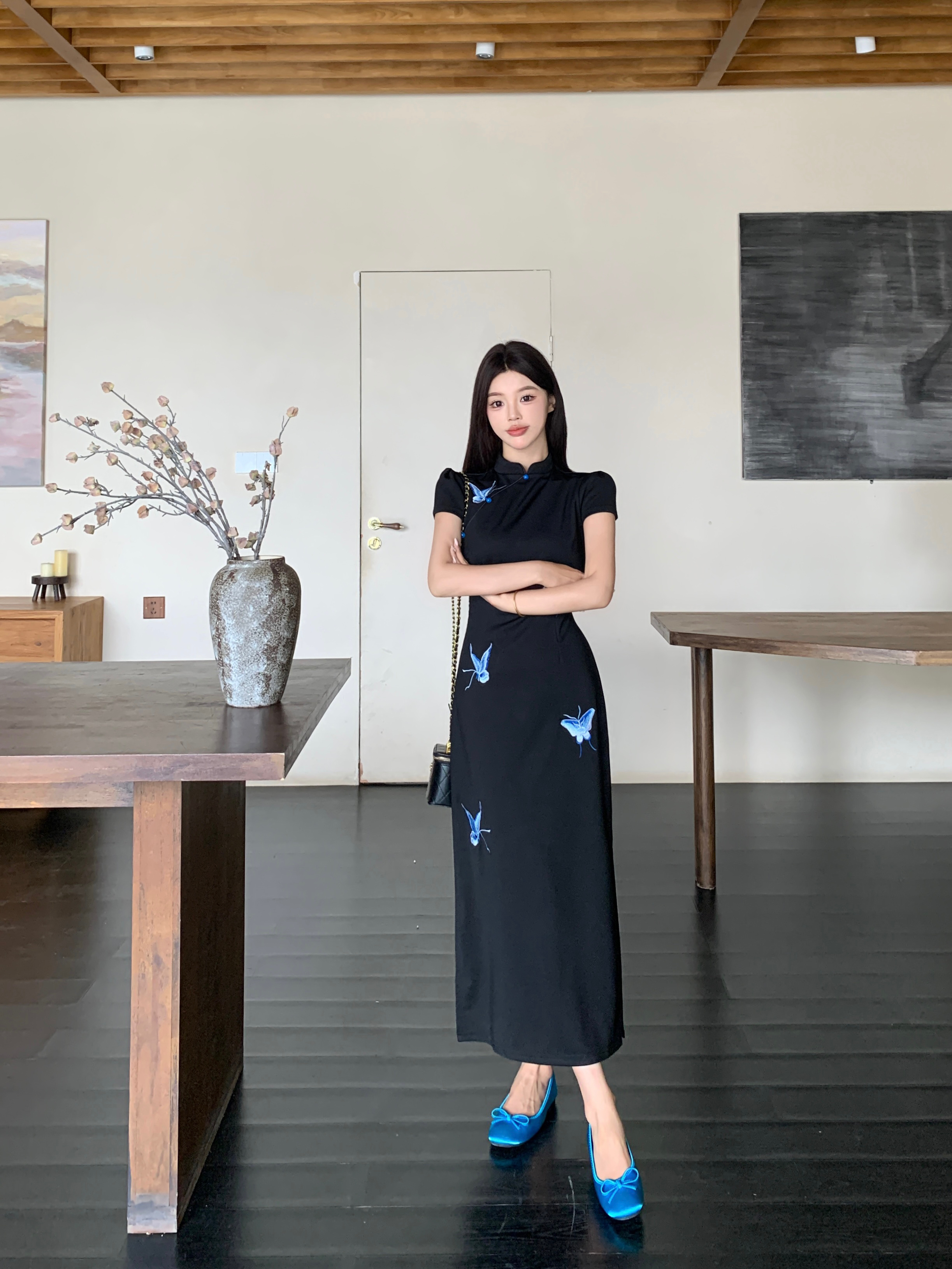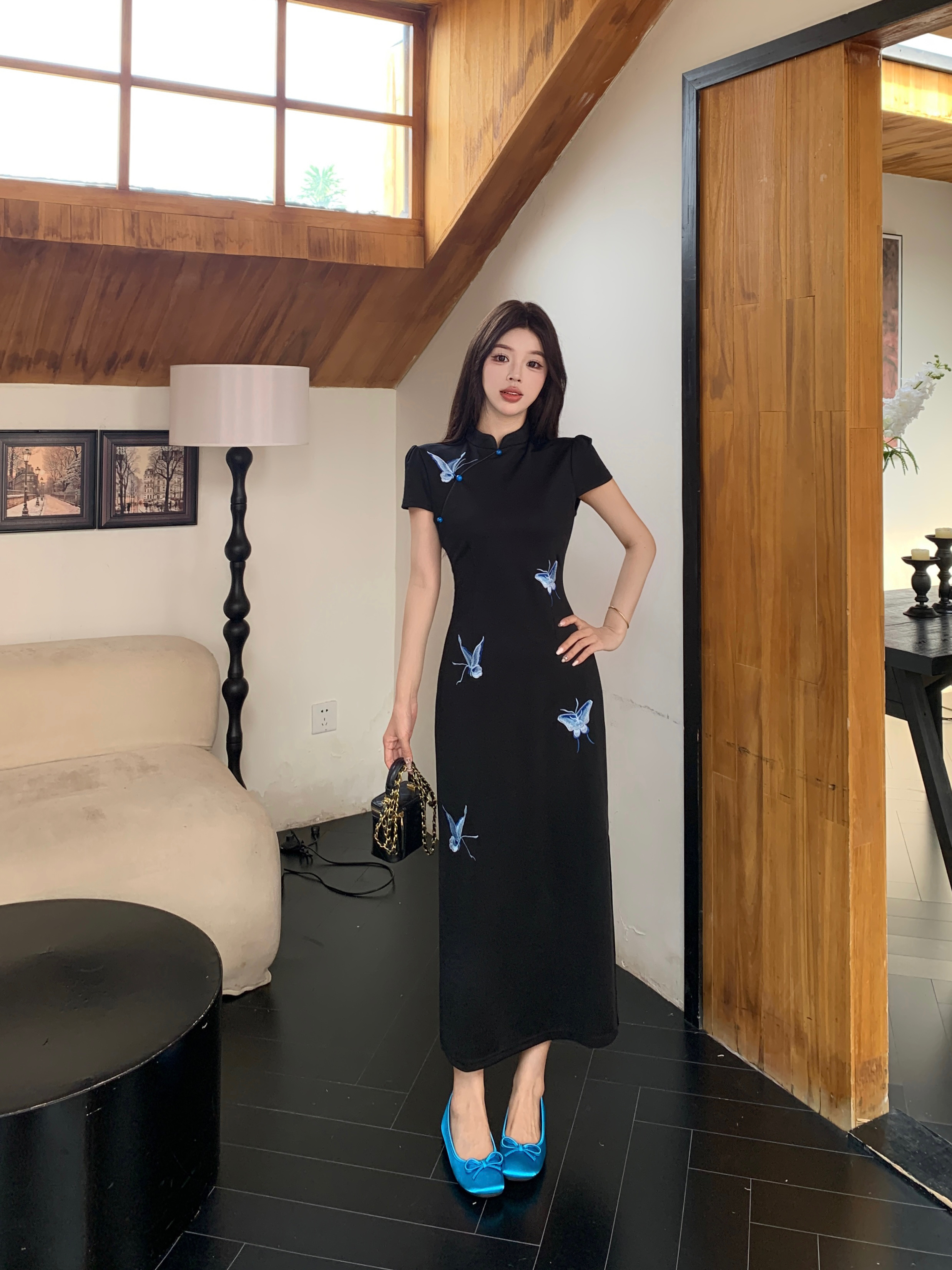RY2291# 大码露背蝴蝶新中式连衣裙女夏季改良刺绣旗袍年轻款显瘦长裙女