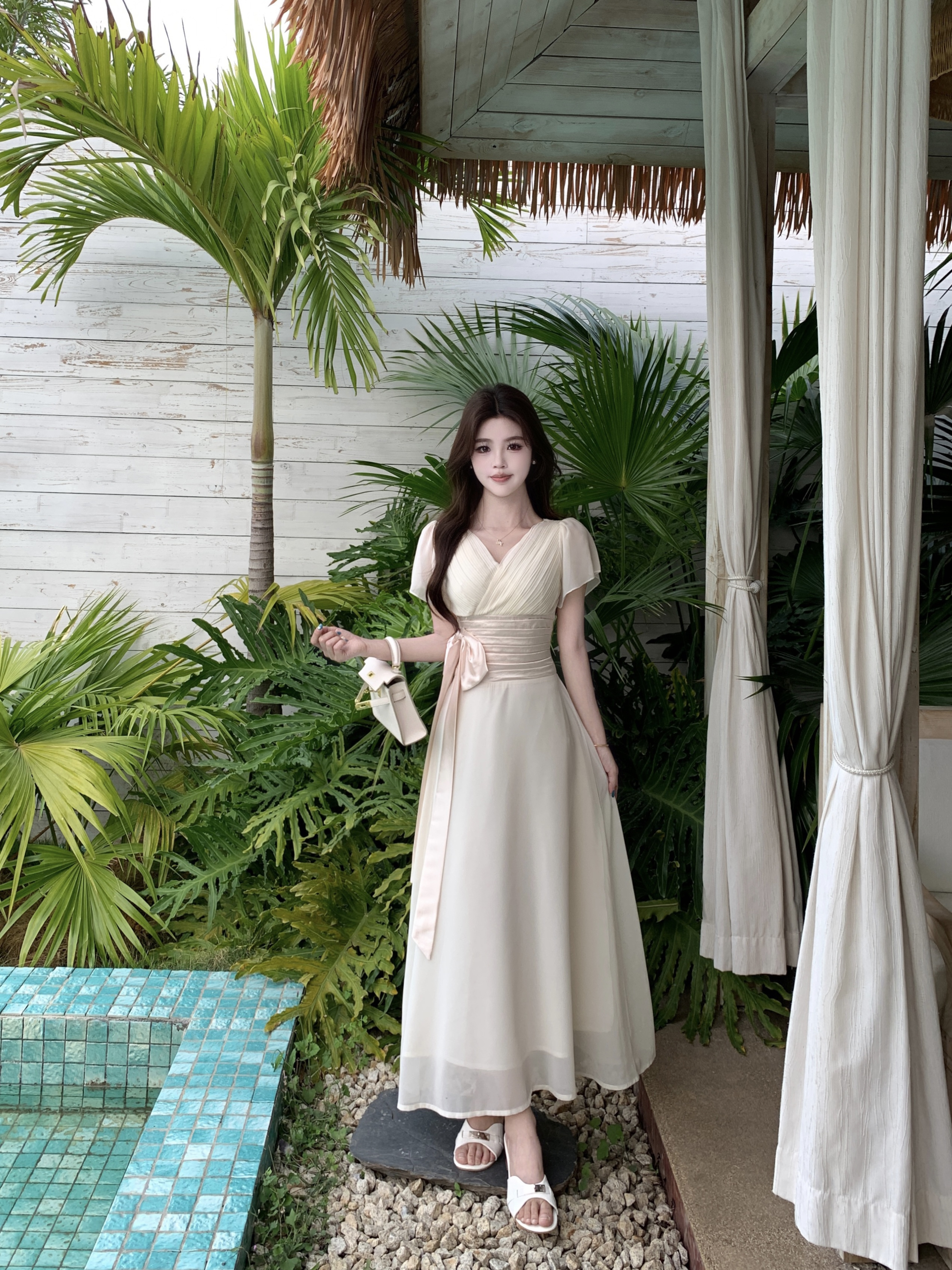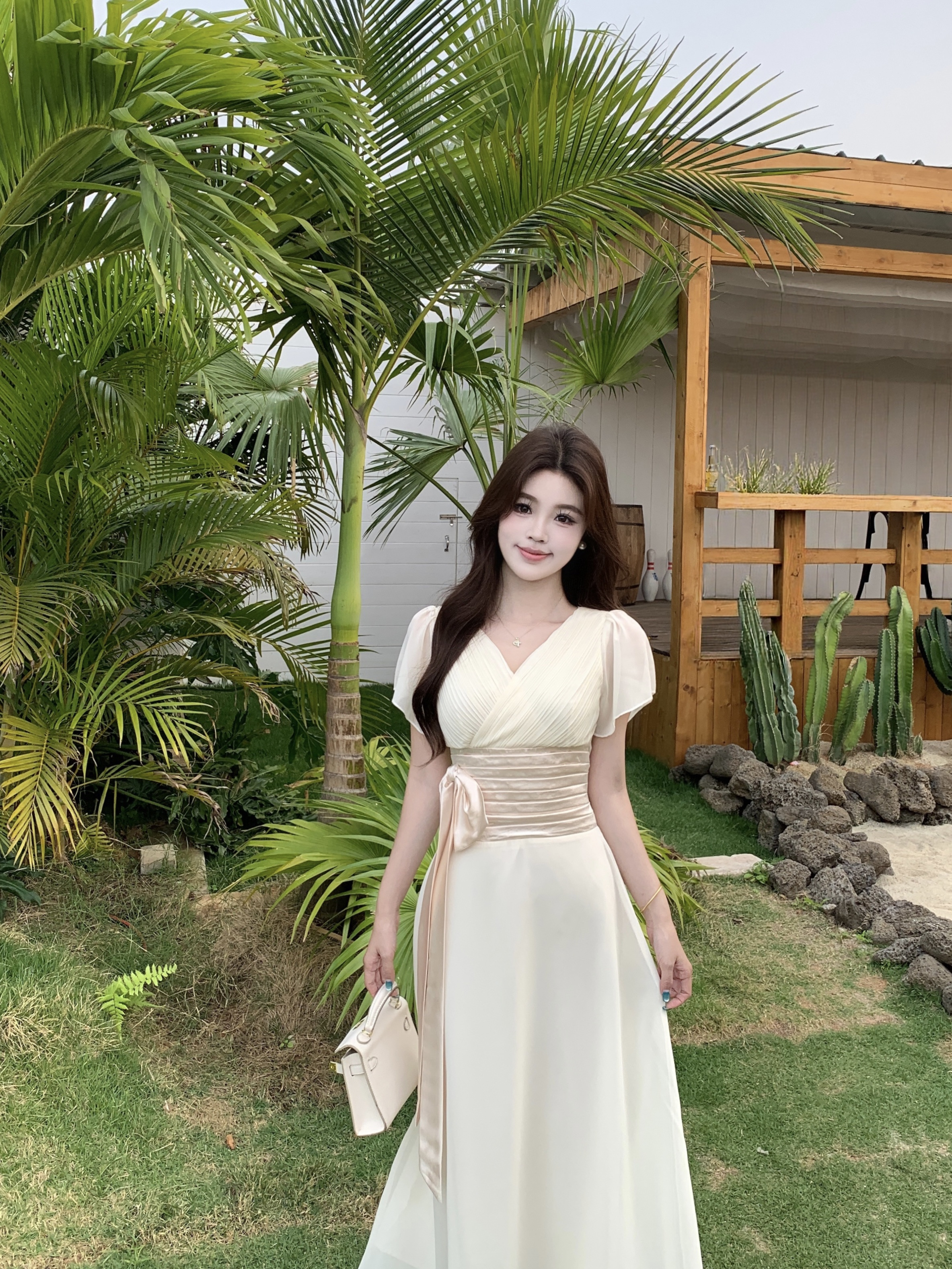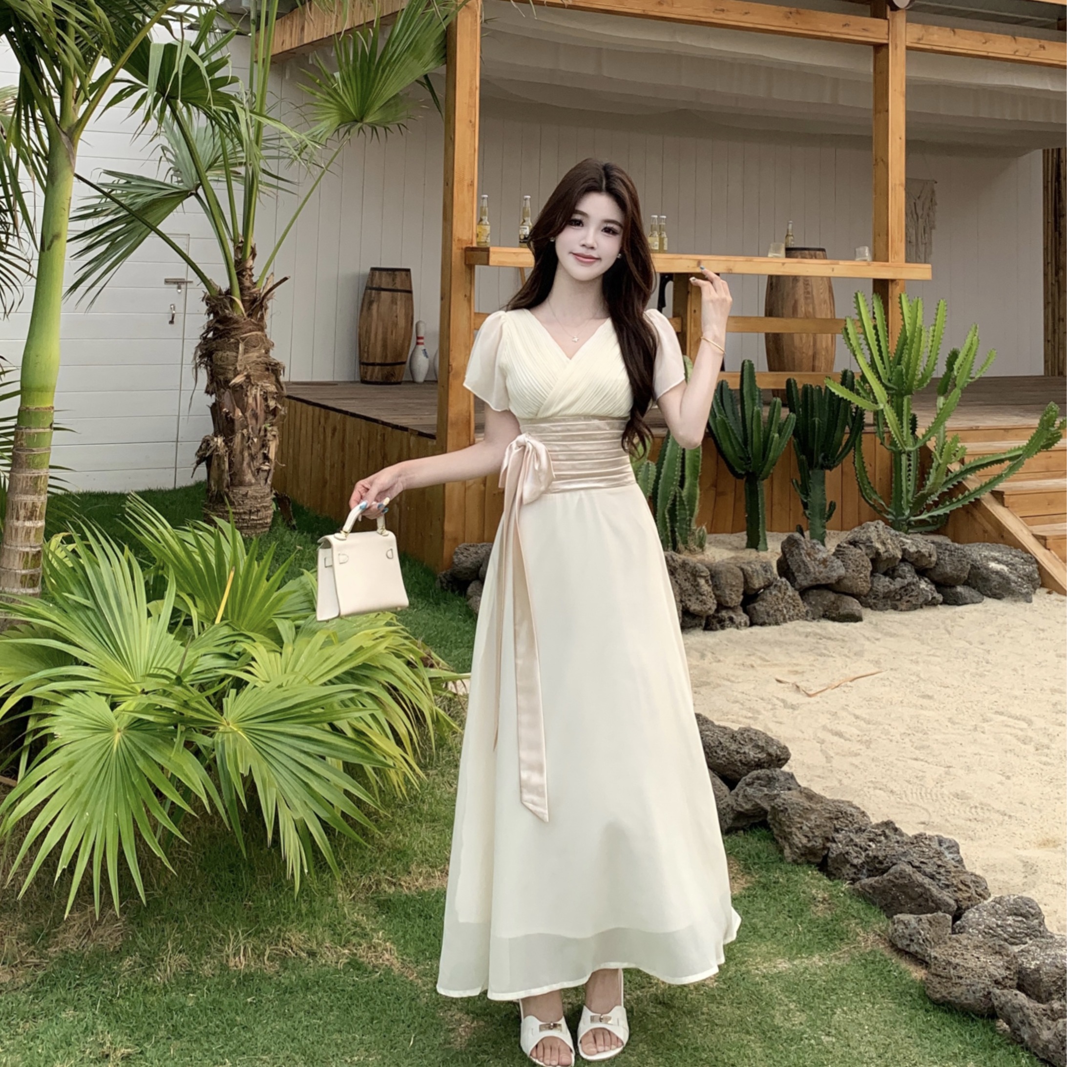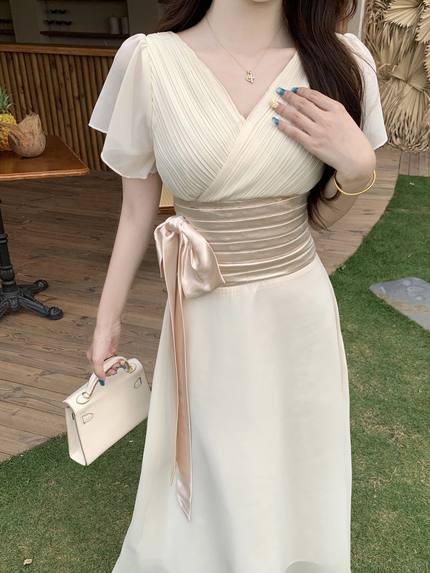 RY2296# 2026大码夏气质荷叶袖V领连衣裙温柔绑带收腰显瘦雪纺中式裙子女