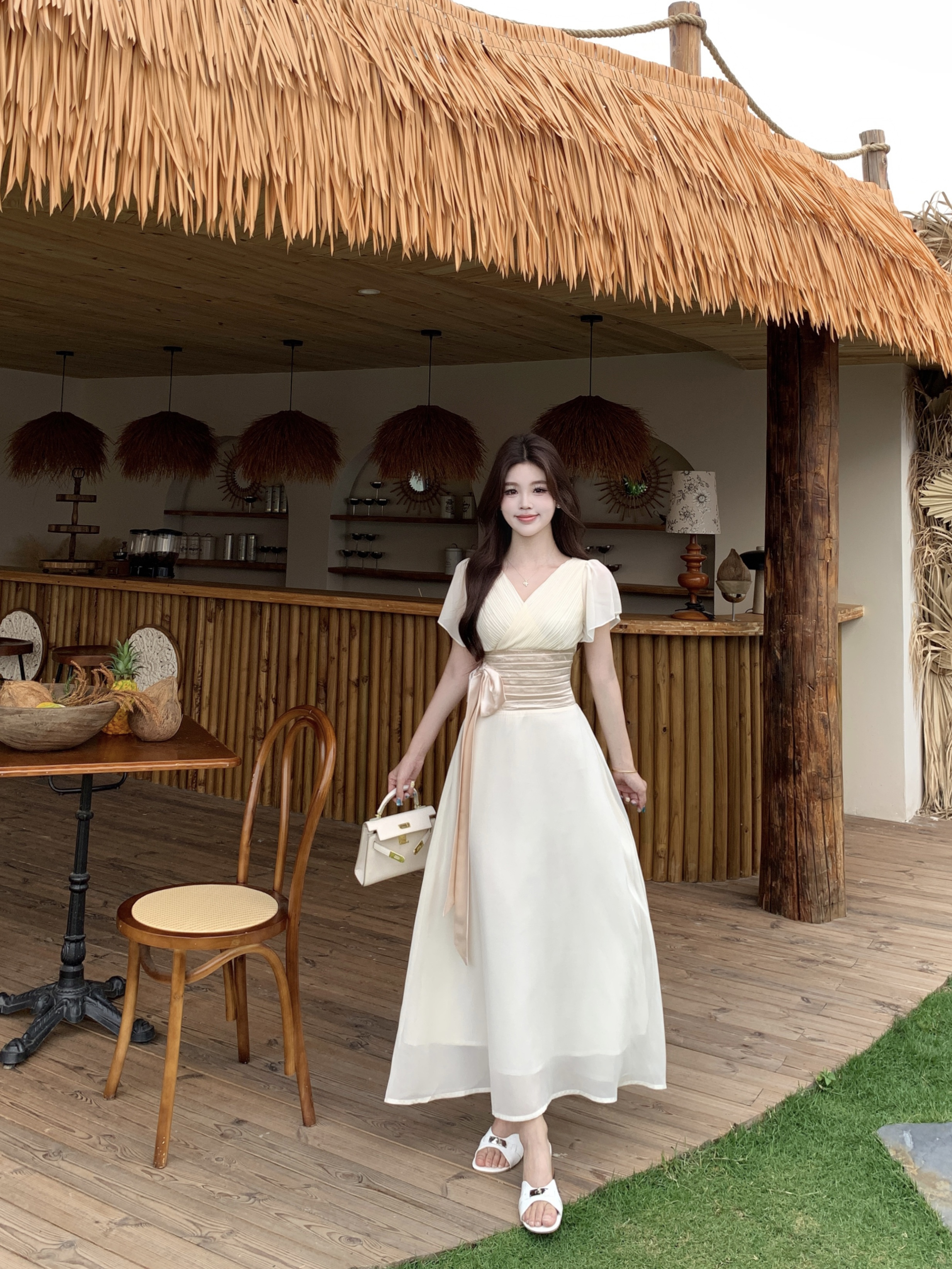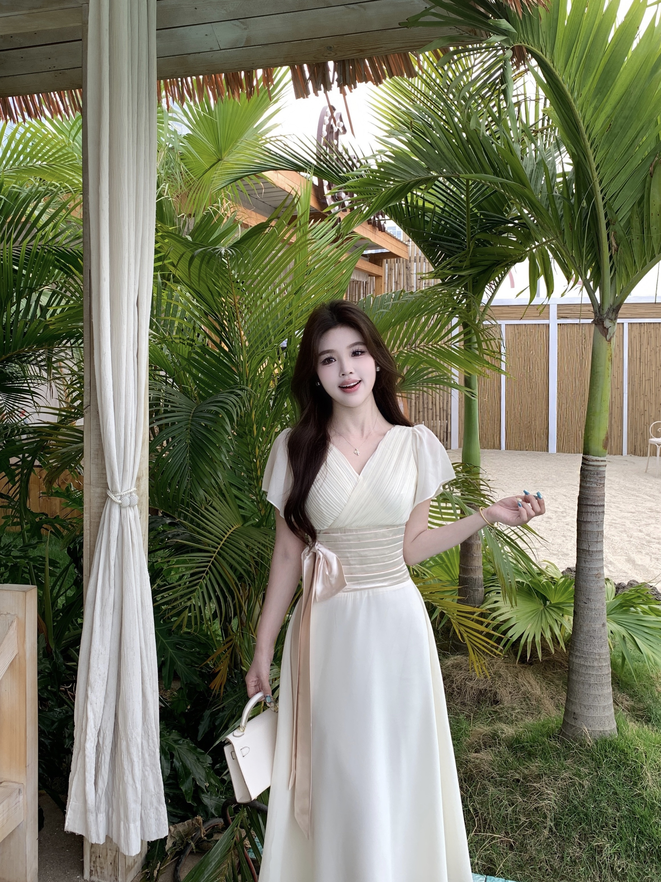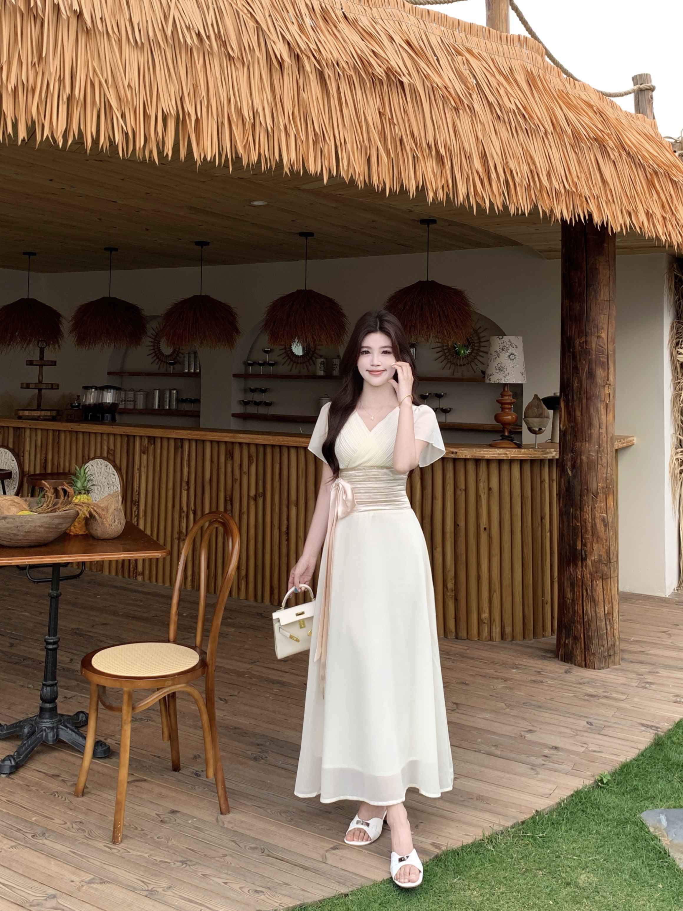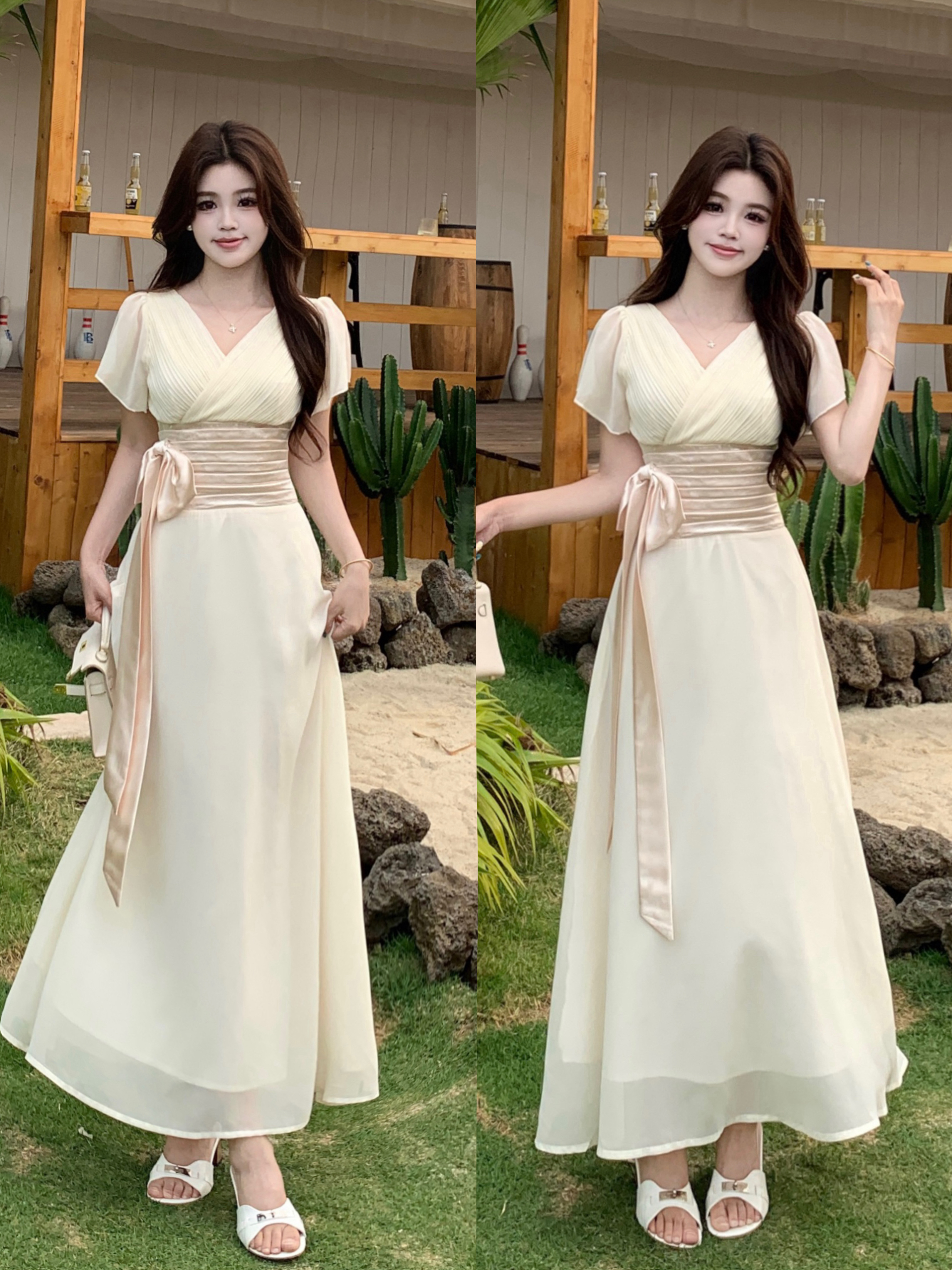RY2296# 2026大码夏气质荷叶袖V领连衣裙温柔绑带收腰显瘦雪纺中式裙子女