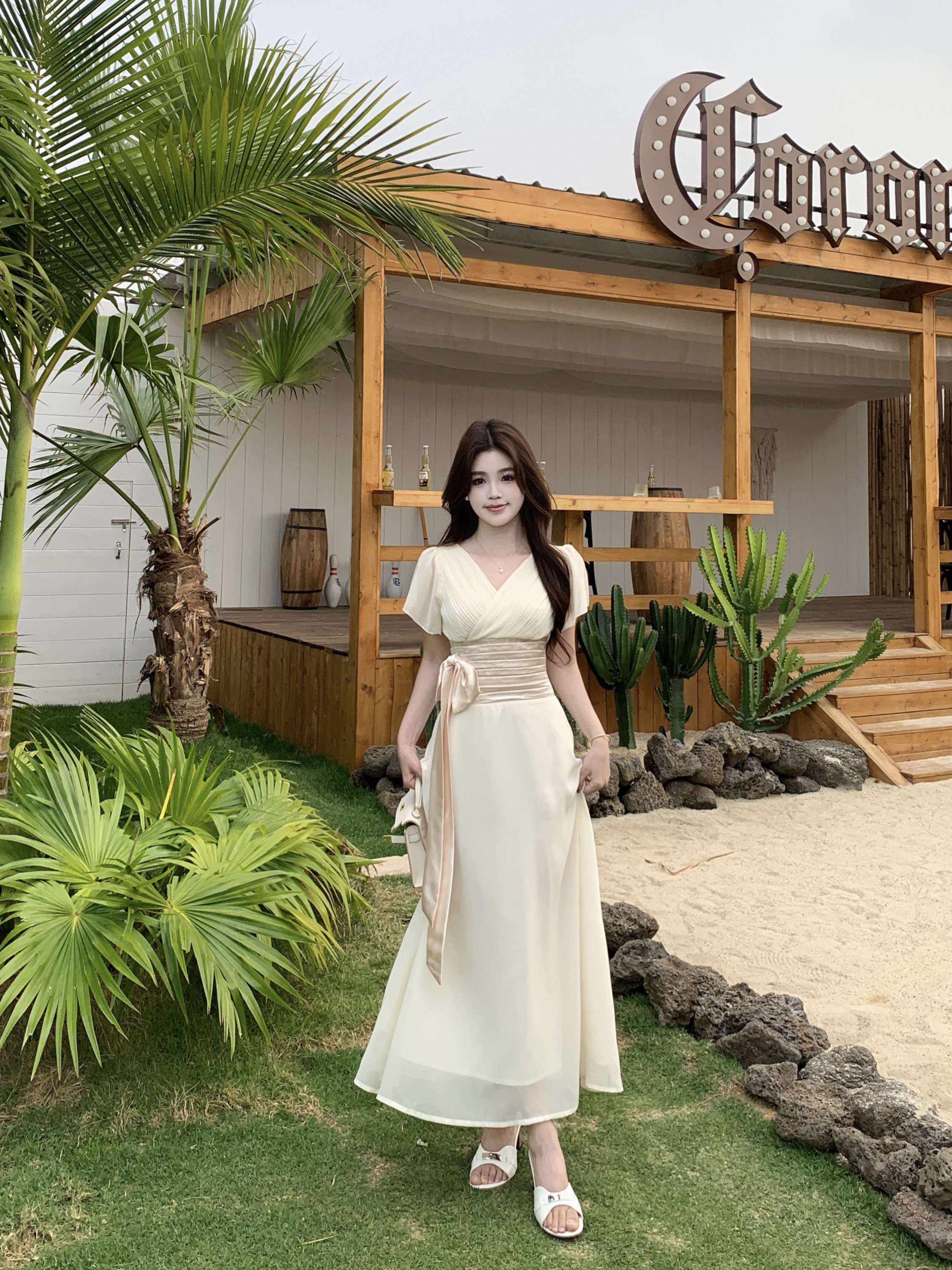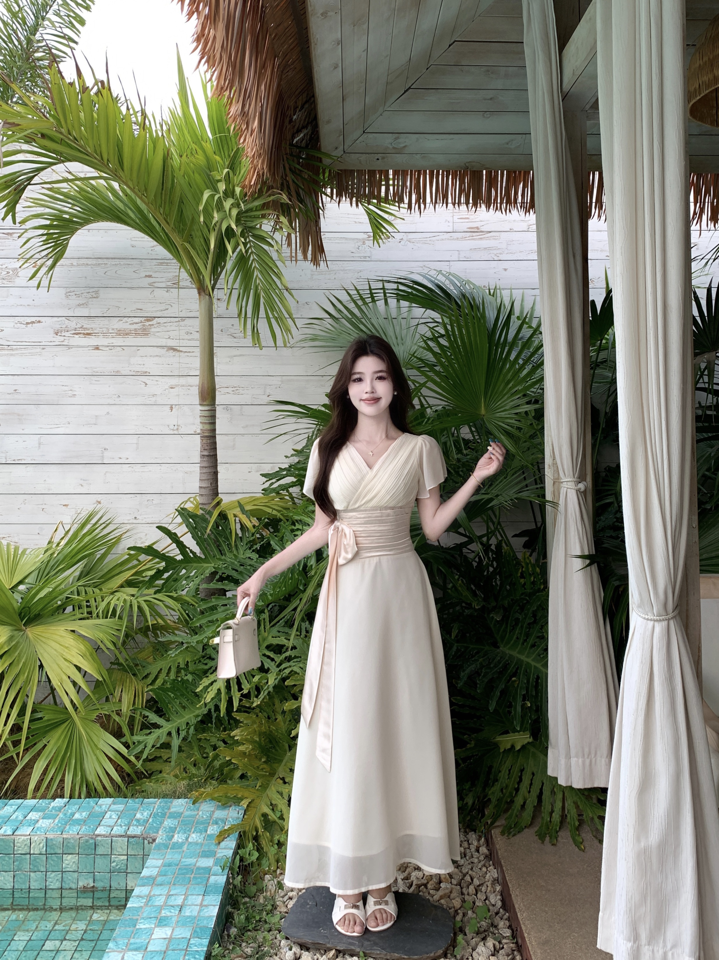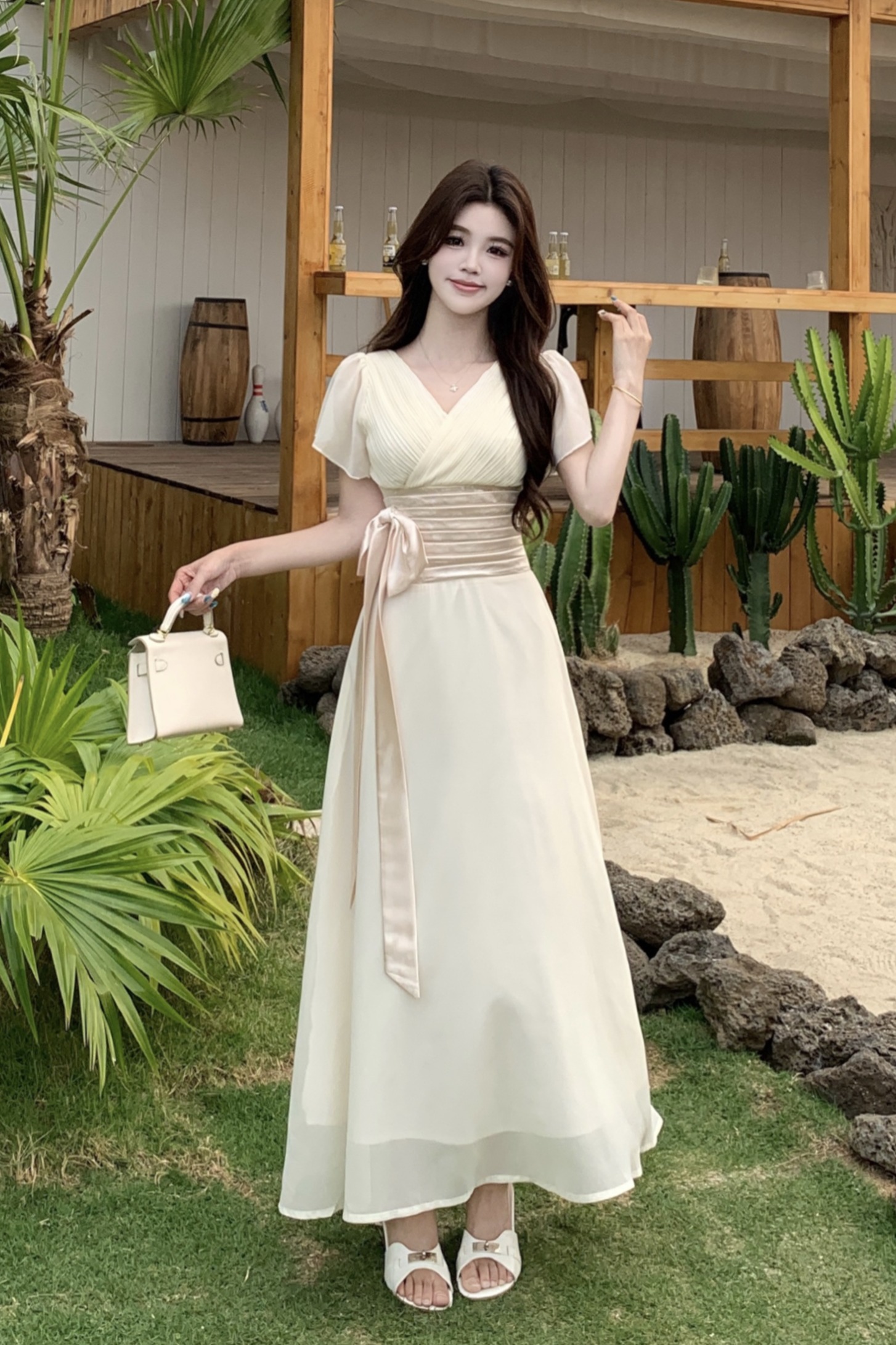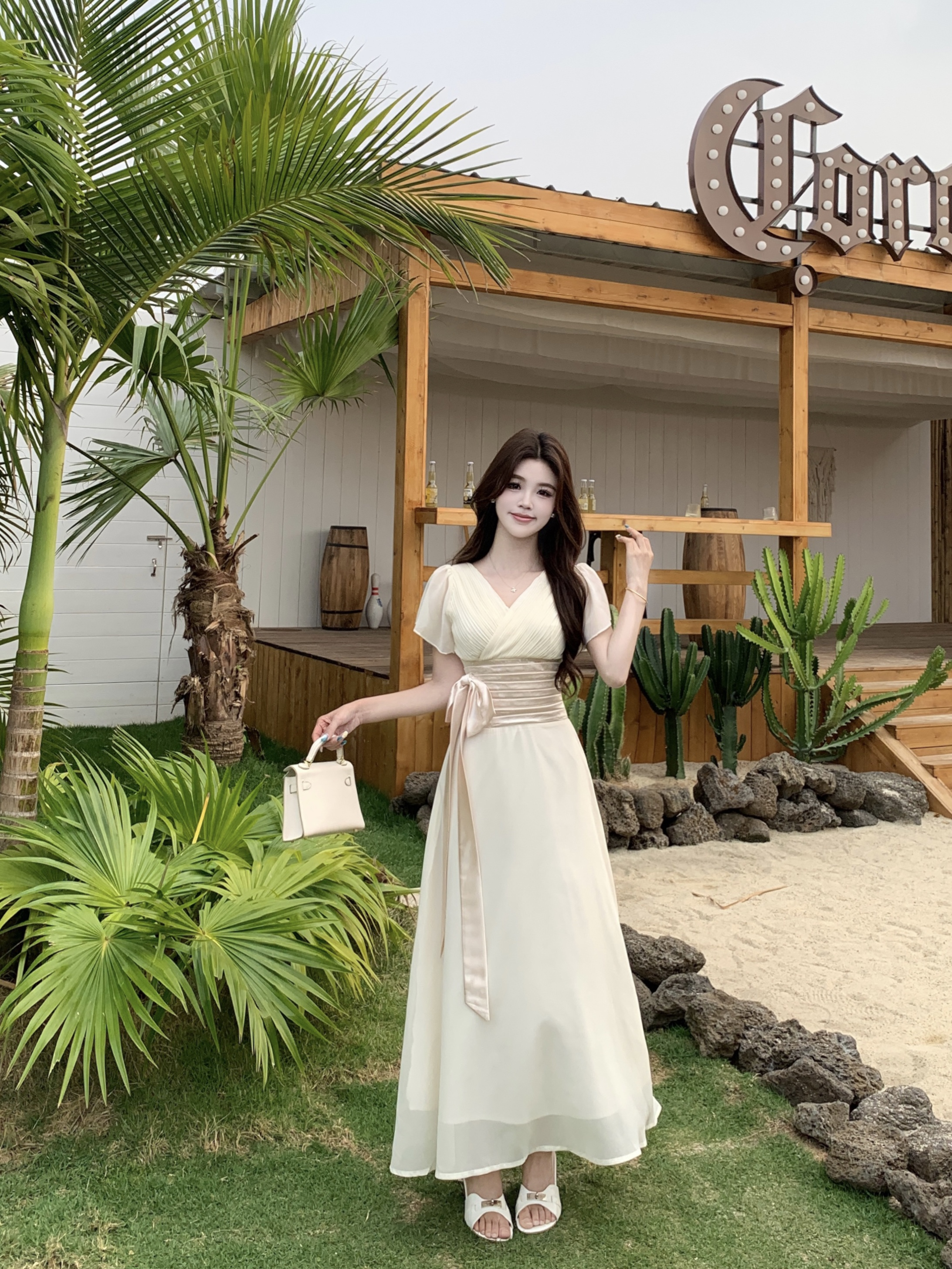 RY2296# 2026大码夏气质荷叶袖V领连衣裙温柔绑带收腰显瘦雪纺中式裙子女
