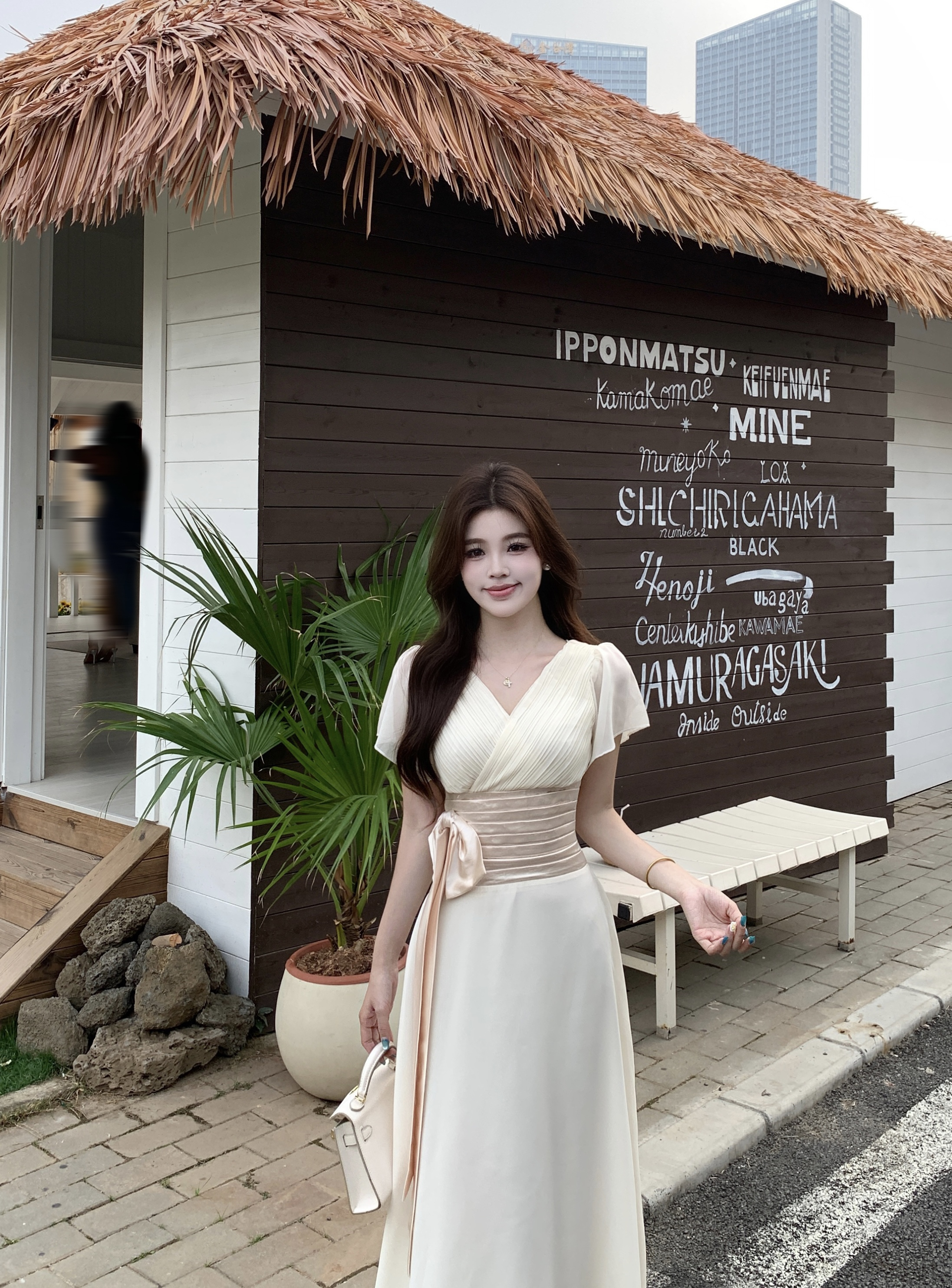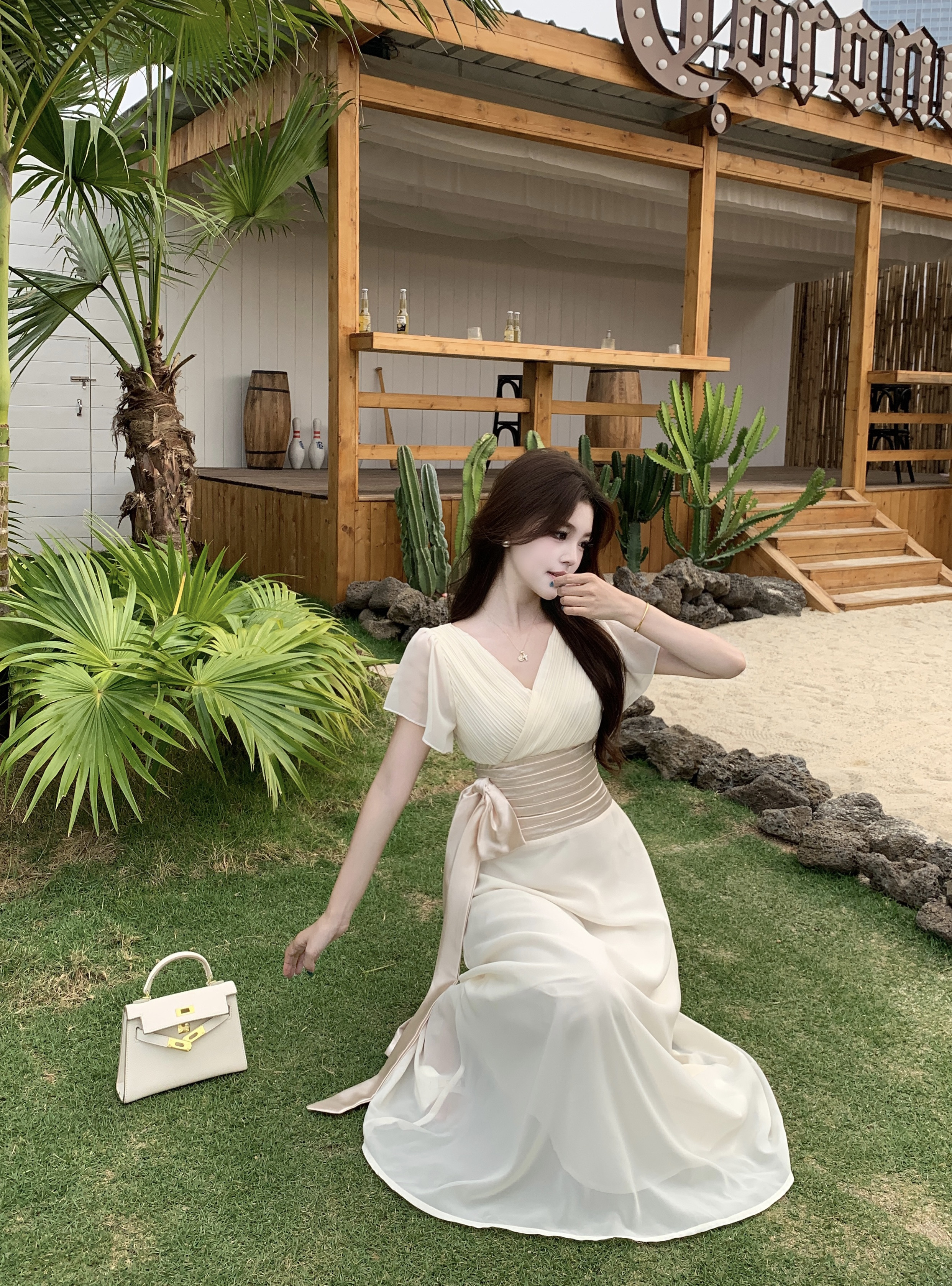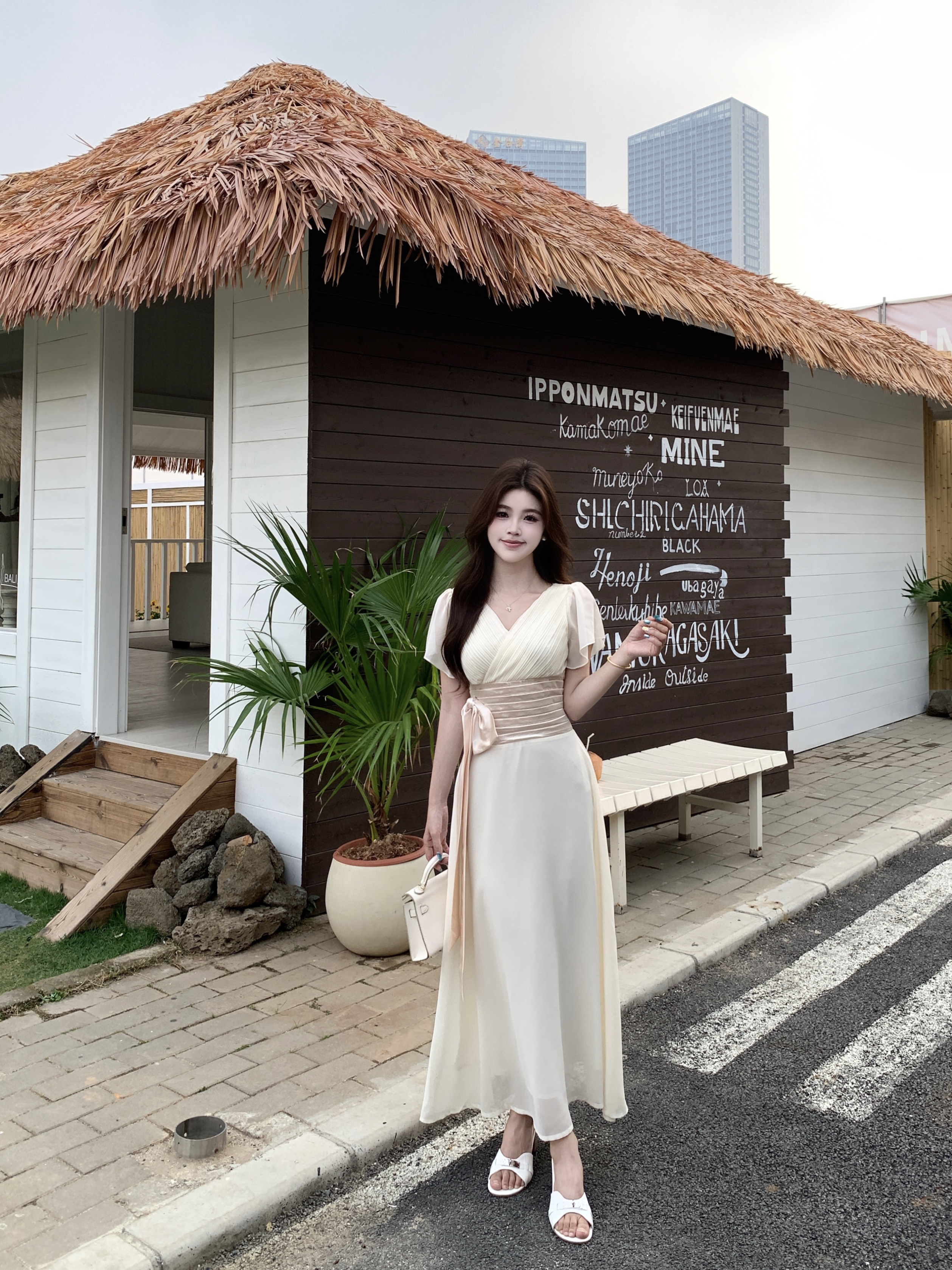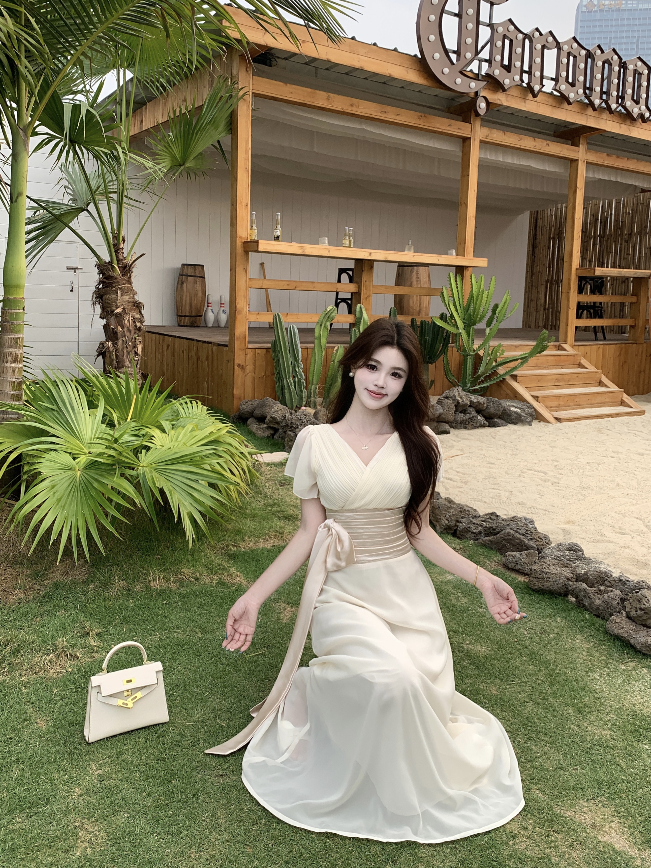 RY2296# 2026大码夏气质荷叶袖V领连衣裙温柔绑带收腰显瘦雪纺中式裙子女