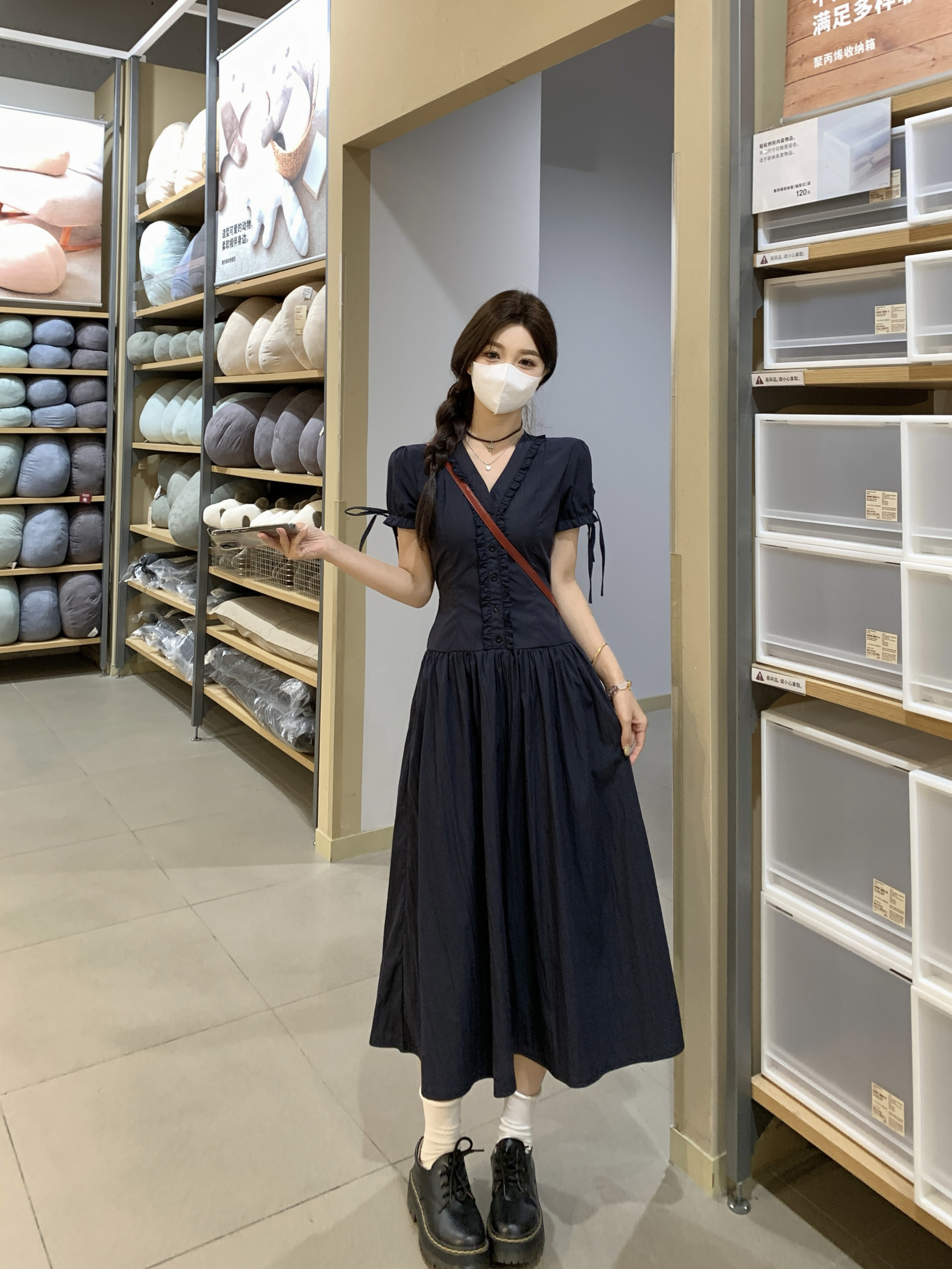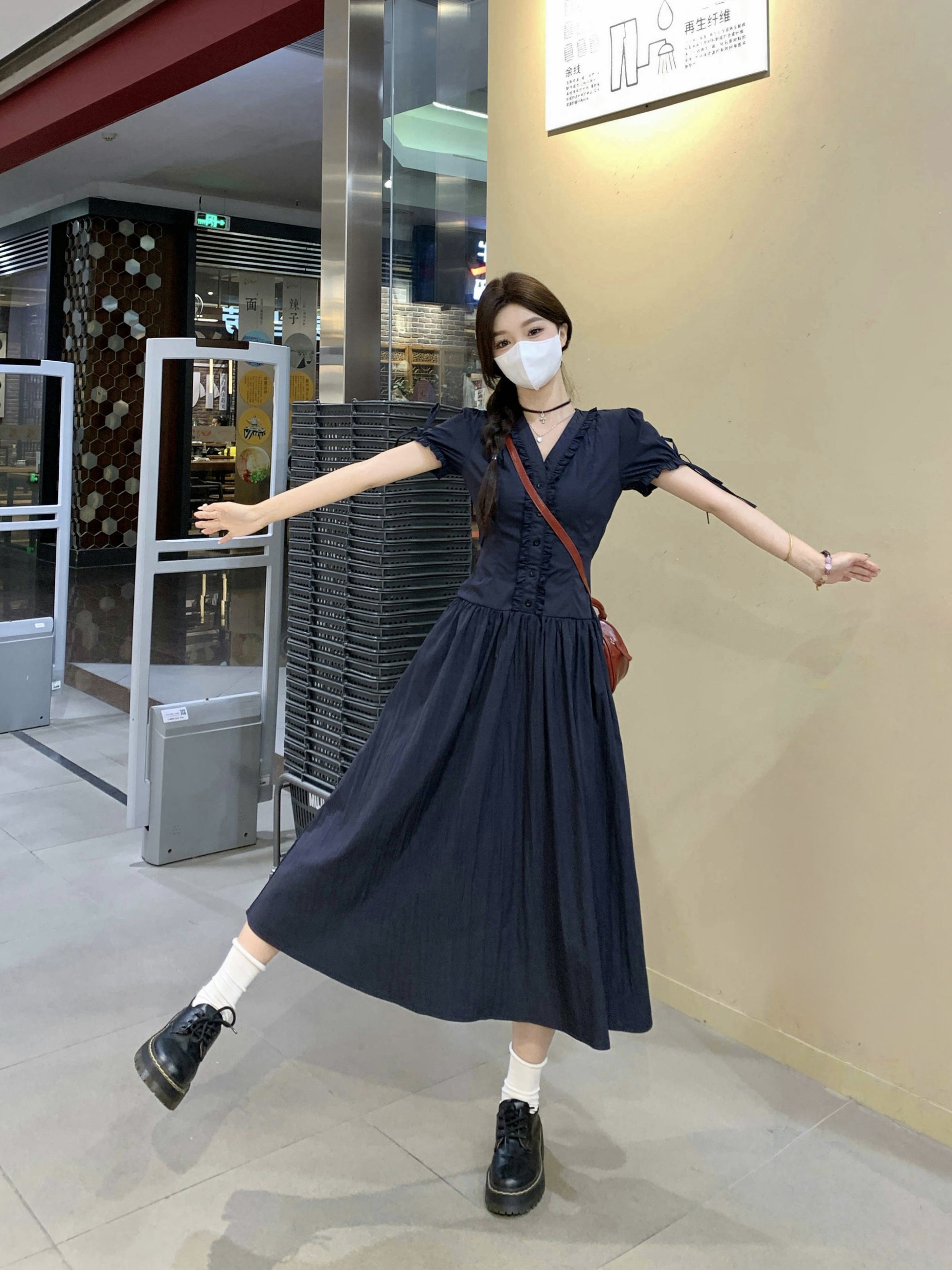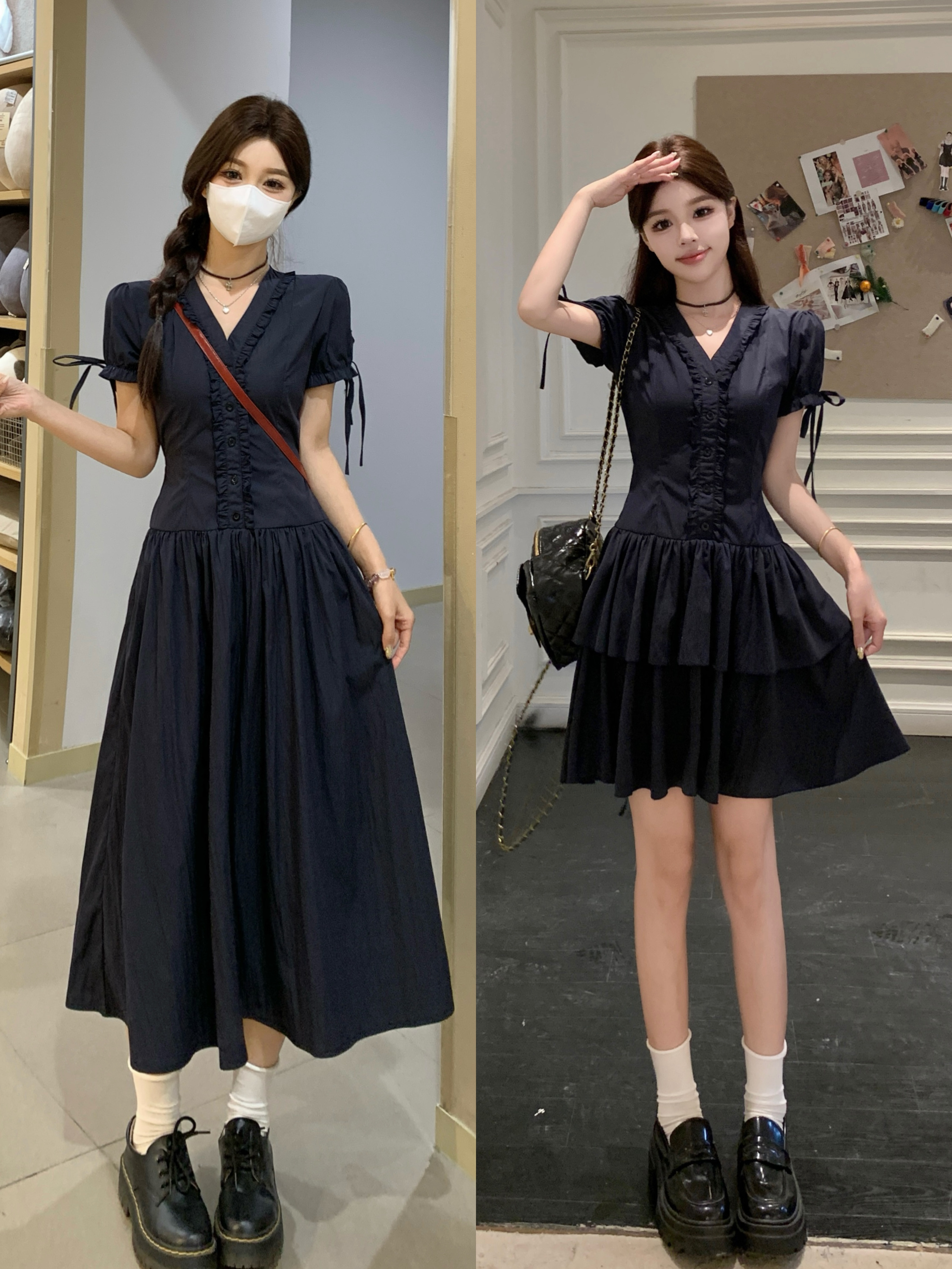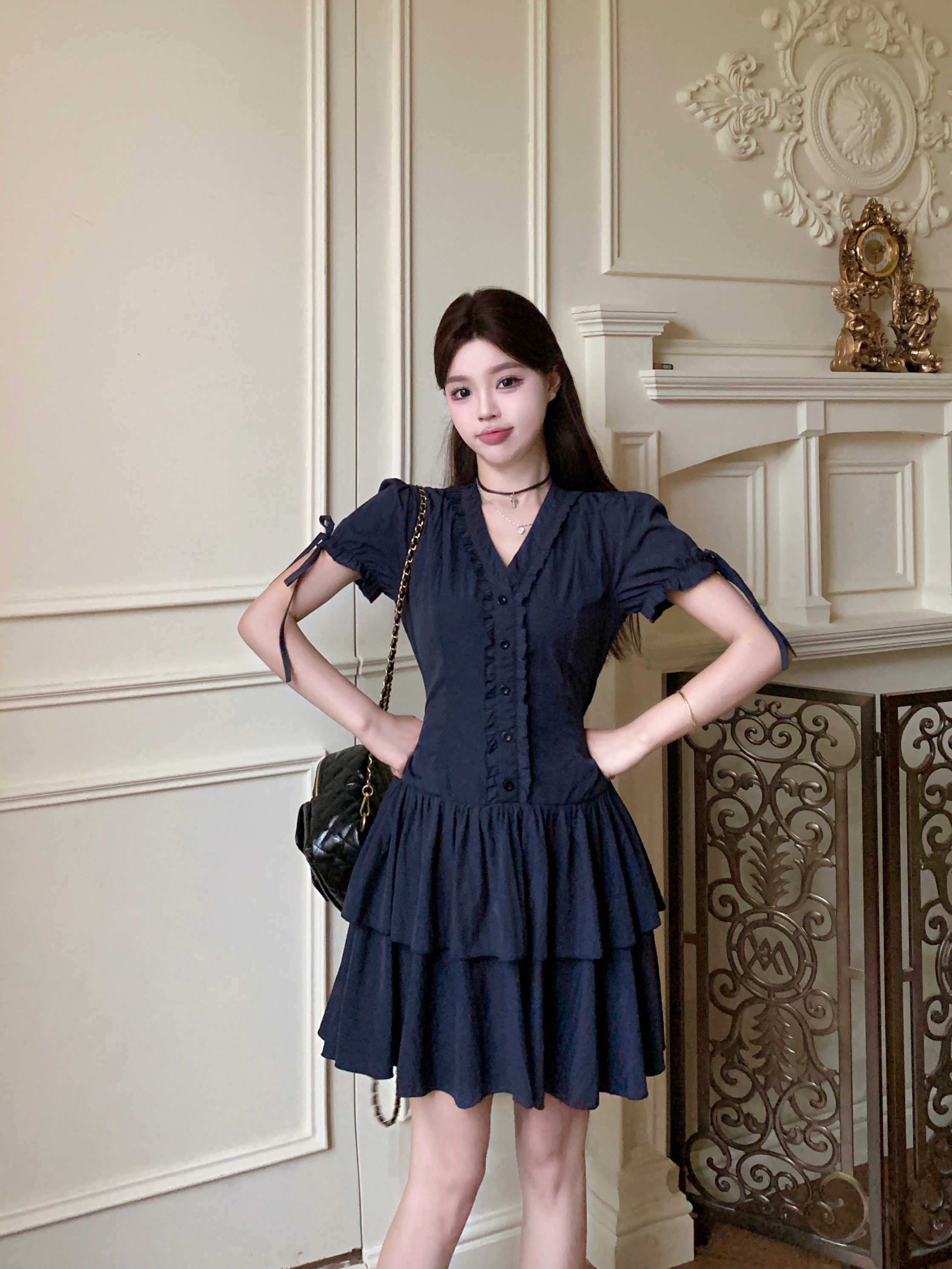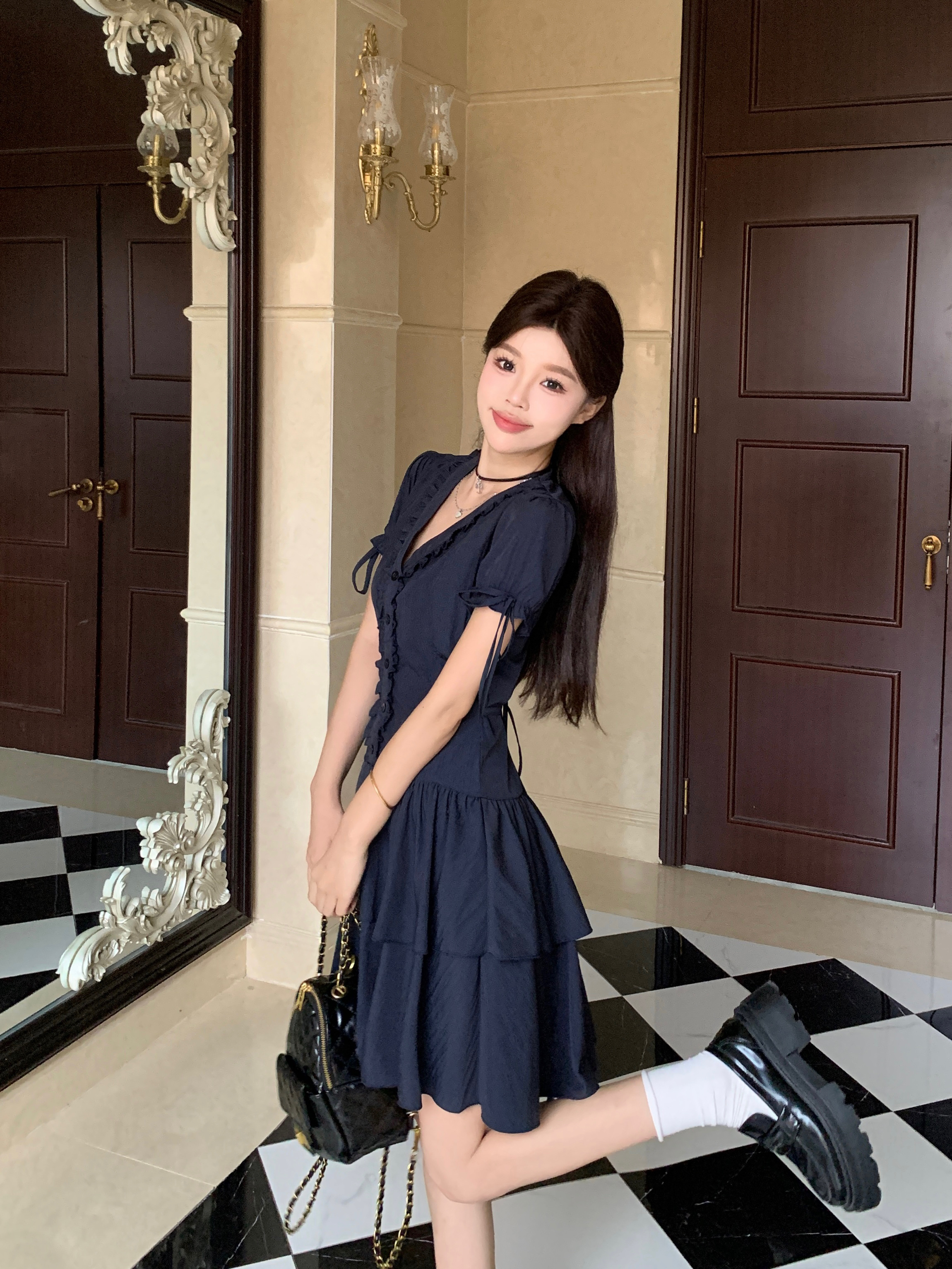 RY2297# 大码夜海辰砂蕾丝花边v领中古短袖连衣裙A字裙显瘦气质高腰裙子女