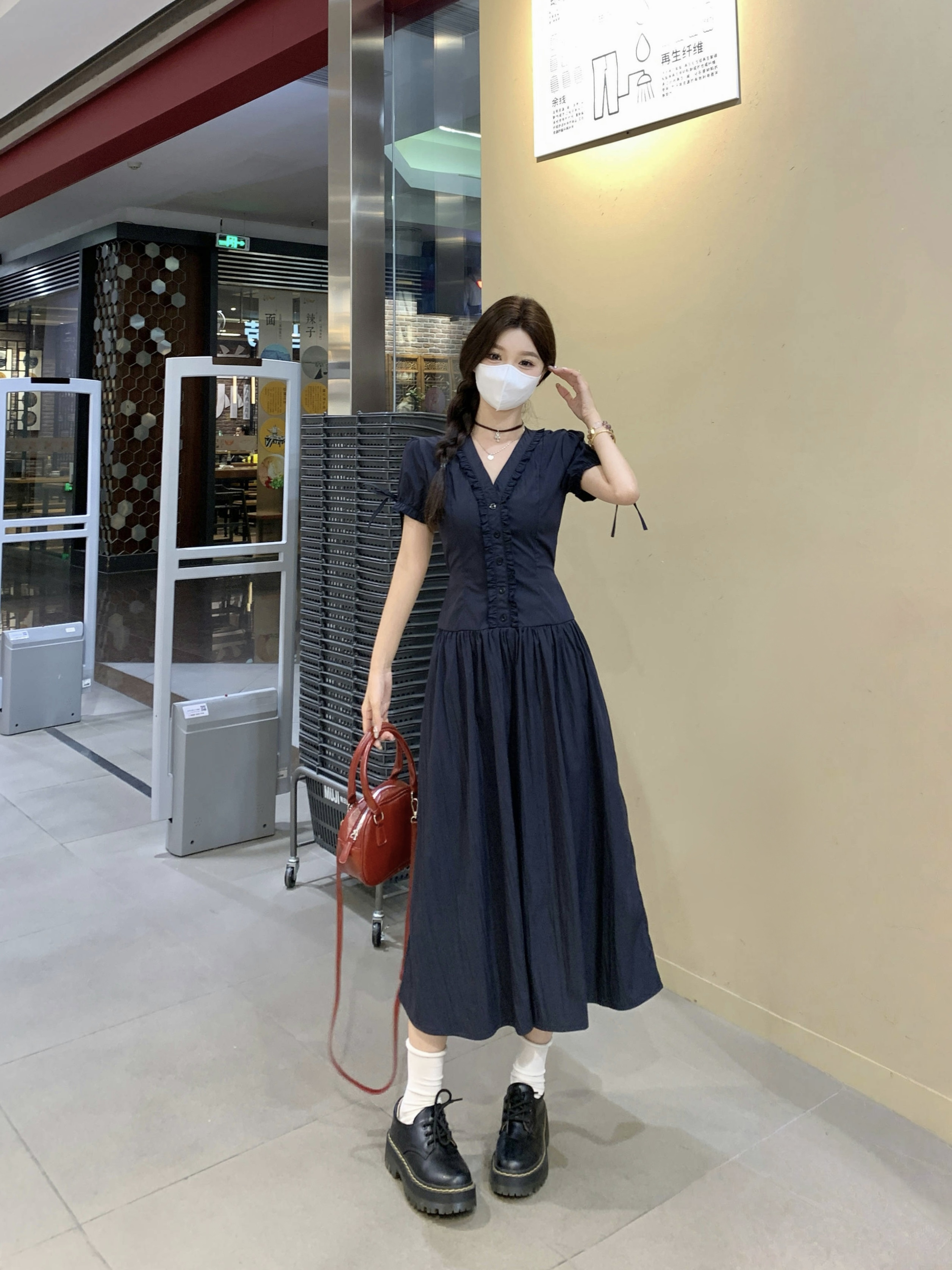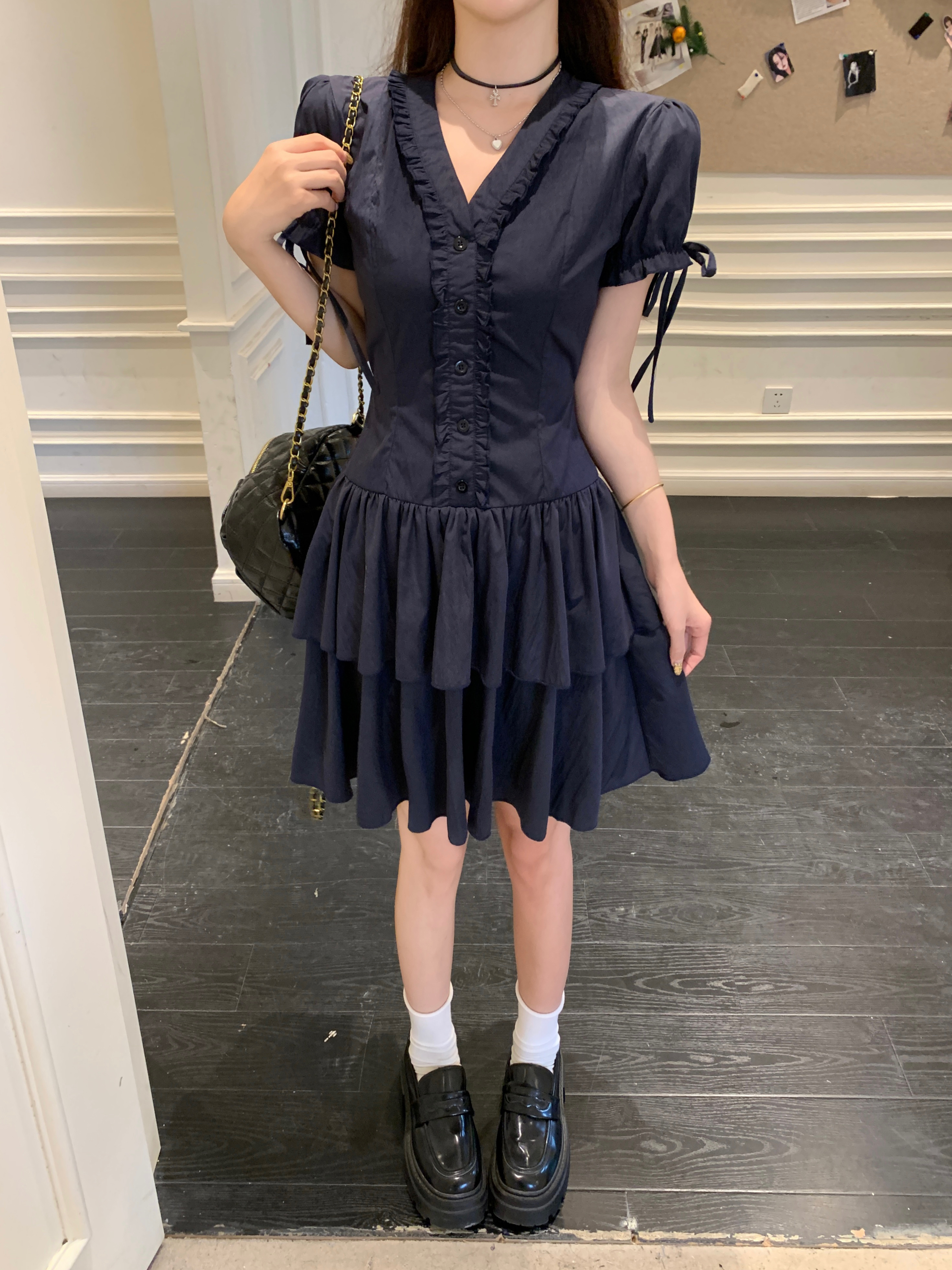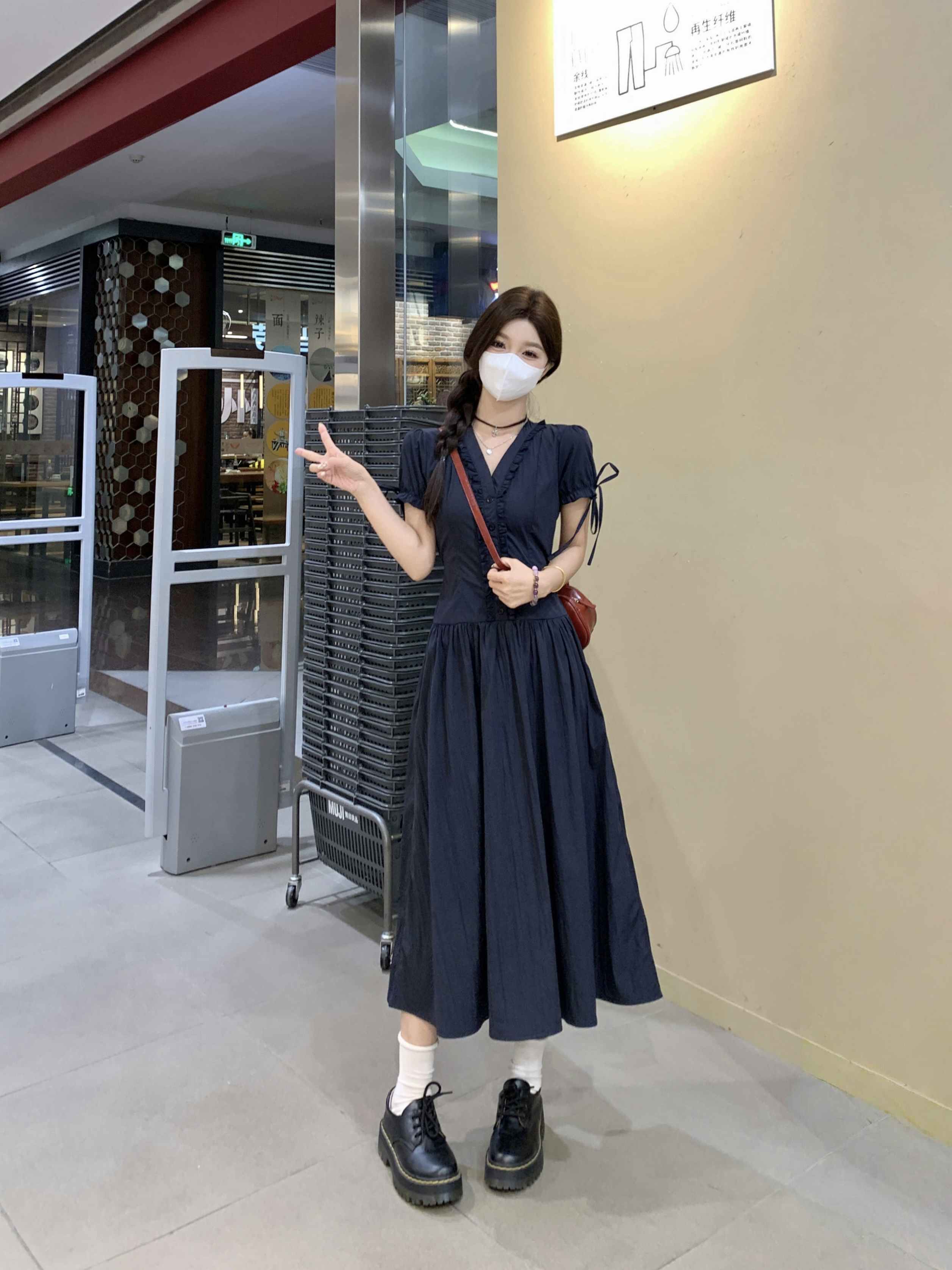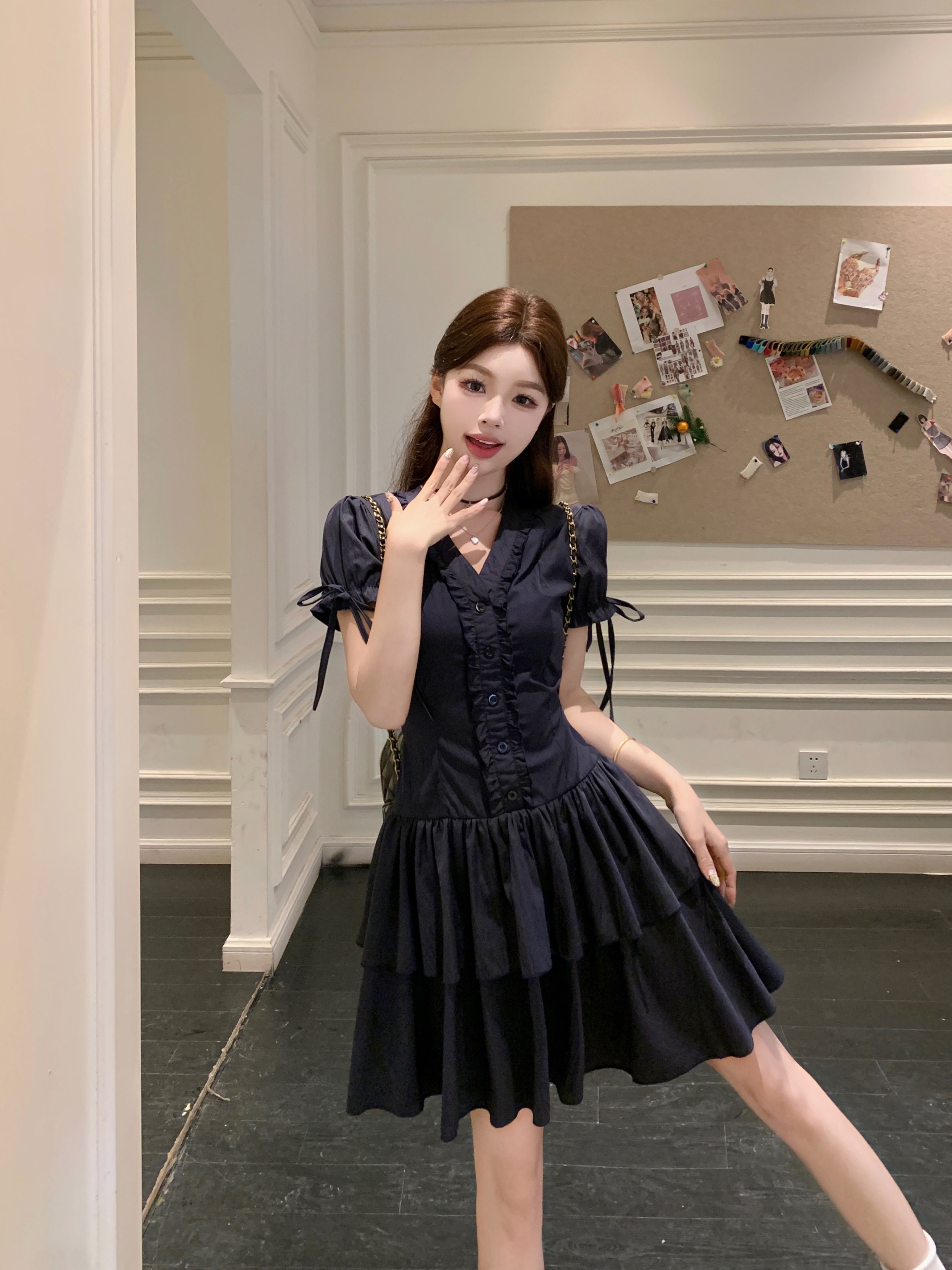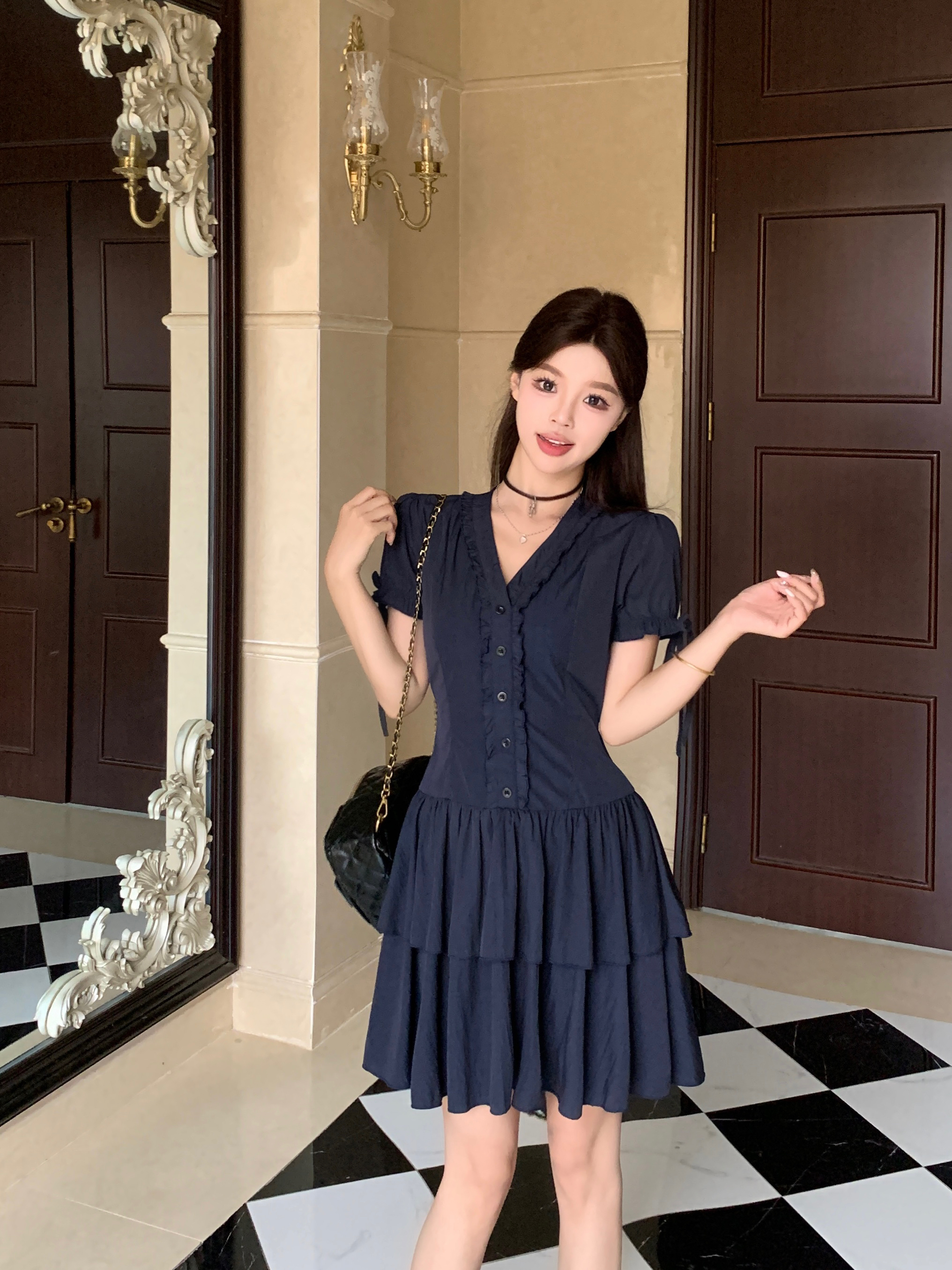 RY2297# 大码夜海辰砂蕾丝花边v领中古短袖连衣裙A字裙显瘦气质高腰裙子女
