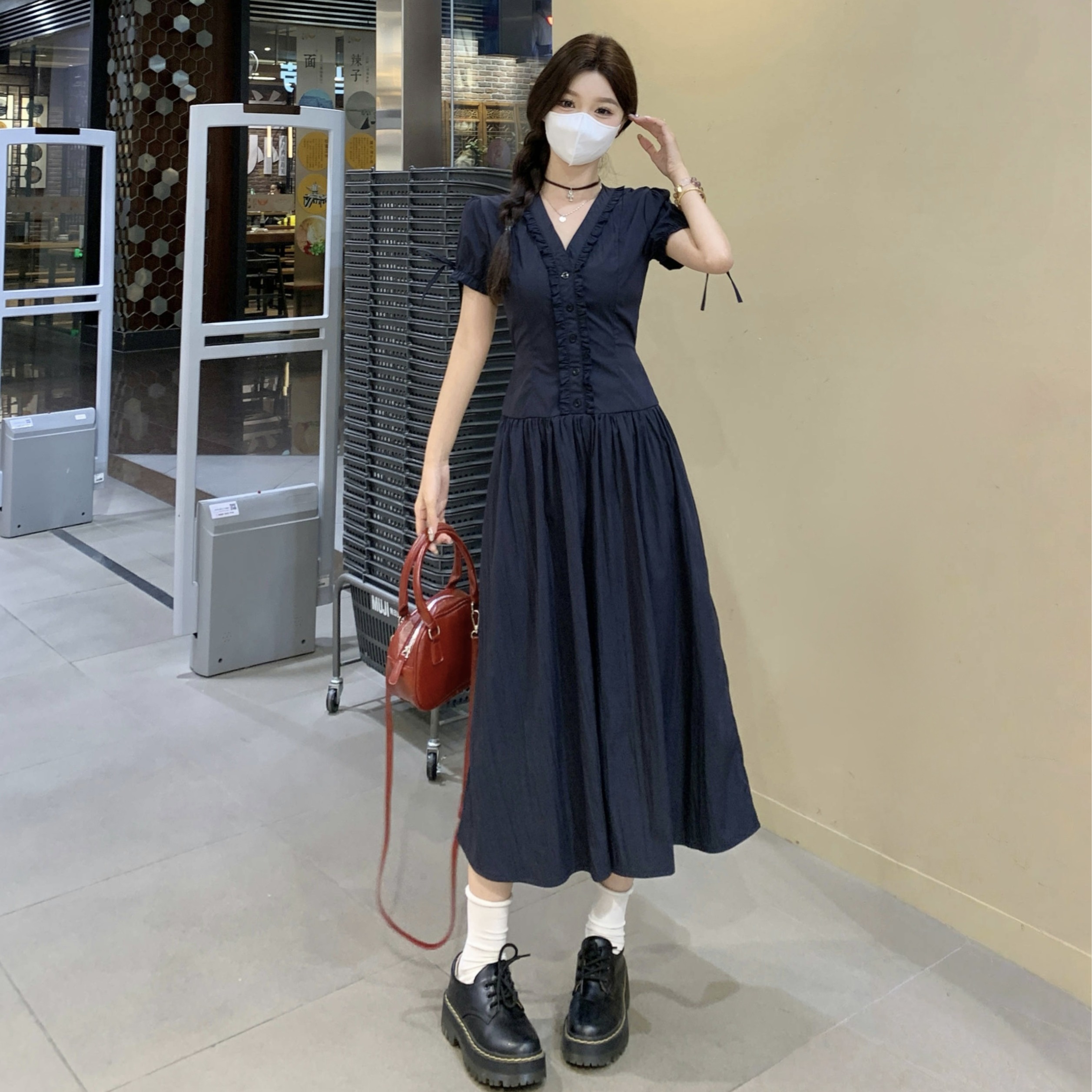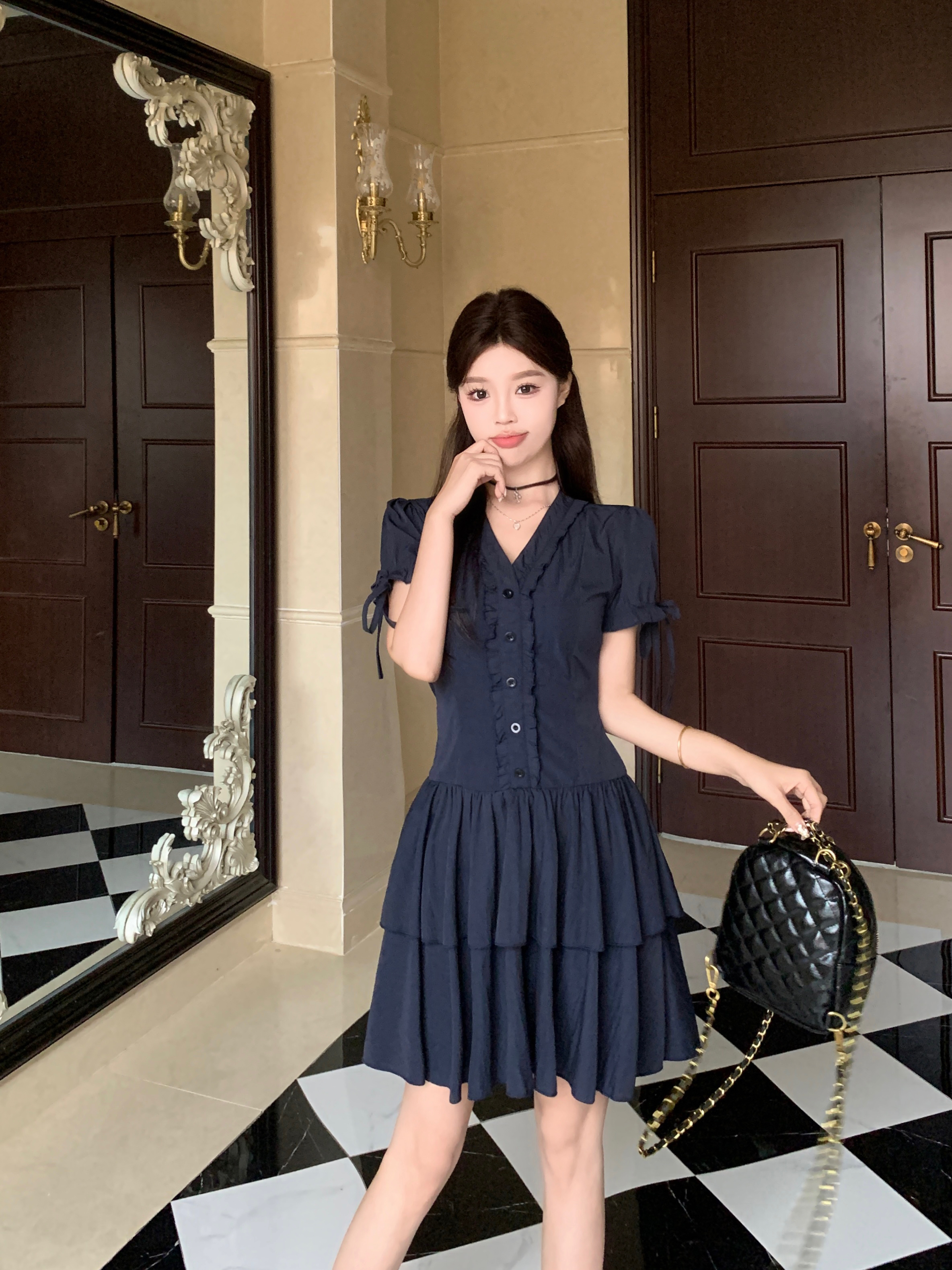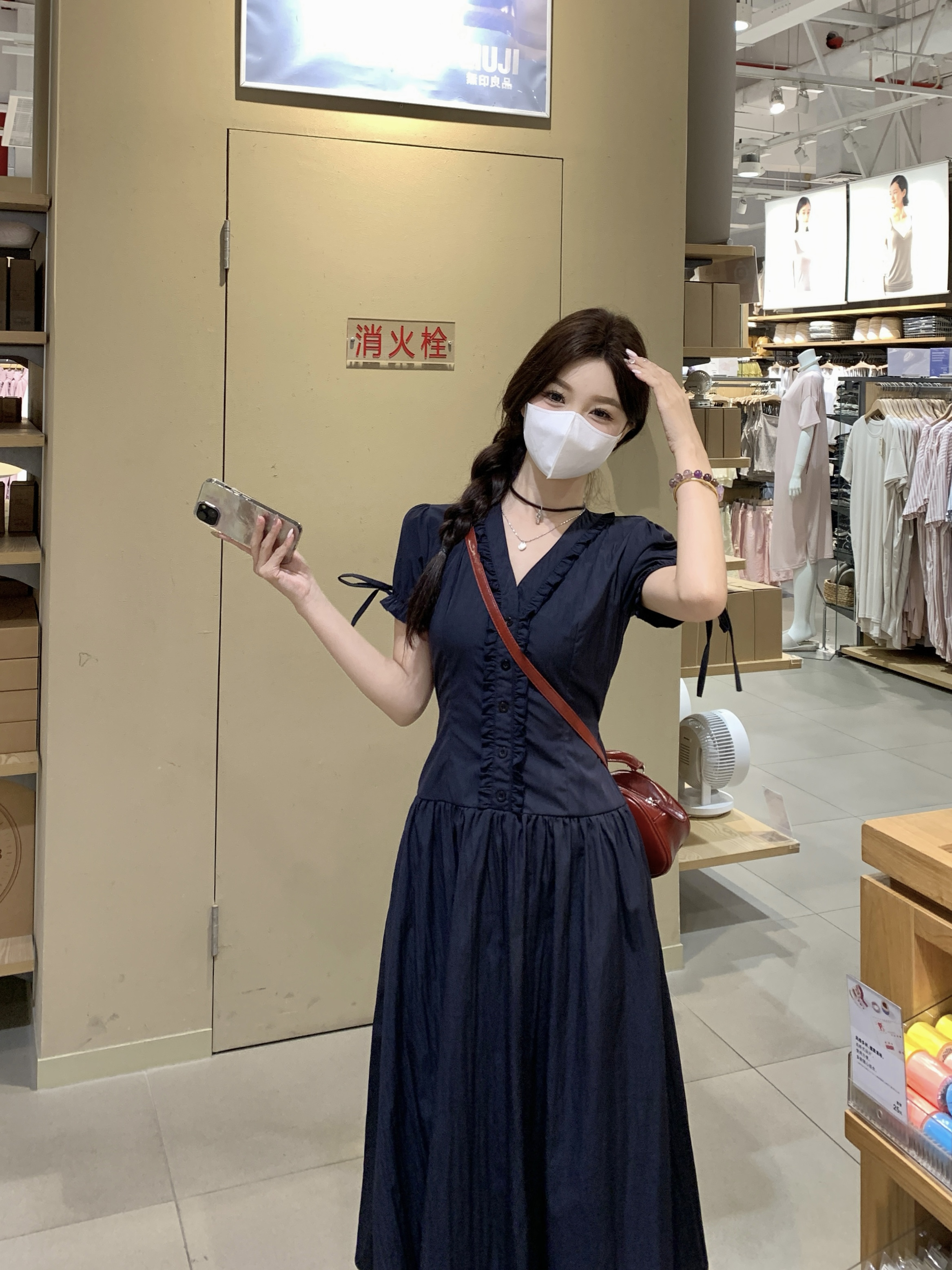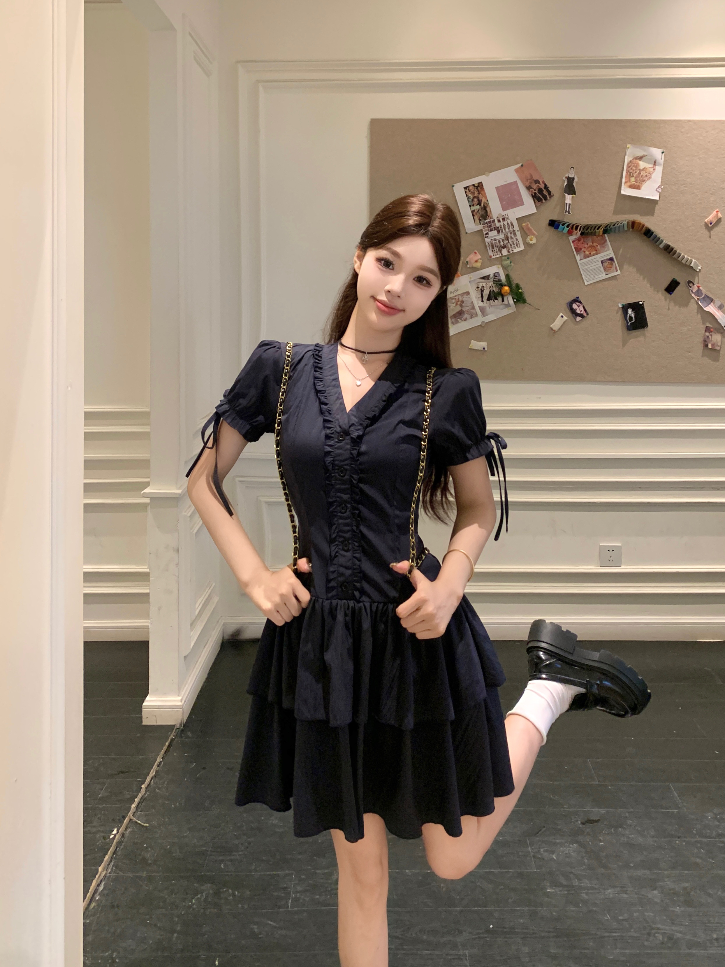 RY2297# 大码夜海辰砂蕾丝花边v领中古短袖连衣裙A字裙显瘦气质高腰裙子女