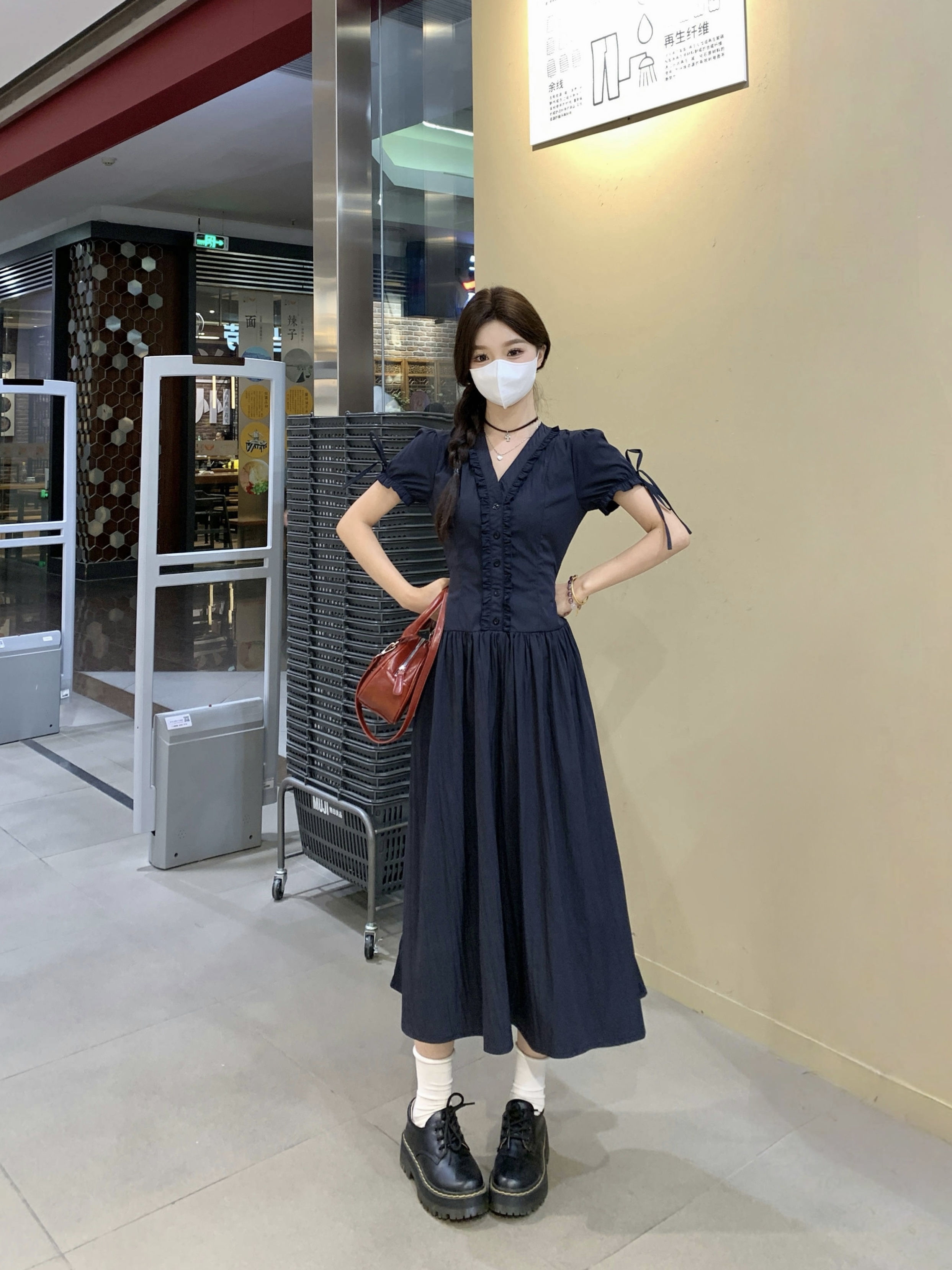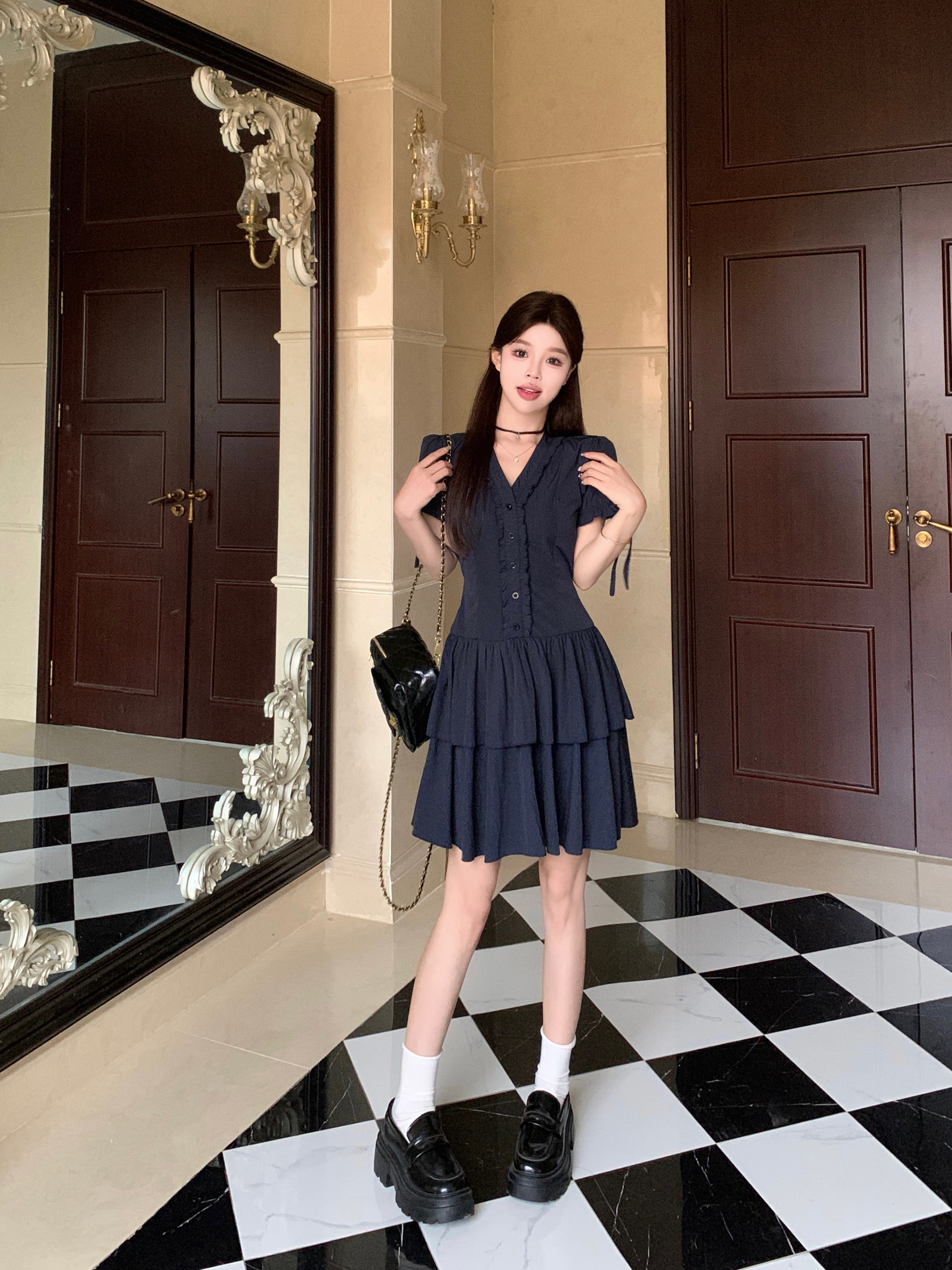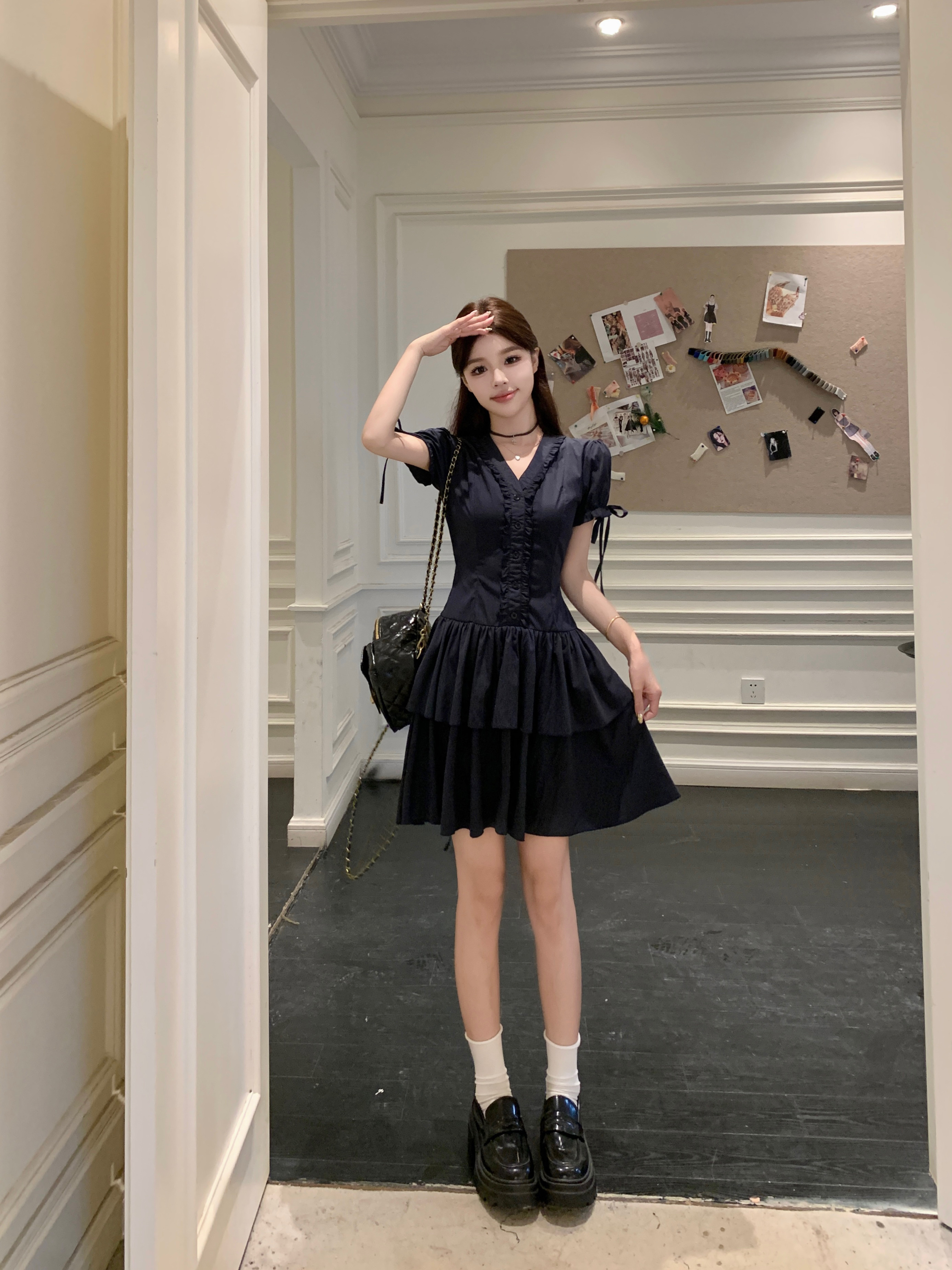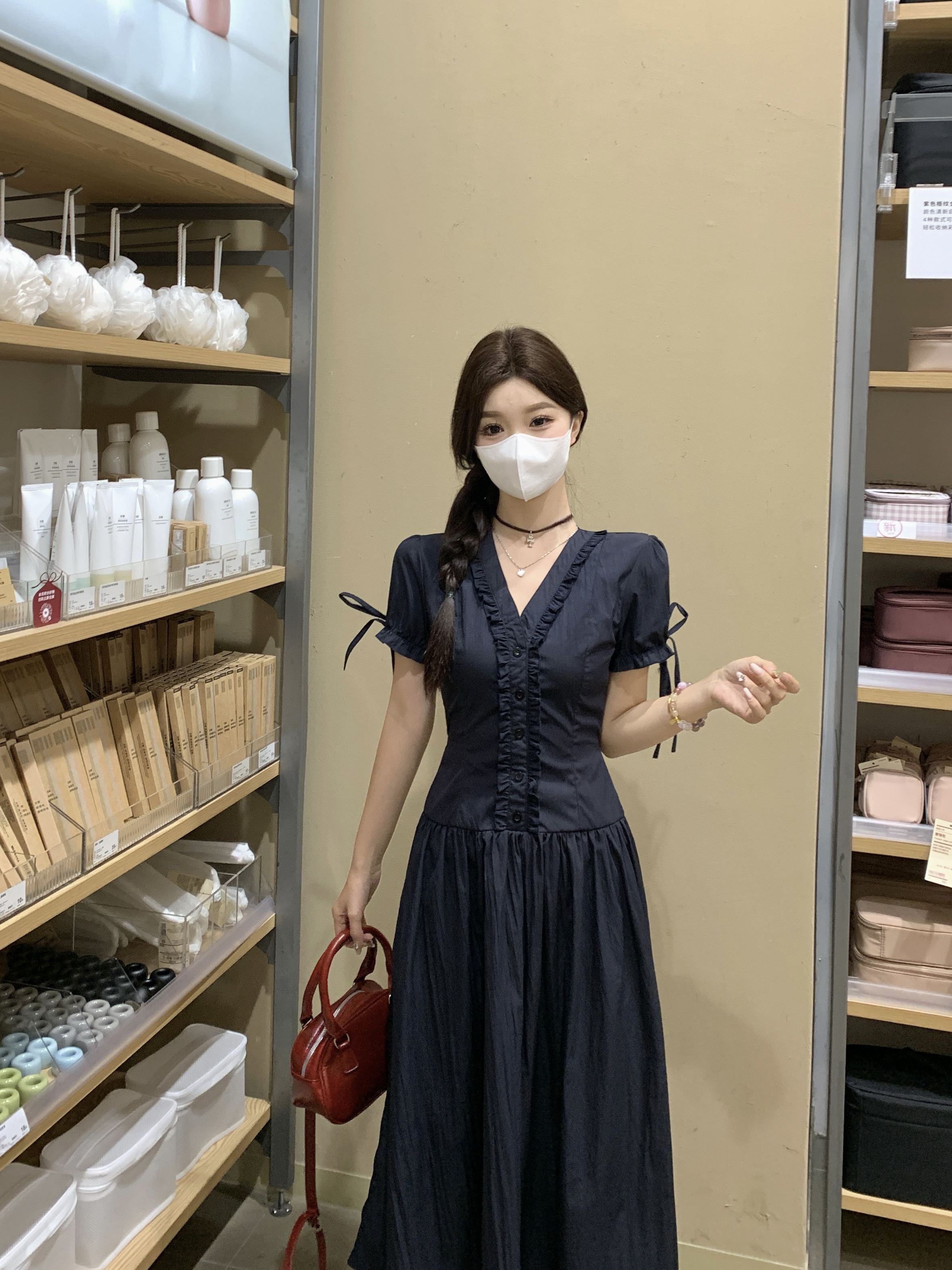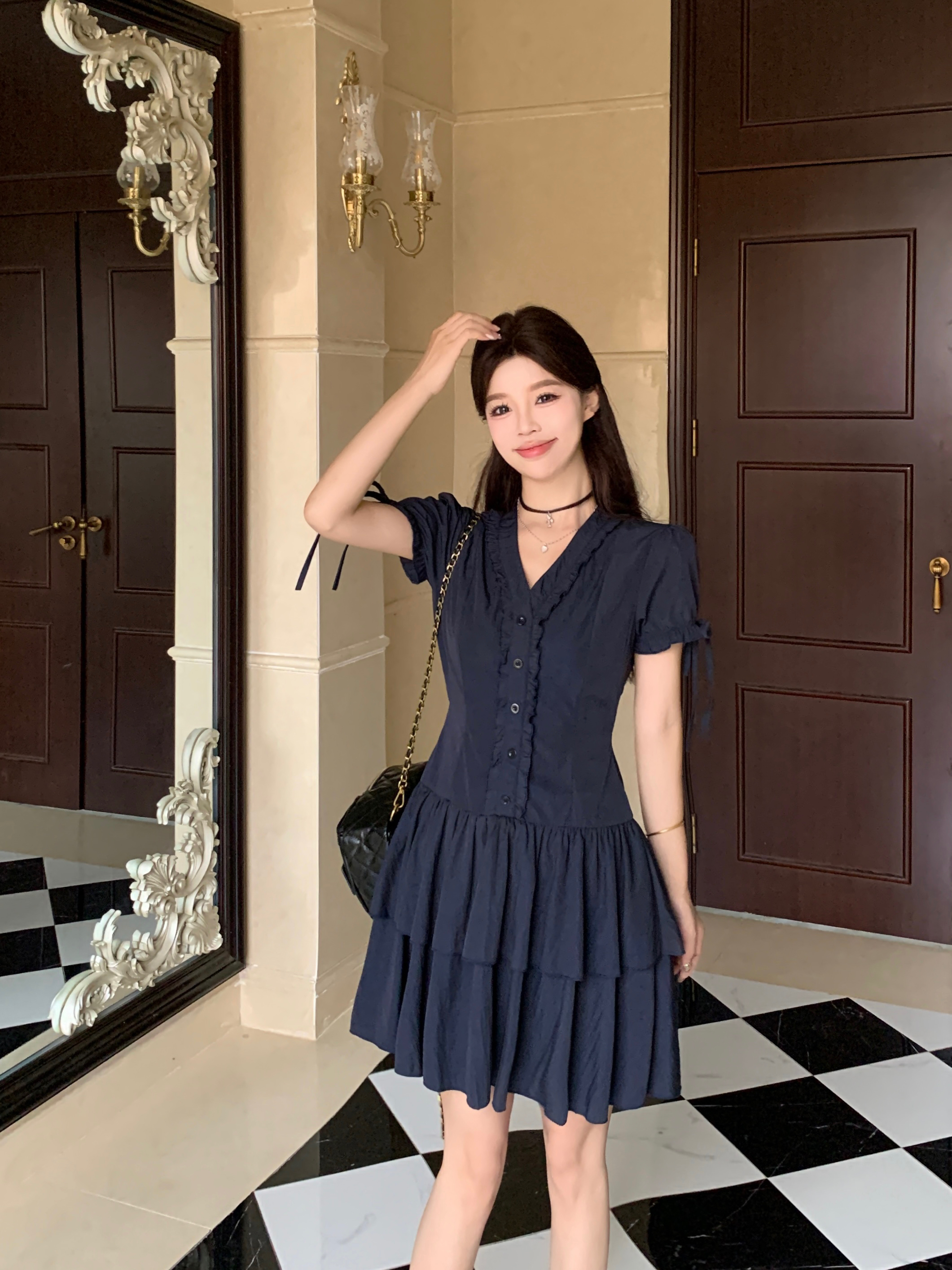 RY2297# 大码夜海辰砂蕾丝花边v领中古短袖连衣裙A字裙显瘦气质高腰裙子女