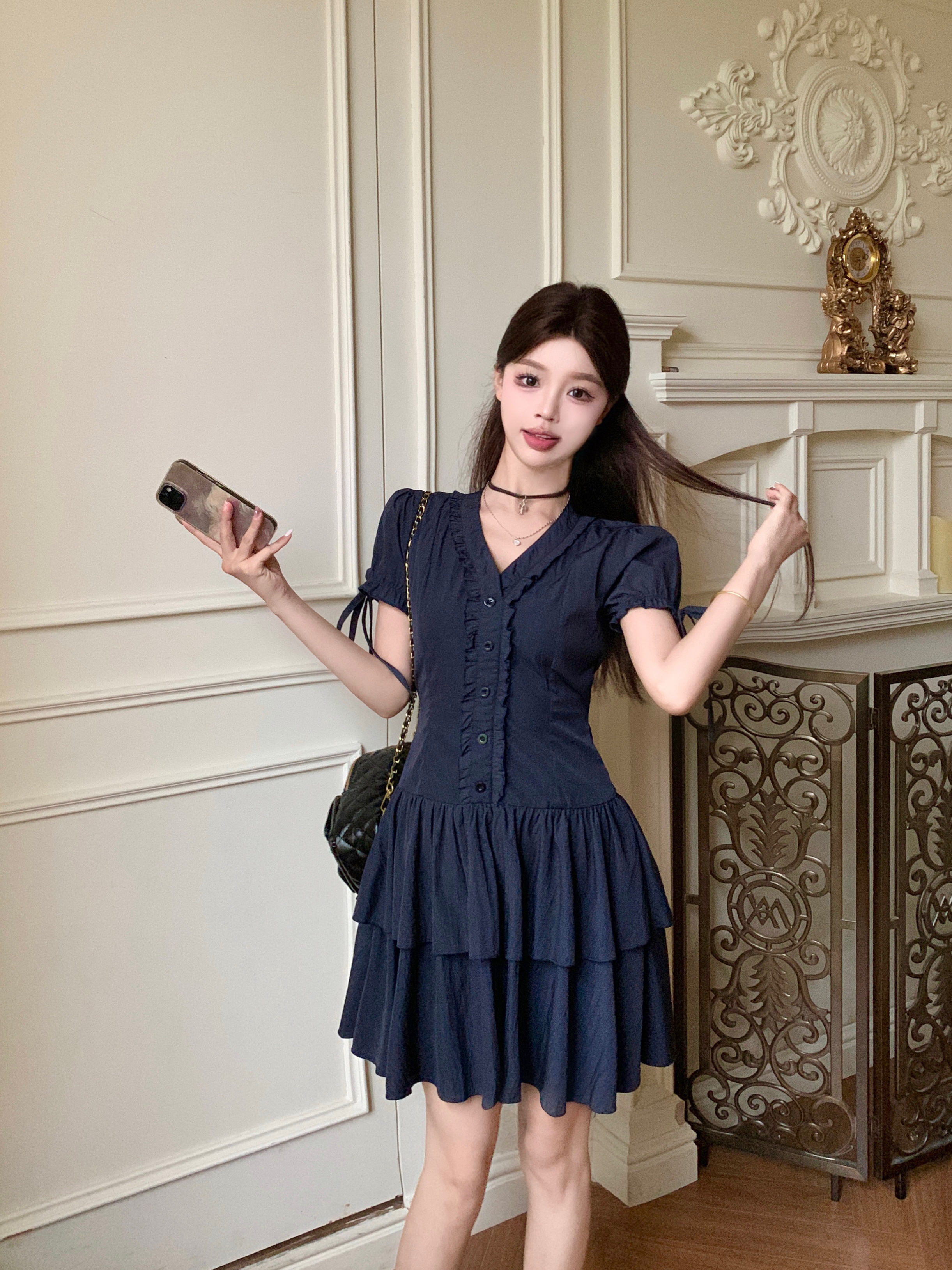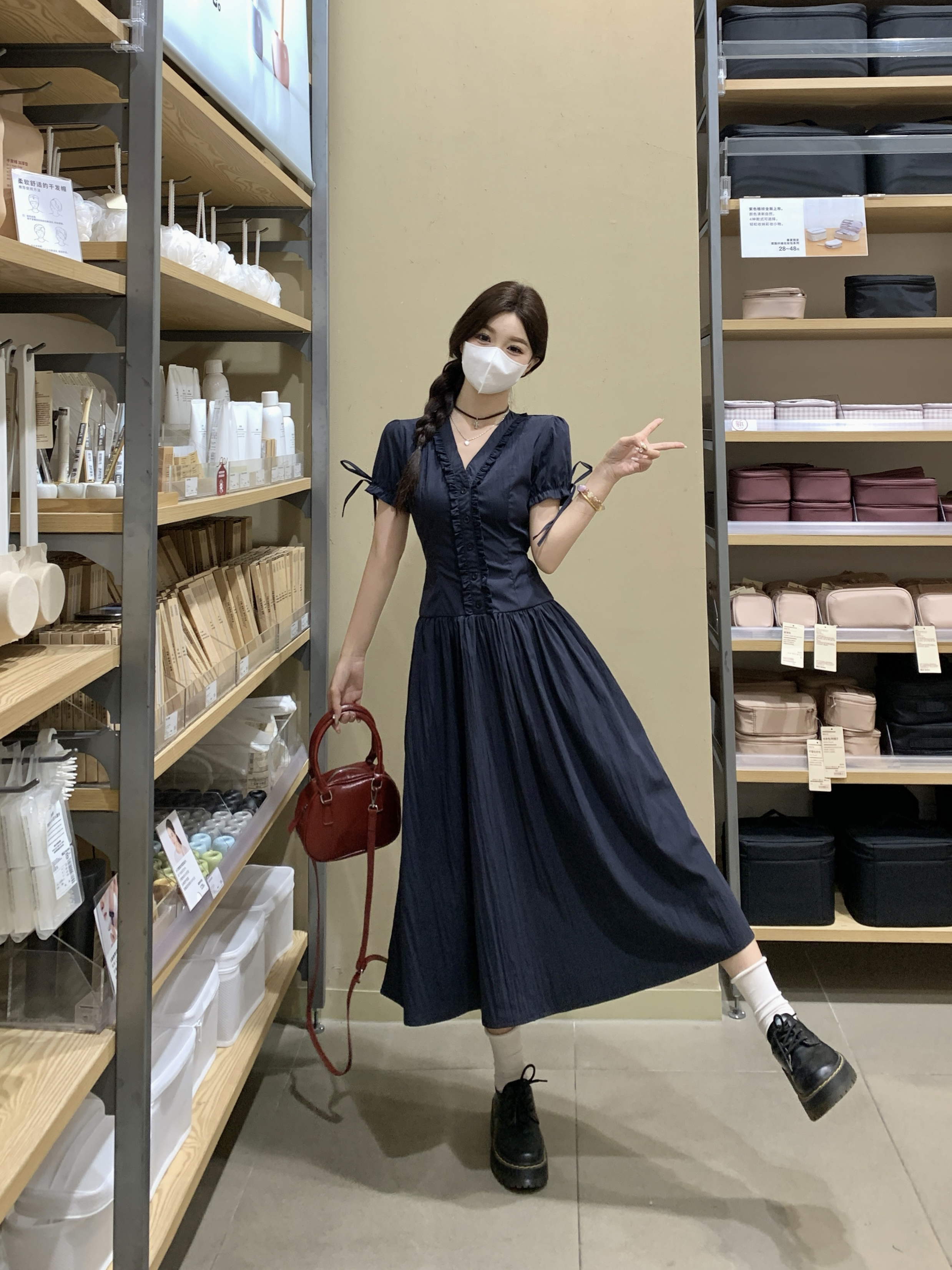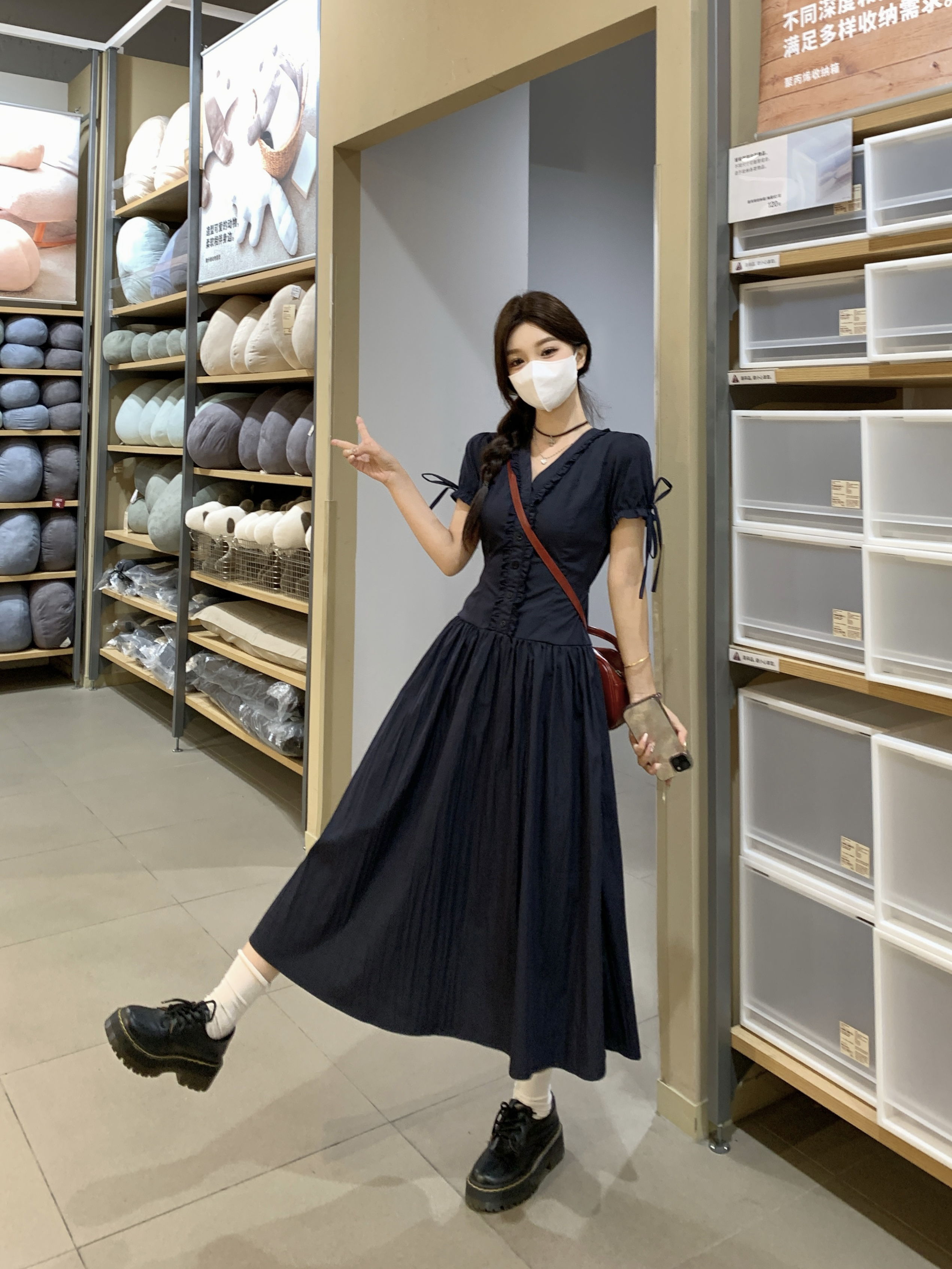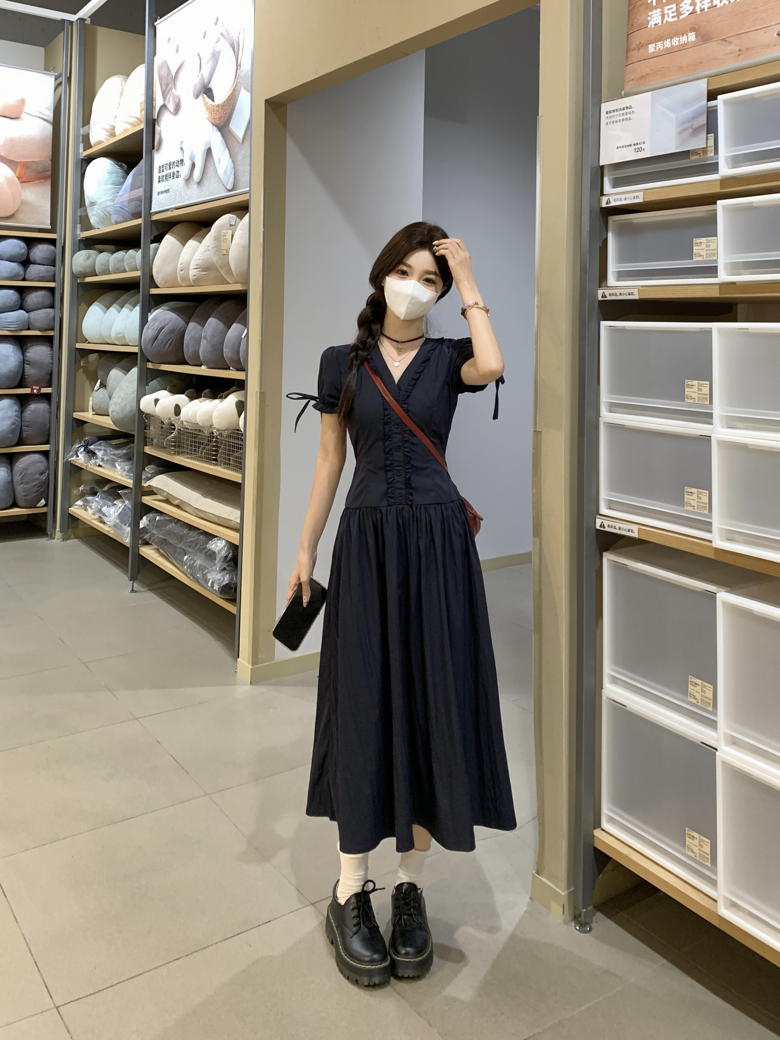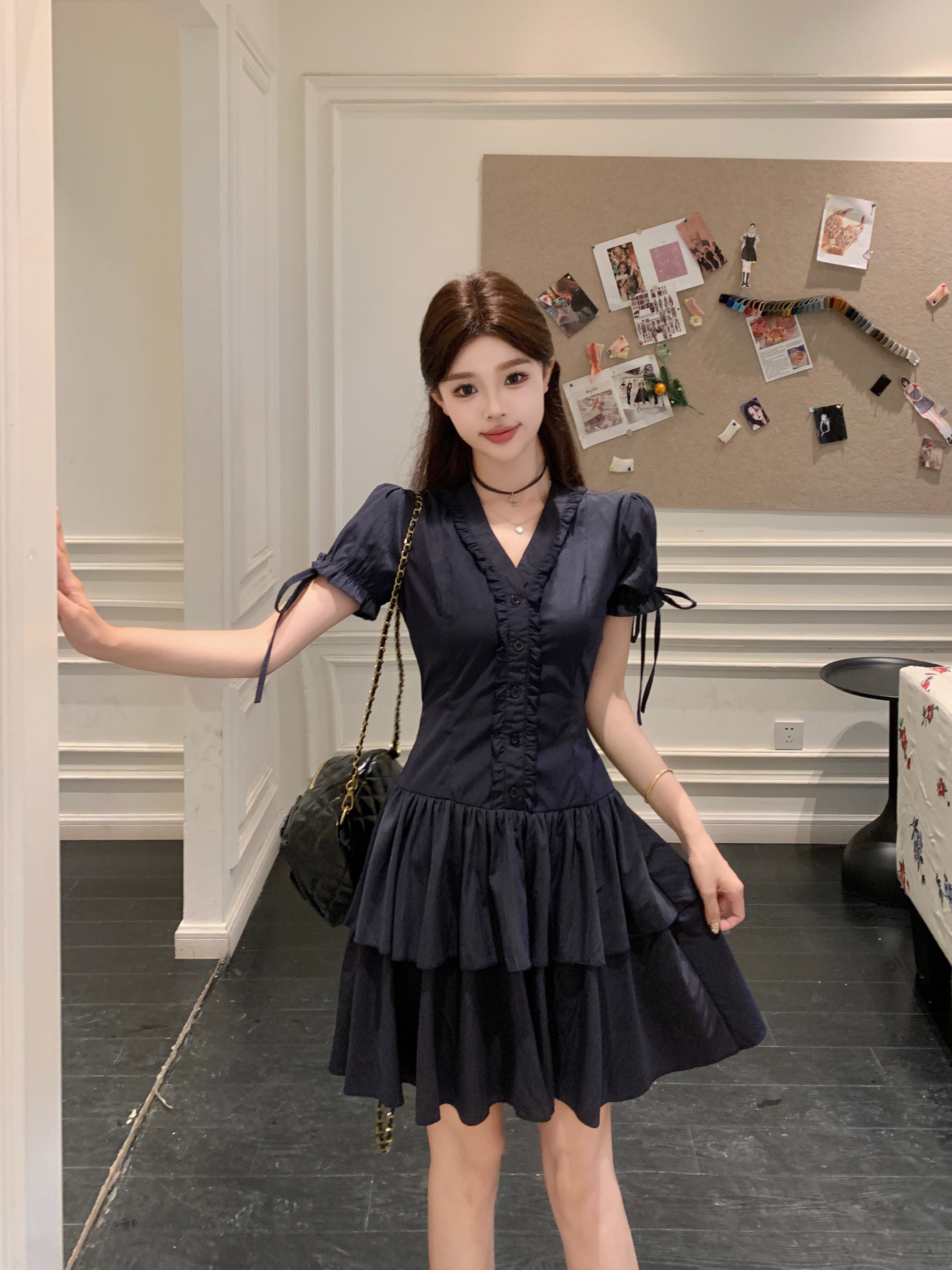 RY2297# 大码夜海辰砂蕾丝花边v领中古短袖连衣裙A字裙显瘦气质高腰裙子女