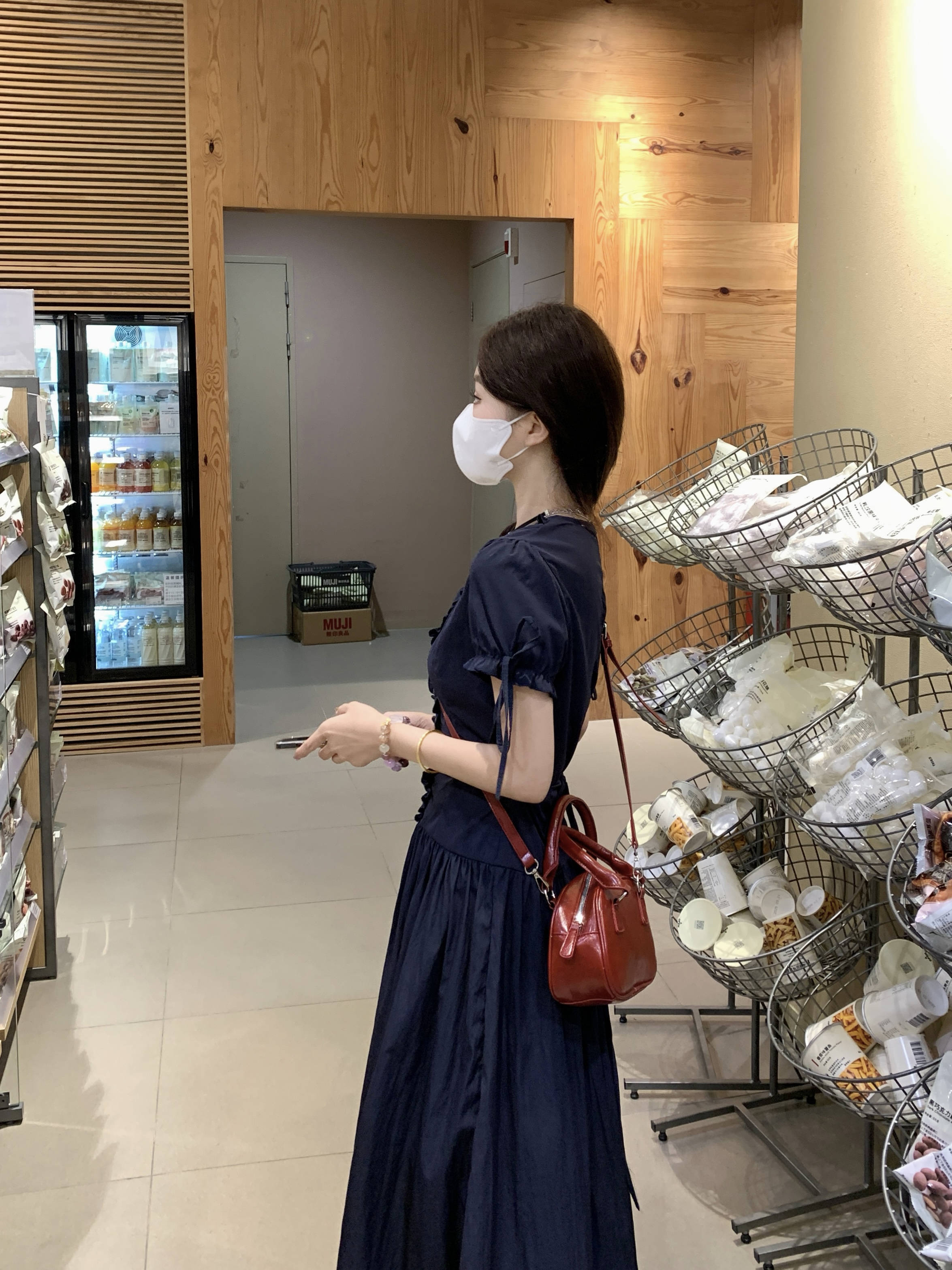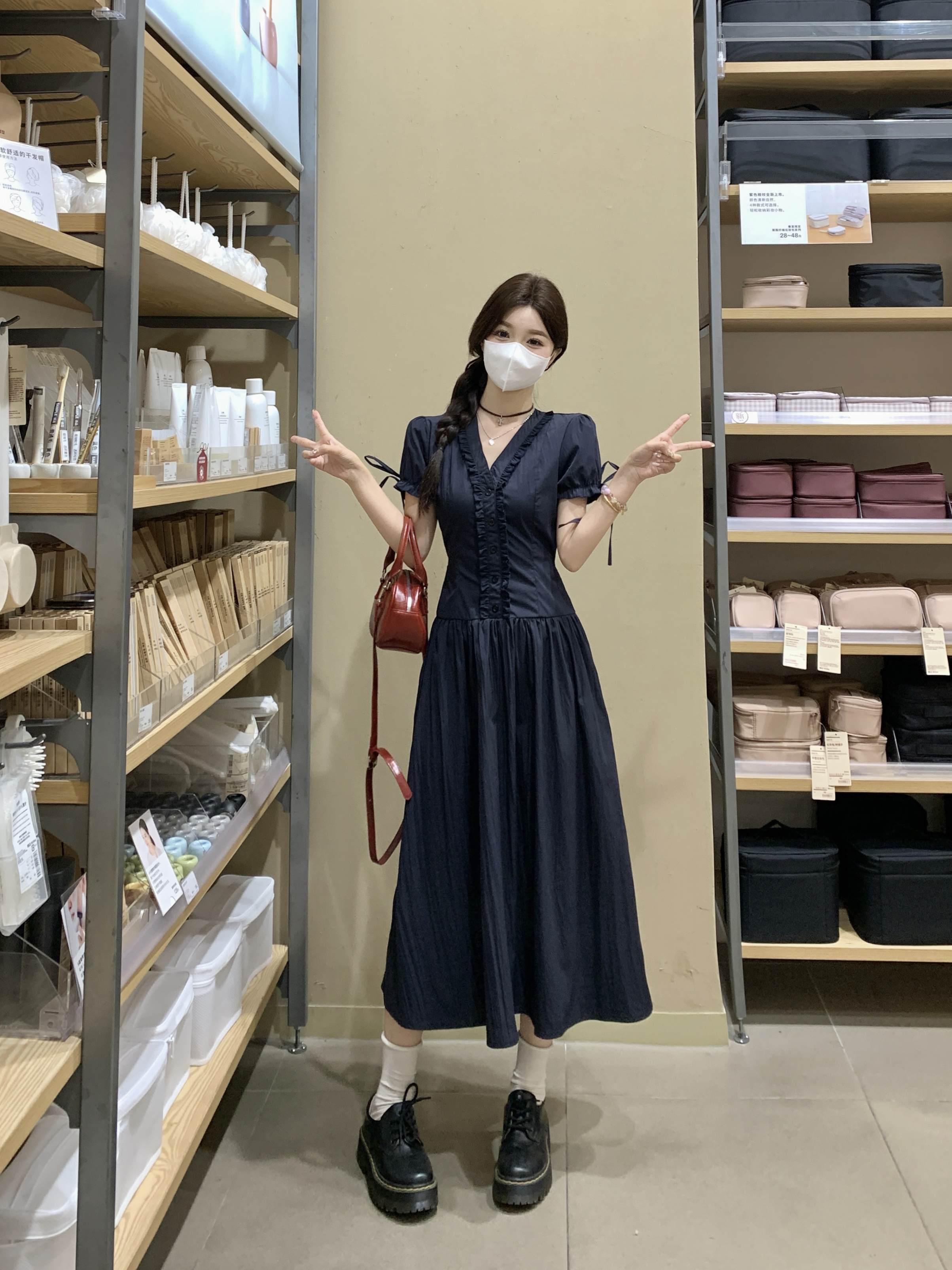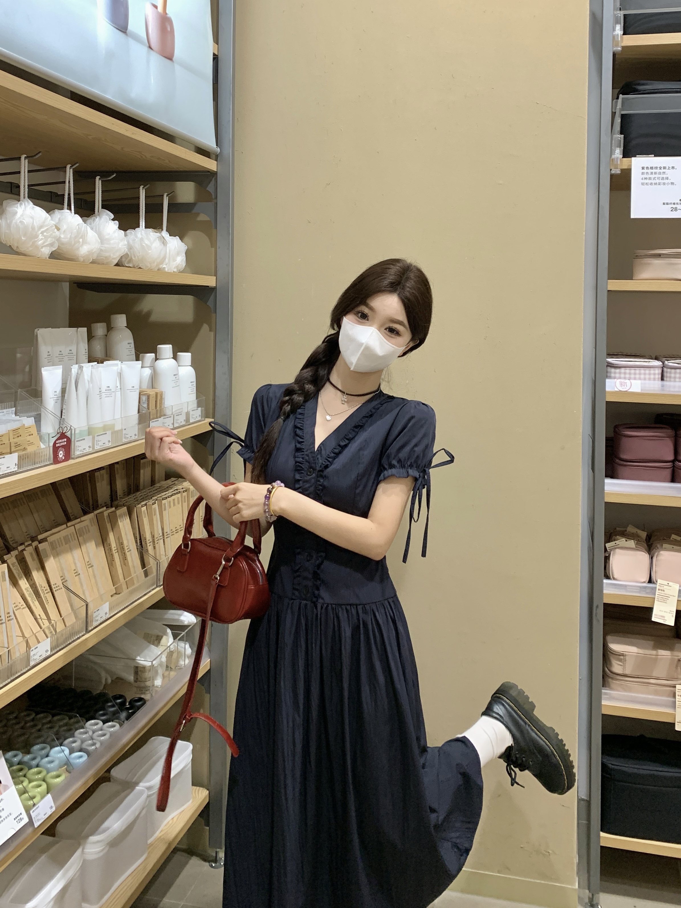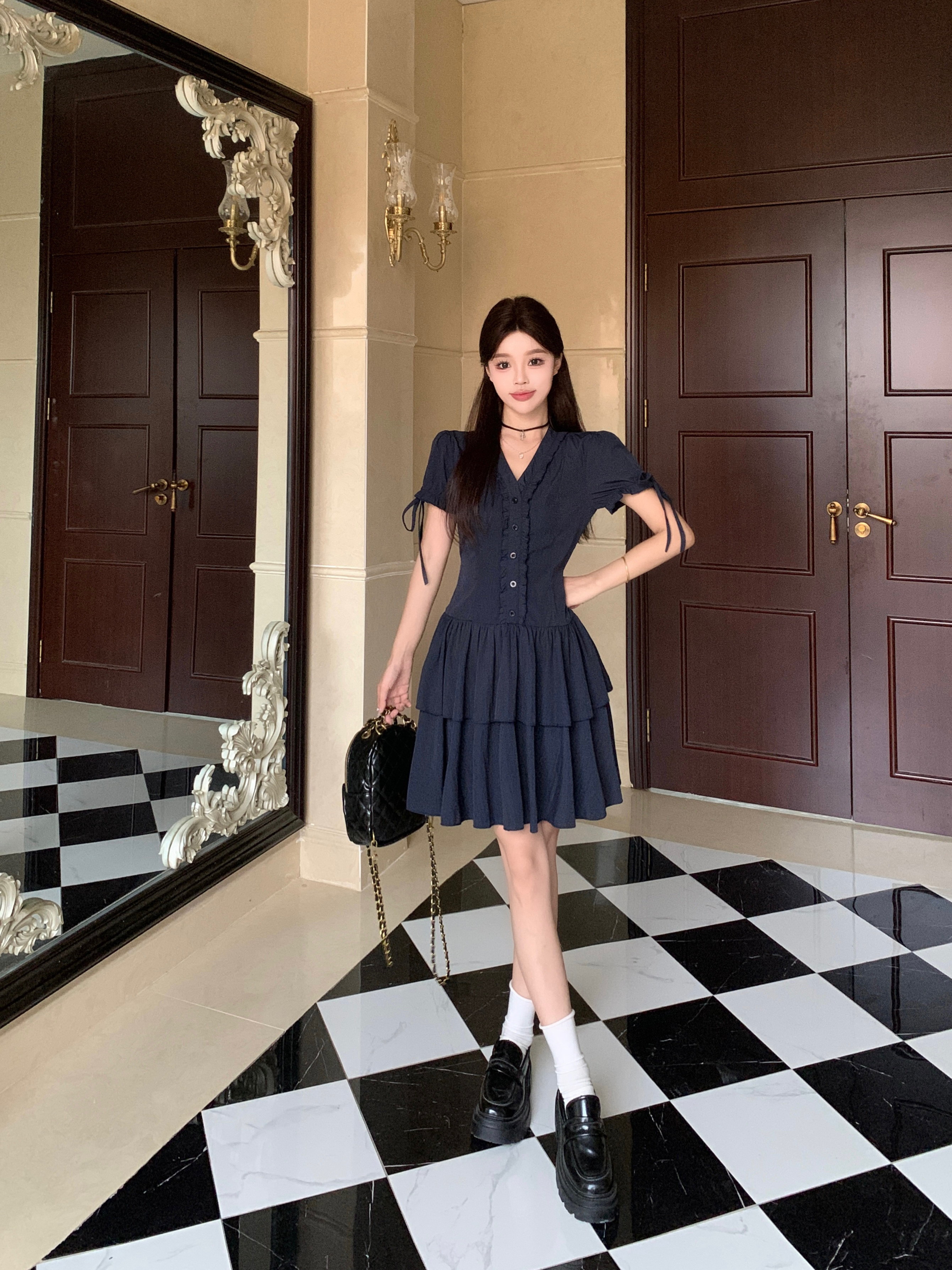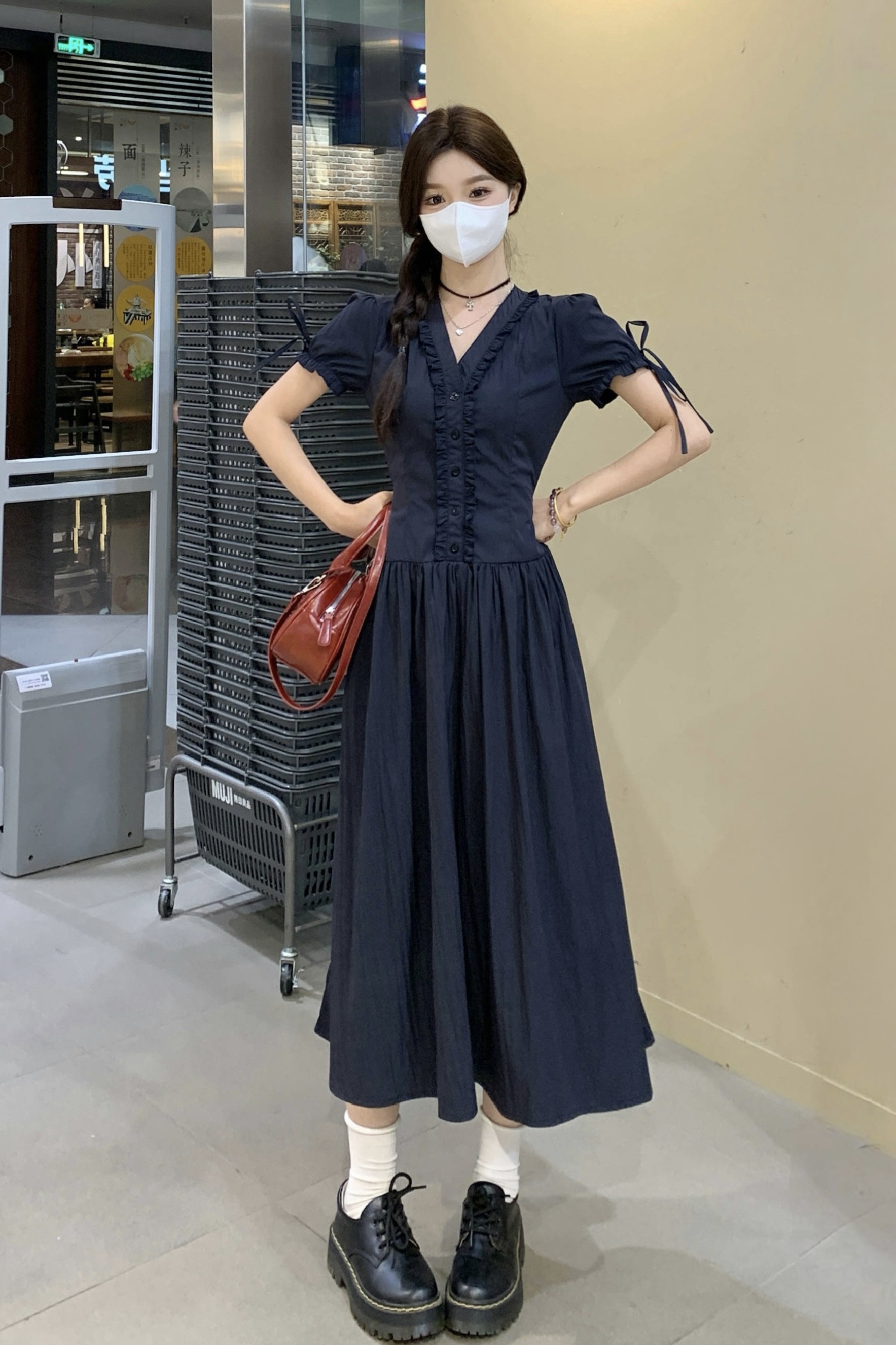 RY2297# 大码夜海辰砂蕾丝花边v领中古短袖连衣裙A字裙显瘦气质高腰裙子女