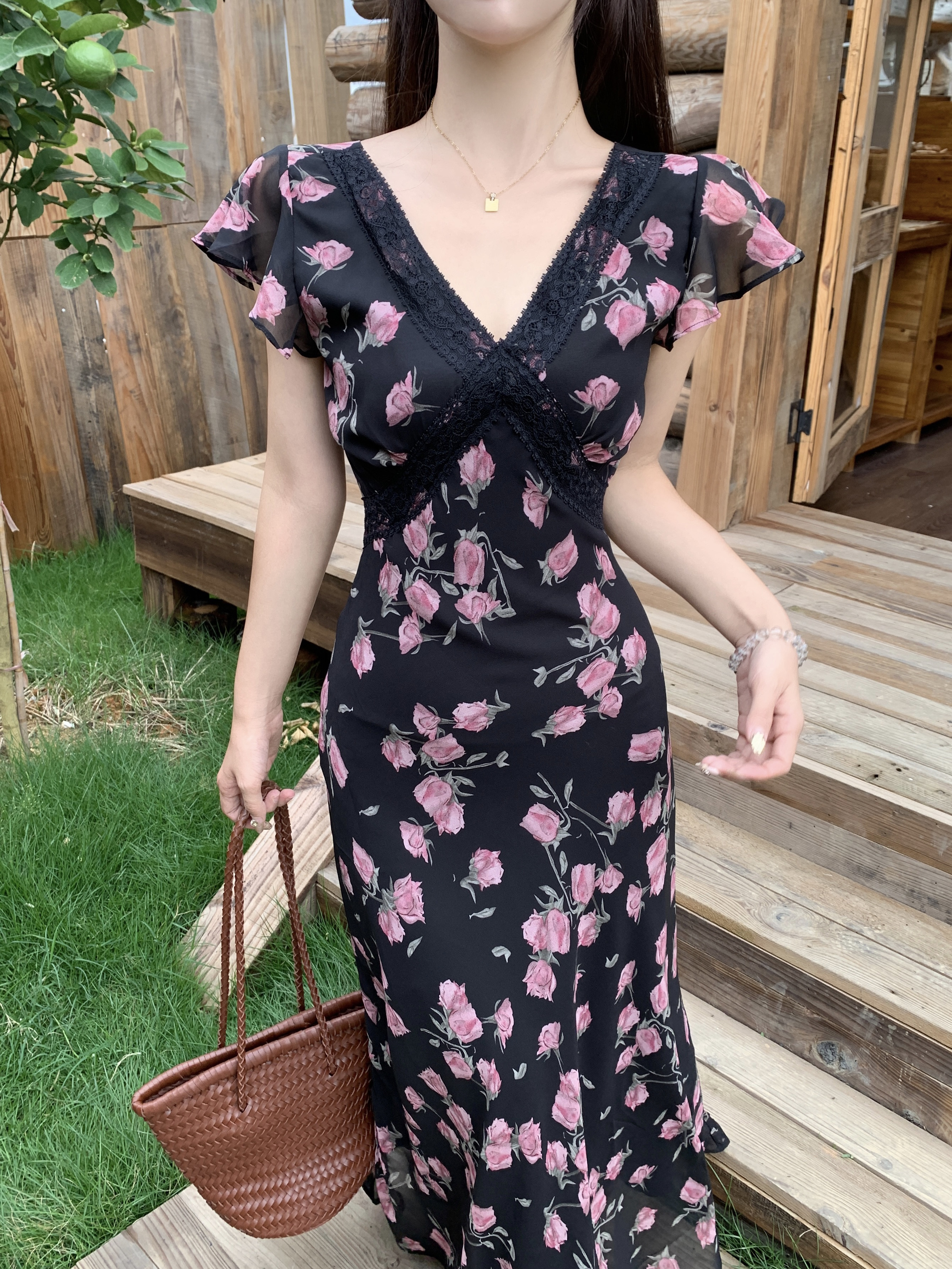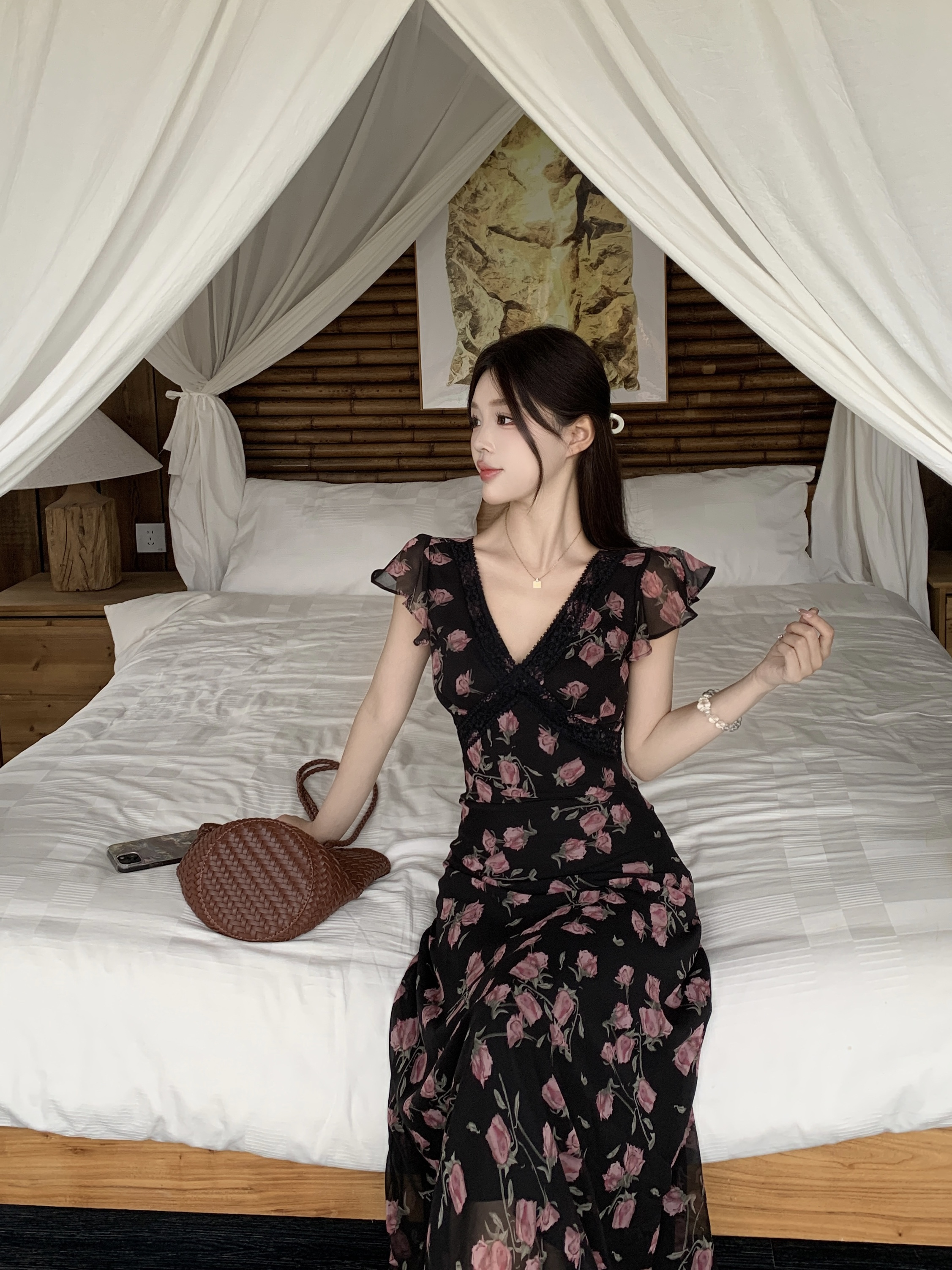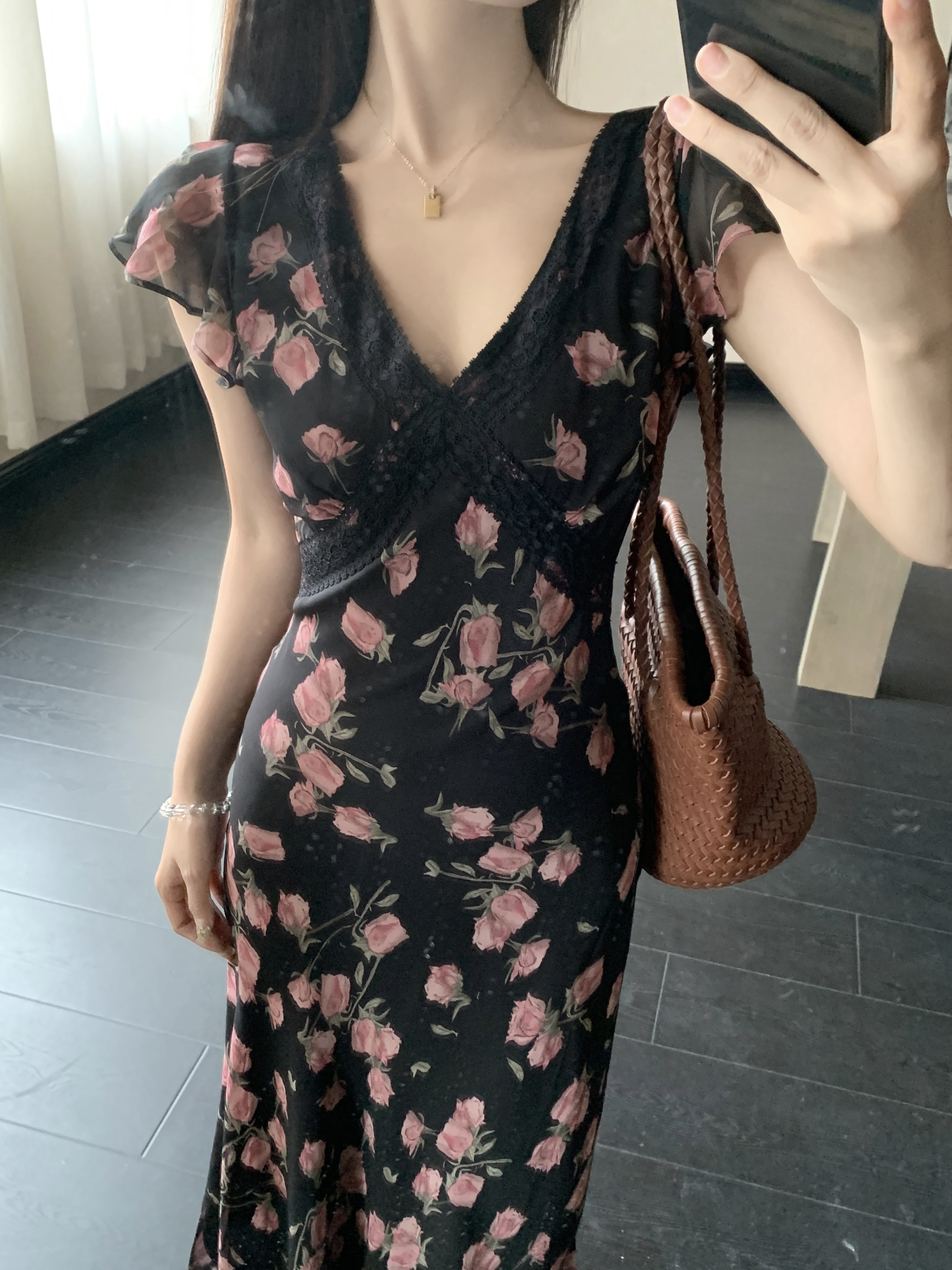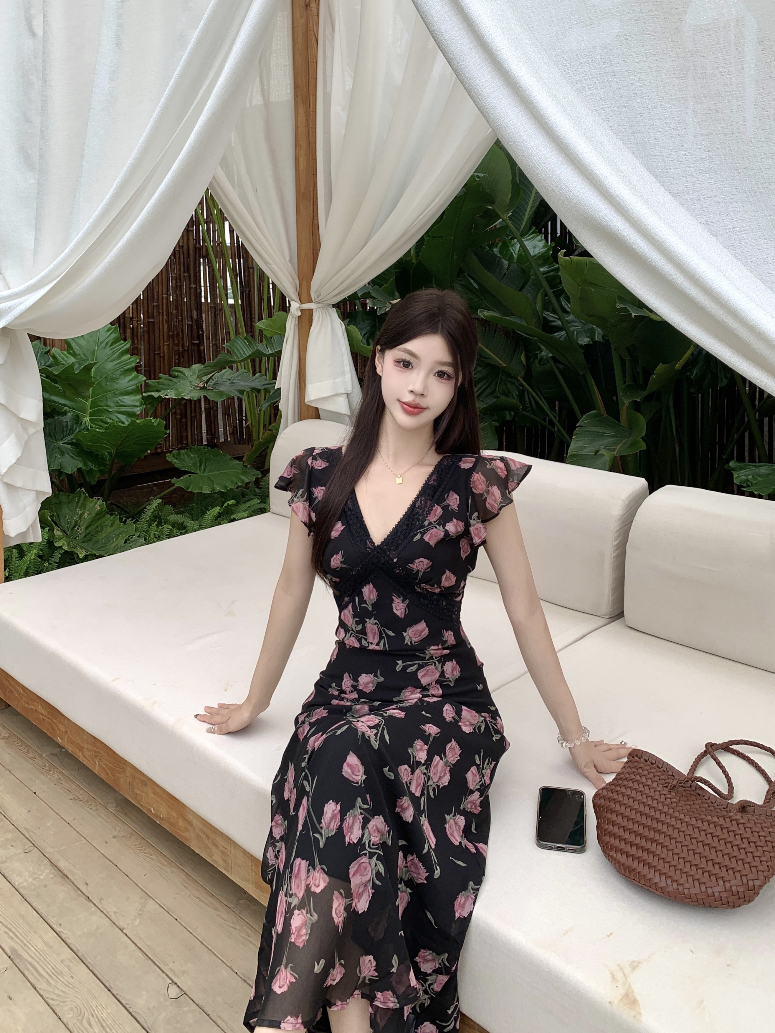 RY2300# 大码V领小飞袖碎花连衣裙女2026夏季法式绝美气质收腰黑色长裙女