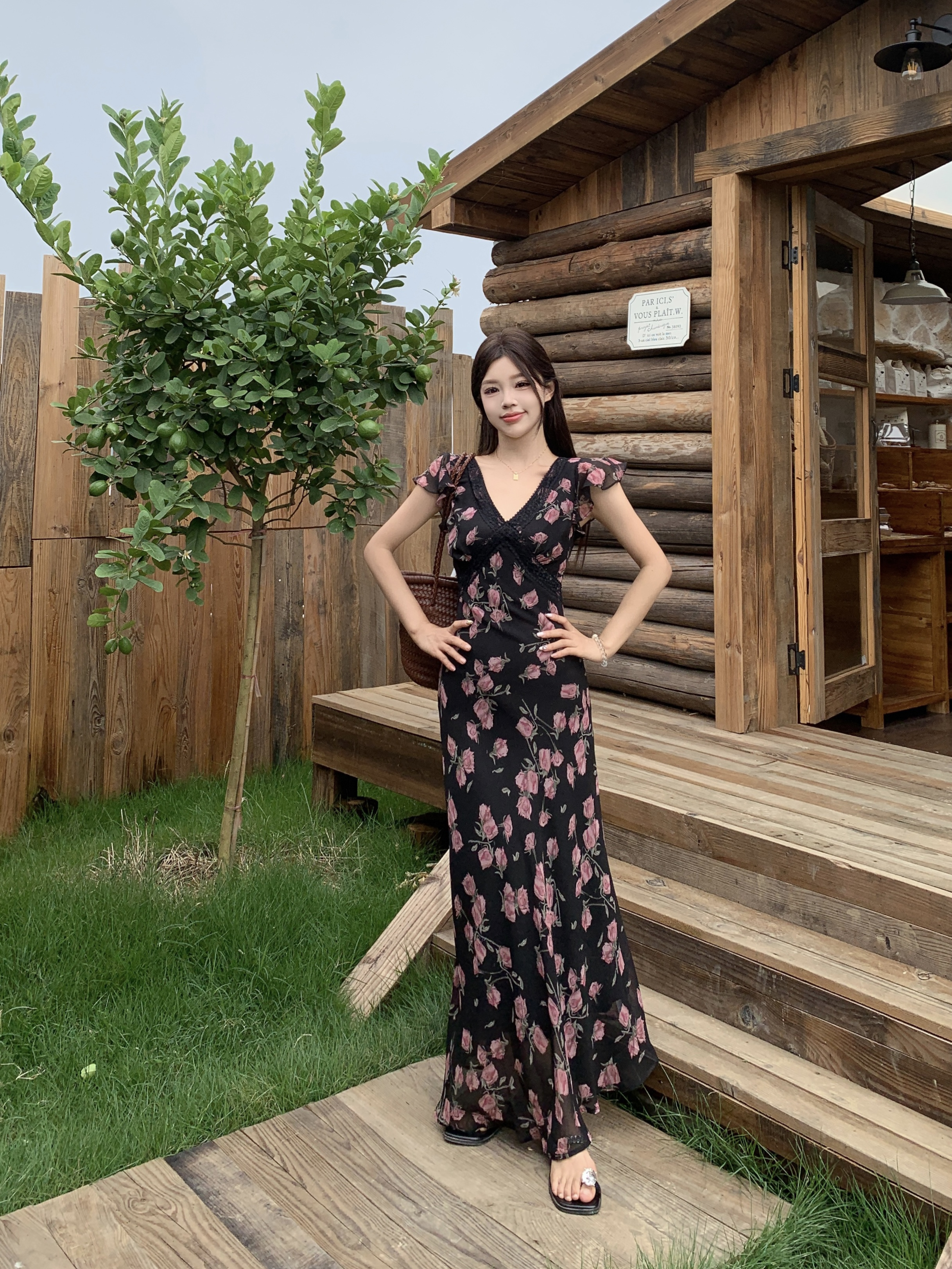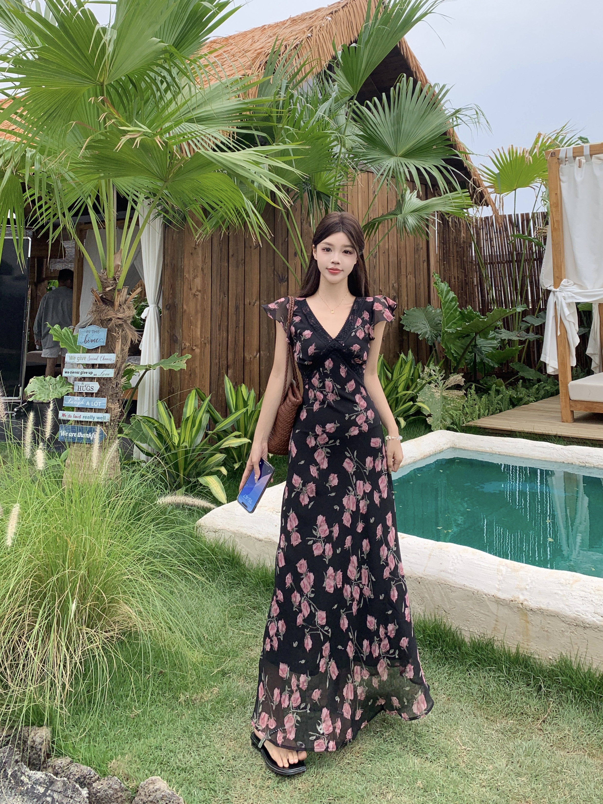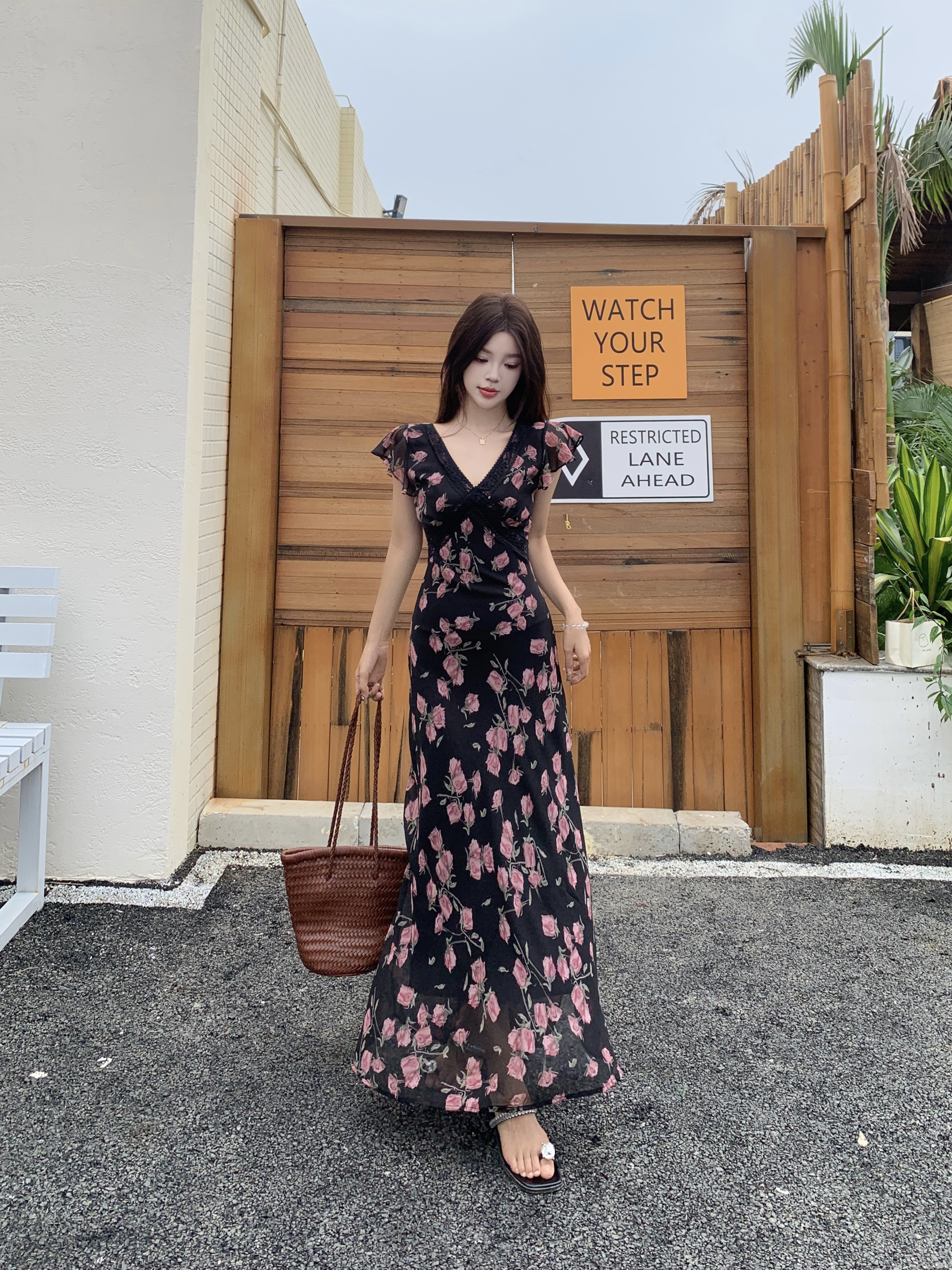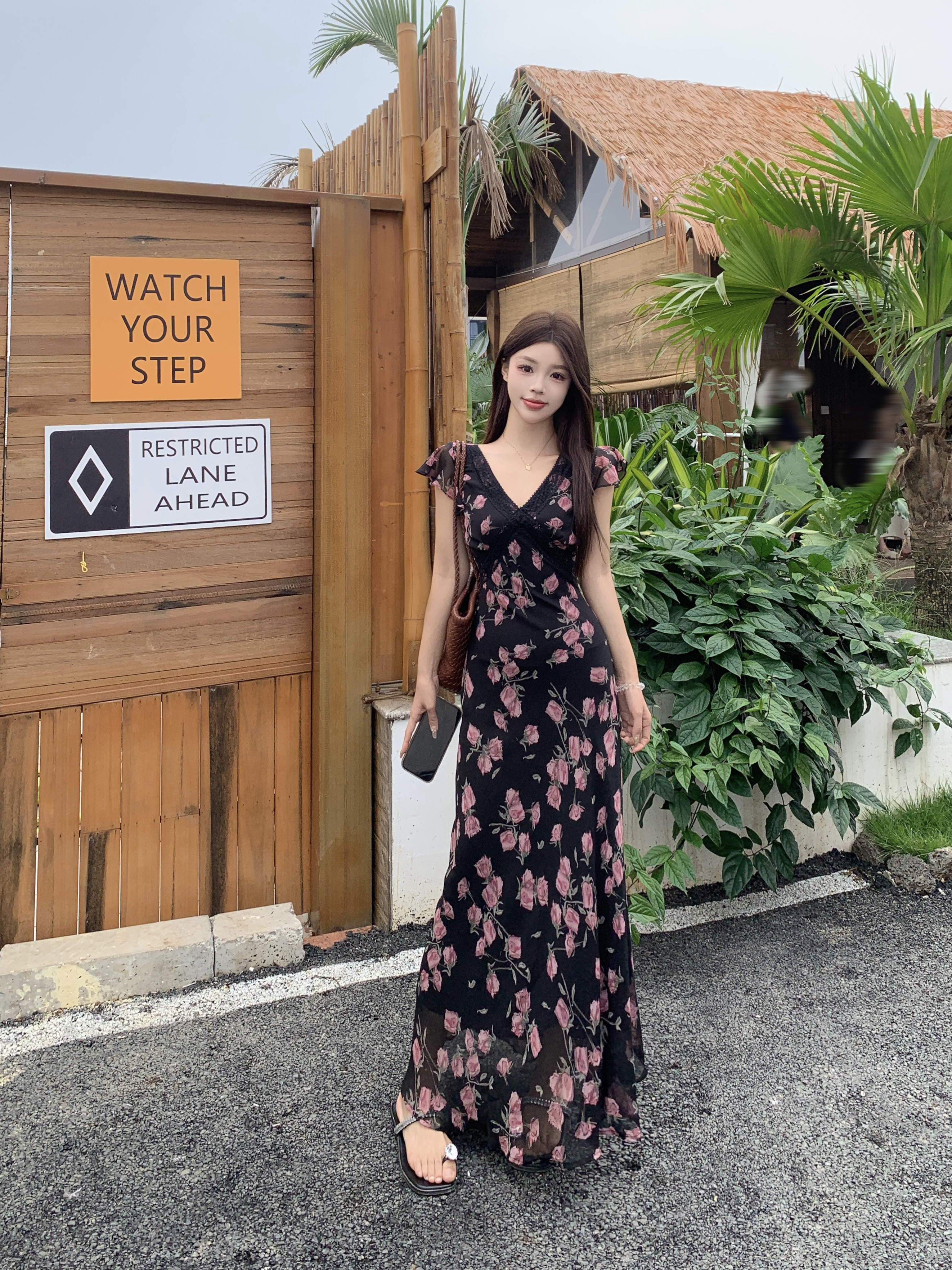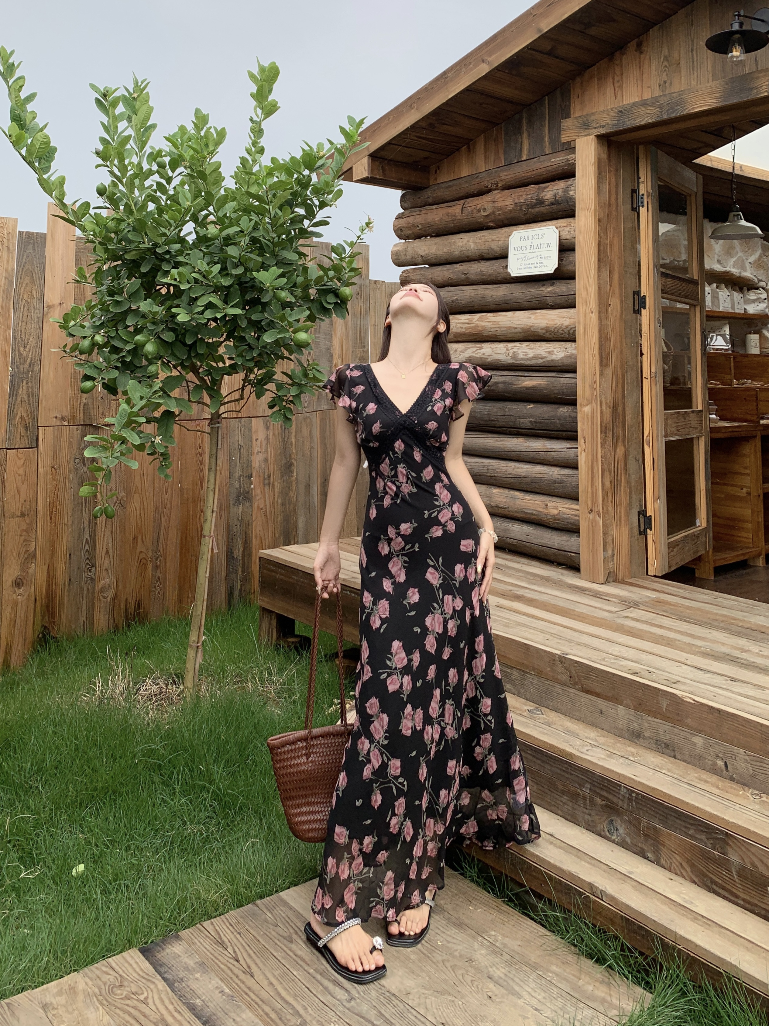 RY2300# 大码V领小飞袖碎花连衣裙女2026夏季法式绝美气质收腰黑色长裙女