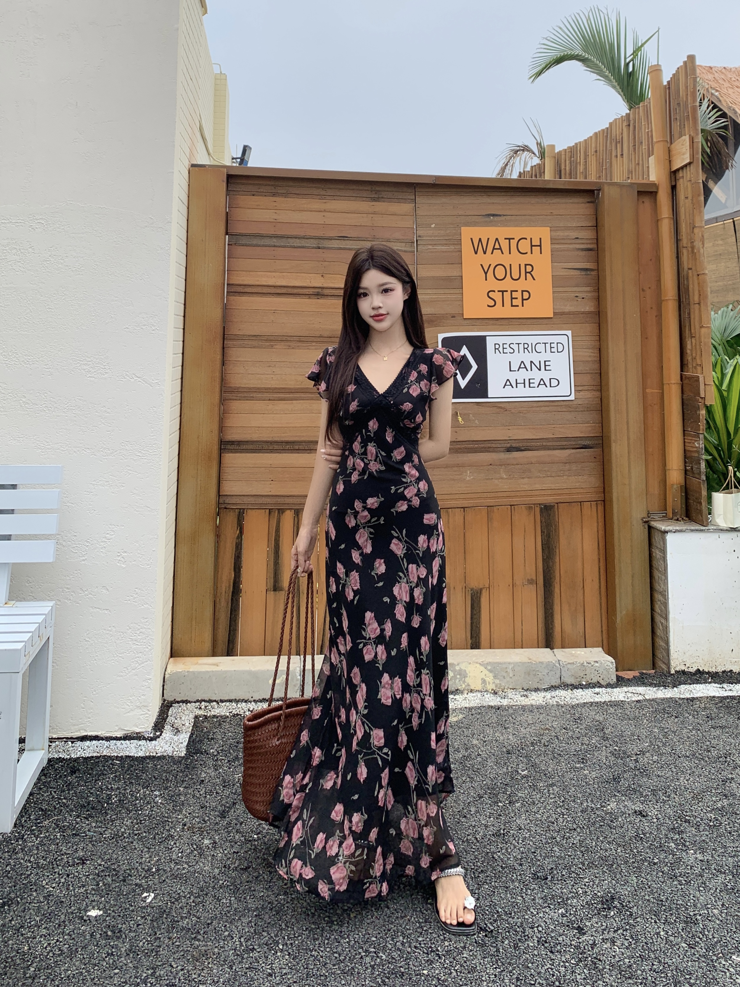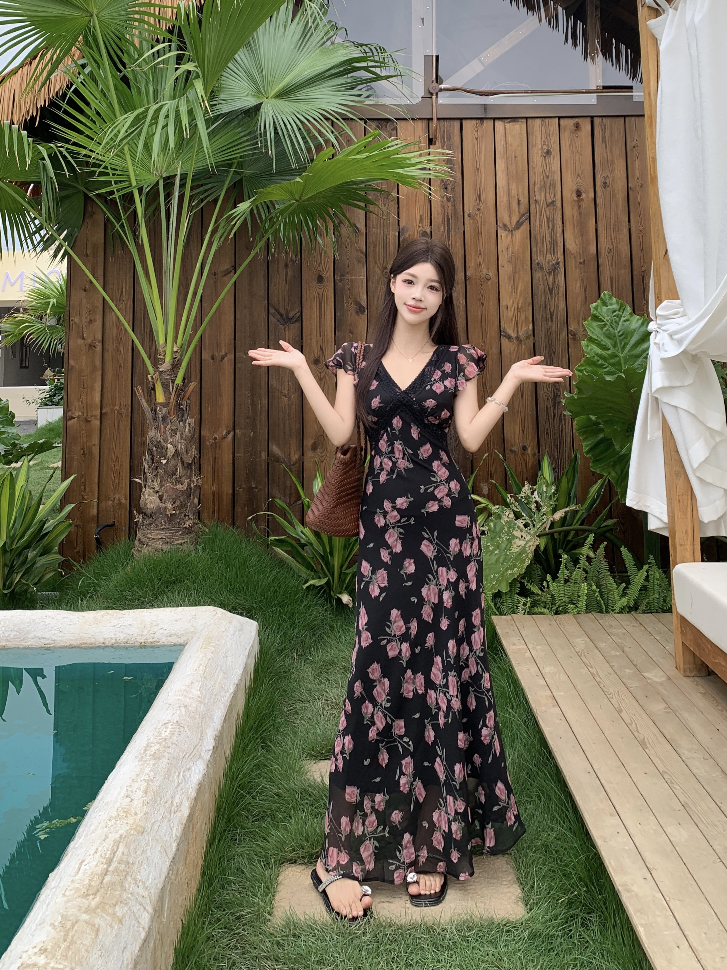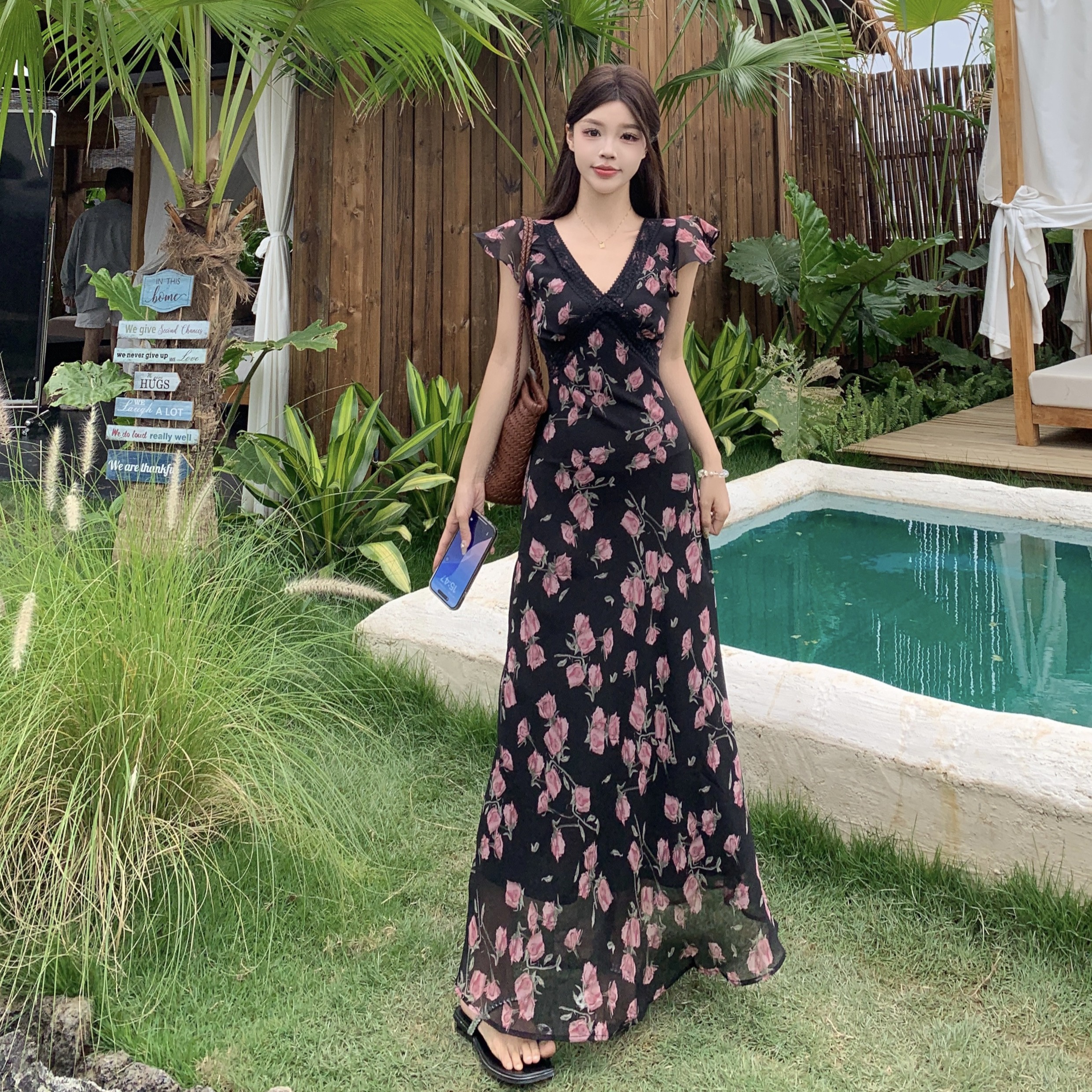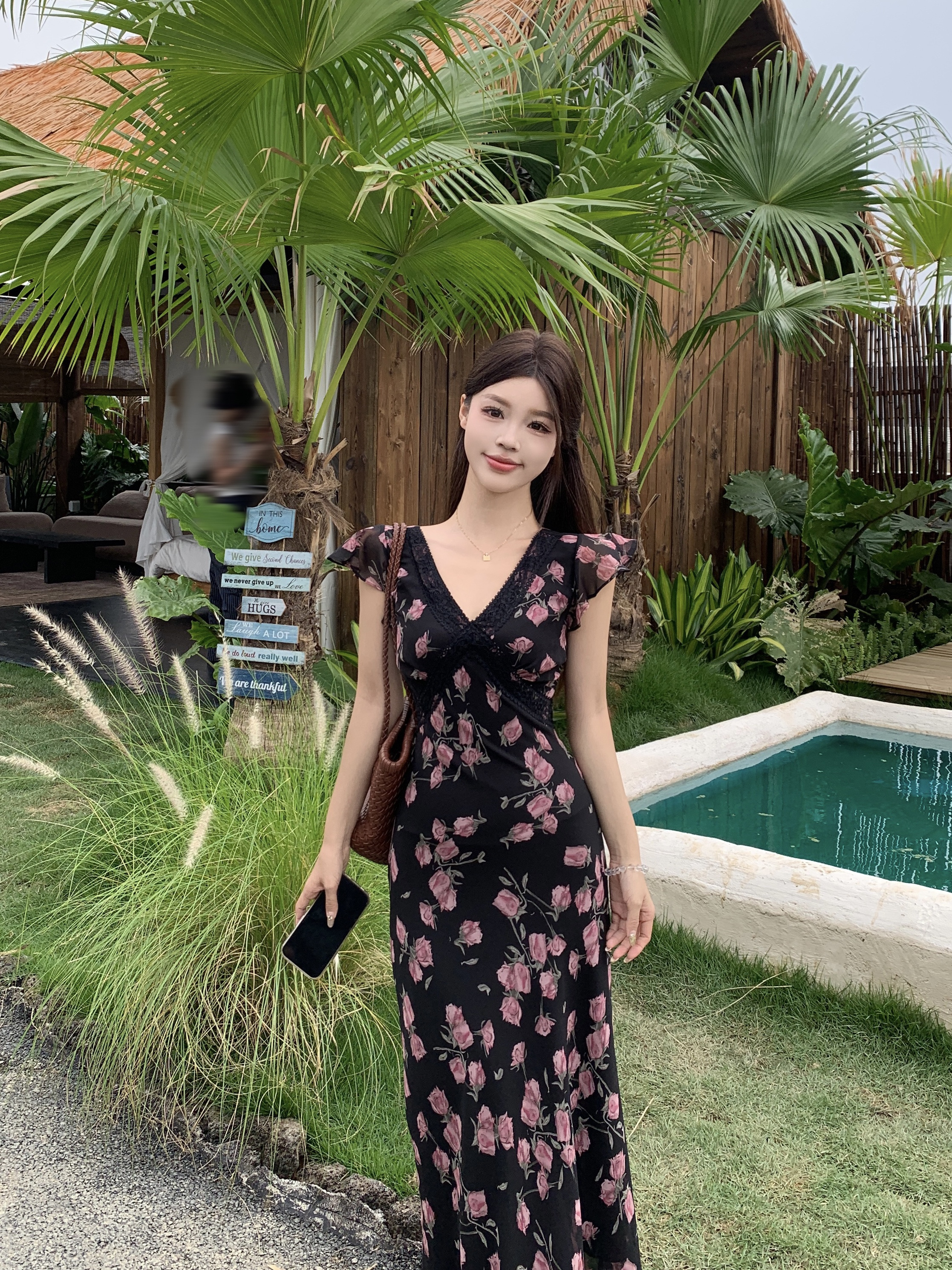 RY2300# 大码V领小飞袖碎花连衣裙女2026夏季法式绝美气质收腰黑色长裙女