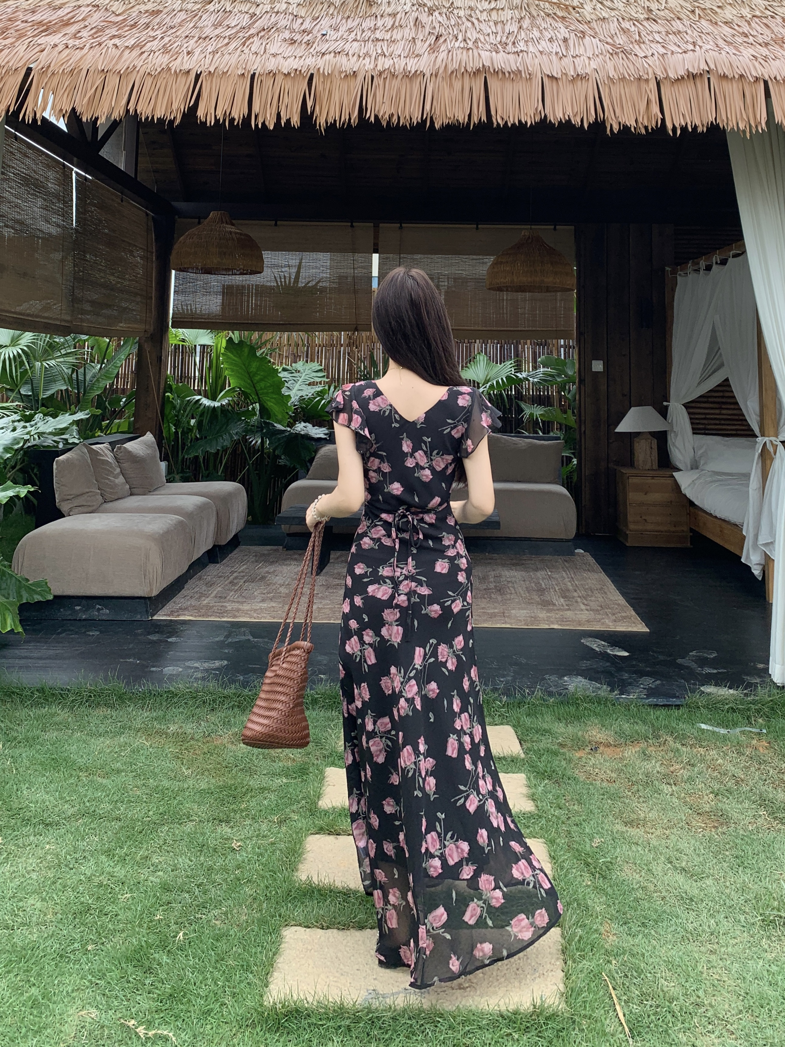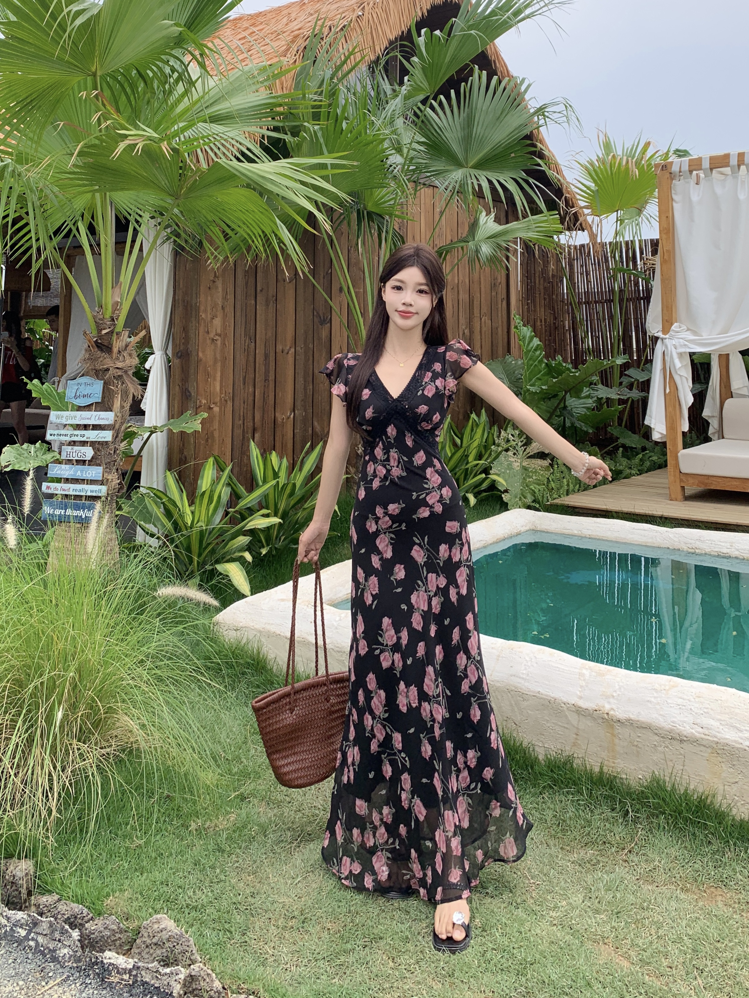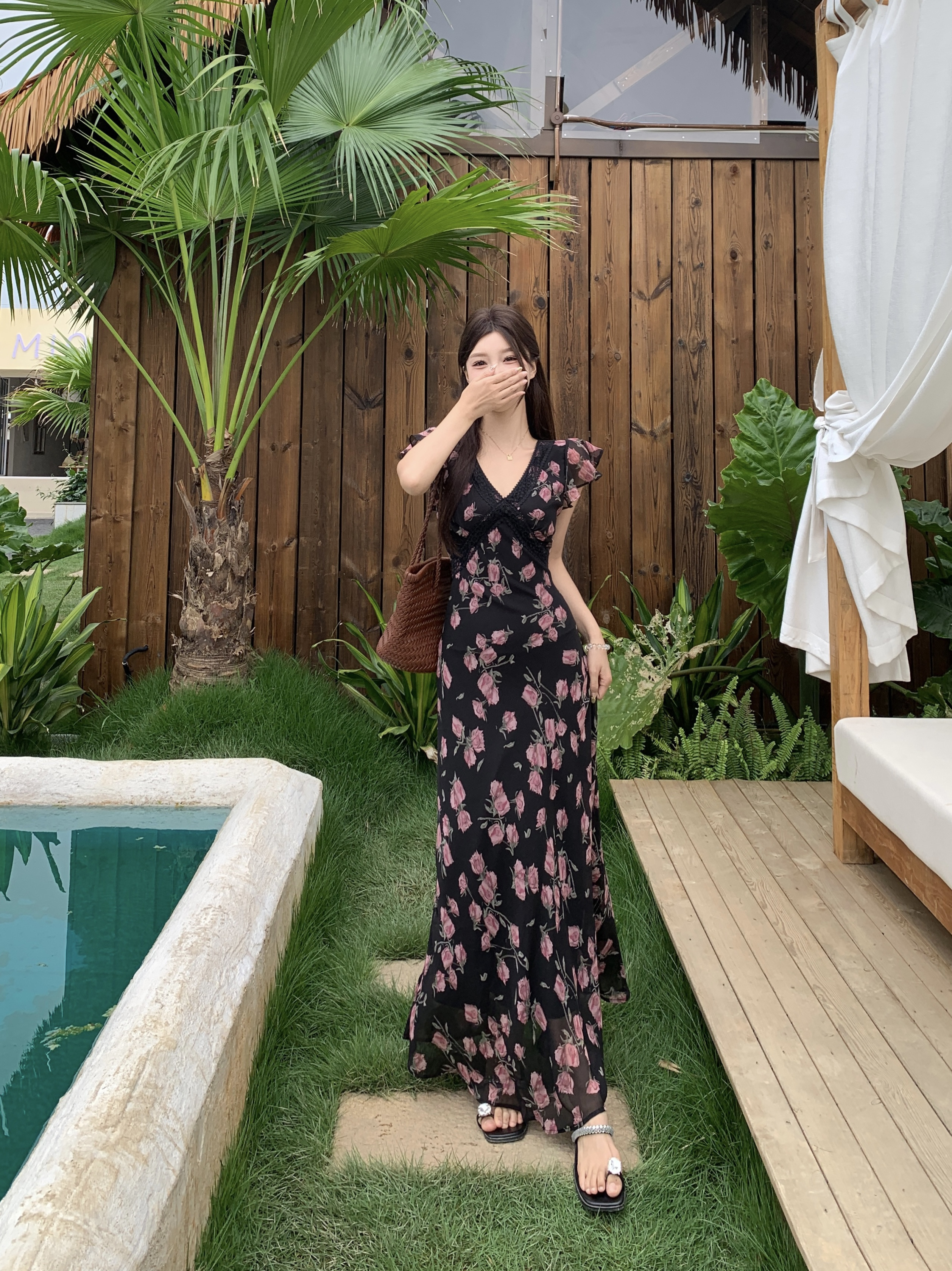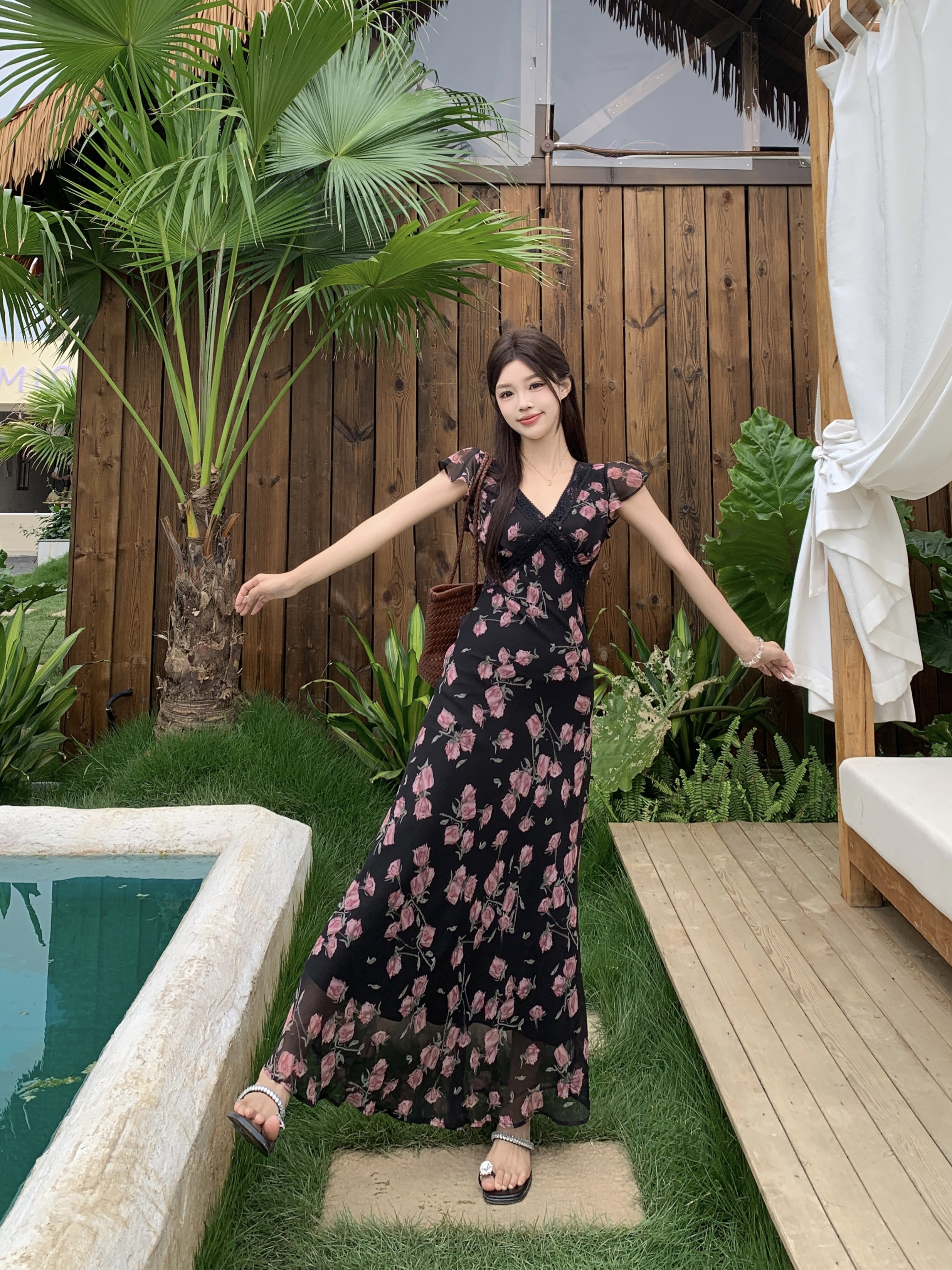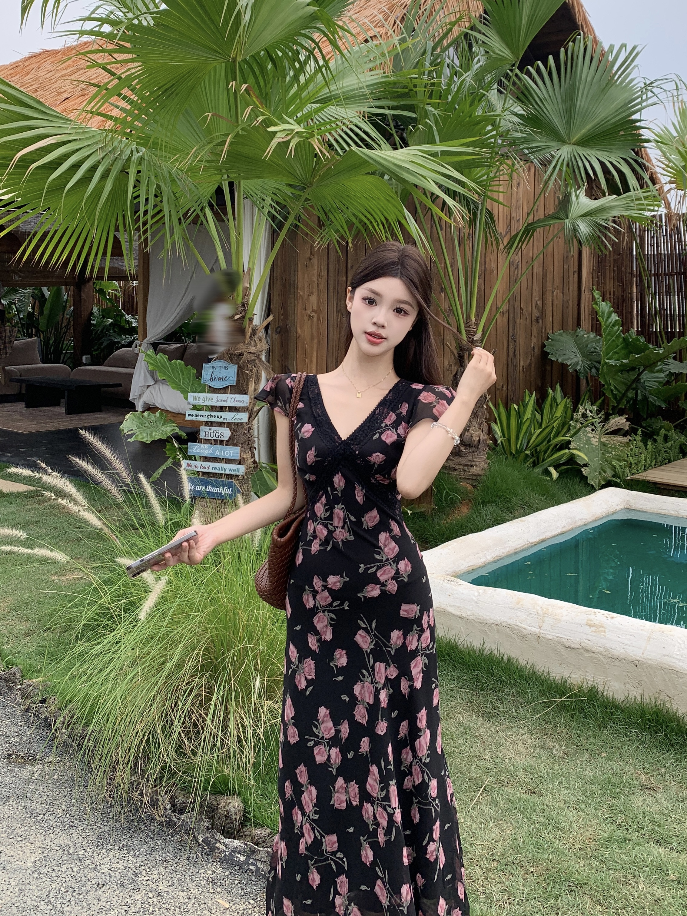 RY2300# 大码V领小飞袖碎花连衣裙女2026夏季法式绝美气质收腰黑色长裙女