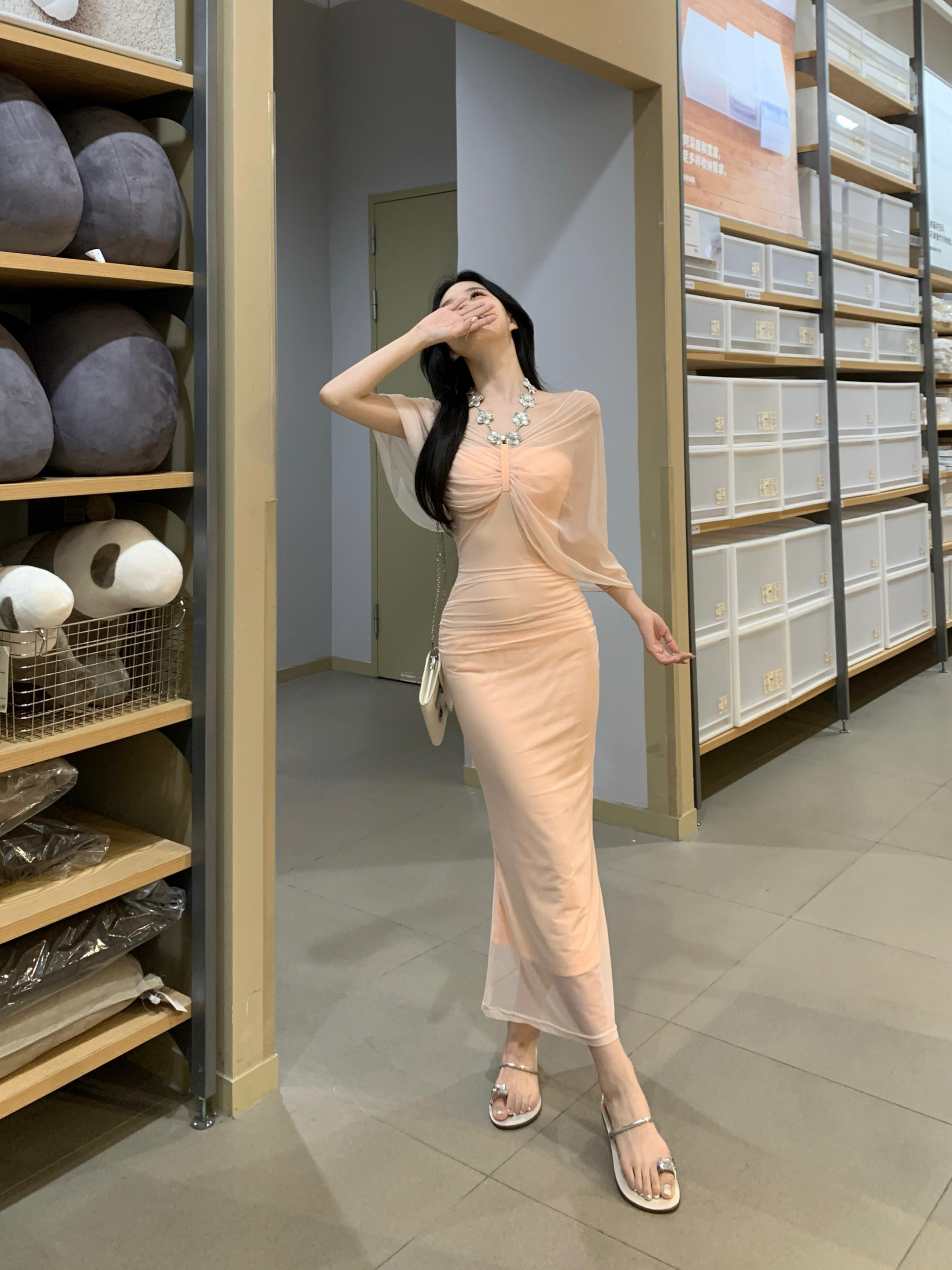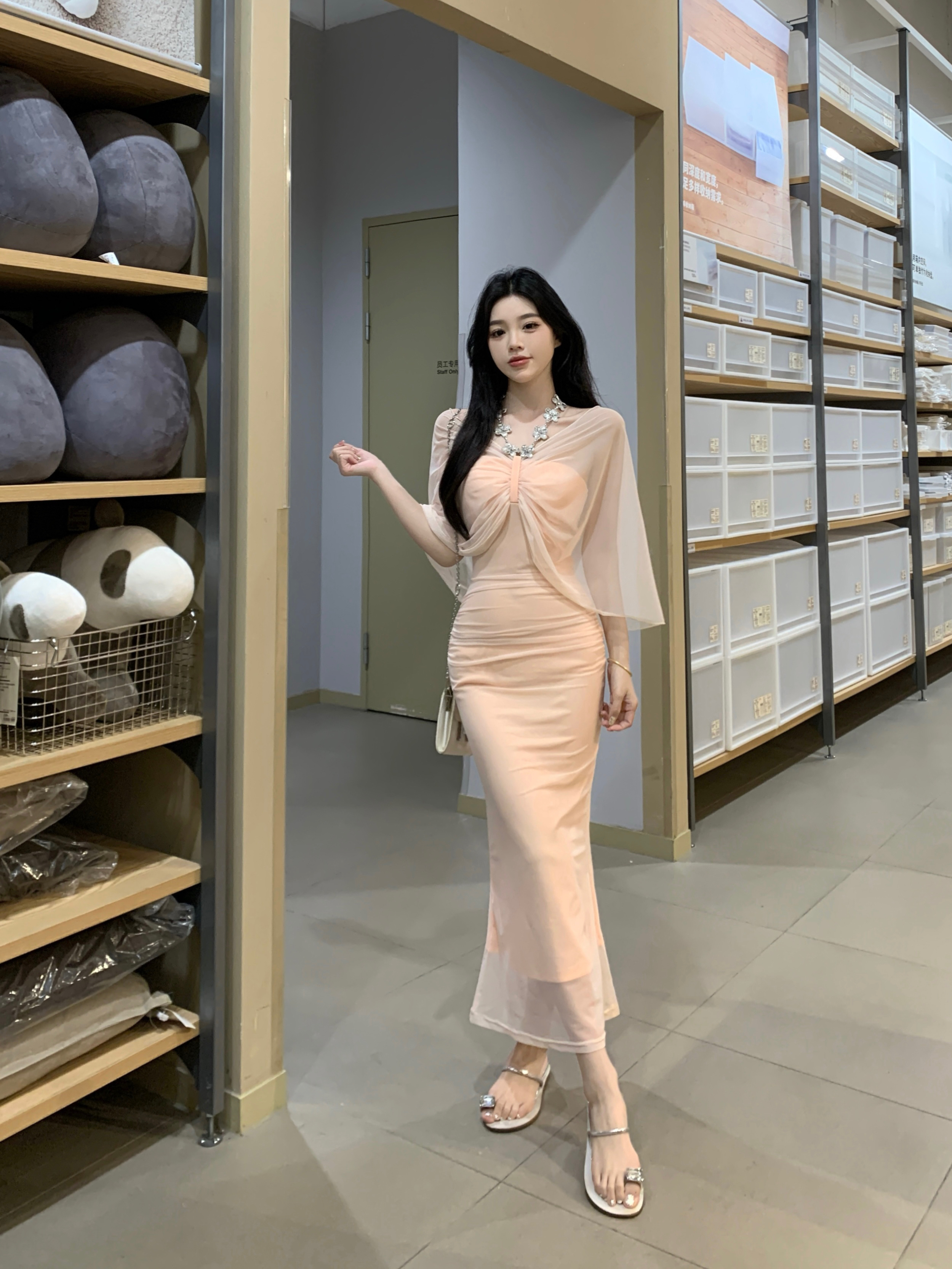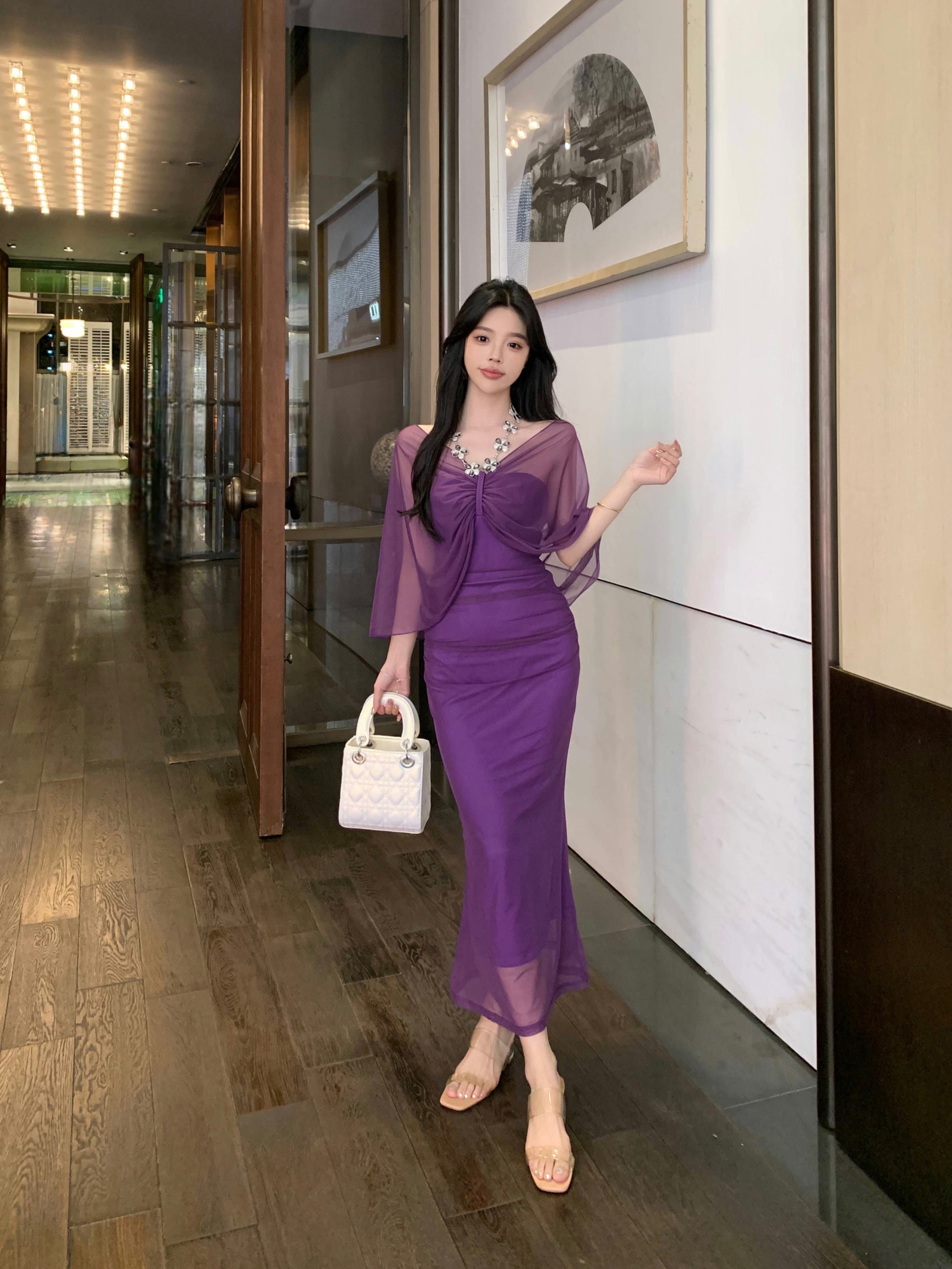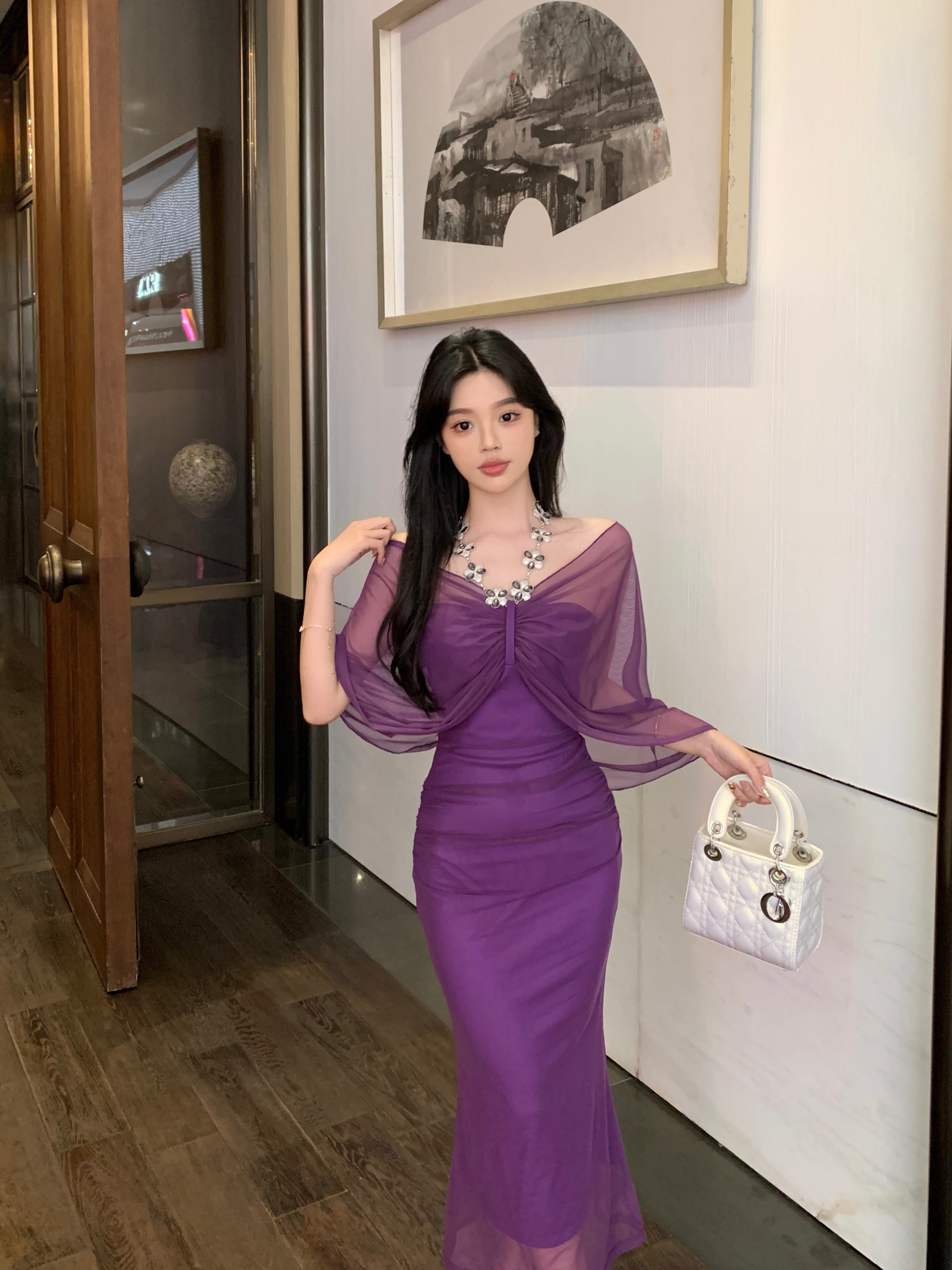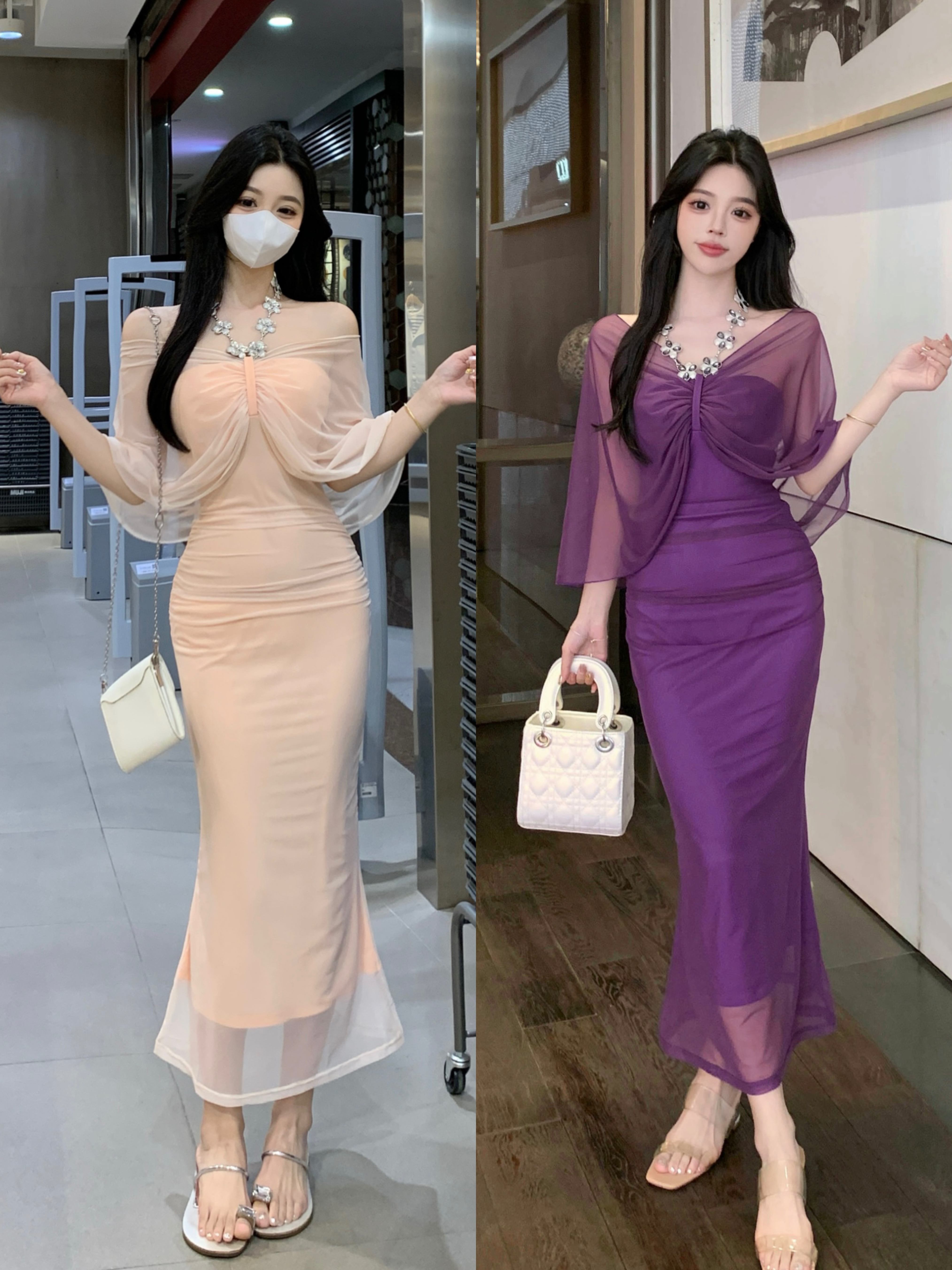 RY2302# 2026夏雾纱之梦贵气钻石纯色韵味高腰包臀连衣裙纯欲鱼尾显瘦裙女