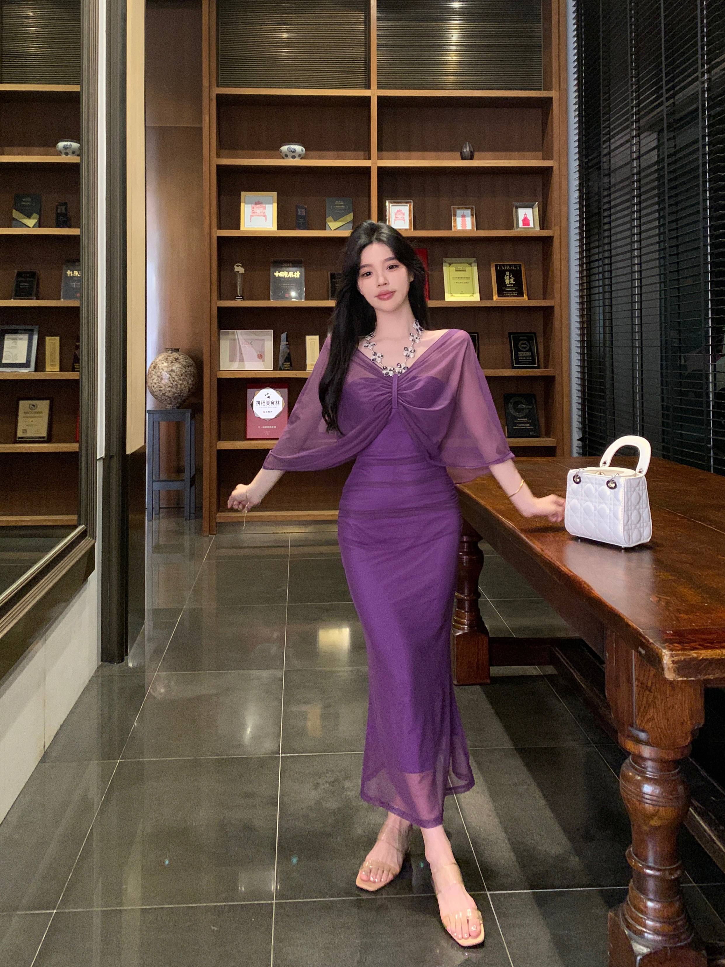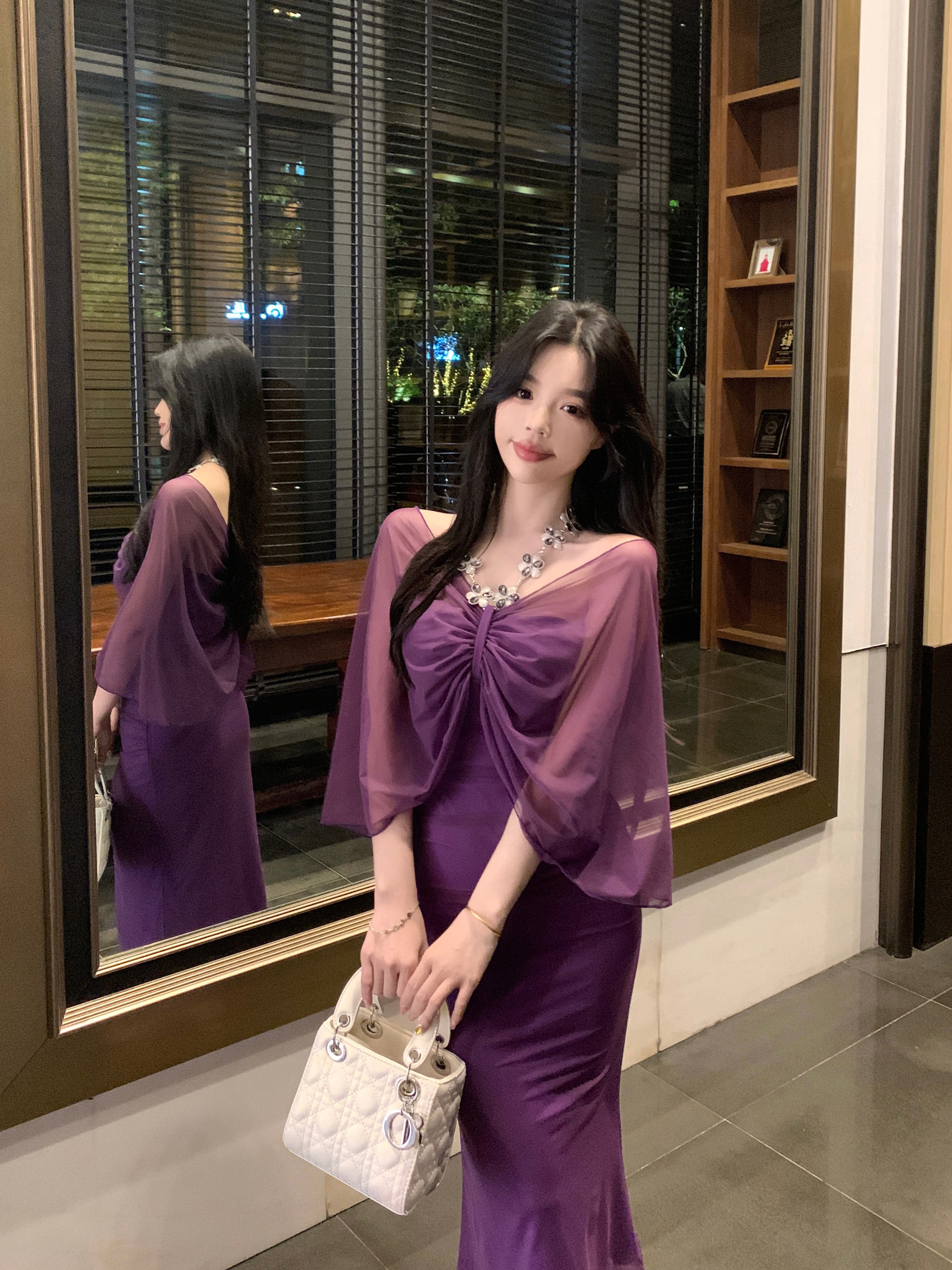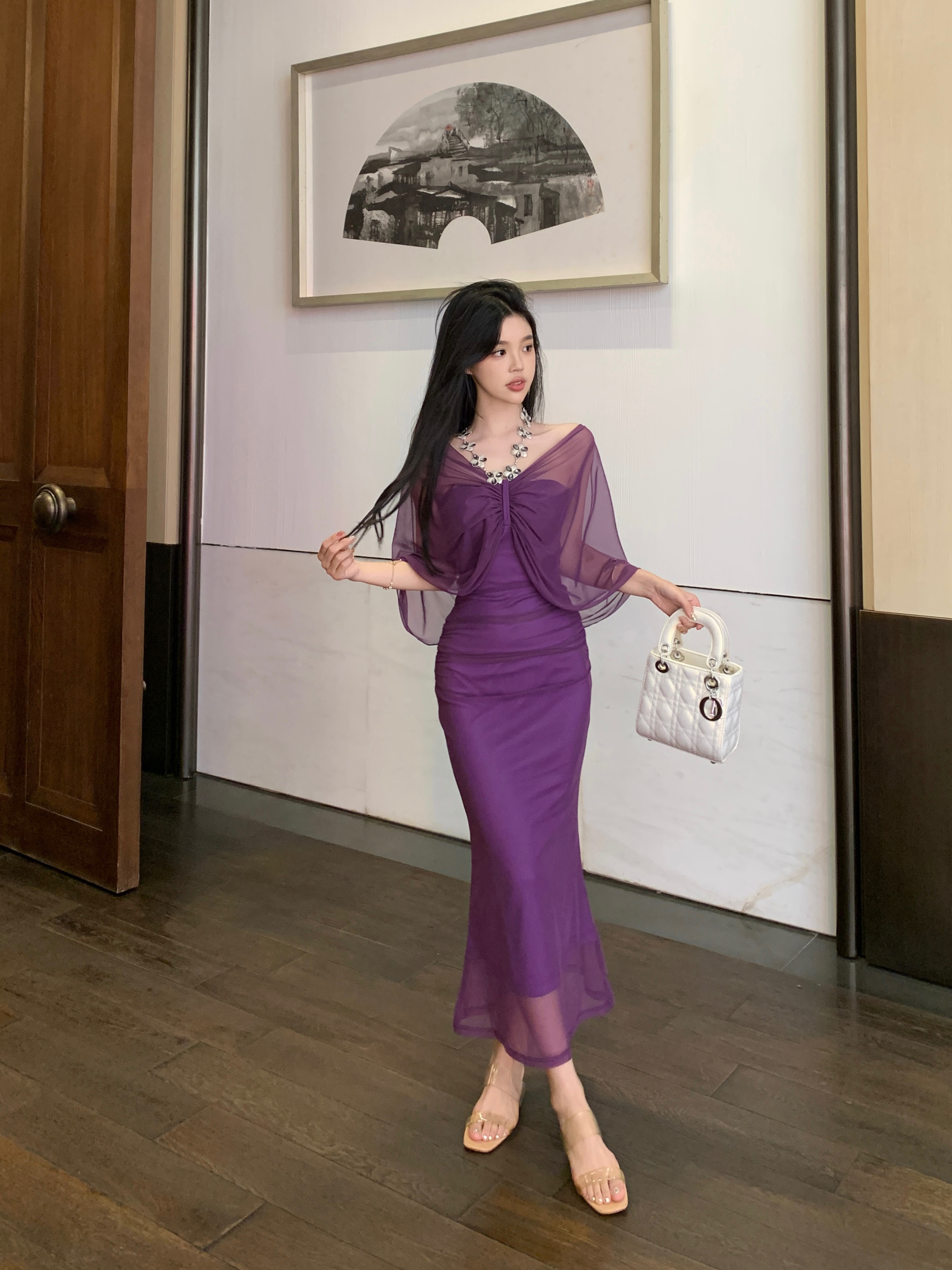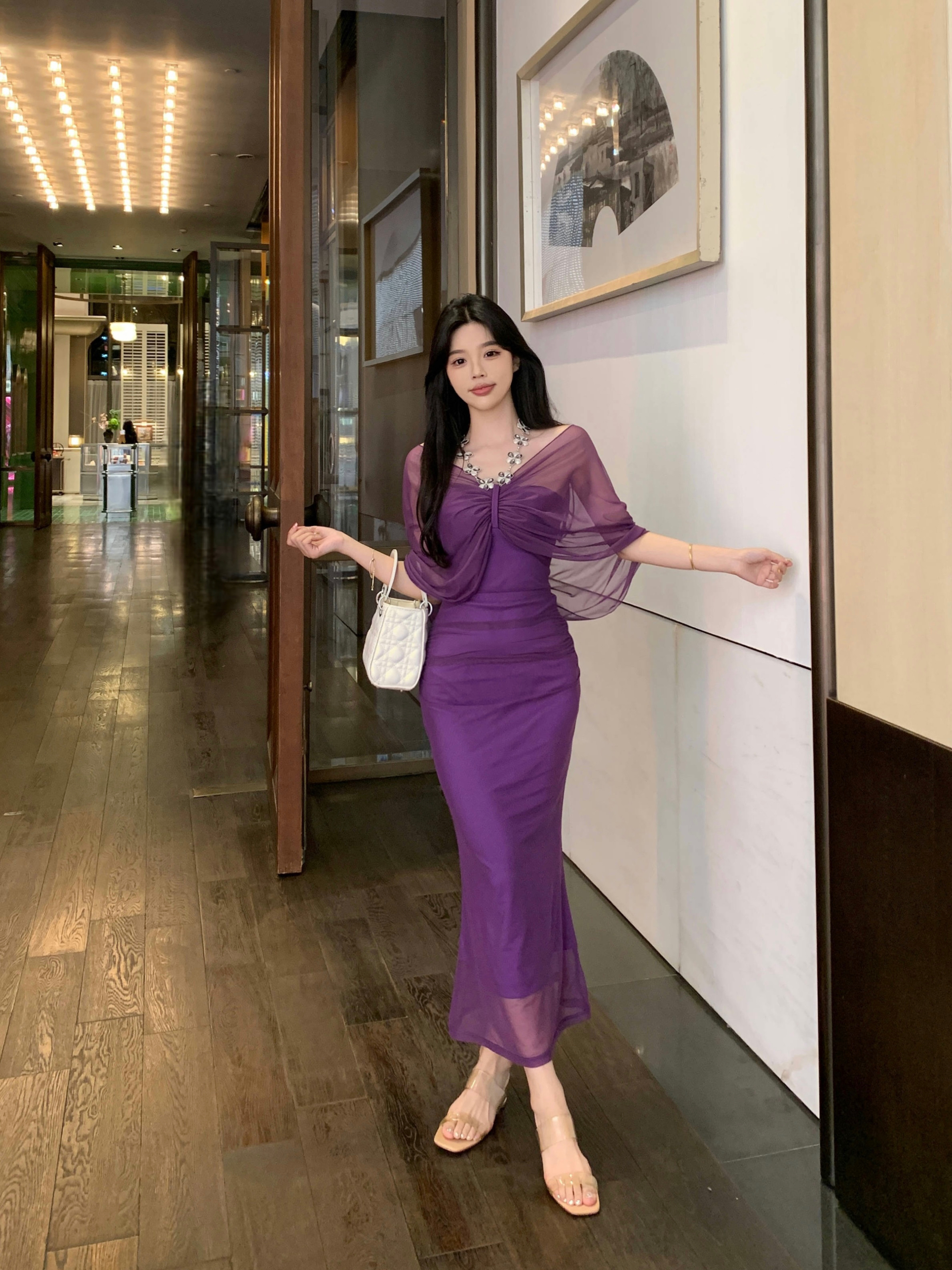 RY2302# 2026夏雾纱之梦贵气钻石纯色韵味高腰包臀连衣裙纯欲鱼尾显瘦裙女