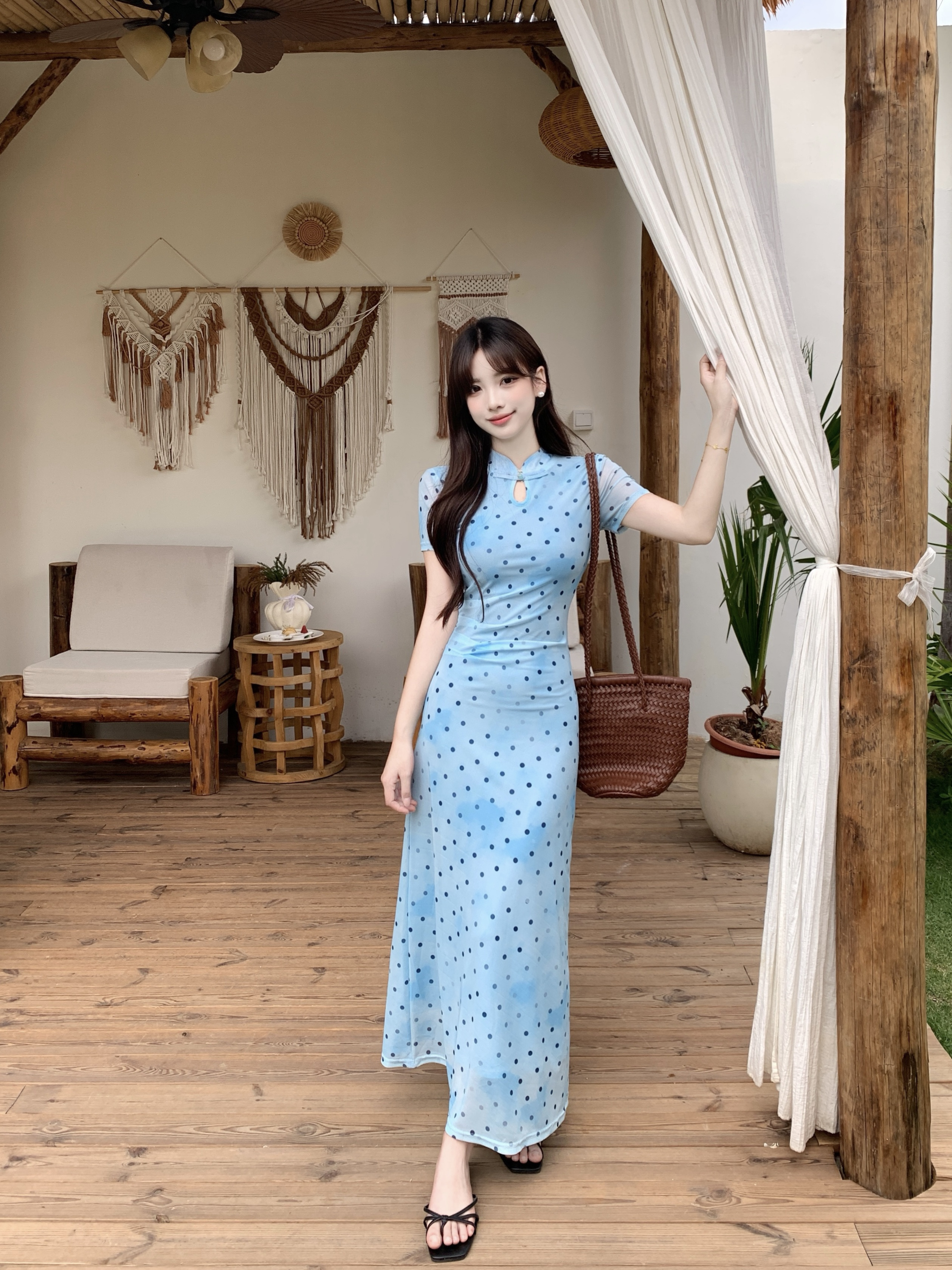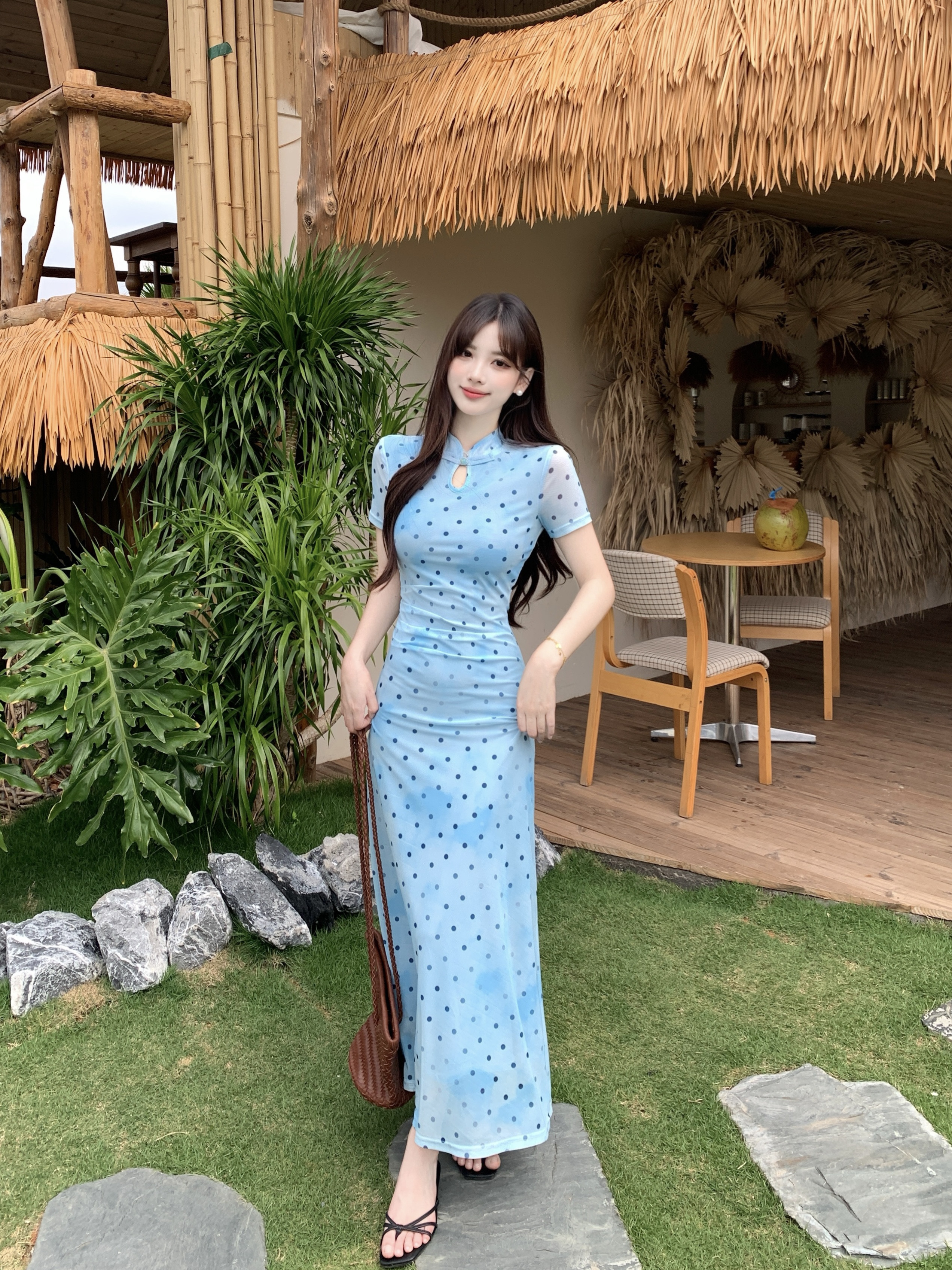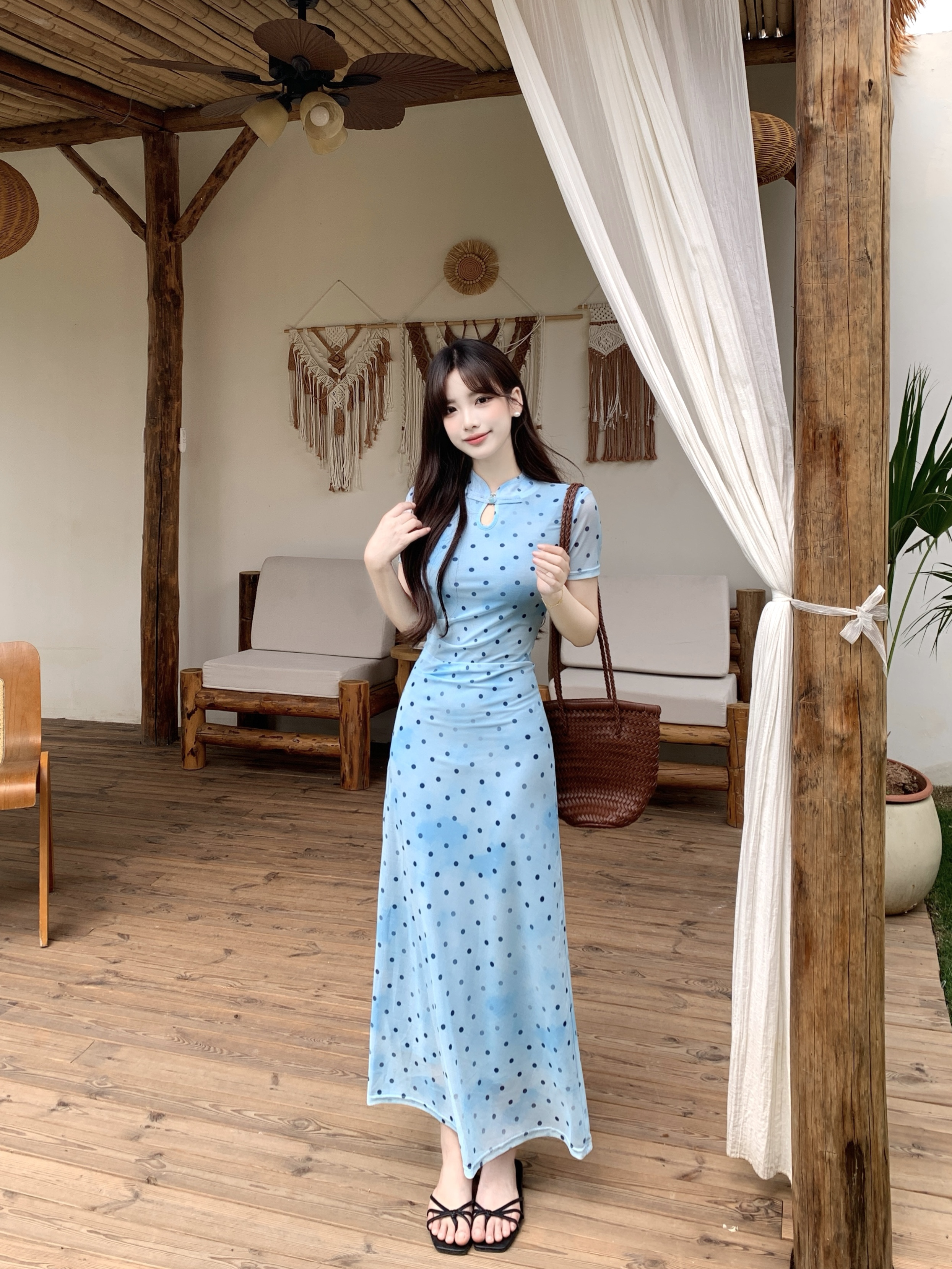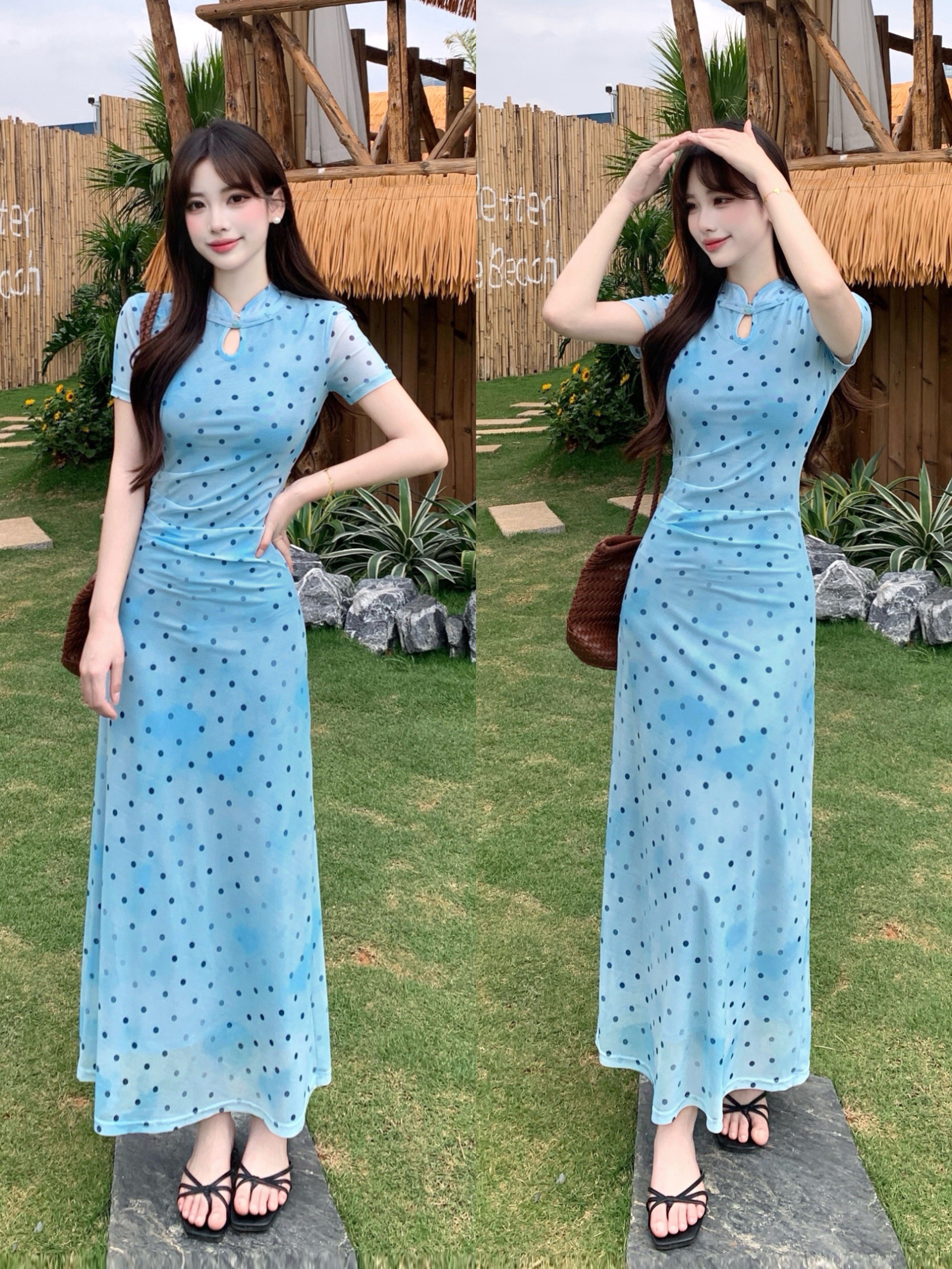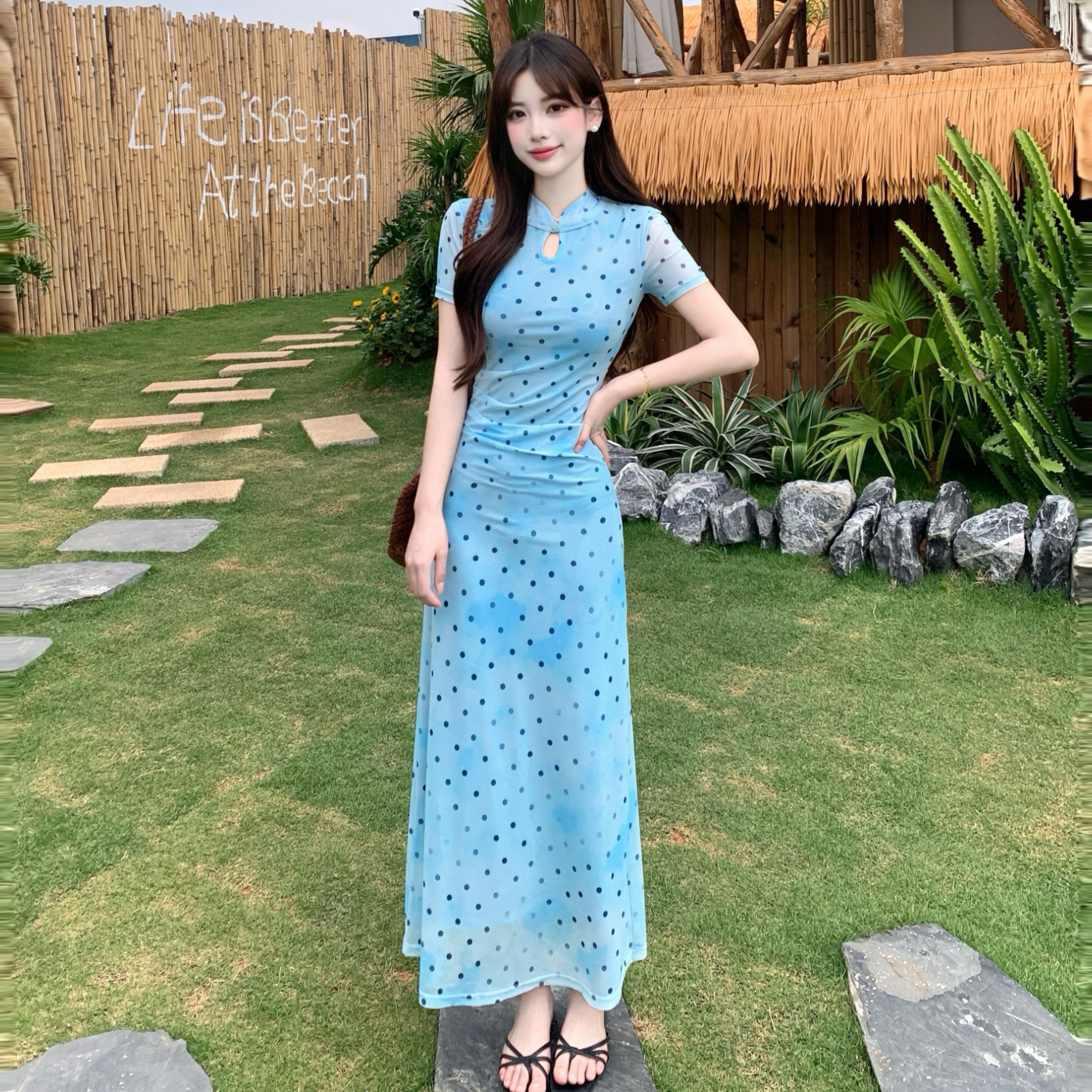 RY2304# 大码2026新中式国风松涧照复古波点改良旗袍裙夏收腰水滴领长裙女