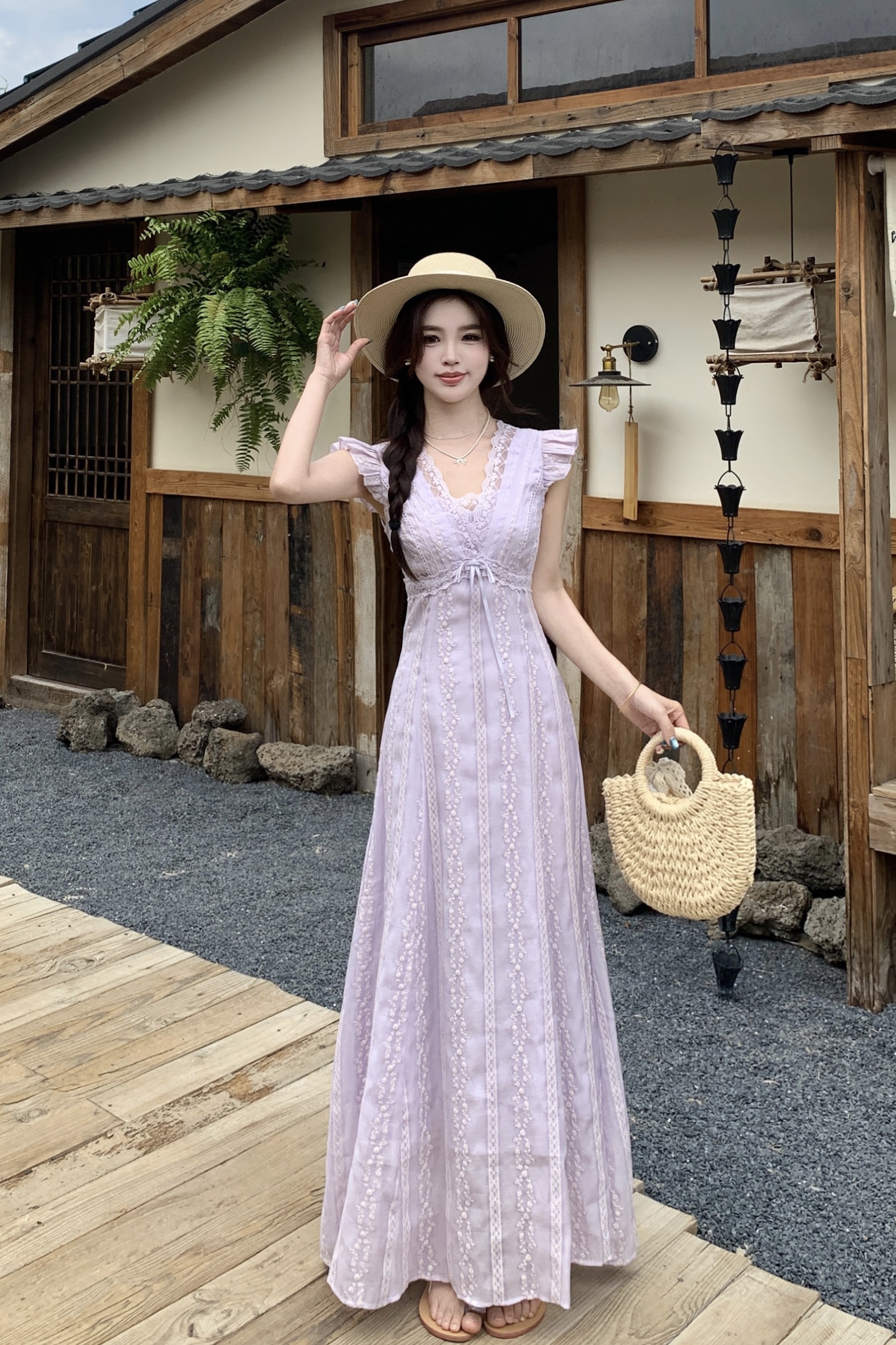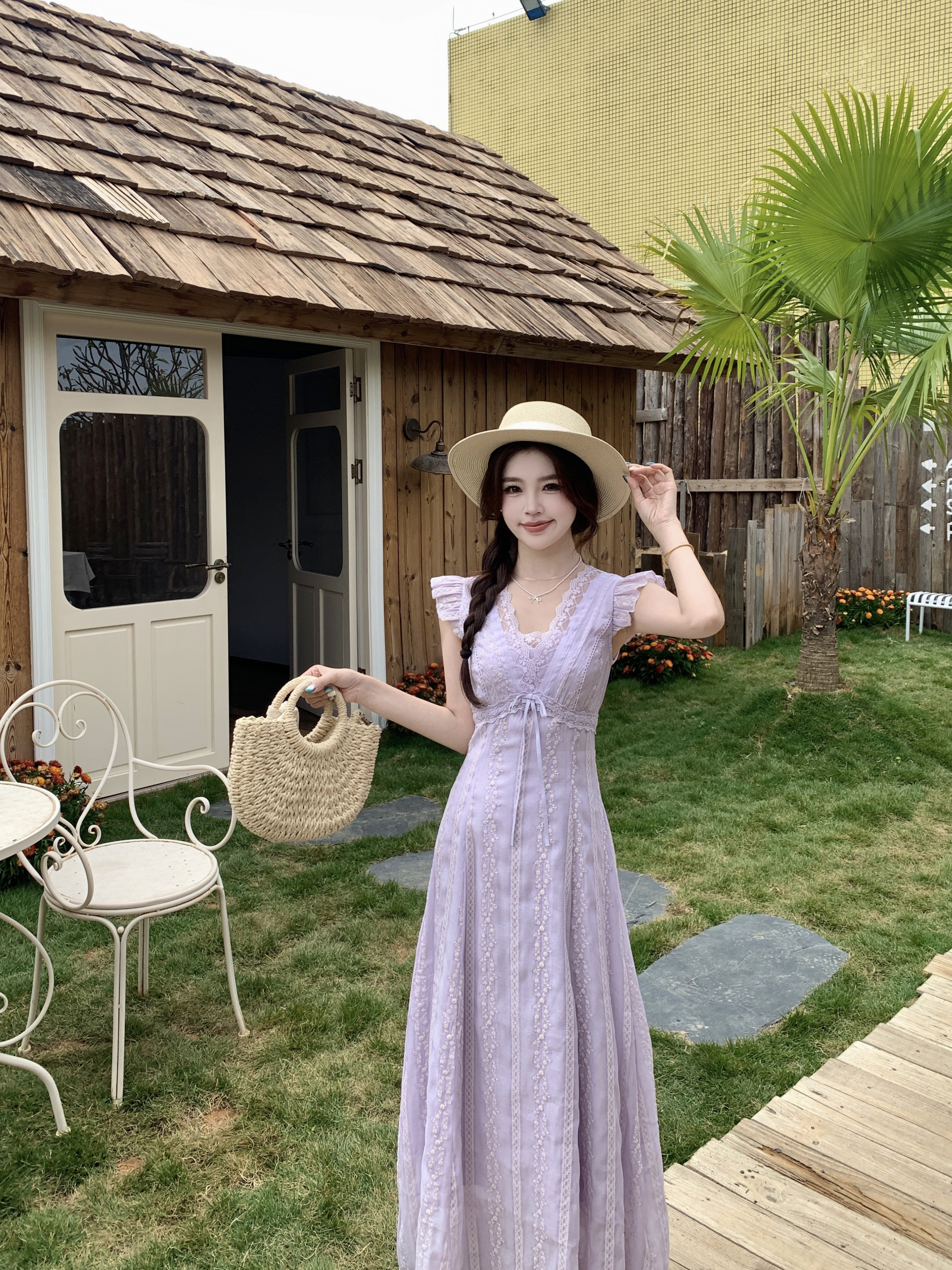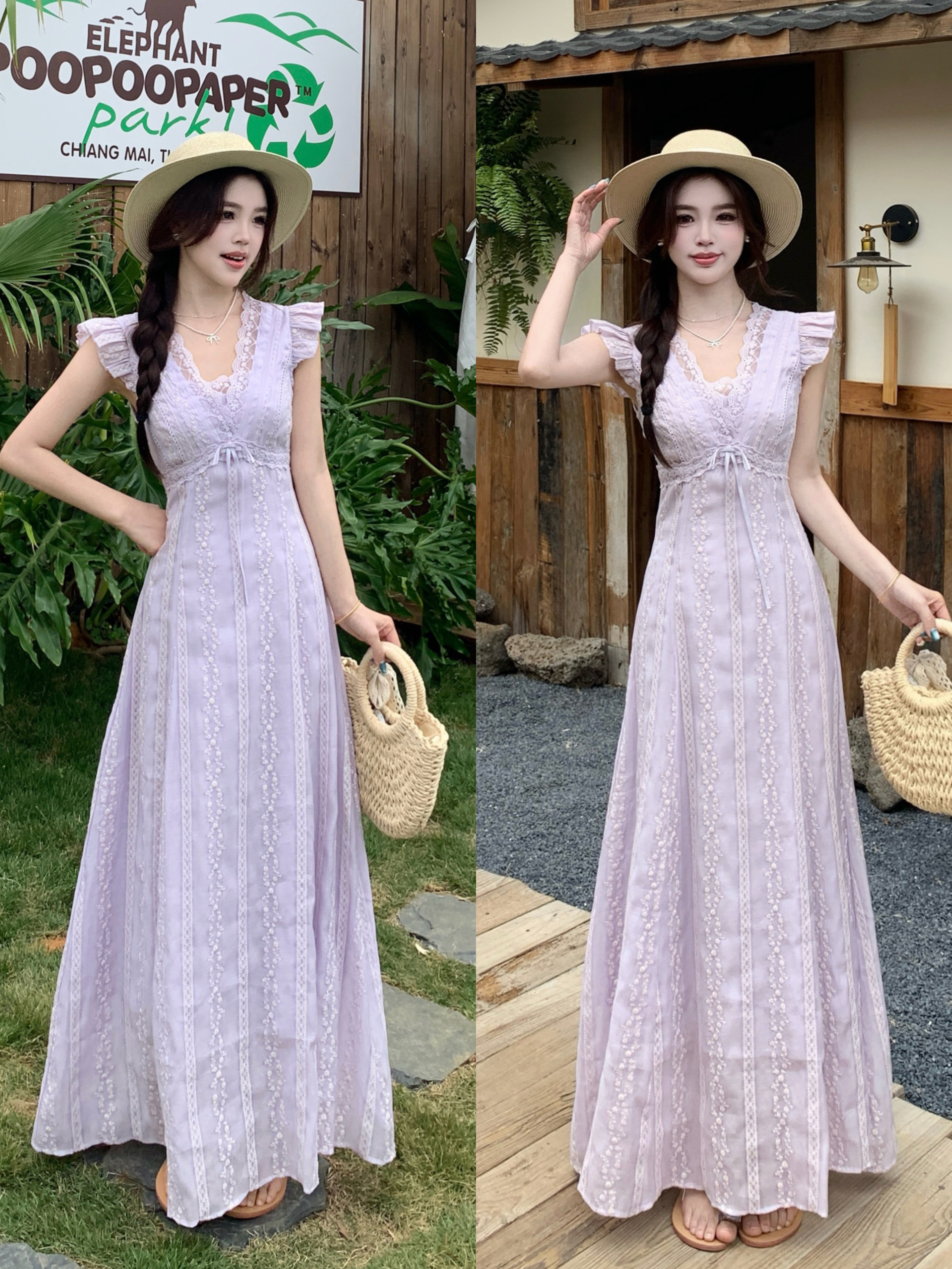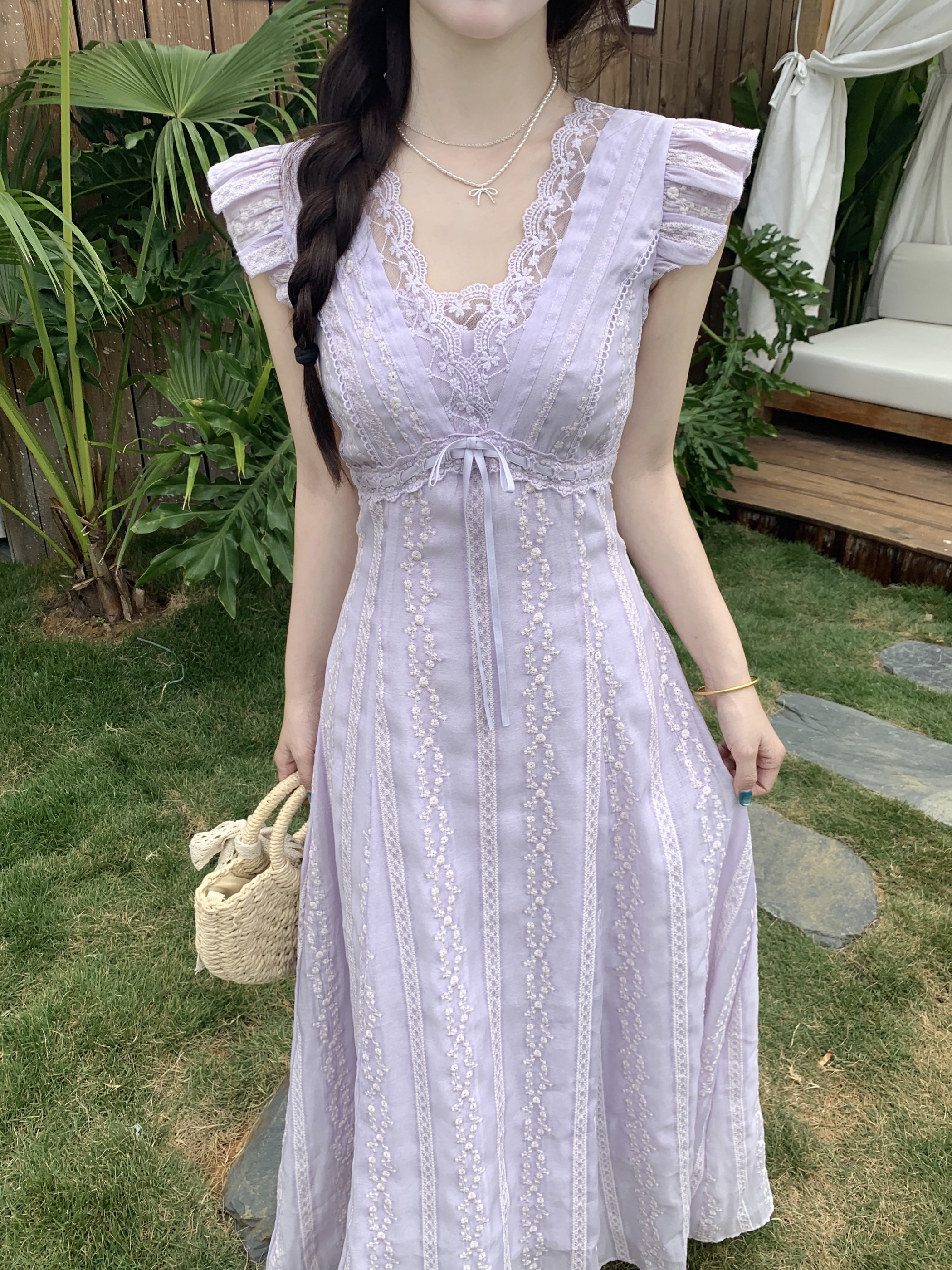 RY2305# 大码2026夏法式复古温柔紫V领小飞袖长款连衣裙甜美气质蕾丝裙子