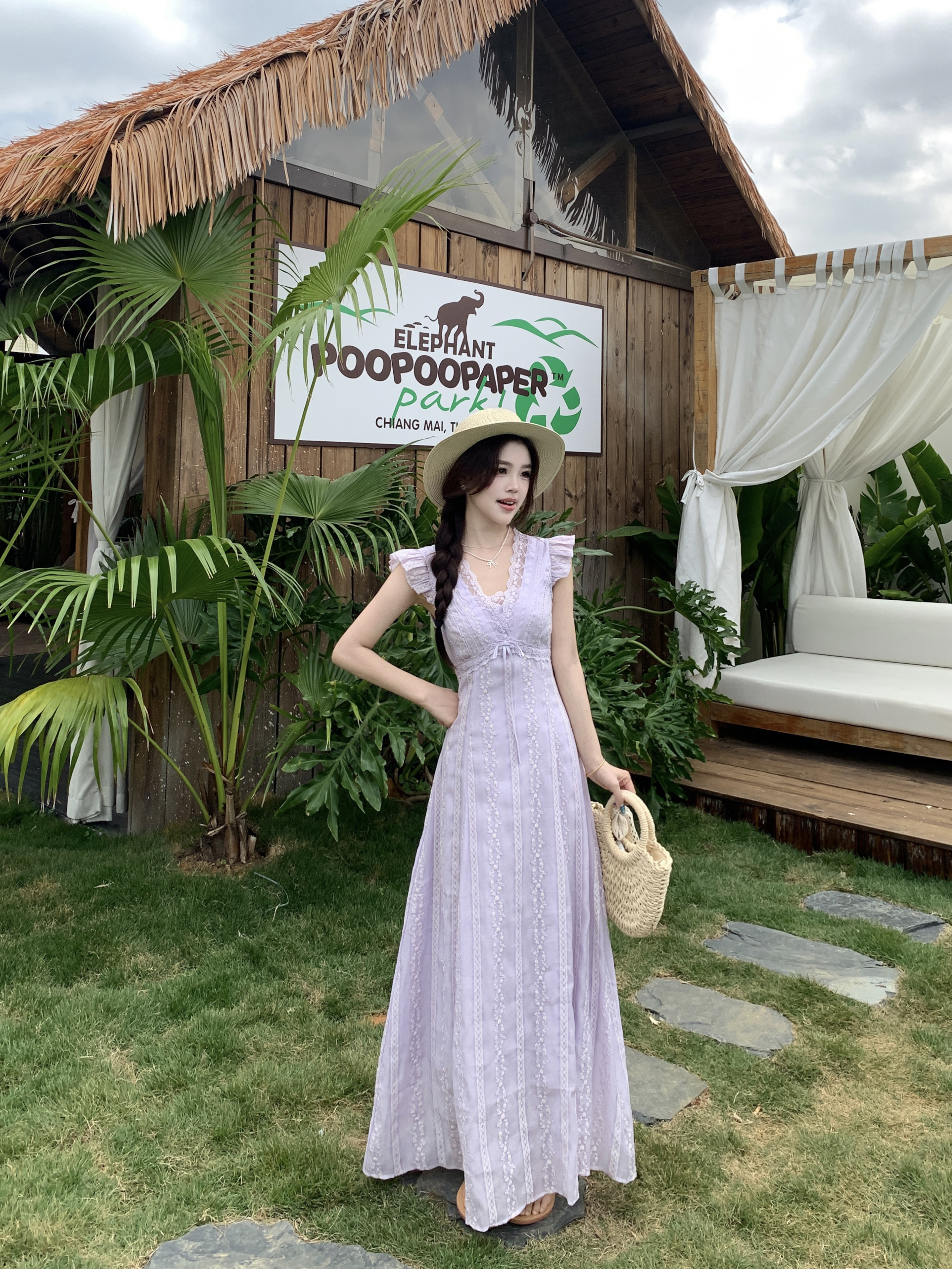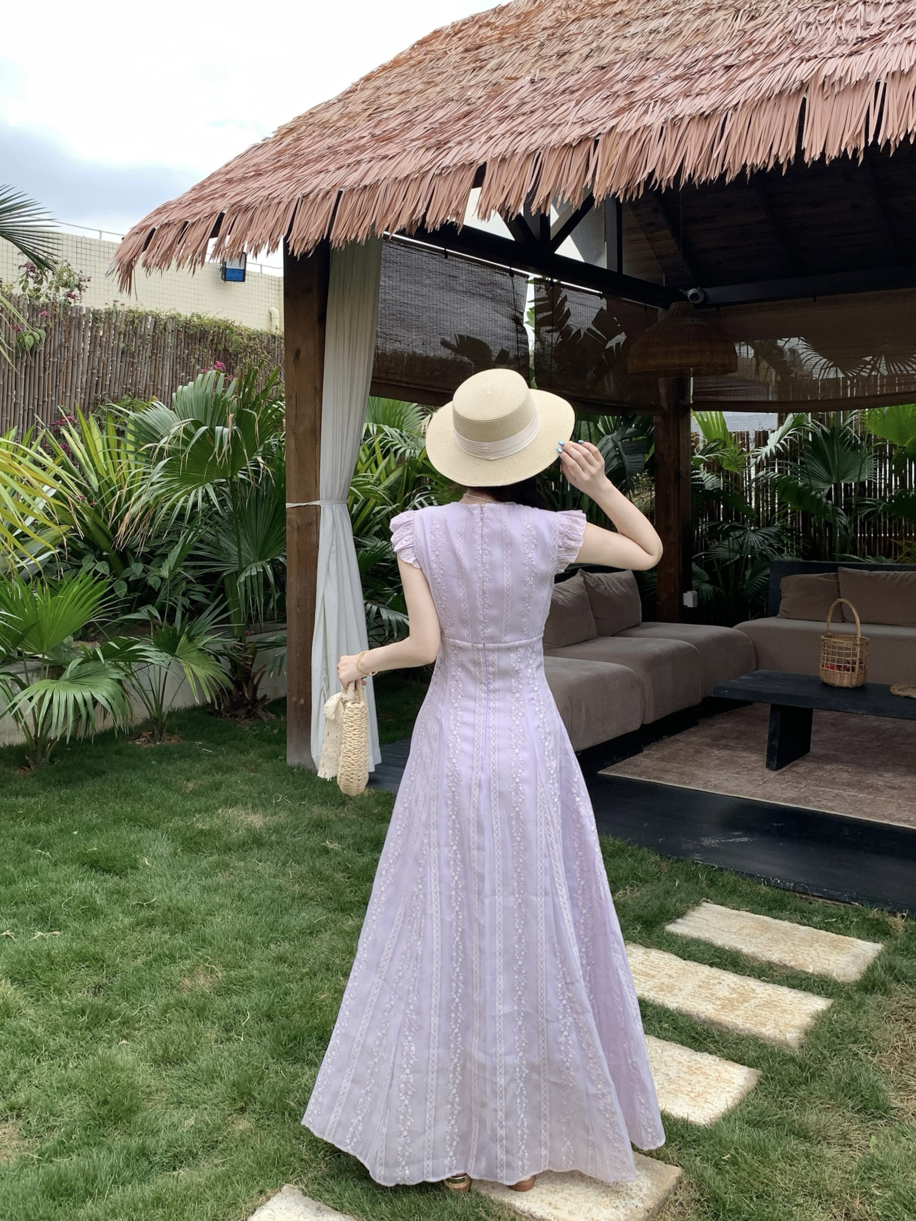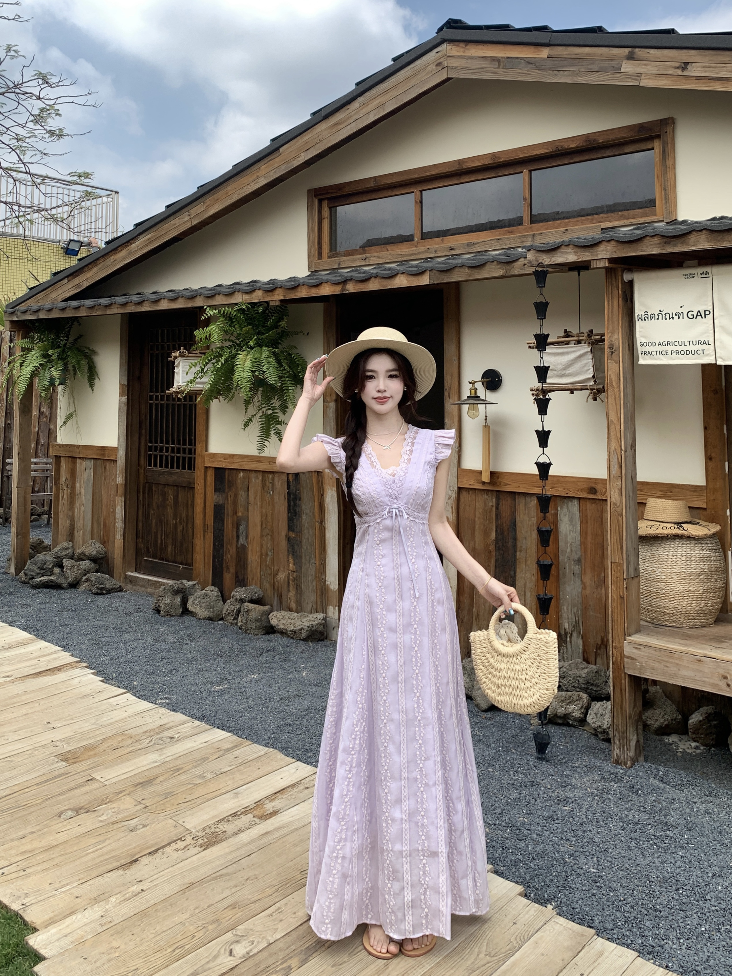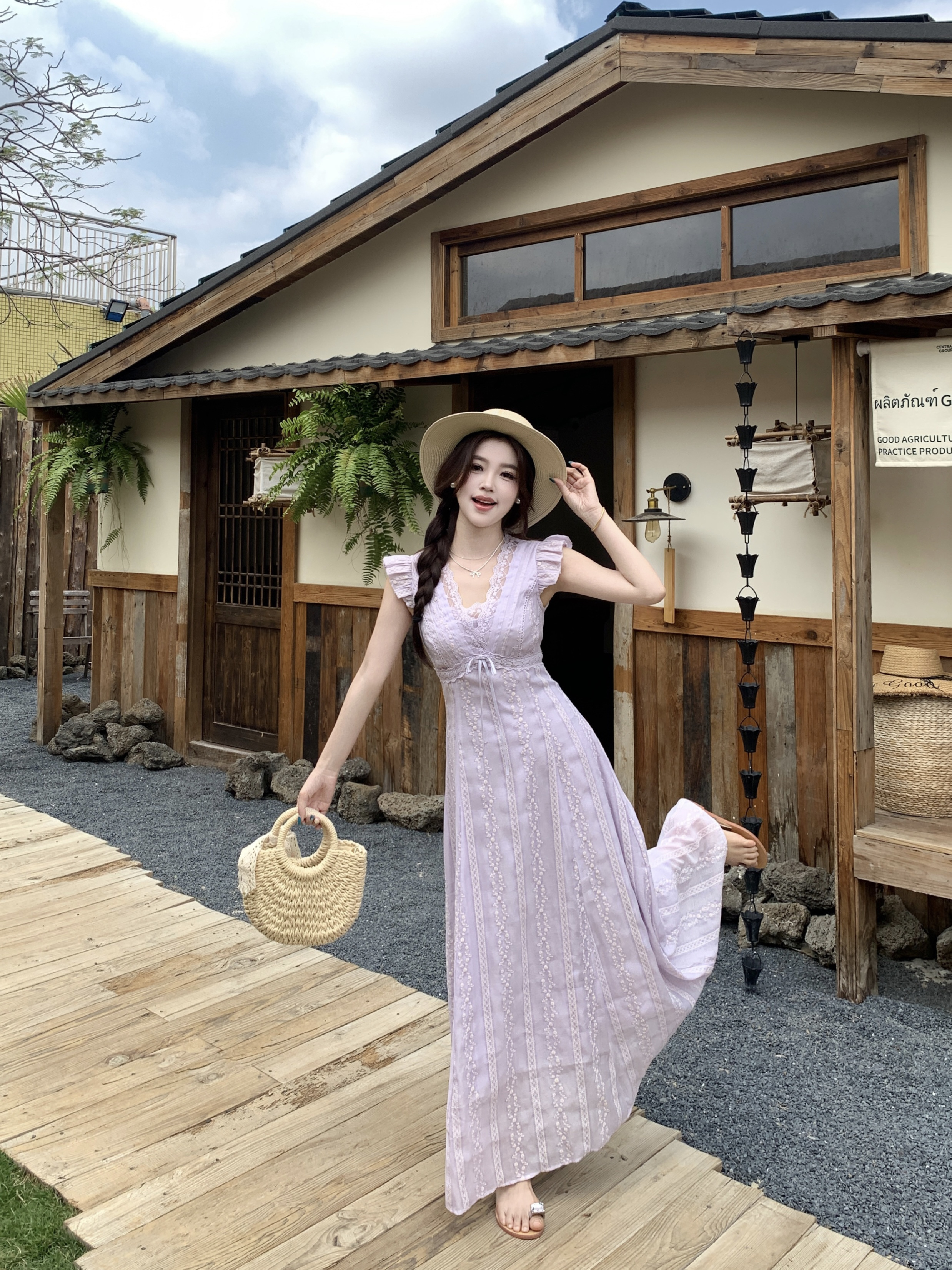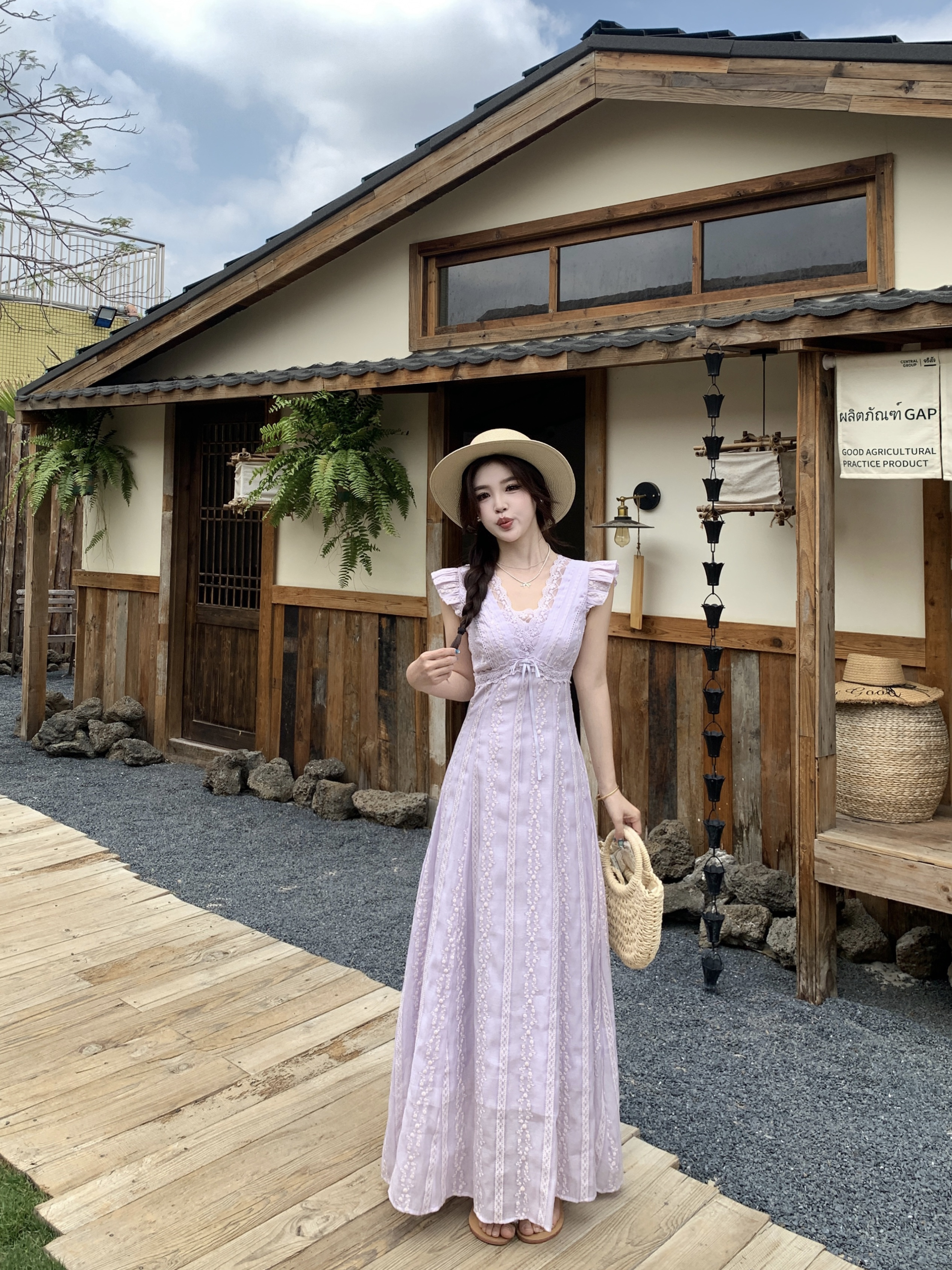 RY2305# 大码2026夏法式复古温柔紫V领小飞袖长款连衣裙甜美气质蕾丝裙子