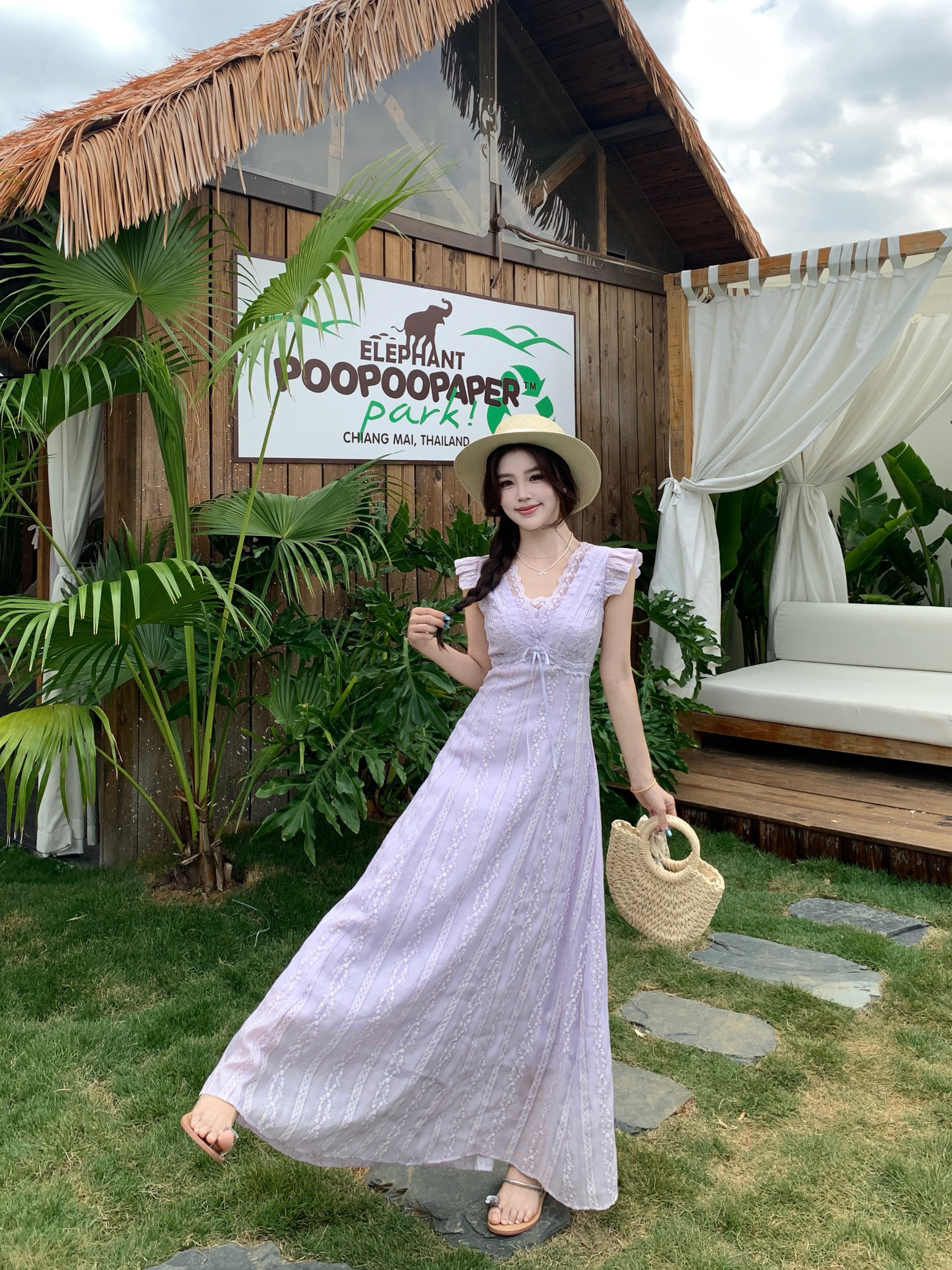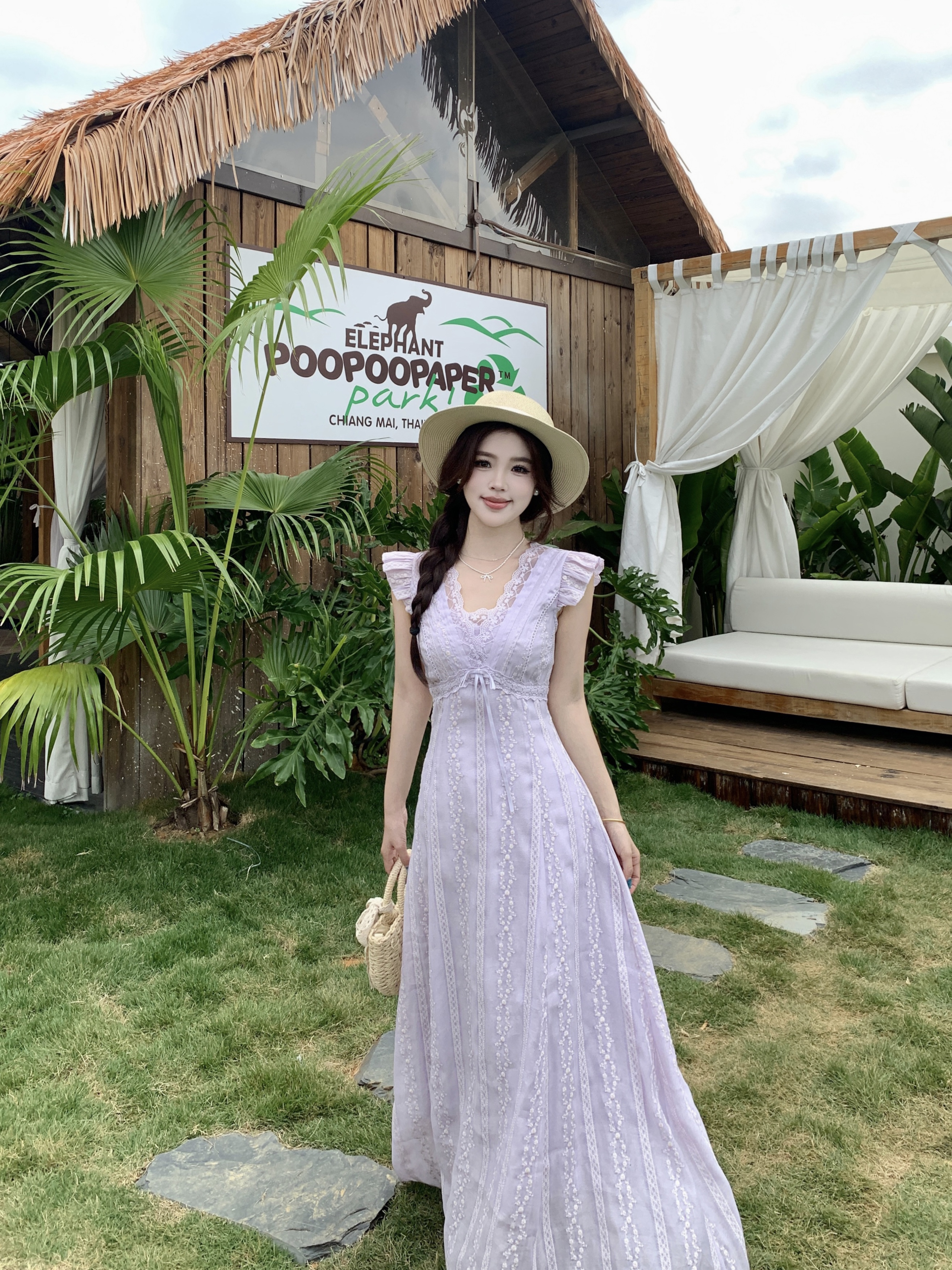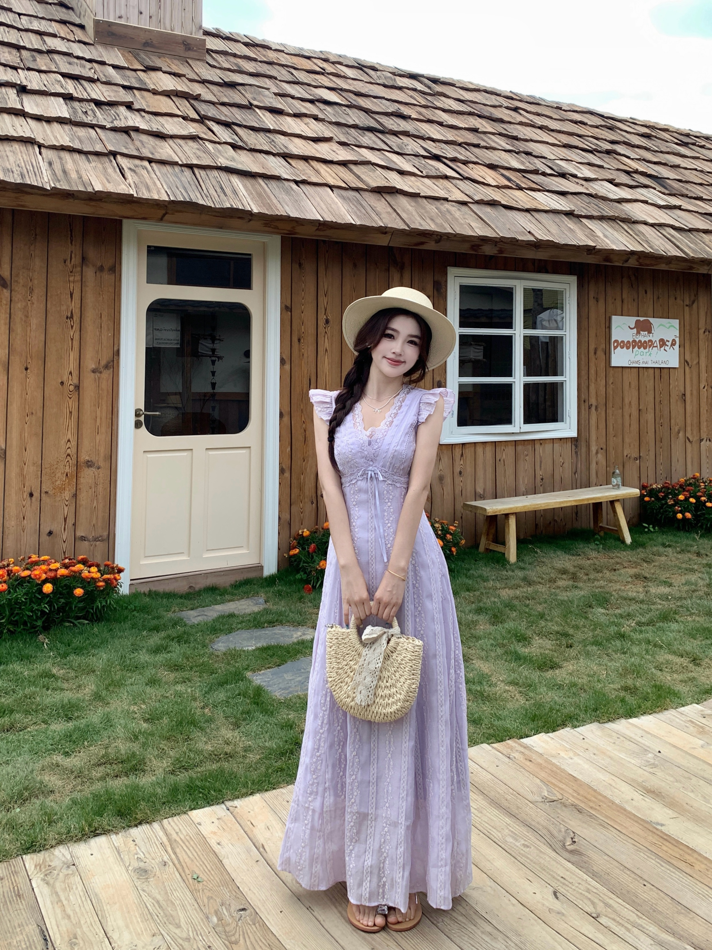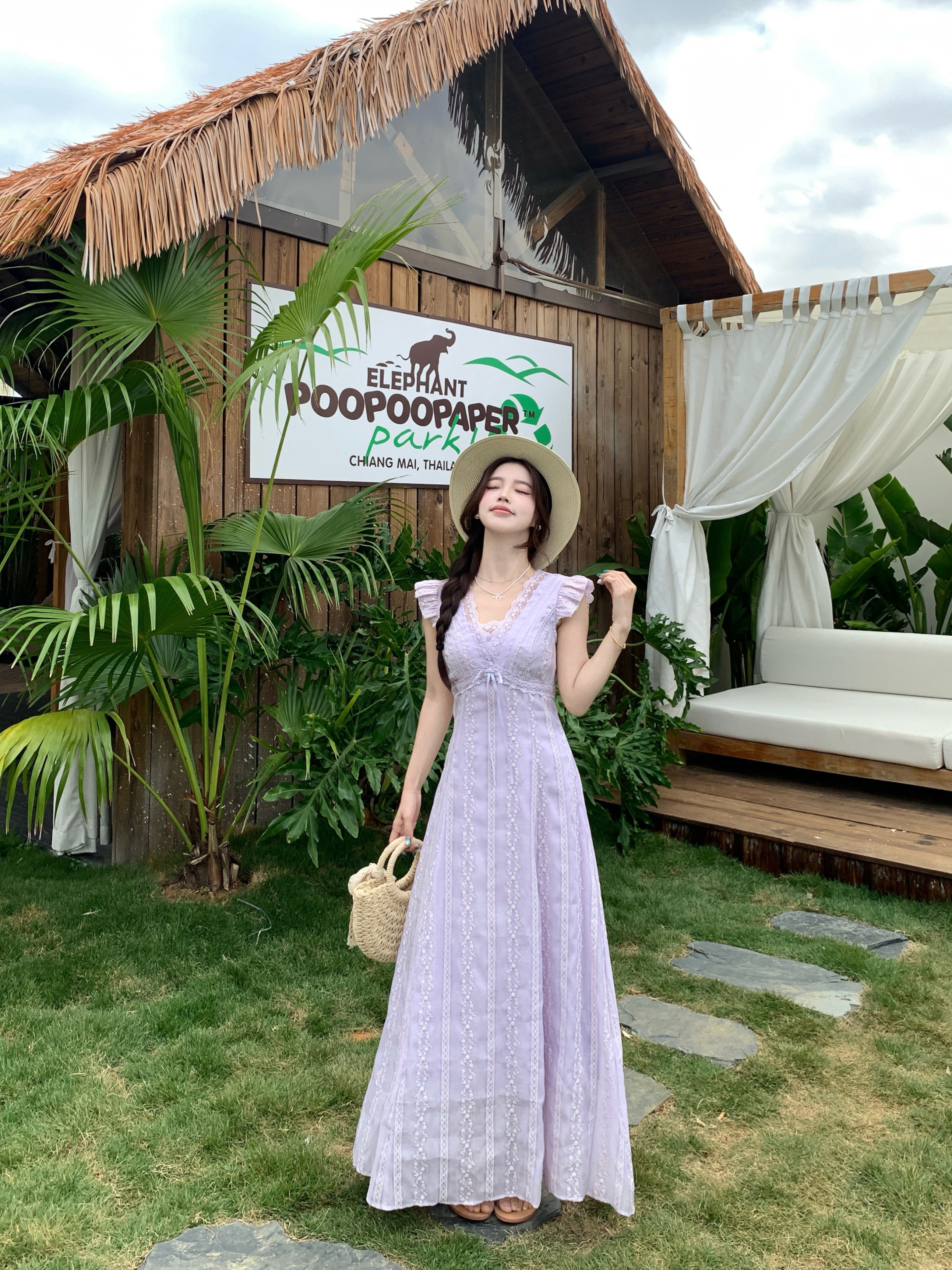 RY2305# 大码2026夏法式复古温柔紫V领小飞袖长款连衣裙甜美气质蕾丝裙子