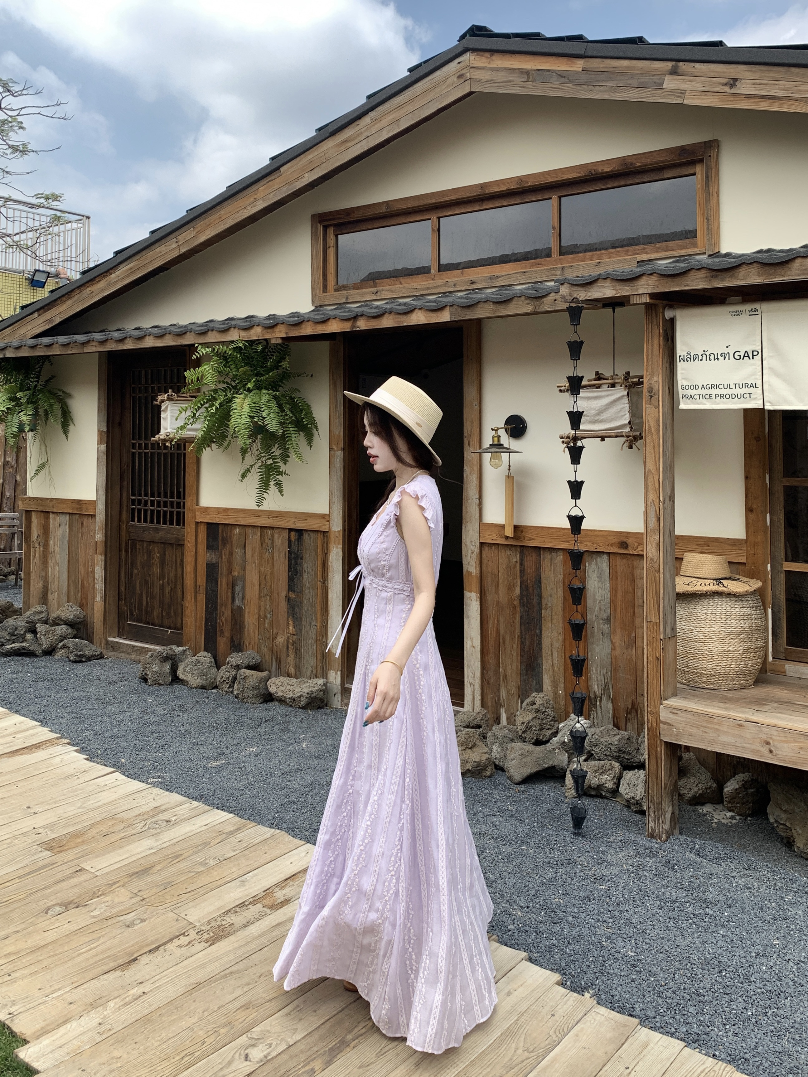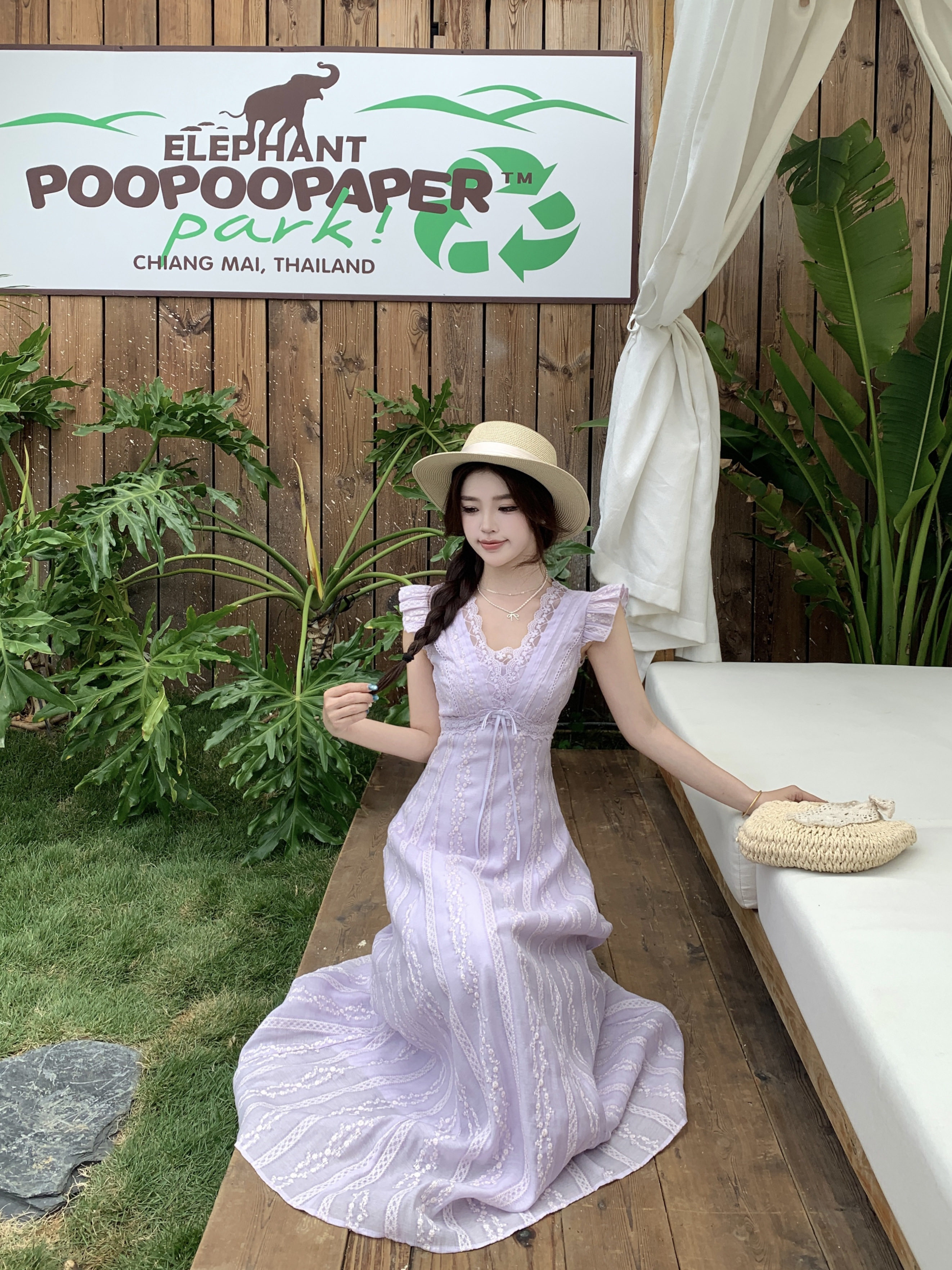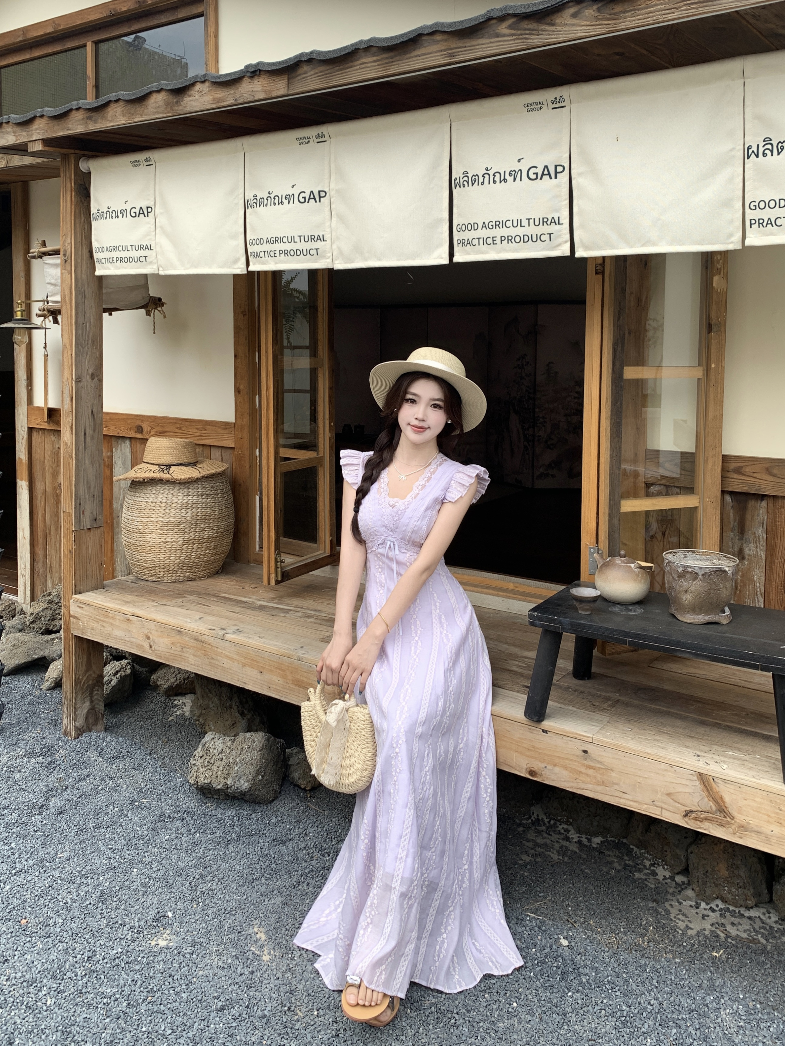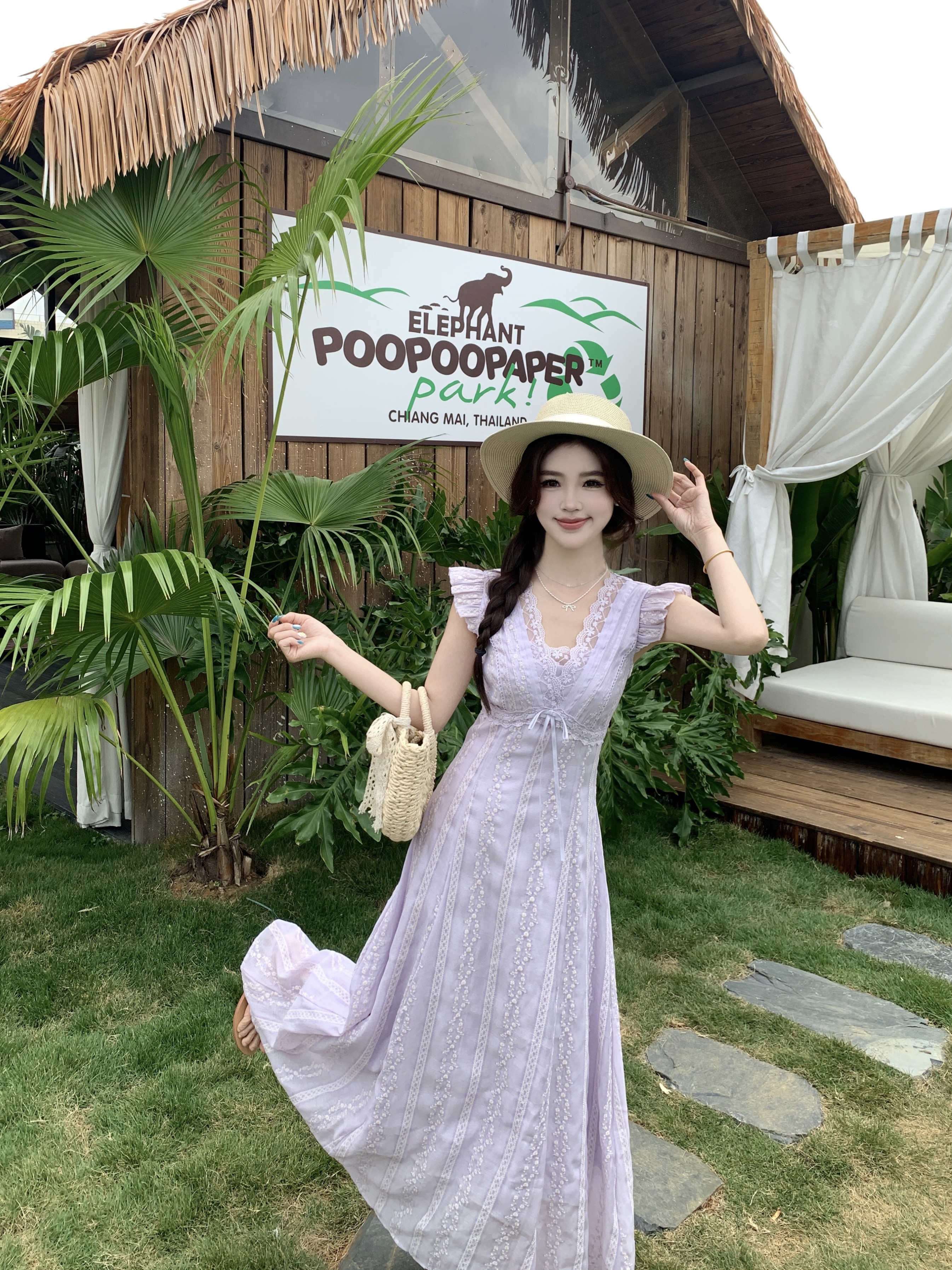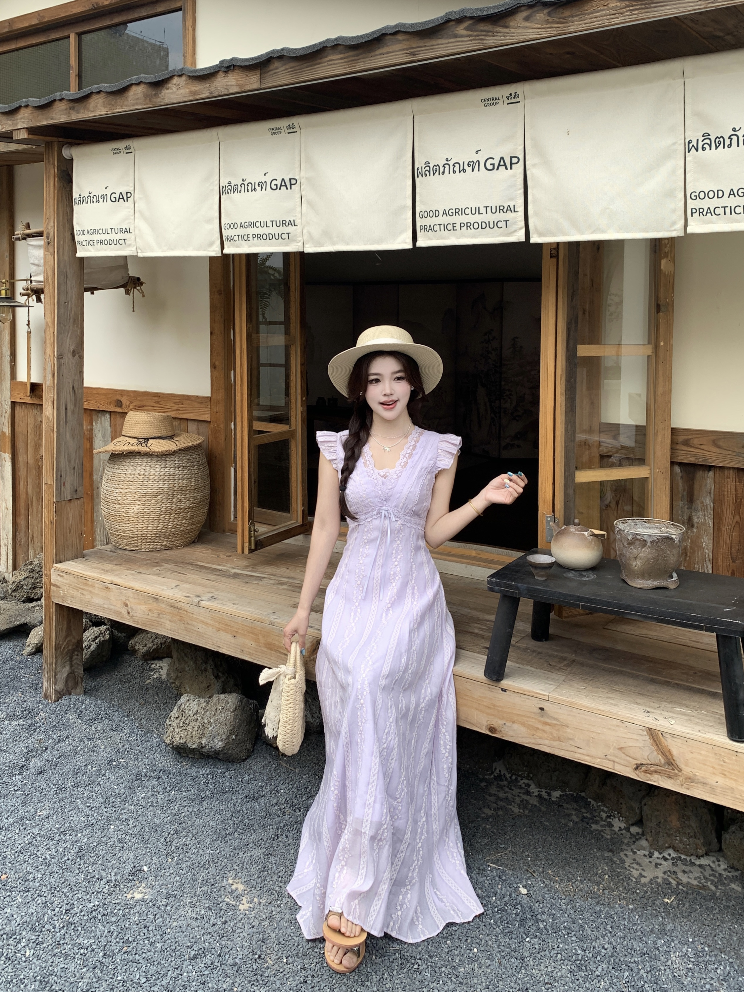 RY2305# 大码2026夏法式复古温柔紫V领小飞袖长款连衣裙甜美气质蕾丝裙子