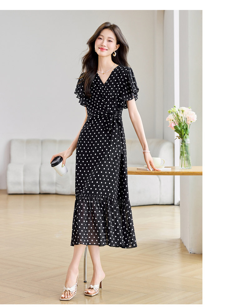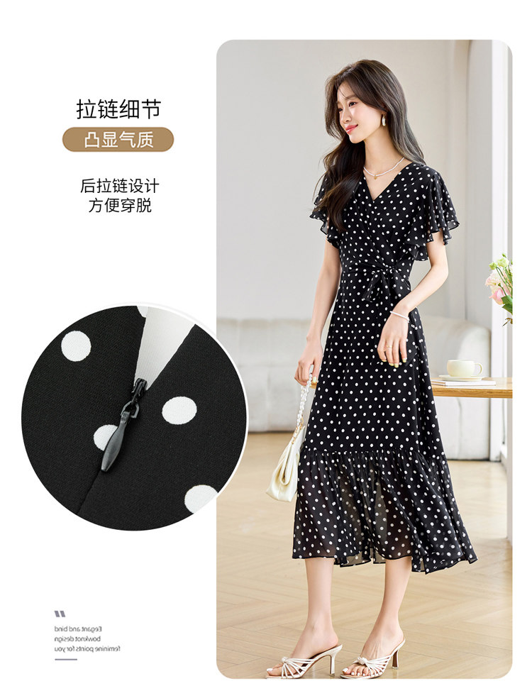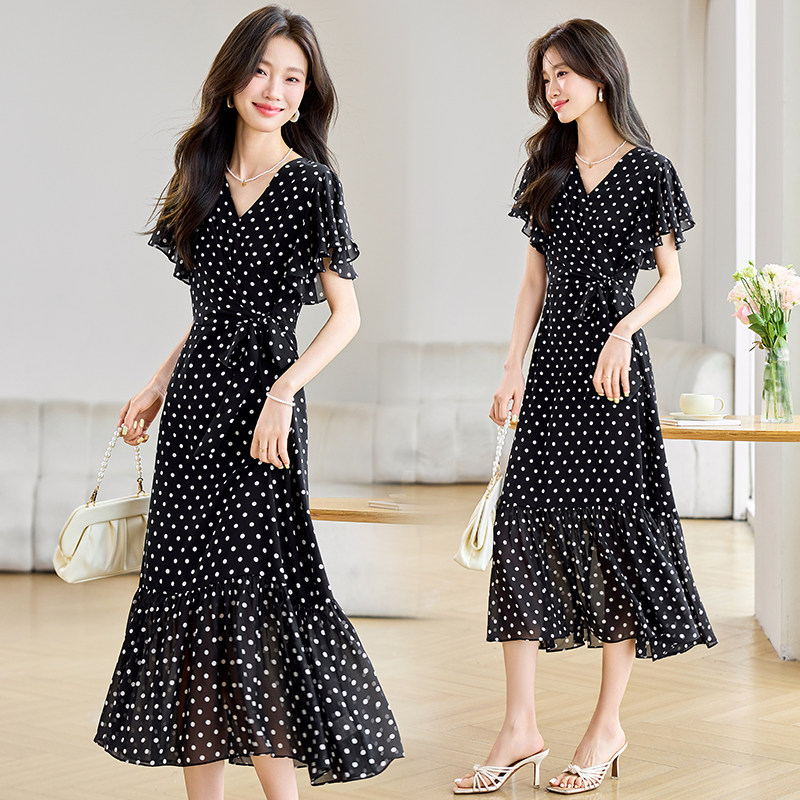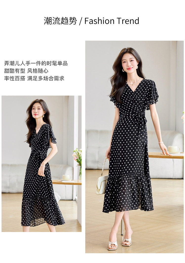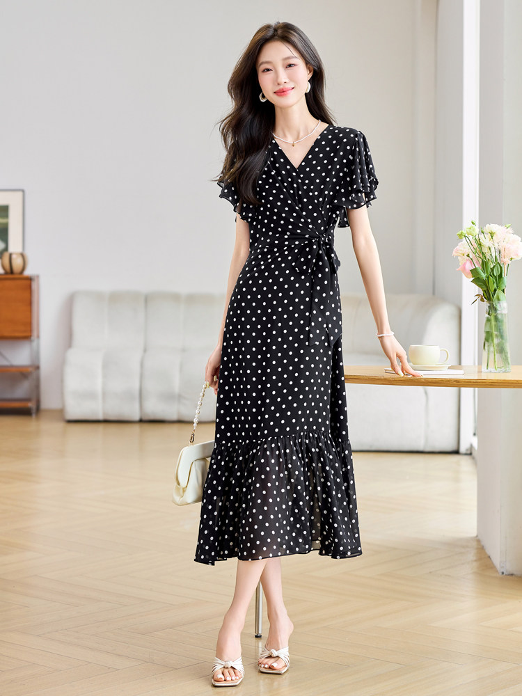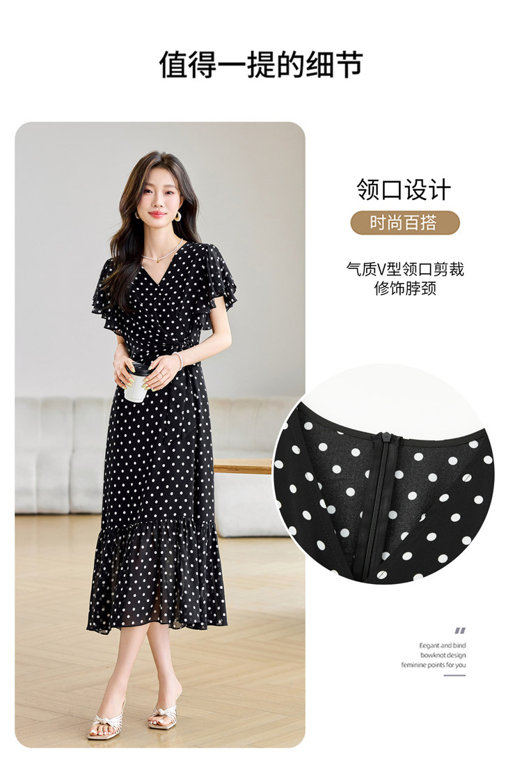 RY2309# 法式连衣裙2026夏季新款巨好看的气质漂亮V领黑色波点度假鱼尾裙