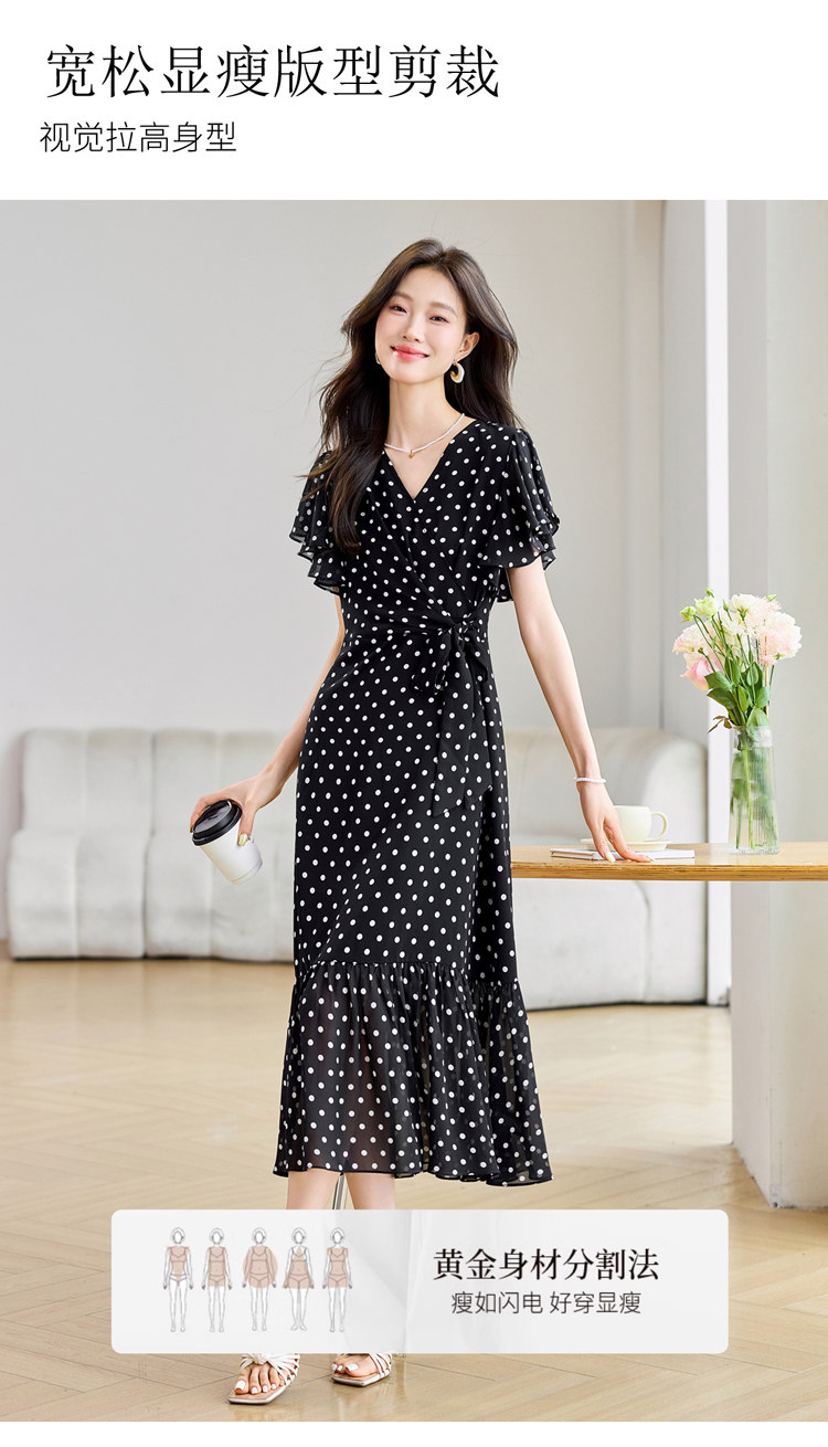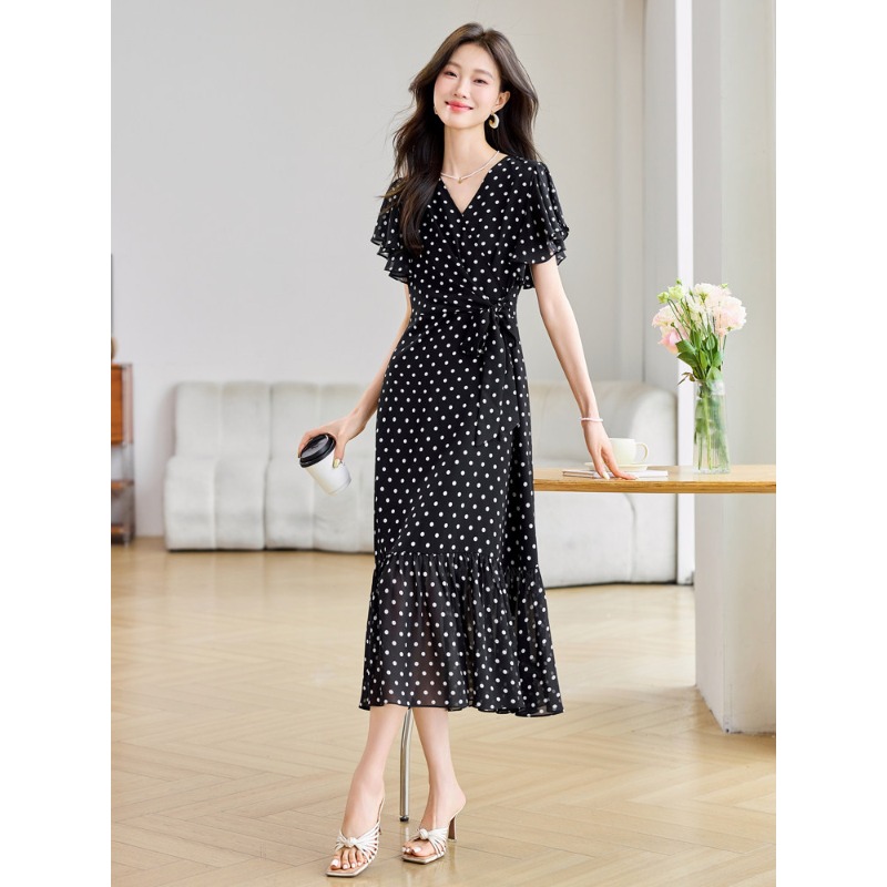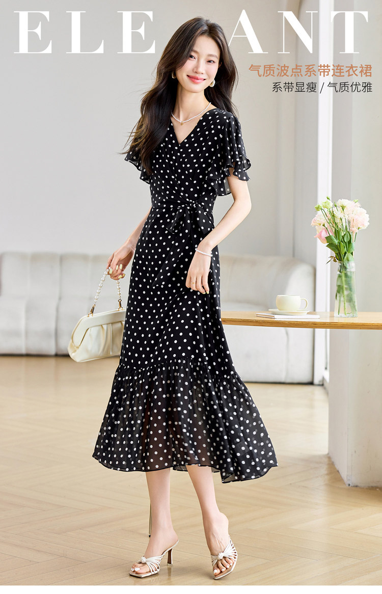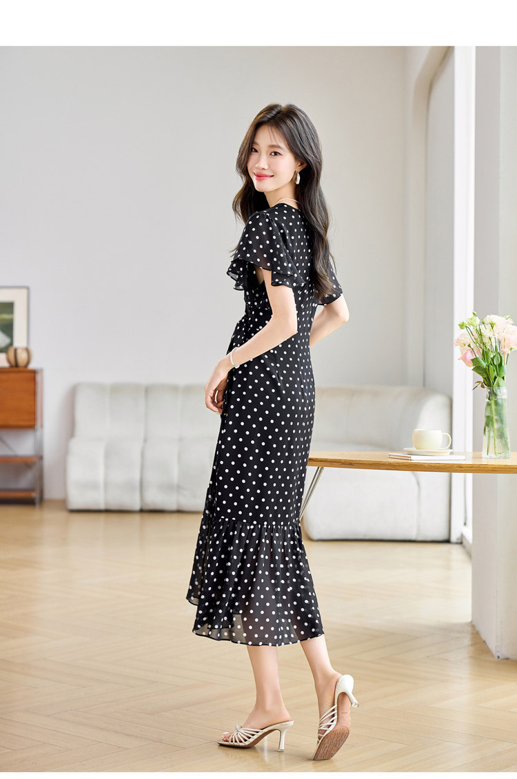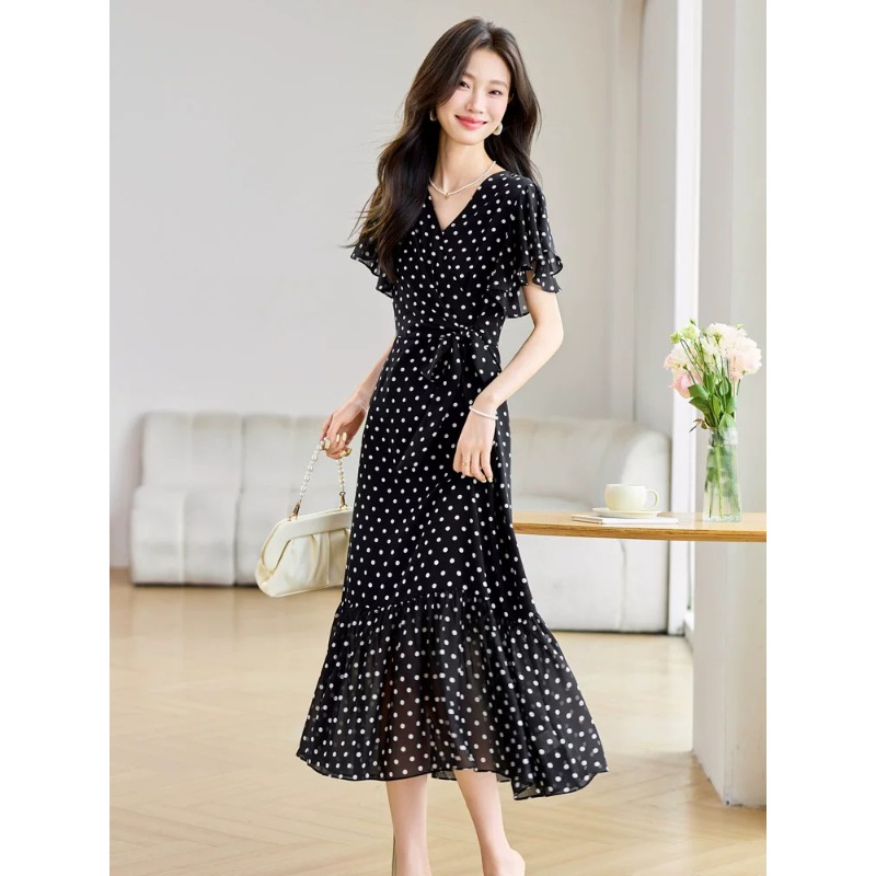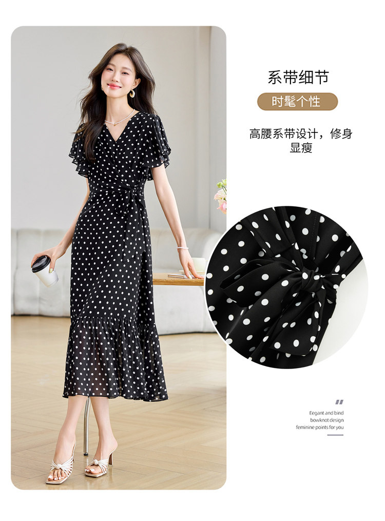 RY2309# 法式连衣裙2026夏季新款巨好看的气质漂亮V领黑色波点度假鱼尾裙