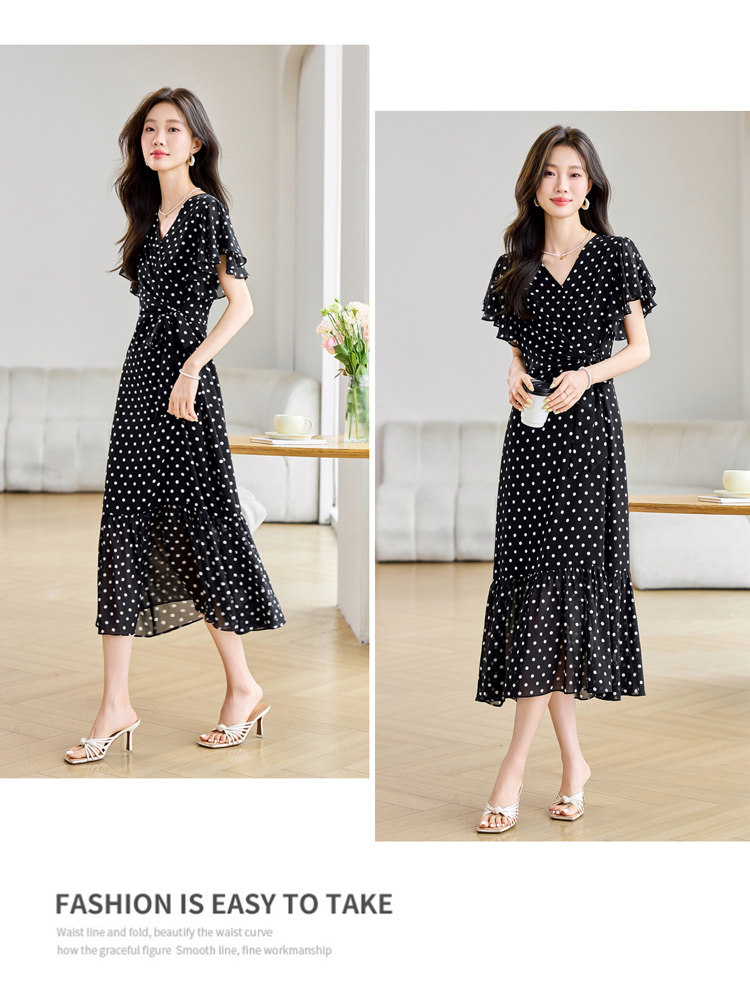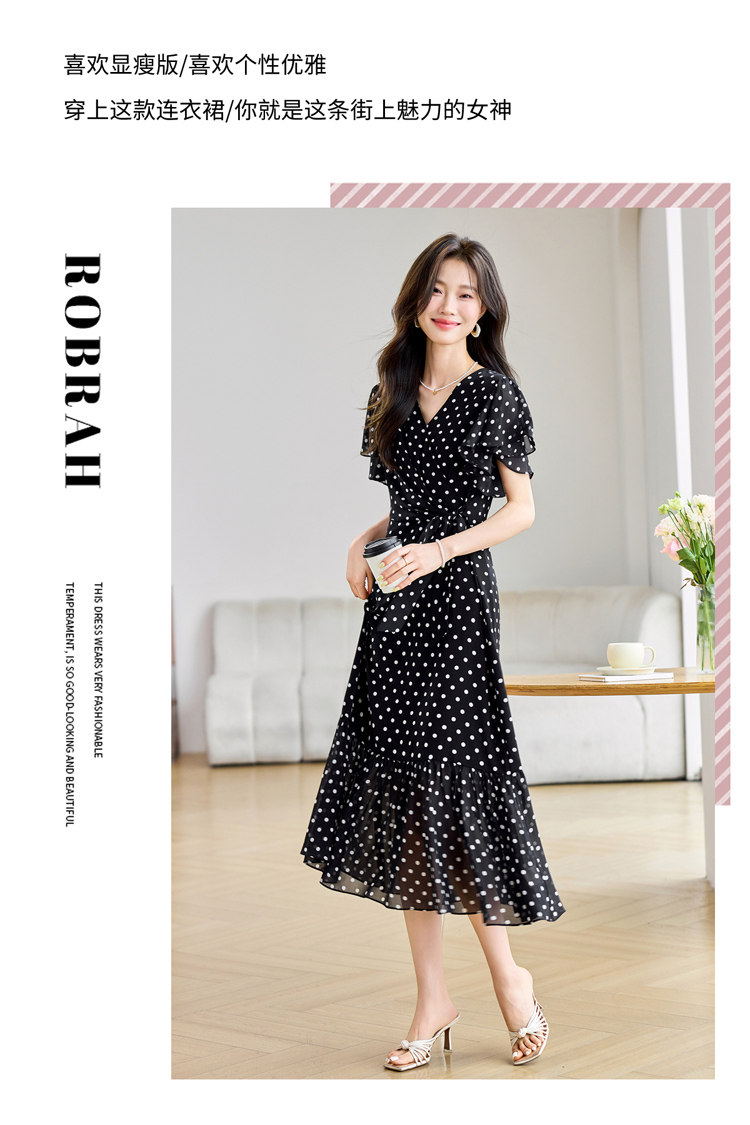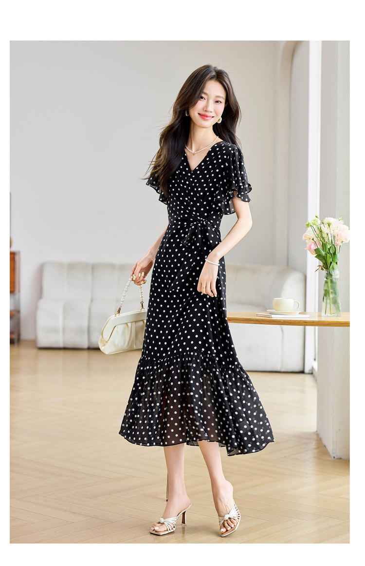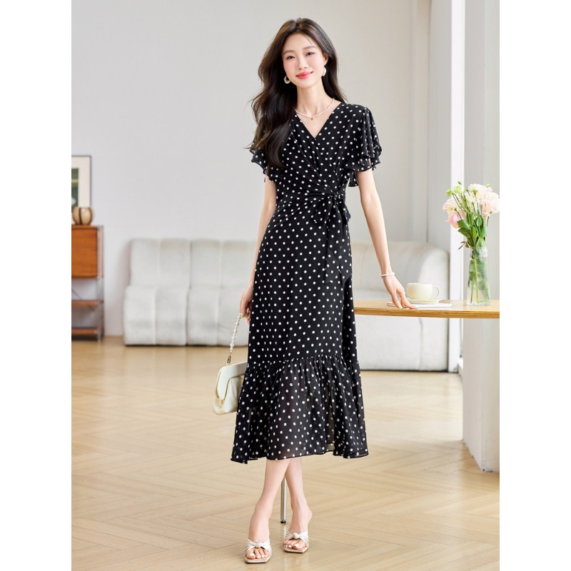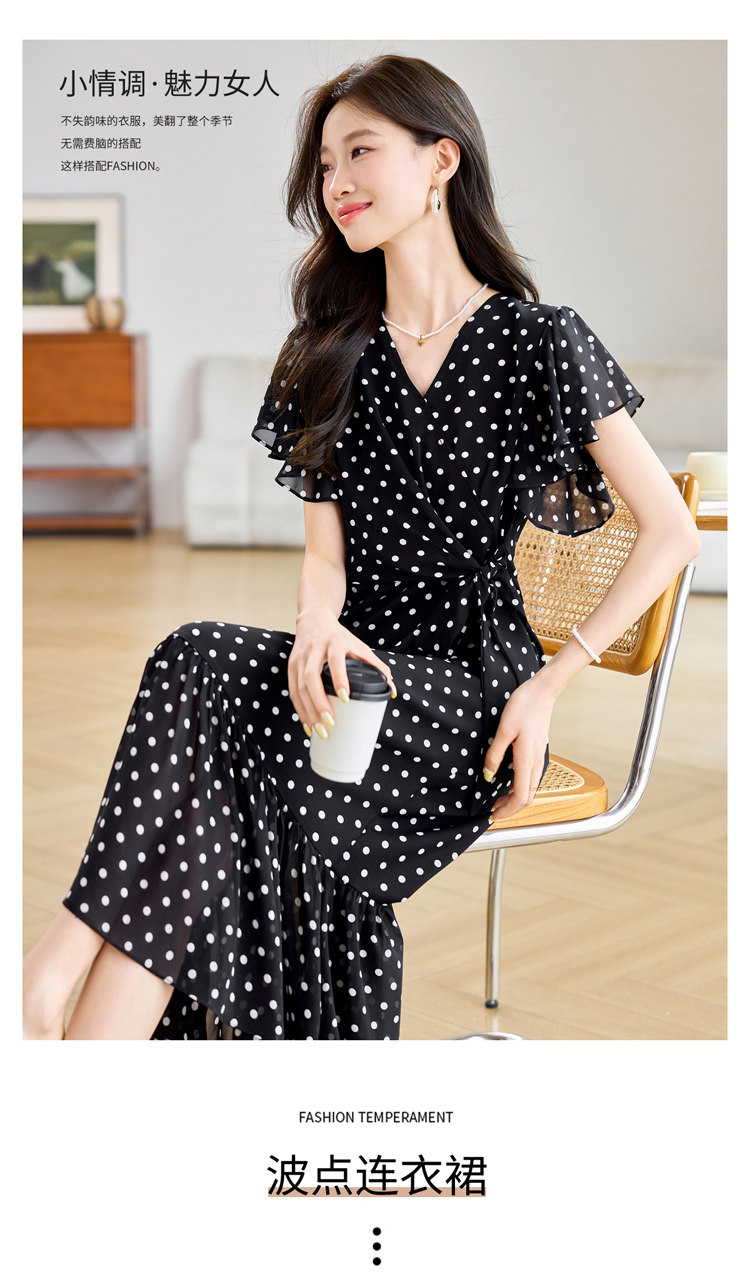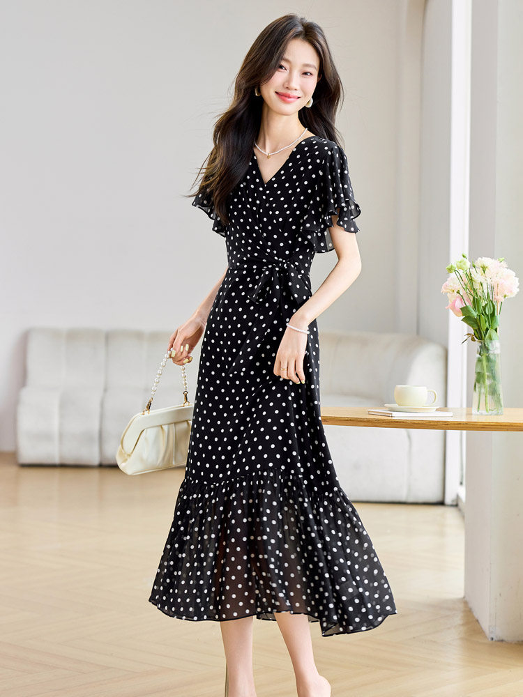 RY2309# 法式连衣裙2026夏季新款巨好看的气质漂亮V领黑色波点度假鱼尾裙