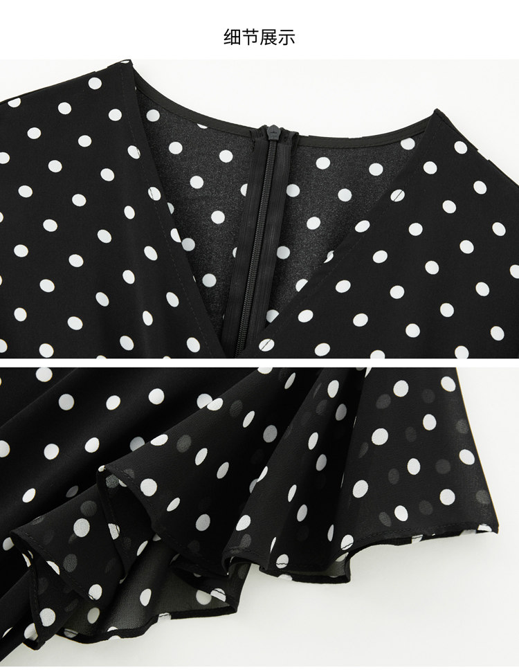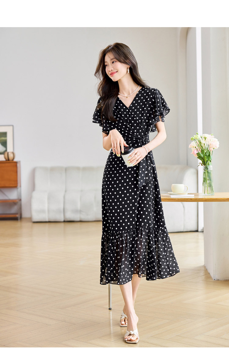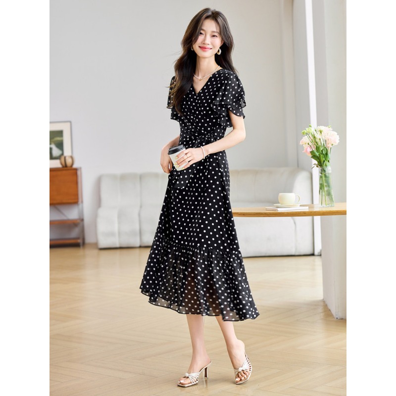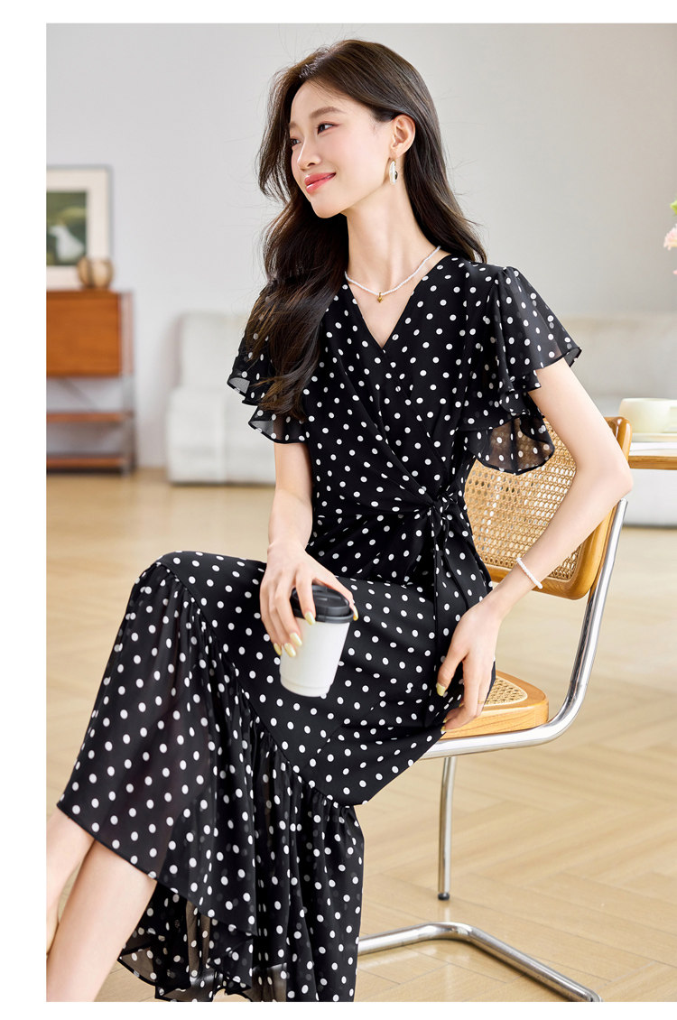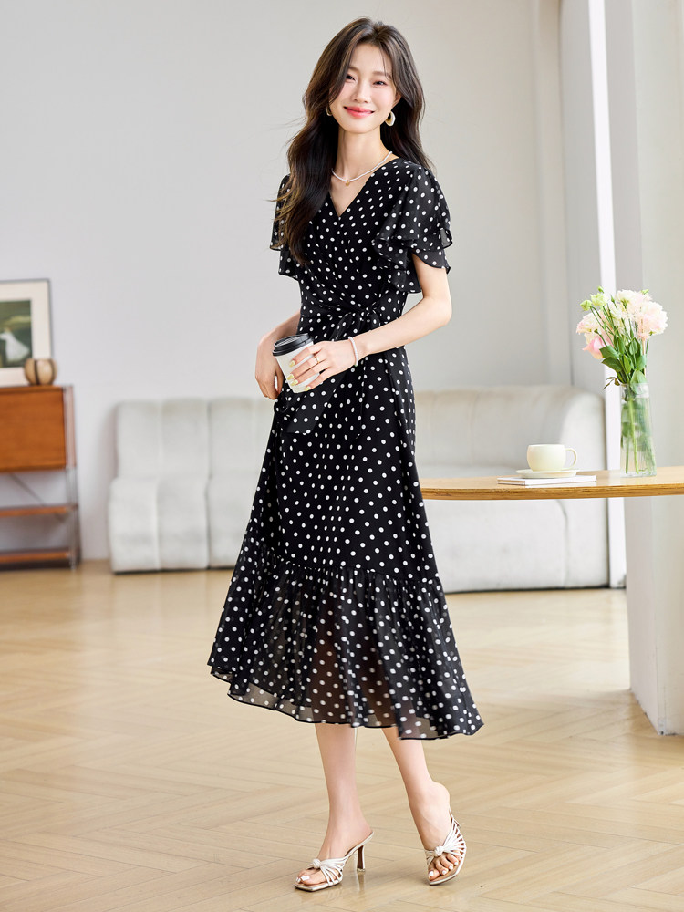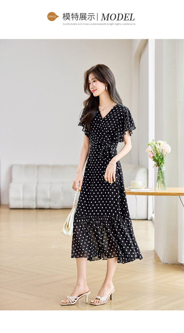RY2309# 法式连衣裙2026夏季新款巨好看的气质漂亮V领黑色波点度假鱼尾裙