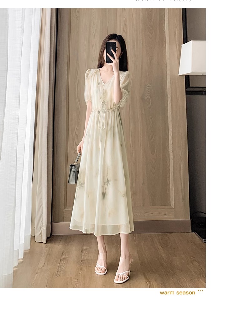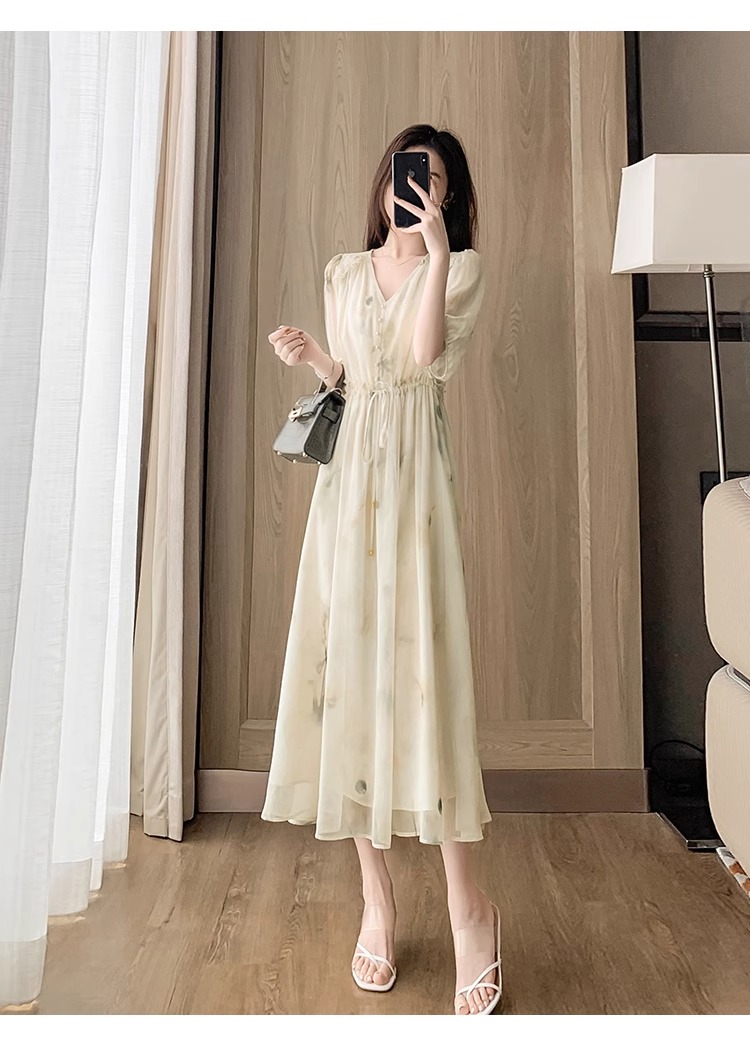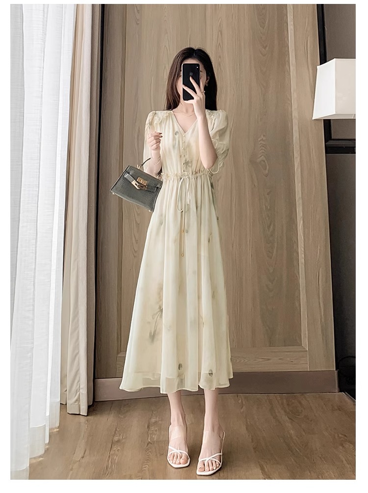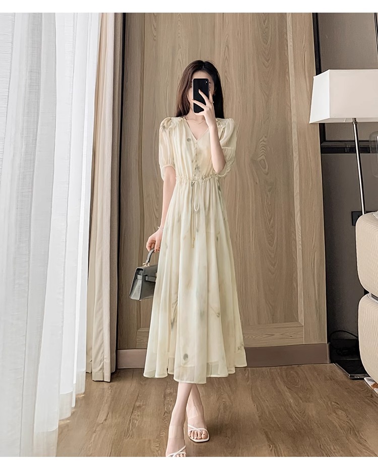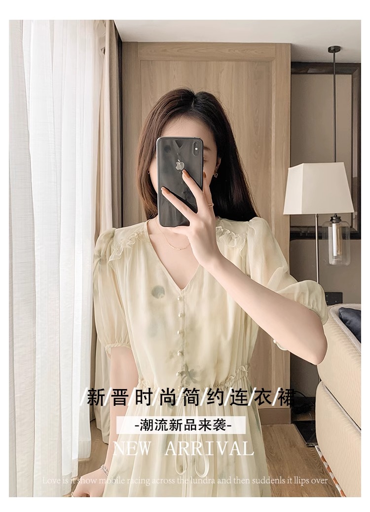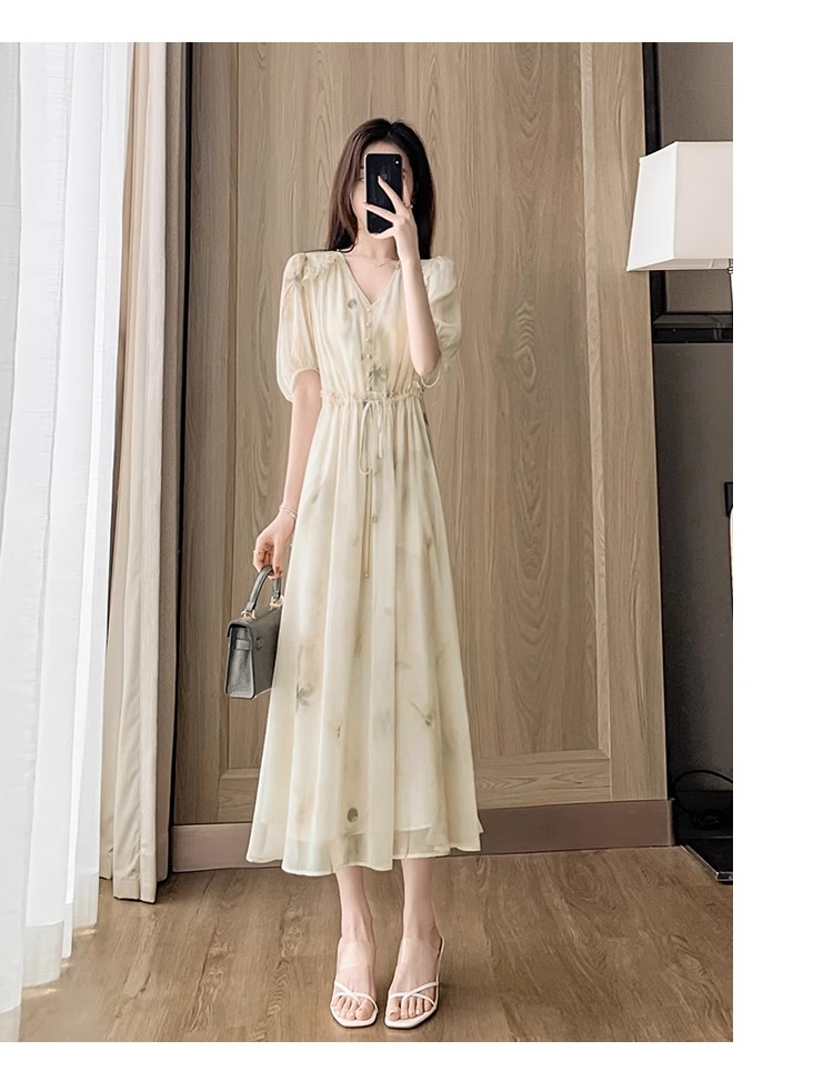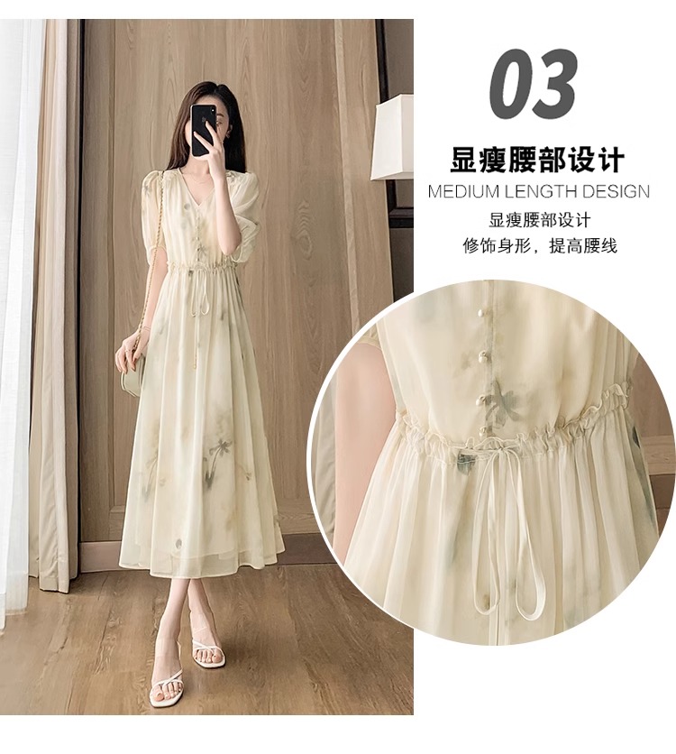 RY2314# 超仙高级感碎花雪纺连衣裙女夏2026新款收腰显瘦气质遮肚a字裙子