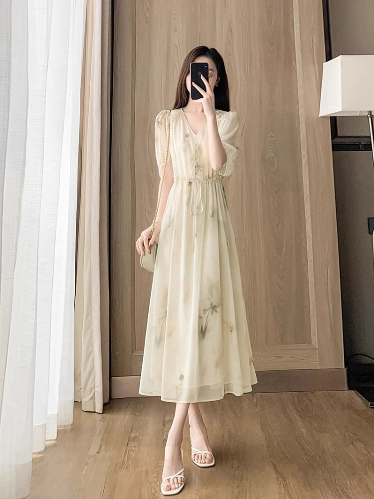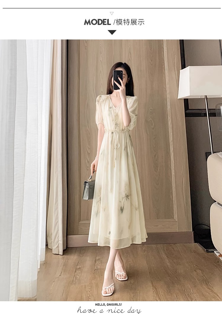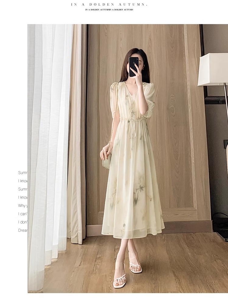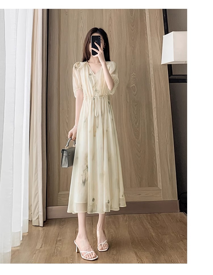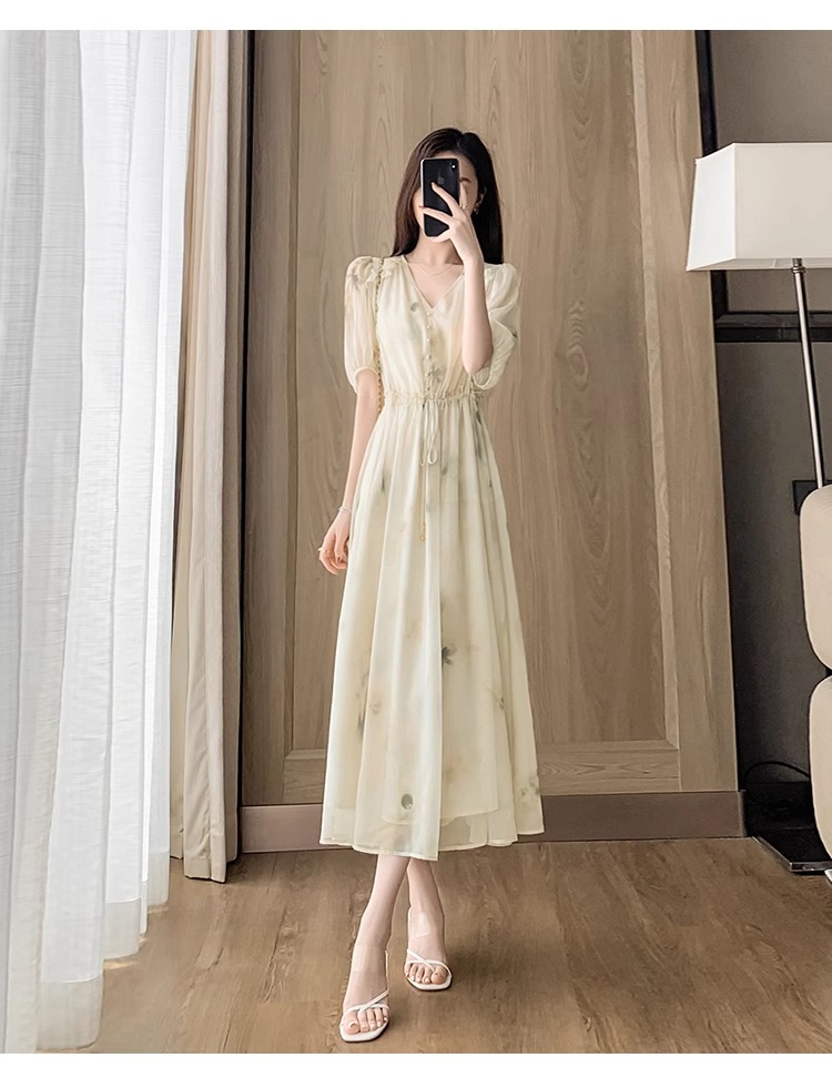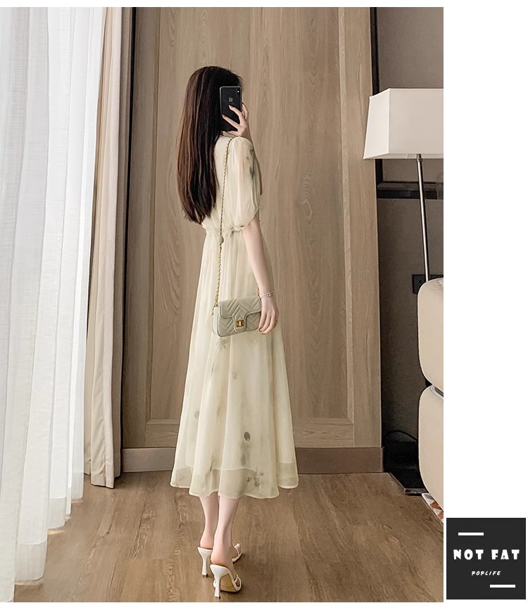 RY2314# 超仙高级感碎花雪纺连衣裙女夏2026新款收腰显瘦气质遮肚a字裙子