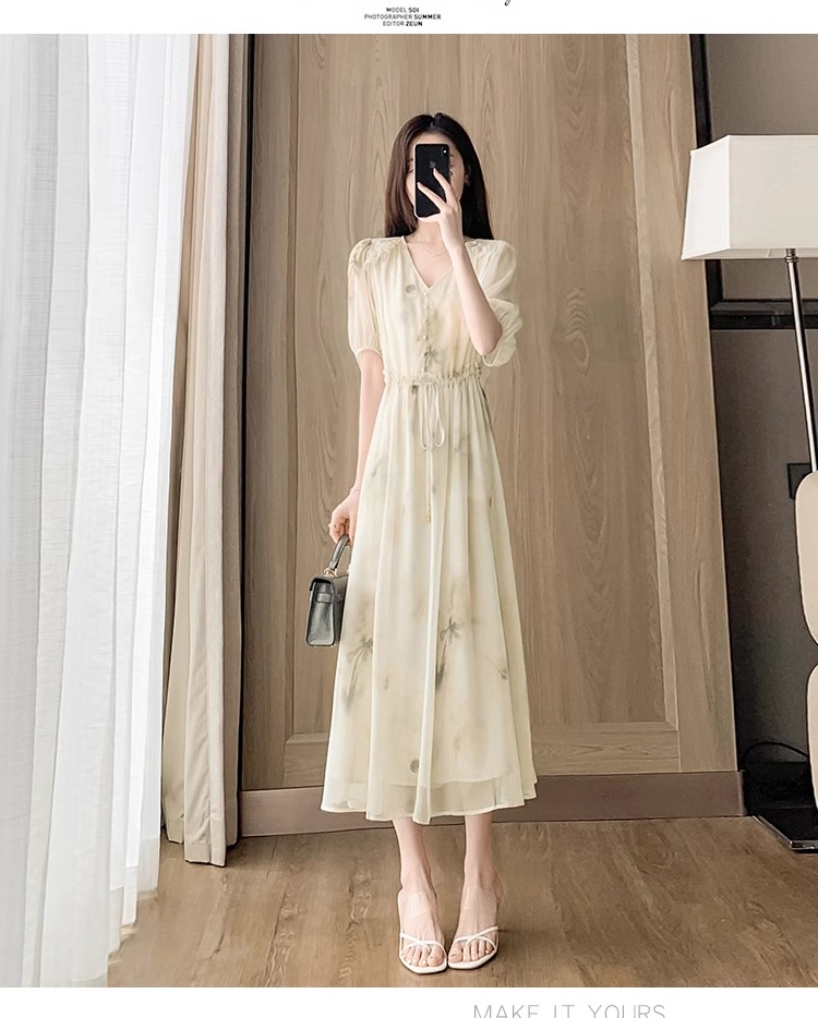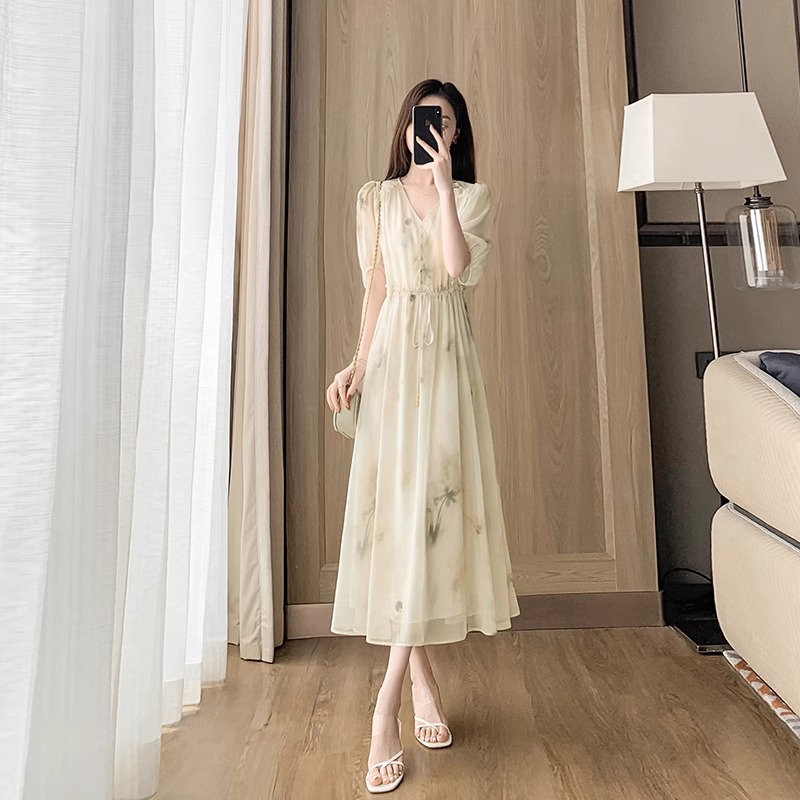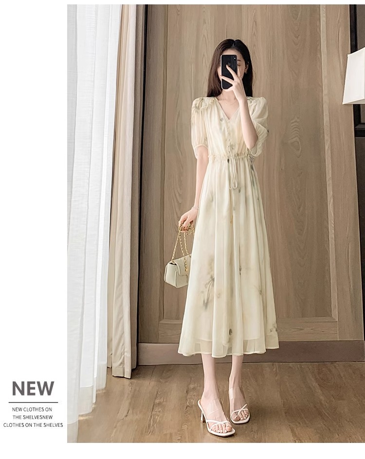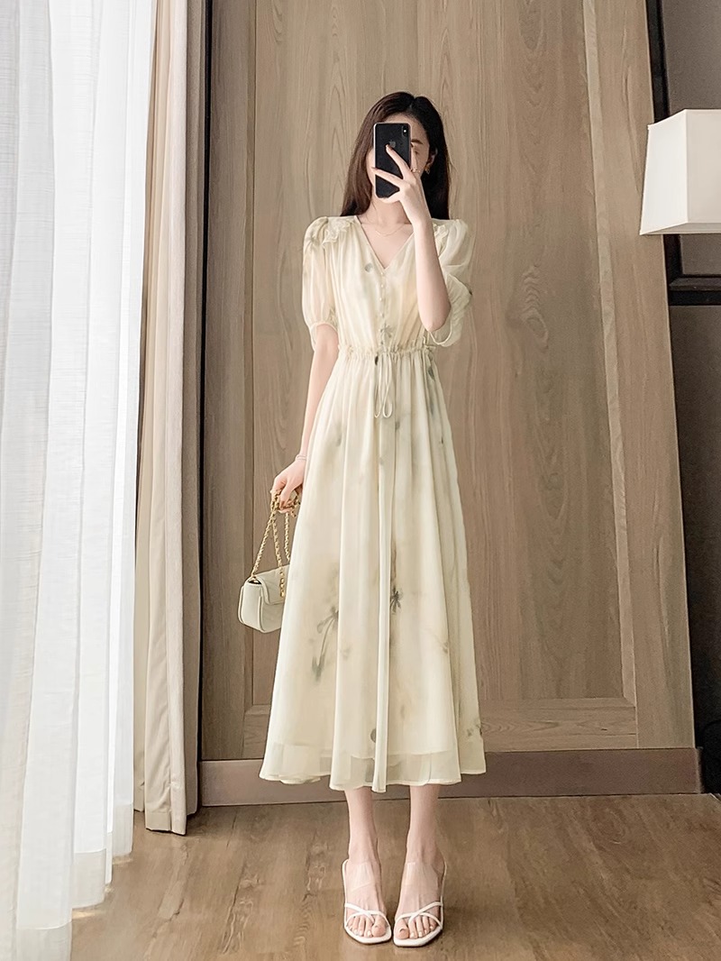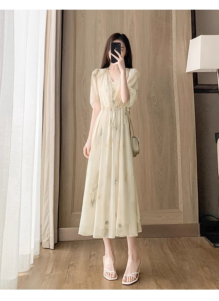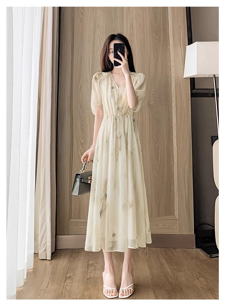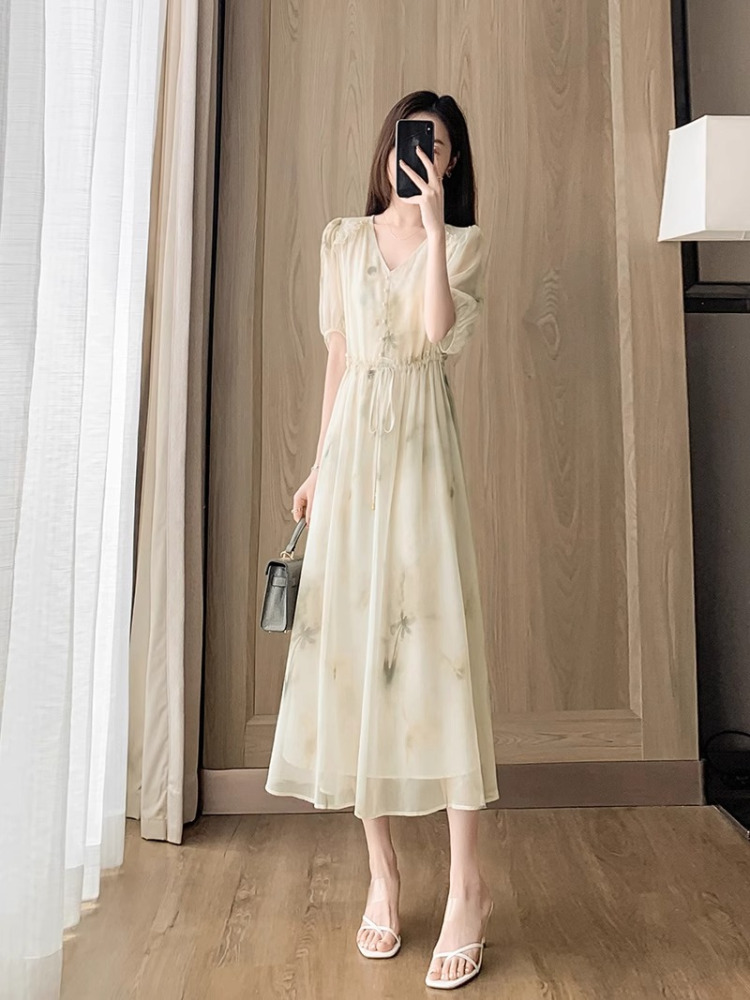 RY2314# 超仙高级感碎花雪纺连衣裙女夏2026新款收腰显瘦气质遮肚a字裙子